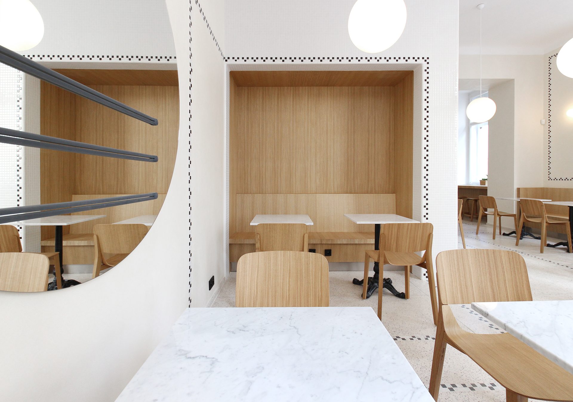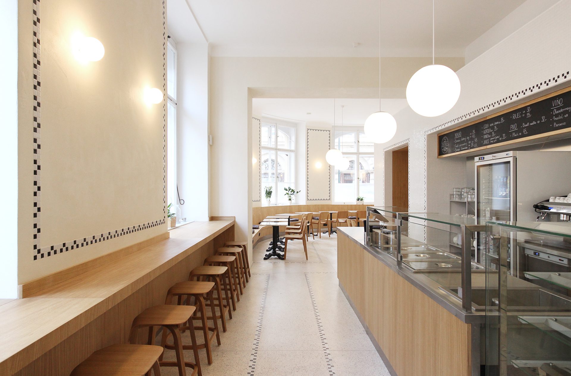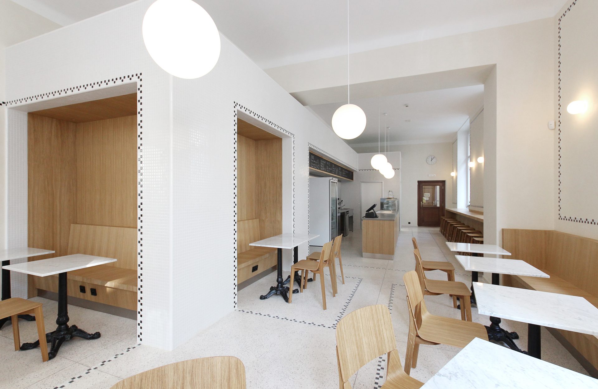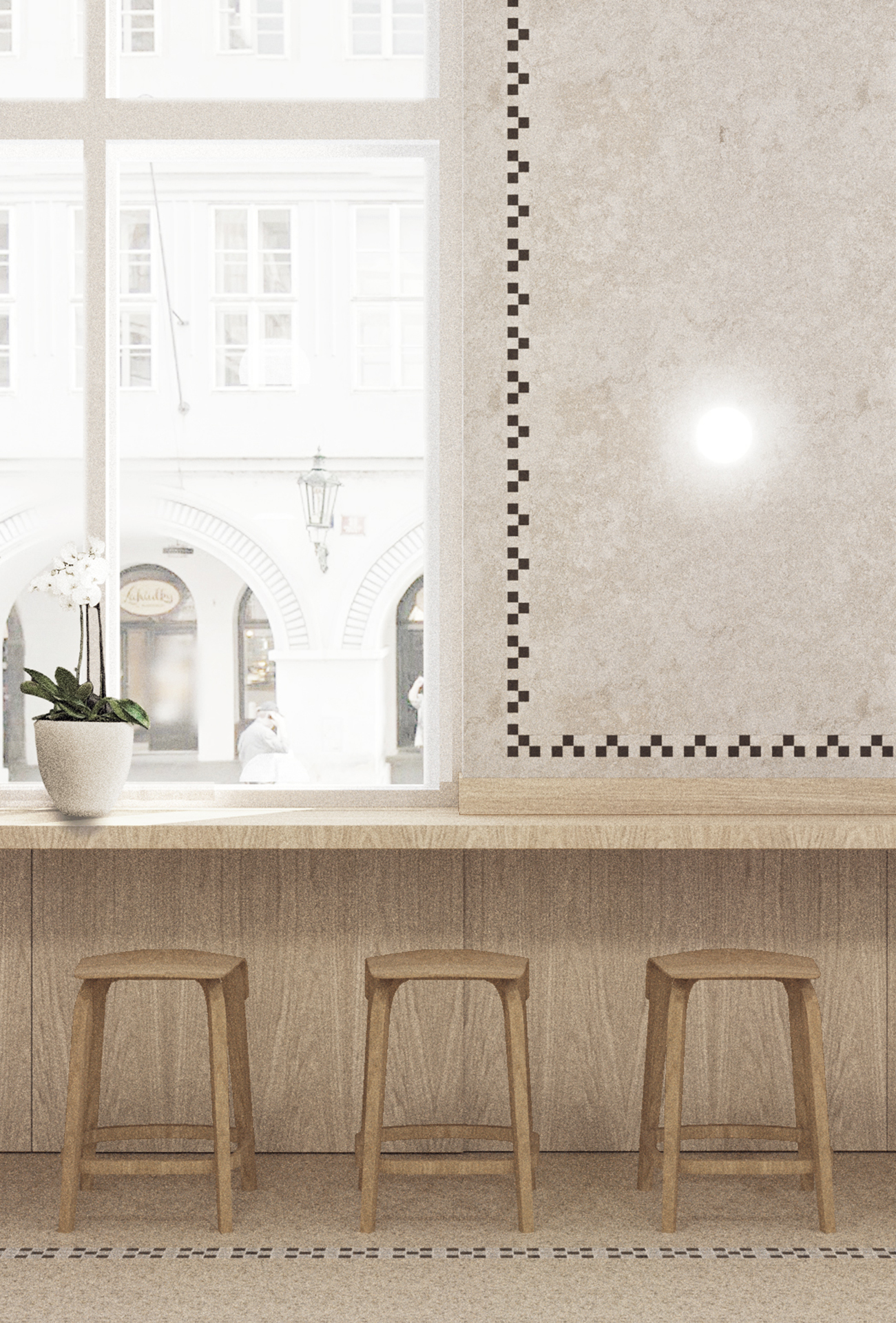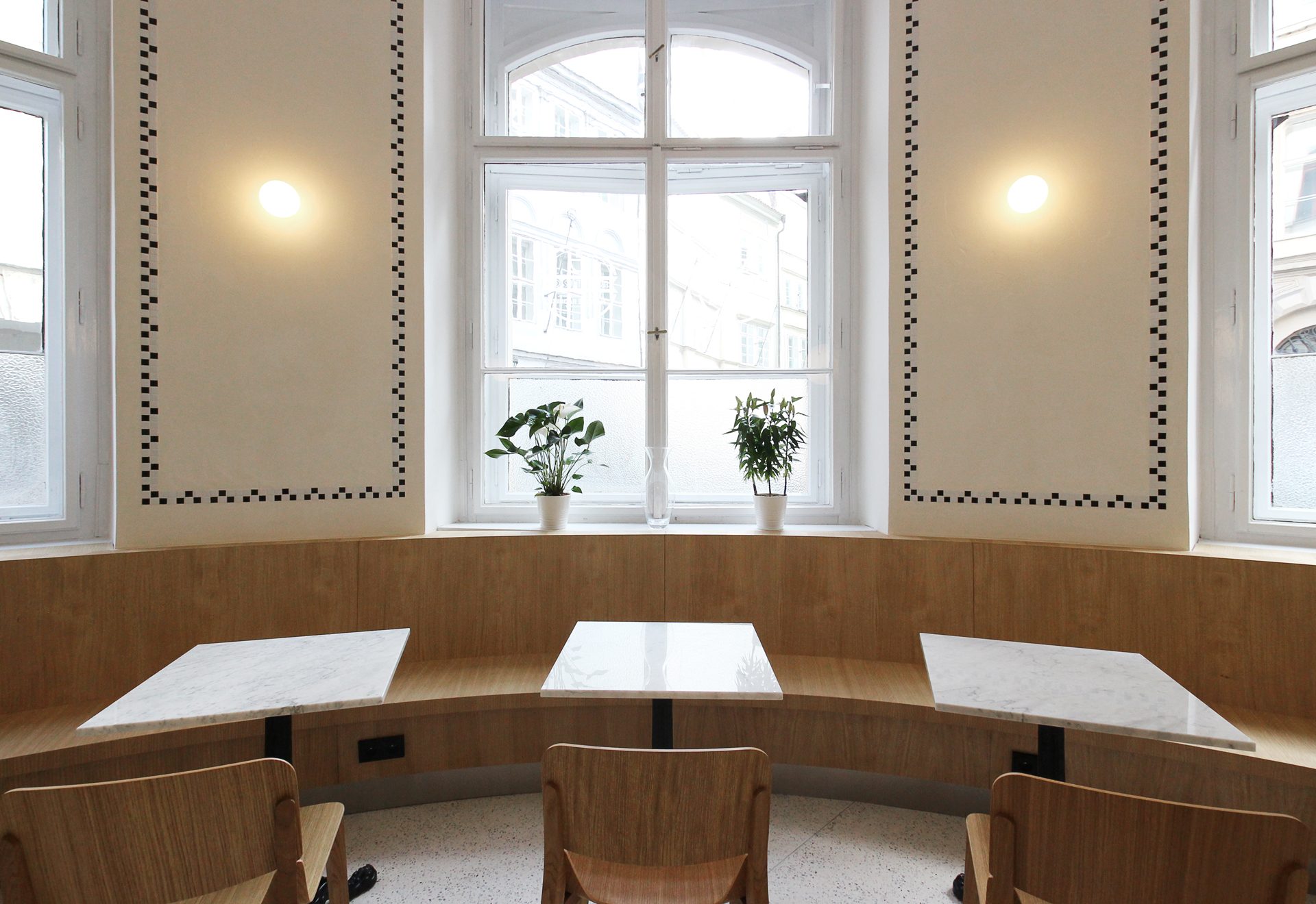 Prague City Hall decided to undergo a modernisation of its bistro inside one of its buildings on Mariánské square. The original bistro, which has been in service for decades, was rather outdated in comparison to contemporary bistros and coffee shops. The Prague City Hall made us an offer to participate in a tender with our design, with which we later on succeeded. The light and spacious interior reflect the context of this significant historical building. All used materials are natural with the emphasis on traditional building technologies. A subtle geometric ornament outlines the seating and the serving niches in the newly inserted volume, which contains the service area of the bistro. The outlining refers to the craftsmanship and the complex design of interiors used in the public interiors of the buildings in the style of art nouveau.