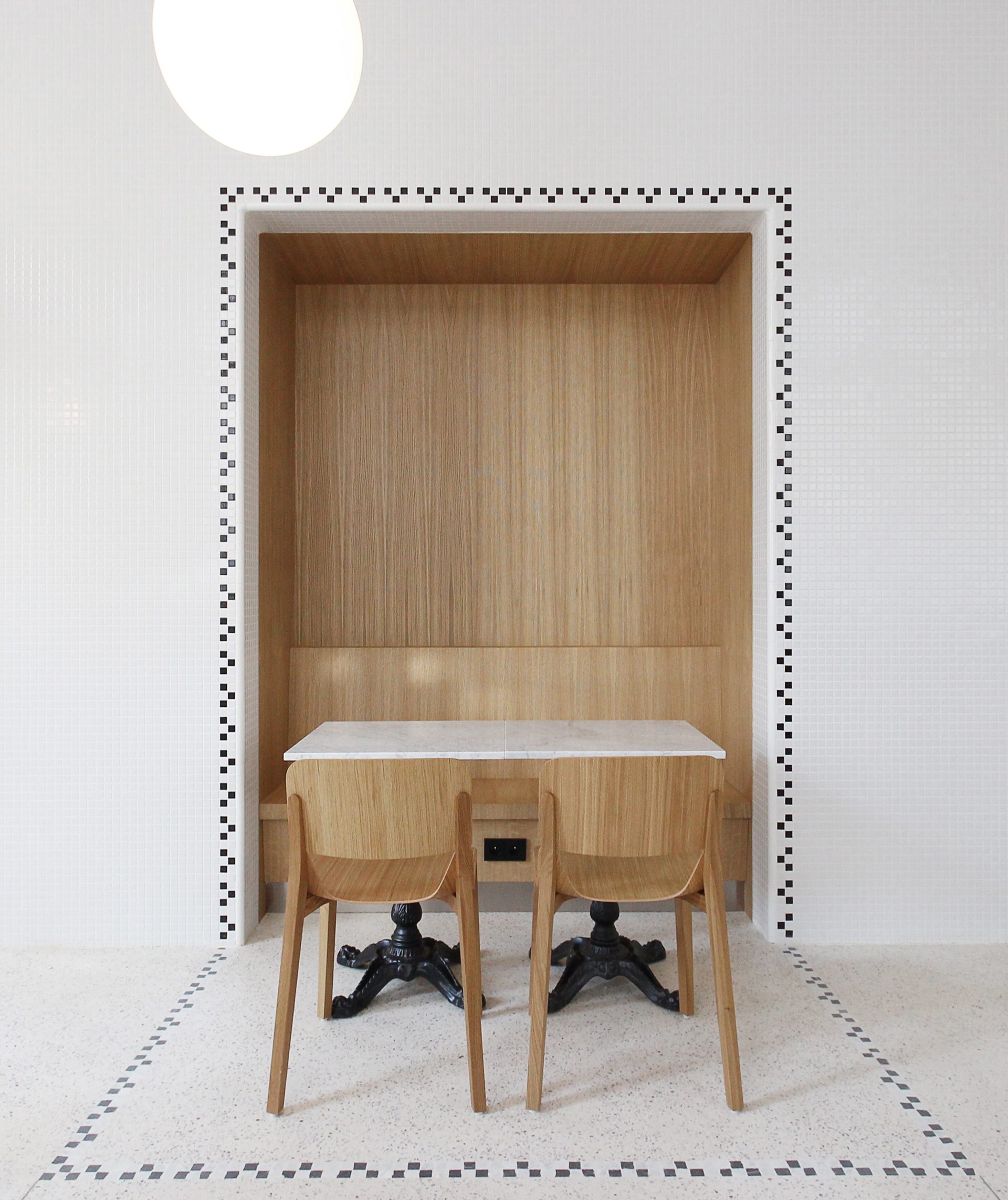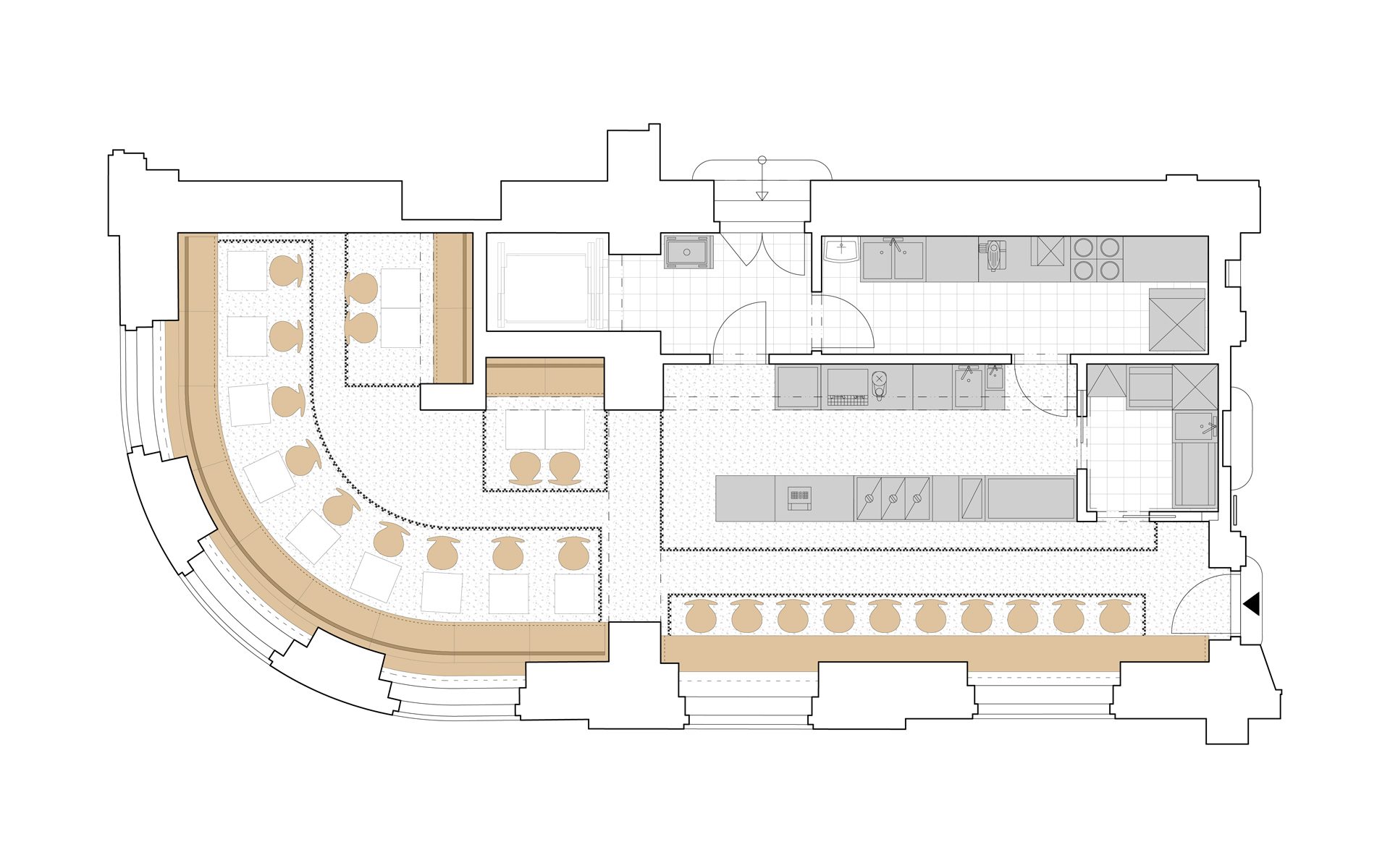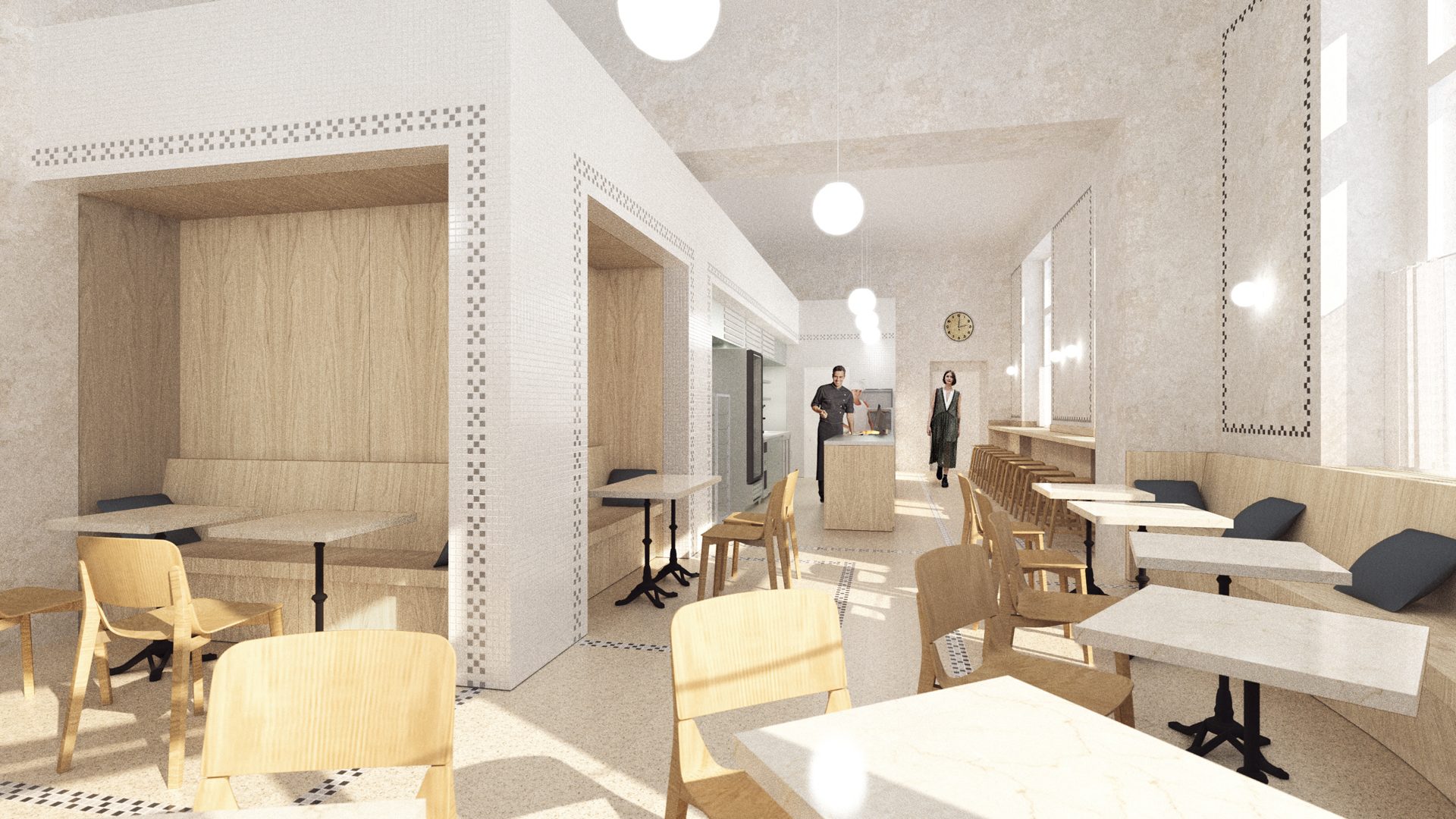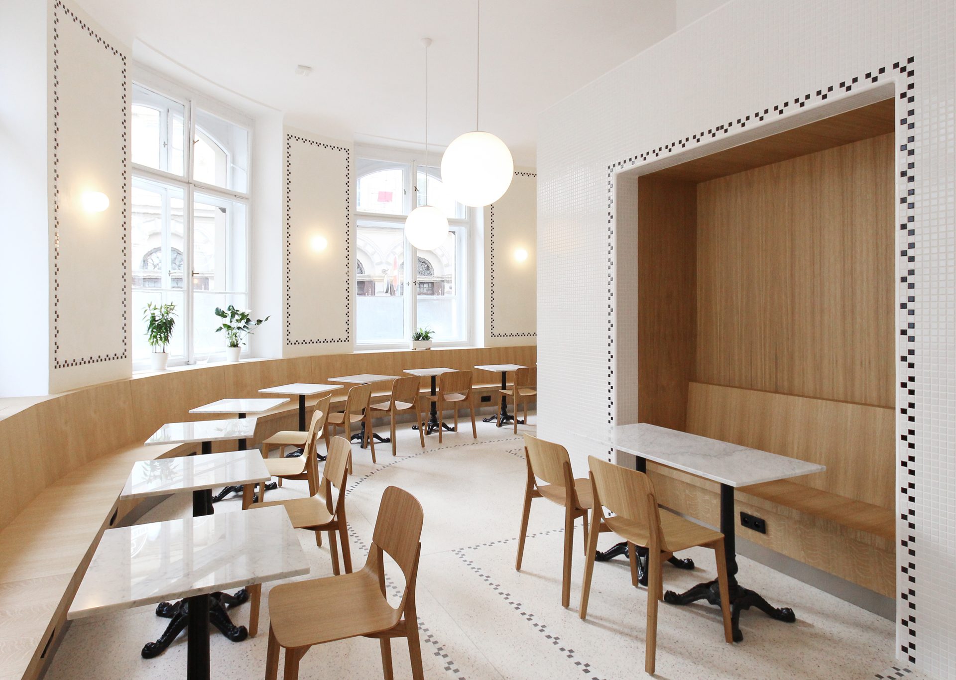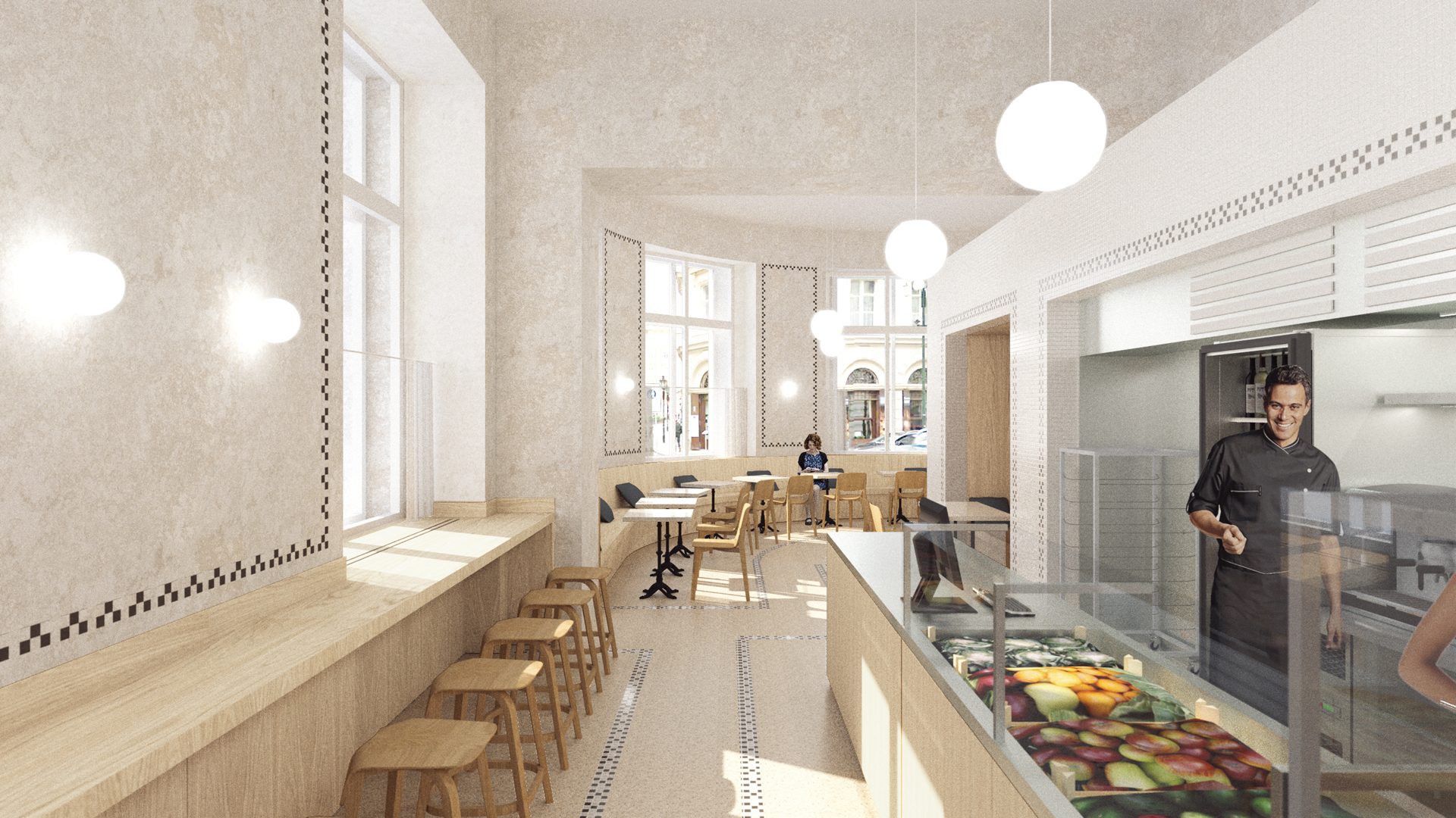 Prague City Hall decided to undergo a modernisation of its bistro inside one of its buildings on Mariánské square. The original bistro, which has been in service for decades, was rather outdated in comparison to contemporary bistros and coffee shops. The Prague City Hall made us an offer to participate in a tender with our design, with which we later on succeeded. The light and spacious interior reflect the context of this significant historical building. All used materials are natural with the emphasis on traditional building technologies. A subtle geometric ornament outlines the seating and the serving niches in the newly inserted volume, which contains the service area of the bistro. The outlining refers to the craftsmanship and the complex design of interiors used in the public interiors of the buildings in the style of art nouveau.
