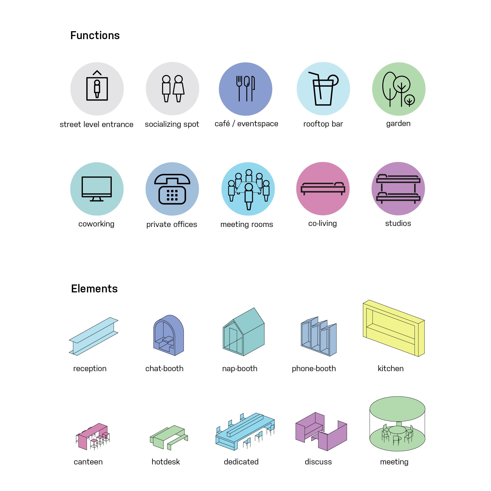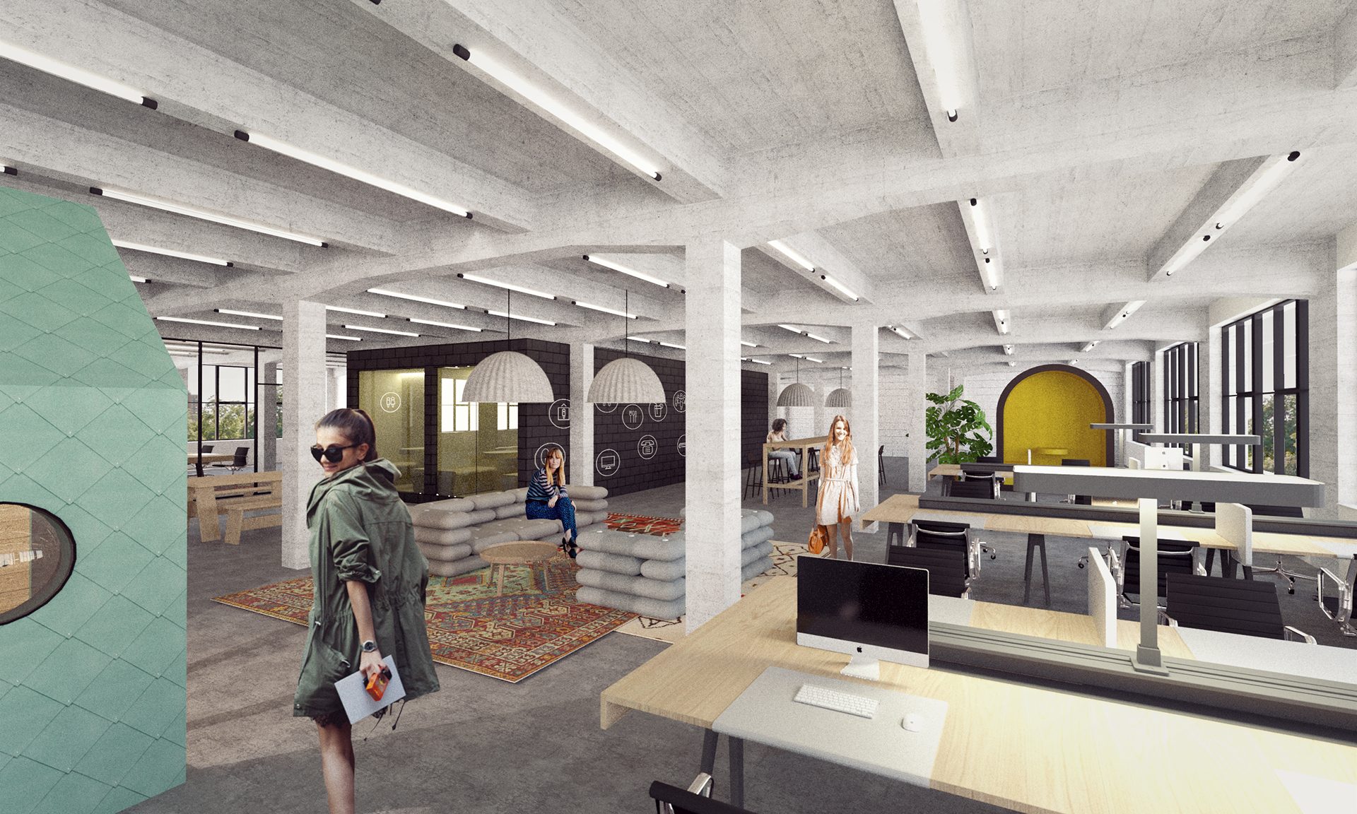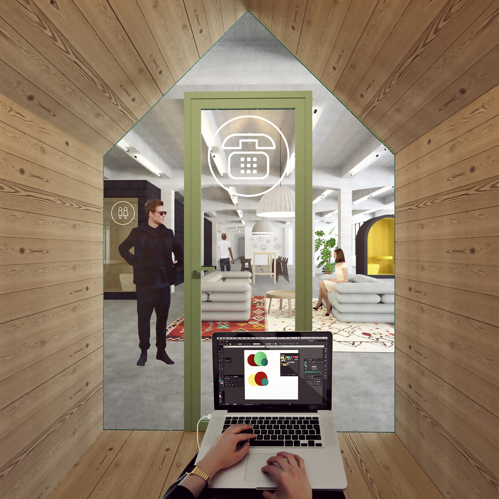 The aim of the pre-study is to analyze parts of the interior of the Pragovka building to accommodate the newly developed concept of a co-working office space. We distinguish 4 main spatial behaviors in today’s office spaces: FOCUS, SOCIALIZE, LEARN and COLLABORATE – collaborating with others. We define the main functions in an office / cowork interior. The functions are in a mutual synergy. The main functions (considered as leasable areas) such as coworking places, dedicated desks, private offices and leasable meeting rooms are complemented by non-leasable functions. These are important in the overall setup, because they provide a space with all the possibilities mentioned above. The proper mix of all these functions and their proper spatial distribution form a successful coworking space. For every function we define a specific volume / box / furniture type. These elements carry various roles in the interior concept. They act as natural paravans – space dividers. They enable people to orientate in the space and they are carriers of information and navigation graphics. They scale down the space into more comfortable units of approximately 25 to 50 sqm. These elements are either freestanding or attached to existing partitioning, nor site- specific. They can be distributed in any available interior.