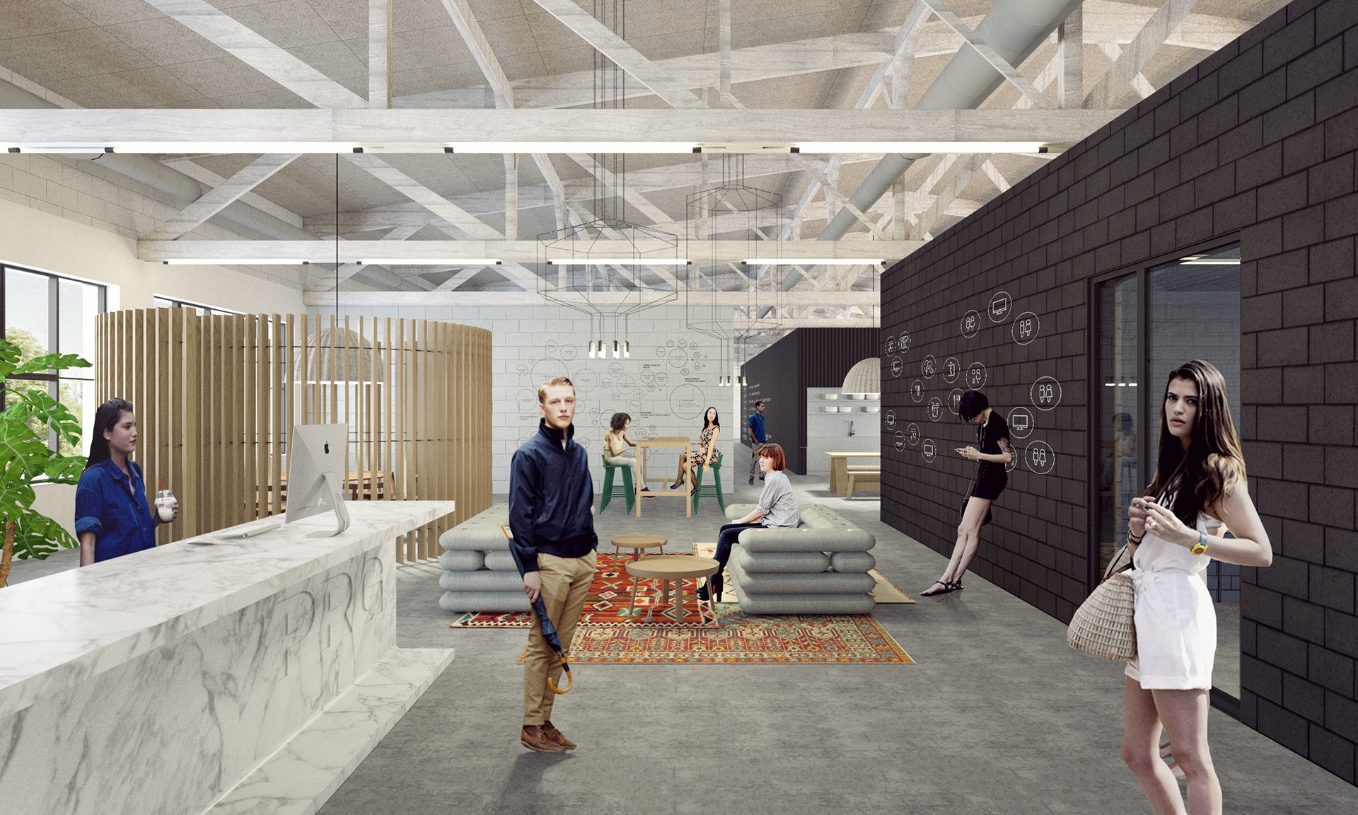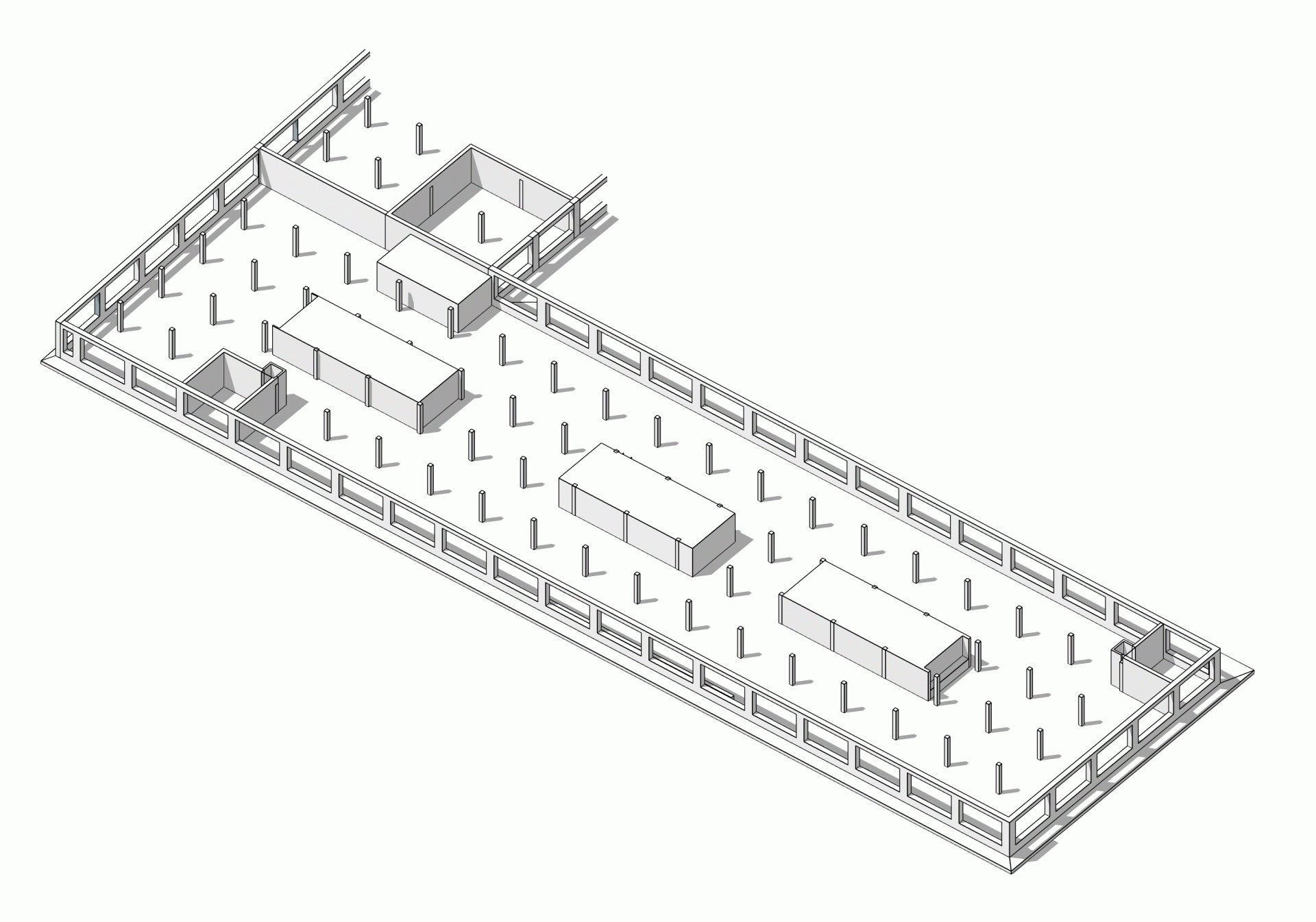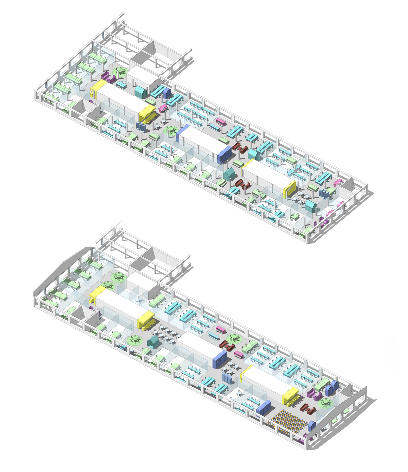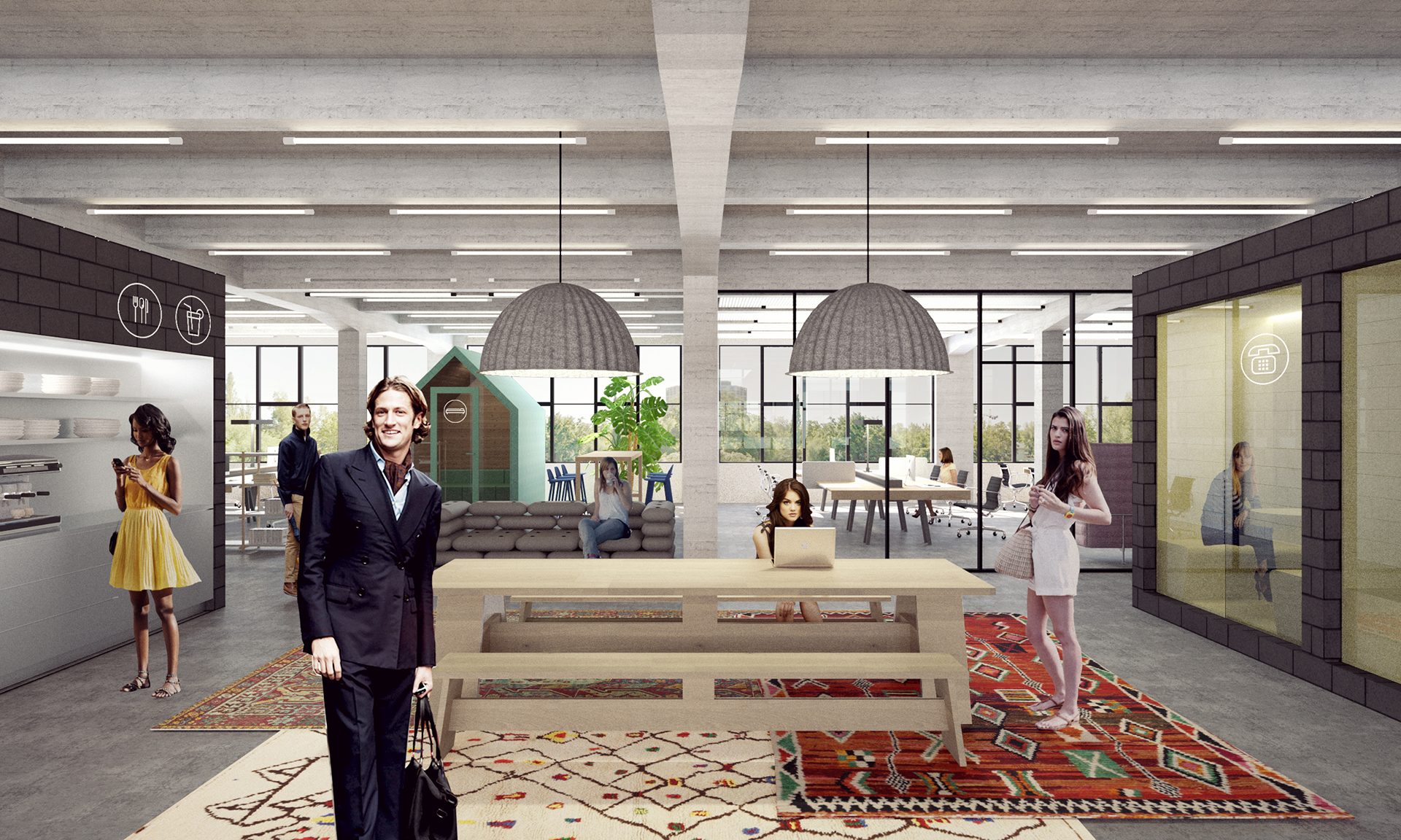 The aim of the pre-study is to analyze parts of the interior of the Pragovka building to accommodate the newly developed concept of a co-working office space. We distinguish 4 main spatial behaviors in today’s office spaces: FOCUS, SOCIALIZE, LEARN and COLLABORATE – collaborating with others. We define the main functions in an office / cowork interior. The functions are in a mutual synergy. The main functions (considered as leasable areas) such as coworking places, dedicated desks, private offices and leasable meeting rooms are complemented by non-leasable functions. These are important in the overall setup, because they provide a space with all the possibilities mentioned above. The proper mix of all these functions and their proper spatial distribution form a successful coworking space. For every function we define a specific volume / box / furniture type. These elements carry various roles in the interior concept. They act as natural paravans – space dividers. They enable people to orientate in the space and they are carriers of information and navigation graphics. They scale down the space into more comfortable units of approximately 25 to 50 sqm. These elements are either freestanding or attached to existing partitioning, nor site- specific. They can be distributed in any available interior.