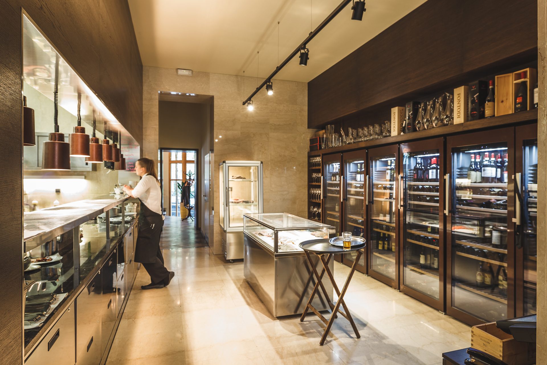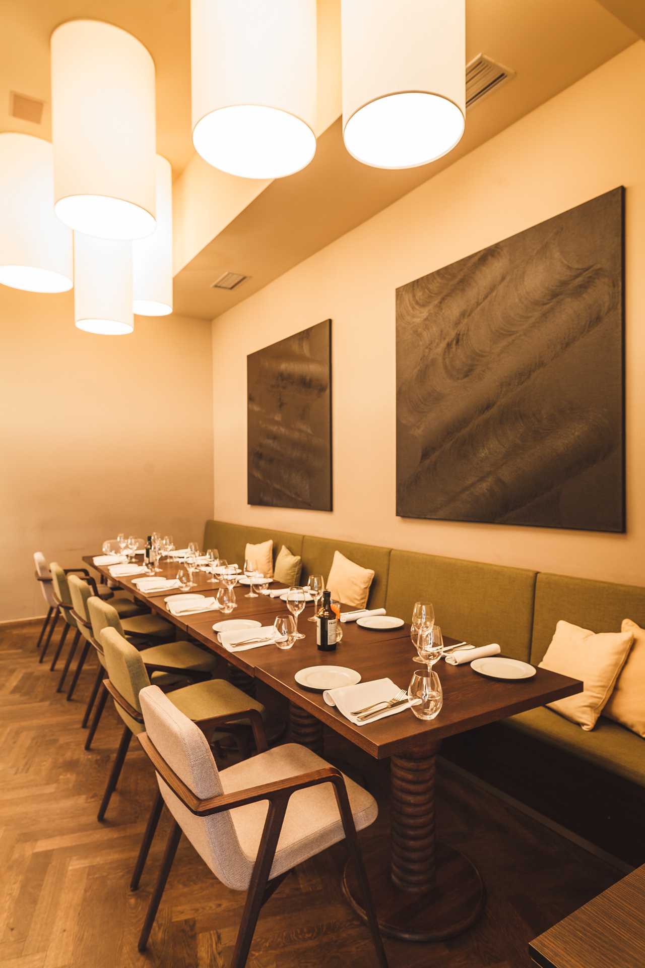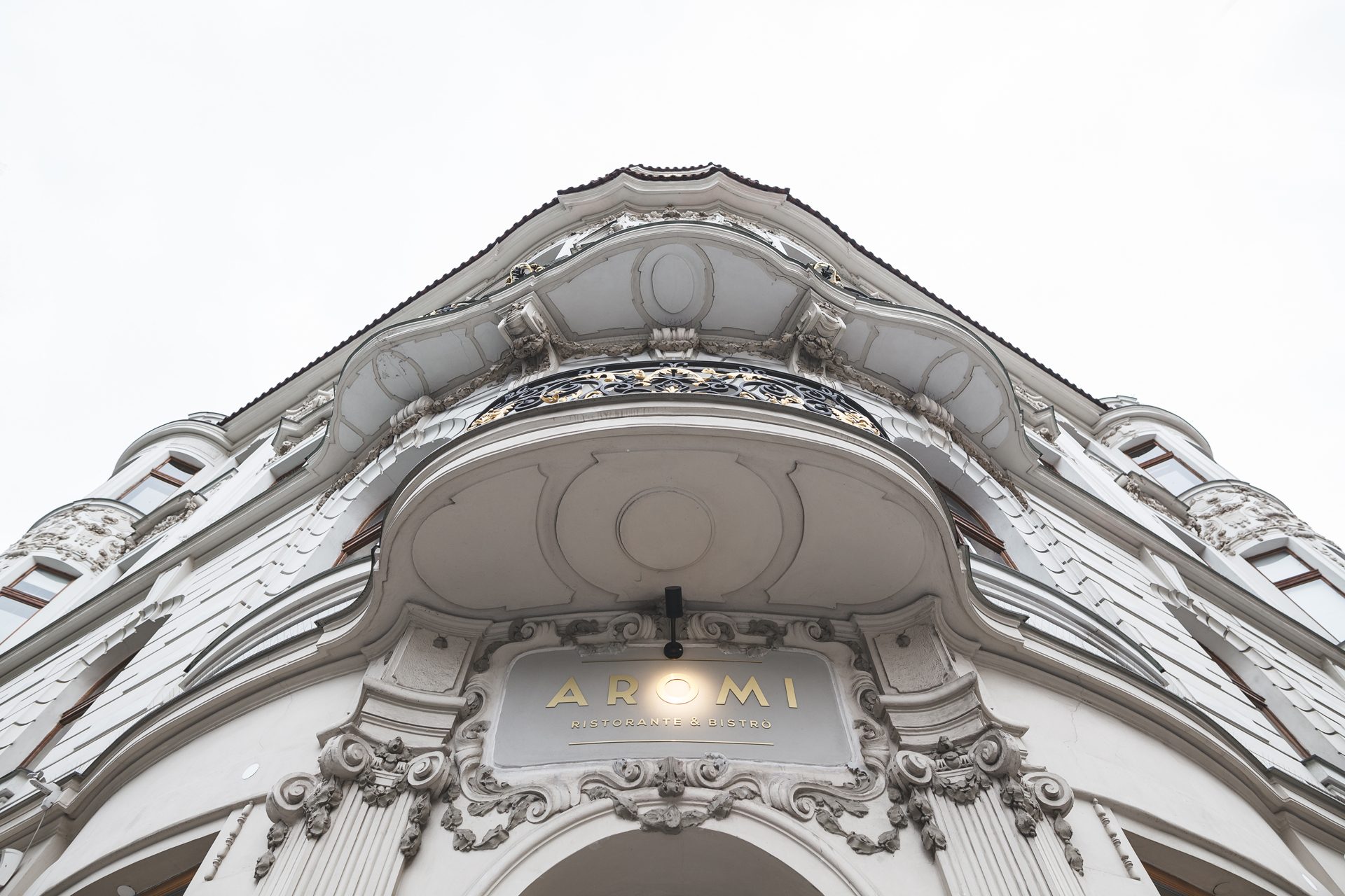 Aromi is the flagship of Riccard Lucques restaurants. At first, our task was to redesign his original restaurant, but one day we received a call from Riccard saying “Stop designing, we have a new location!”. He choosed a beautiful place on the Peace Square. The restaurant itself is divided into the part of a casual bistro facing the street, and the part of the restaurant facing into the courtyard. Big emphasis was on building an open kitchen, where the customers would get to see the cooks preparing the meals. Another necessity was an integrated wine shop with space dedicated for sommeliers.