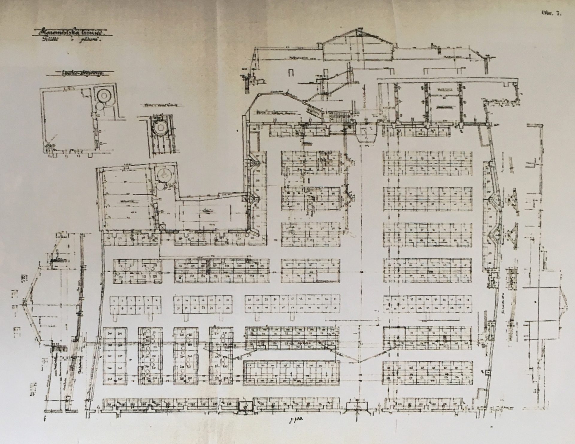 The operation of the marketplace is strictly divided into the part for customers and the operating part, in order for these two parts to never collide with each other. The entrances for the customers are located on the Rytířská street and 28. Října street, through big and generous passages of apartment buildings. The movement of the customers is slowed down by the irregular layout of different sales stands such as the fish shop, the butcher’s, coffee shops, candy stores and many others products, placed in separate stands. In the imaginary bay of the marketplace, a big restaurant with a bar is placed. The gallery on the first floor is accessible by one-armed staircases in between the boxes, onto which we have placed most of the tables for the customers and additional places to buy coffee or other beverages. The tables offer beautiful views of the bustle and movement downstairs. The toilets for the customers are located in a basement, same as the utilities and technology, hidden behind the whole operation, but those can be accessed by different stairways and freight elevators. Supplying of the marketplace takes place from the Rytířská street. All the boxes are interconnected in the basement by a corridor, which goes around the perimeter of the marketplace.