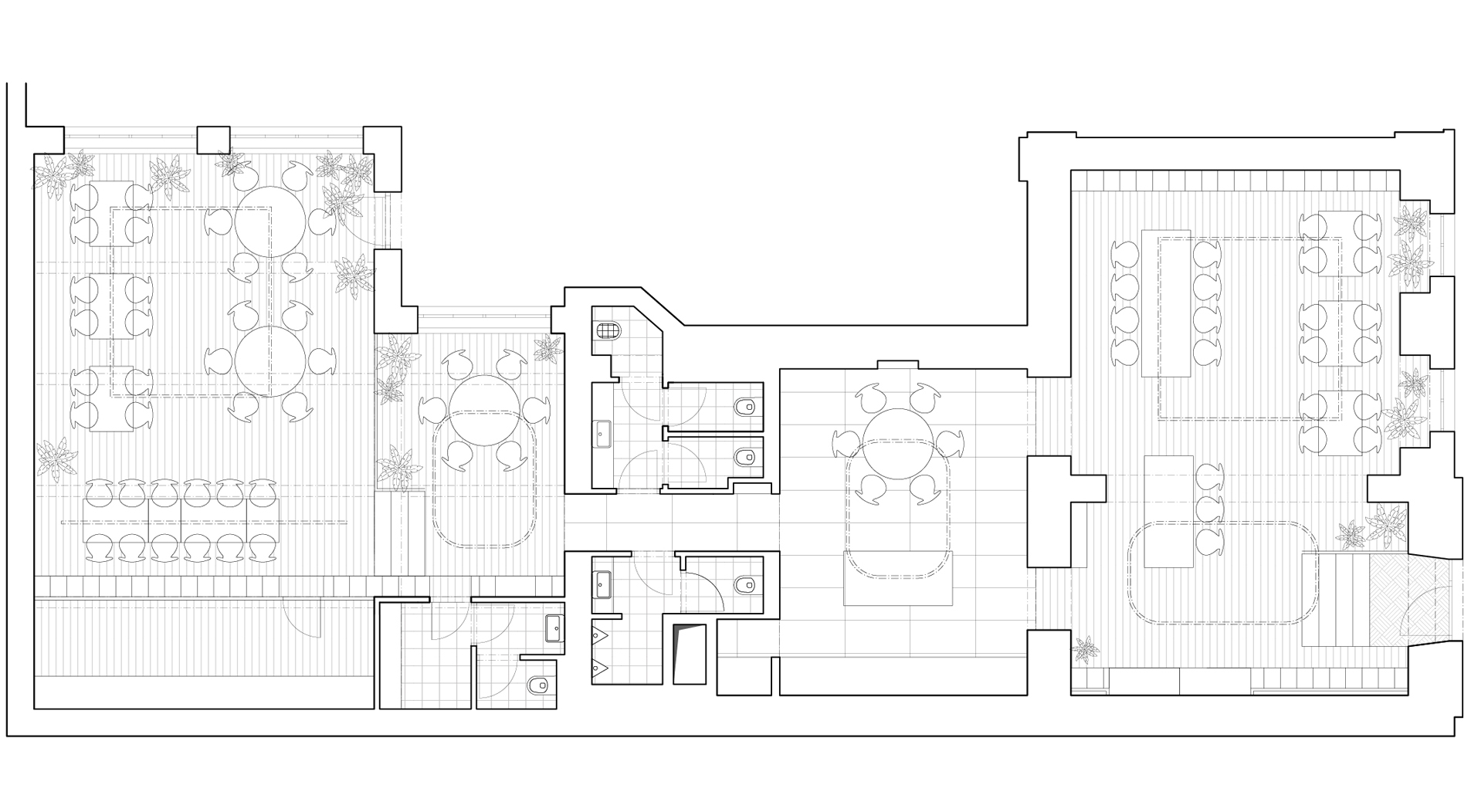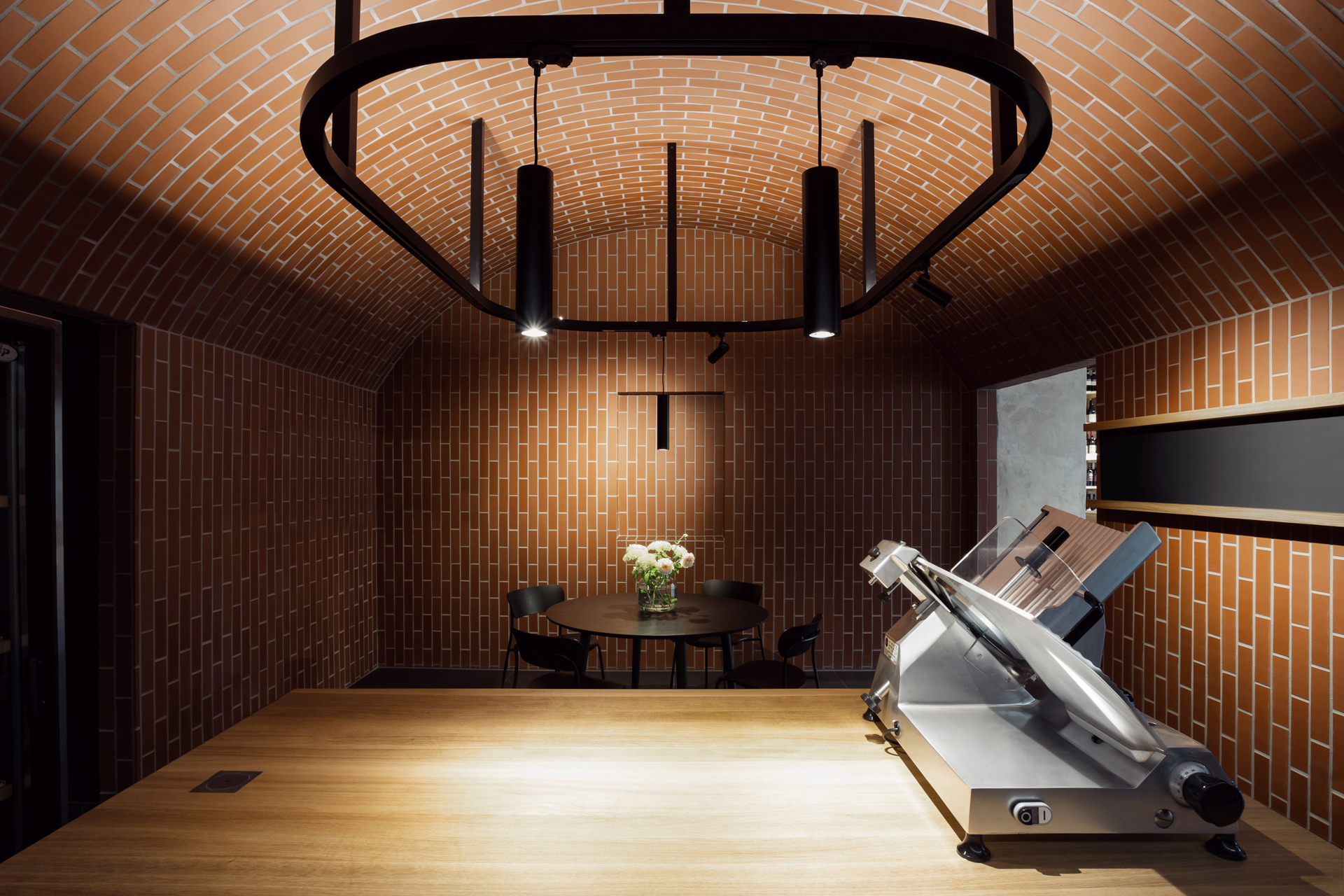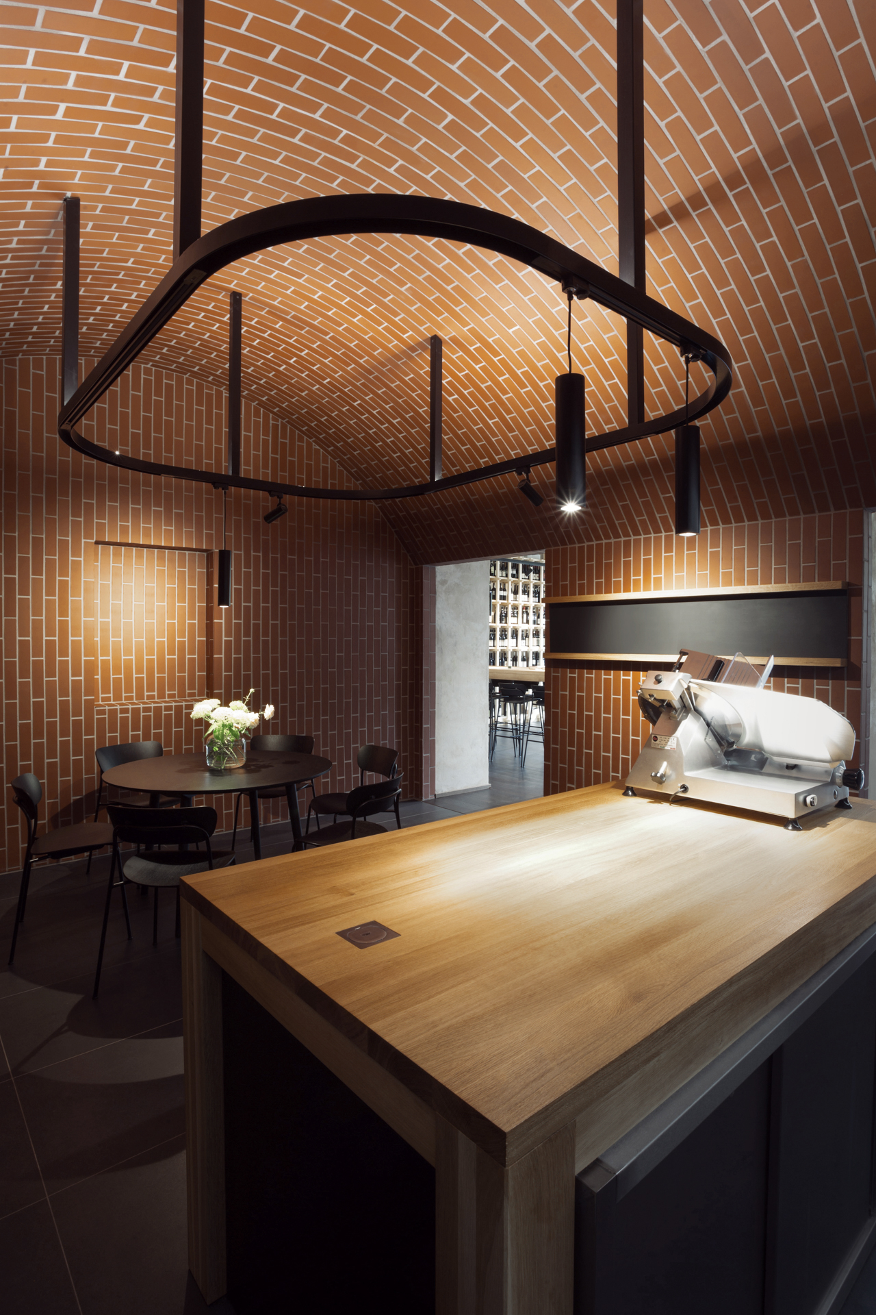 The central area was severely damaged by incompenent building impacts. In order to conceal these informal structures, we have designed a suspended barrel vault. The vault and the walls are cladded with teracotta tiles reffering to italian wine cellars. One single table and an oak wood counter are the only furniture here and dimmed light create an intimate atmosphere, contrasting with the illuminated main spaces.