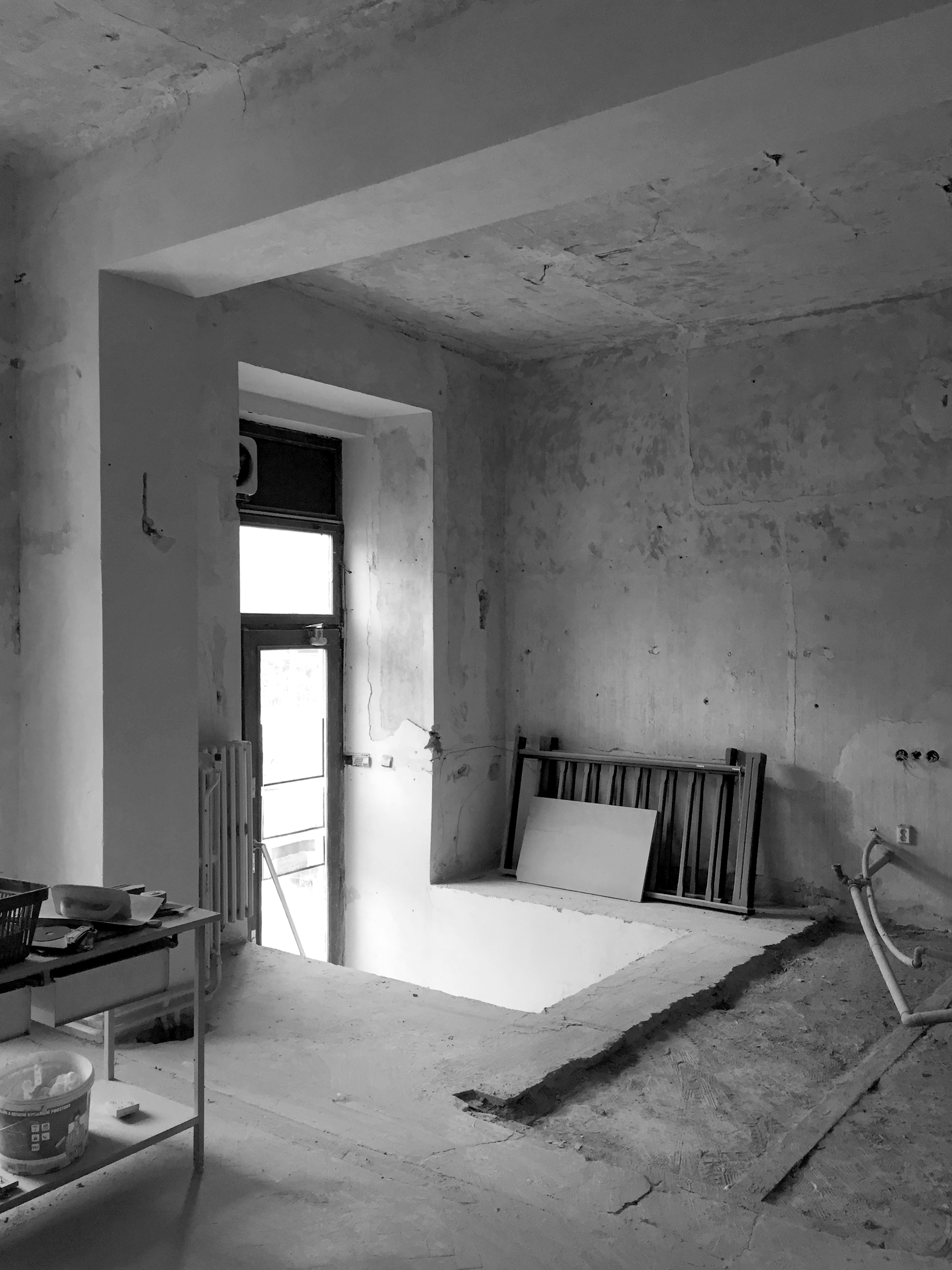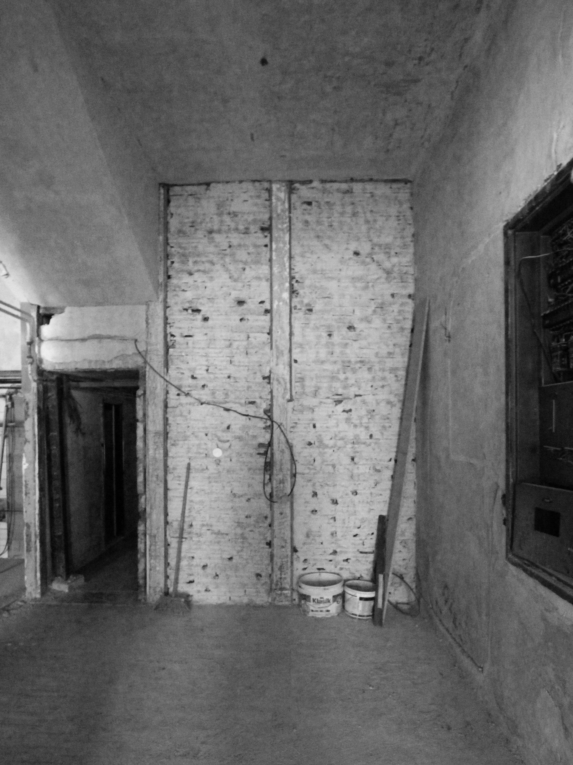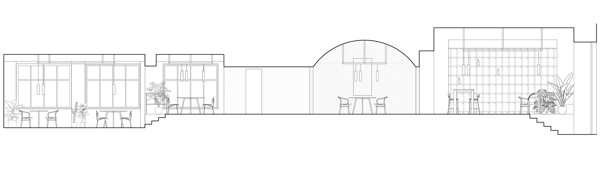 The central area was severely damaged by incompenent building impacts. In order to conceal these informal structures, we have designed a suspended barrel vault. The vault and the walls are cladded with teracotta tiles reffering to italian wine cellars. One single table and an oak wood counter are the only furniture here and dimmed light create an intimate atmosphere, contrasting with the illuminated main spaces.