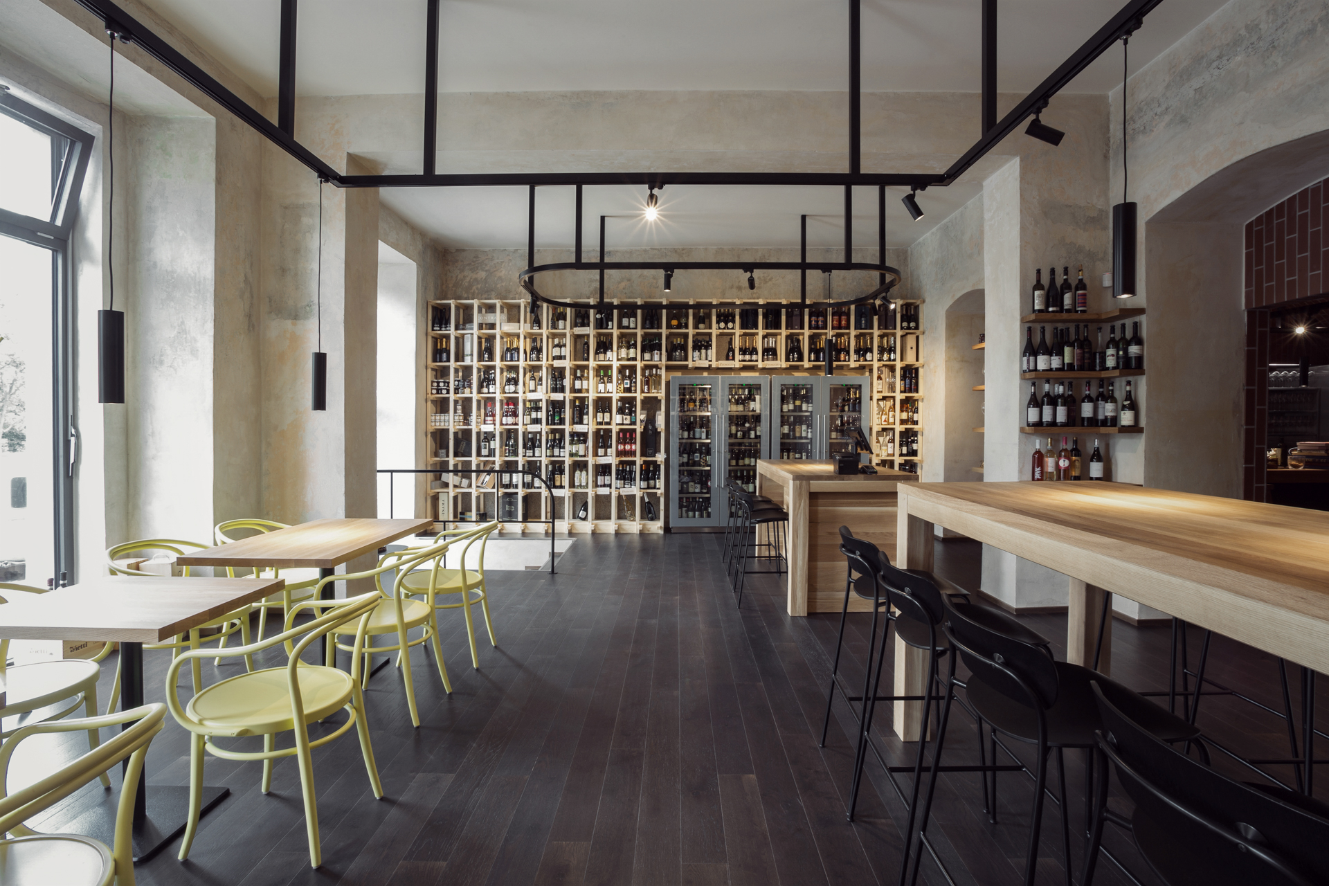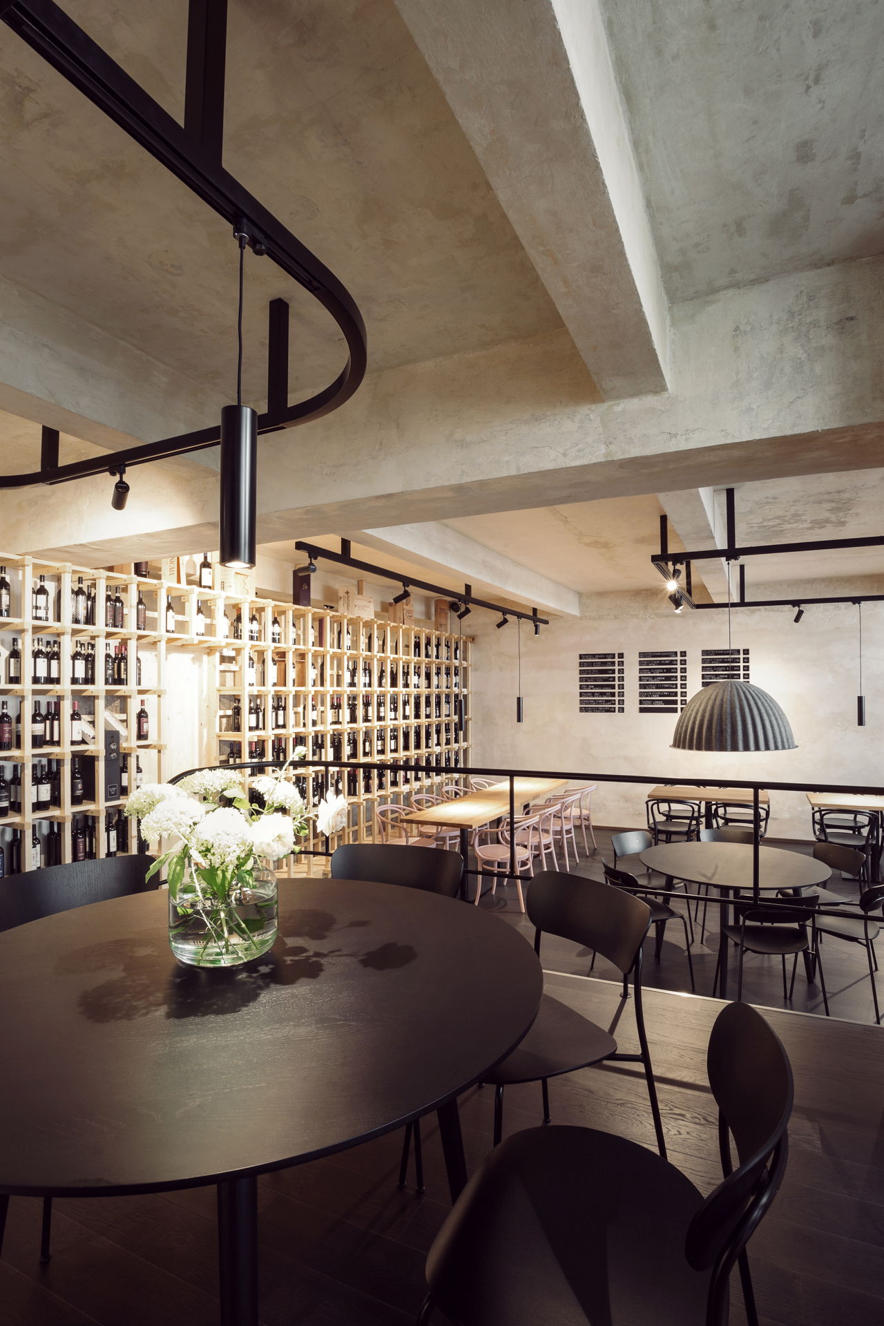 The space is located in the ground floor of an office building built in 1924 in the centre of Brno. For the main areas oriented towards the street and into the courtyard, we have exposed most of the original structures and surfaces. Spruce timber shelves for vine bottles form a dominant of these spaces. The particular seating zones between them are further emphasized by suspended steel frame lights tracks.