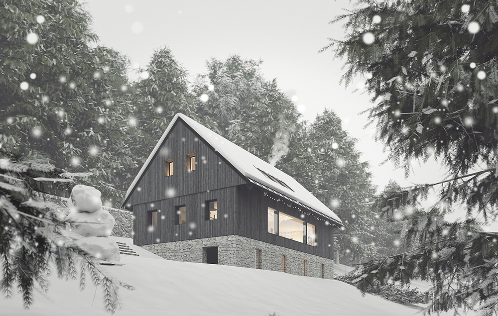 The building pays tribute to the local typical landscape character and minimalist style based on the original Krkonoše mountains typology. The sensitive contextual approach is appropriately complemented by several unexpected elements, the most striking of which is a large-format panoramic window with a view of the forest and the opposite plains. In the material solution of the exterior, naturally patinated larch wood and local quarried stone are used, so the house has the right prerequisites to withstand the harsh conditions of the alpine environment.