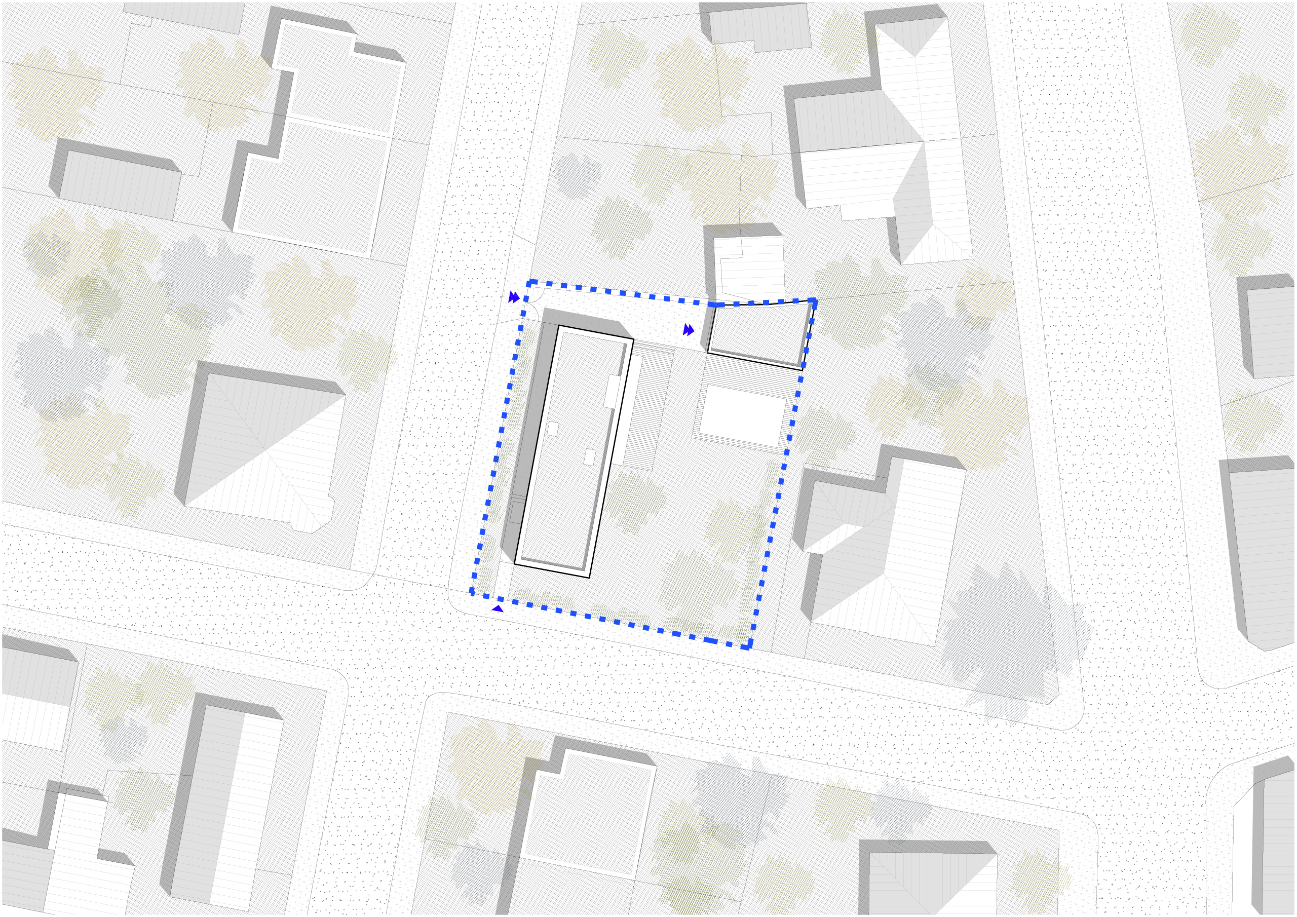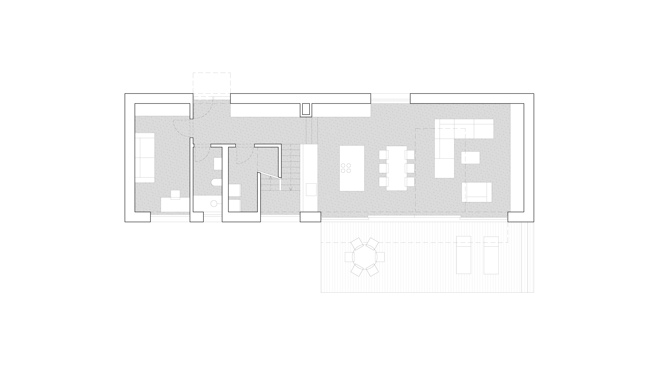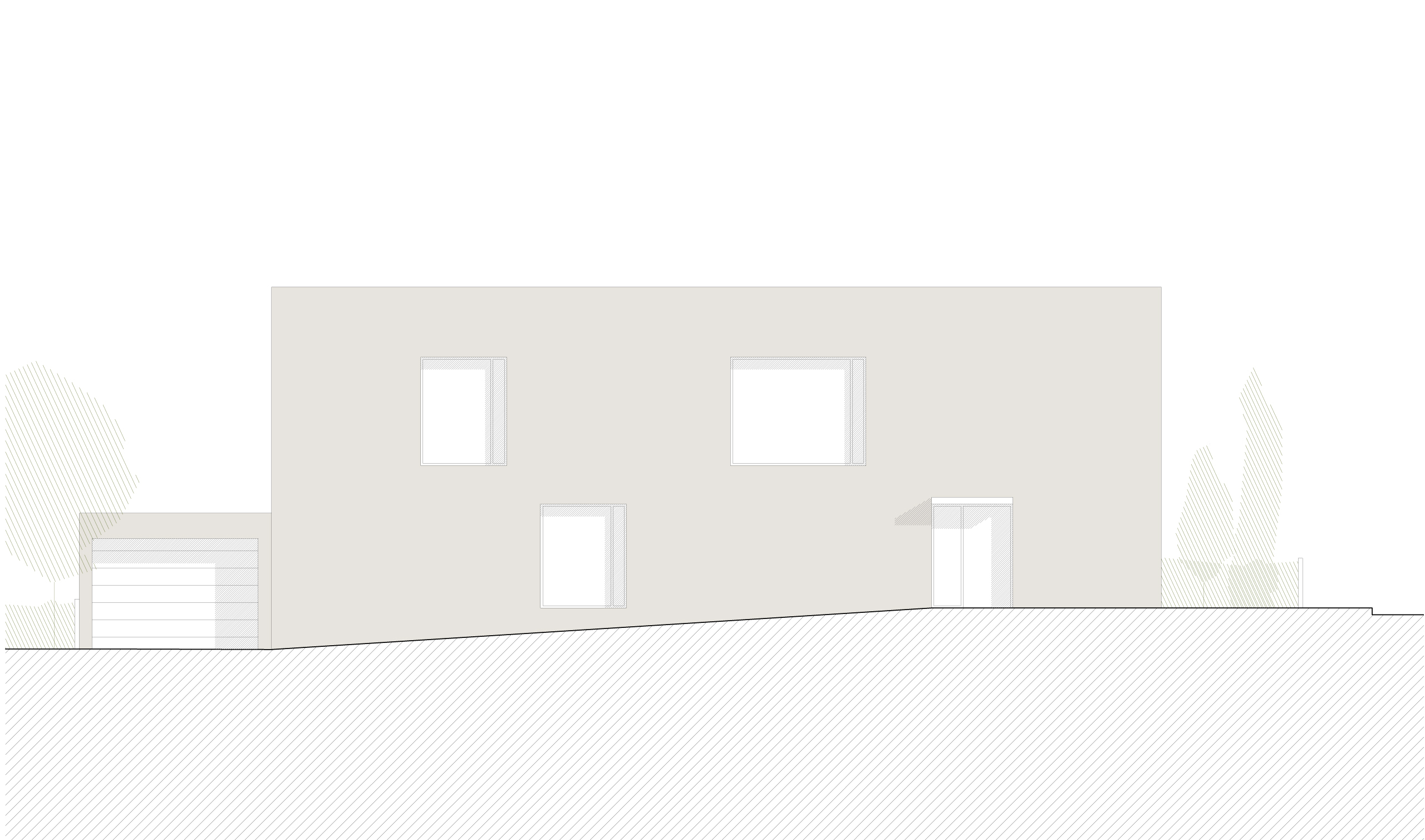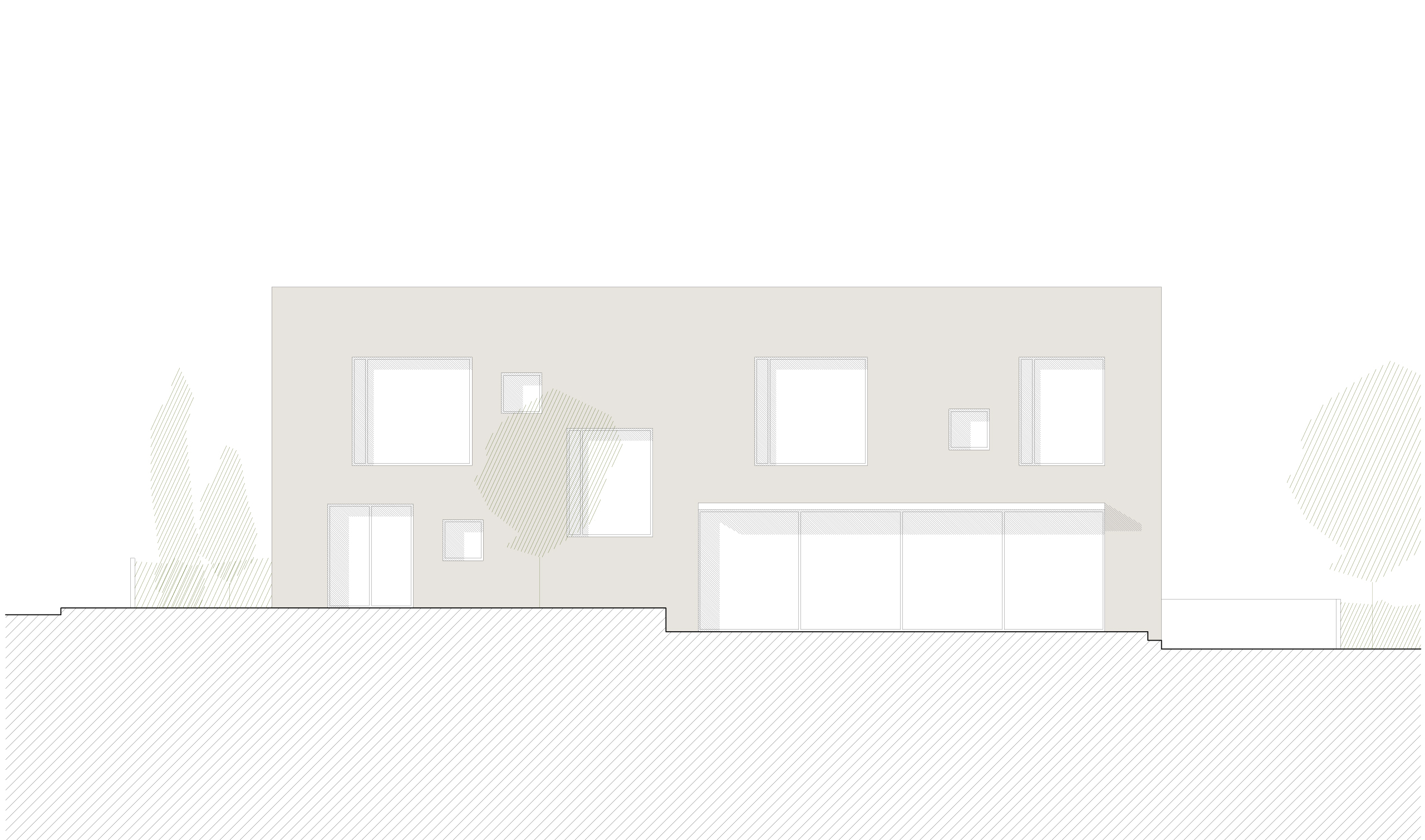 The gently sloping terrain allowed for a living space with an increased ceiling height, reinforcing the open character of the interior. The structural and formal simplicity of the building is balanced by an irregular composition of windows.