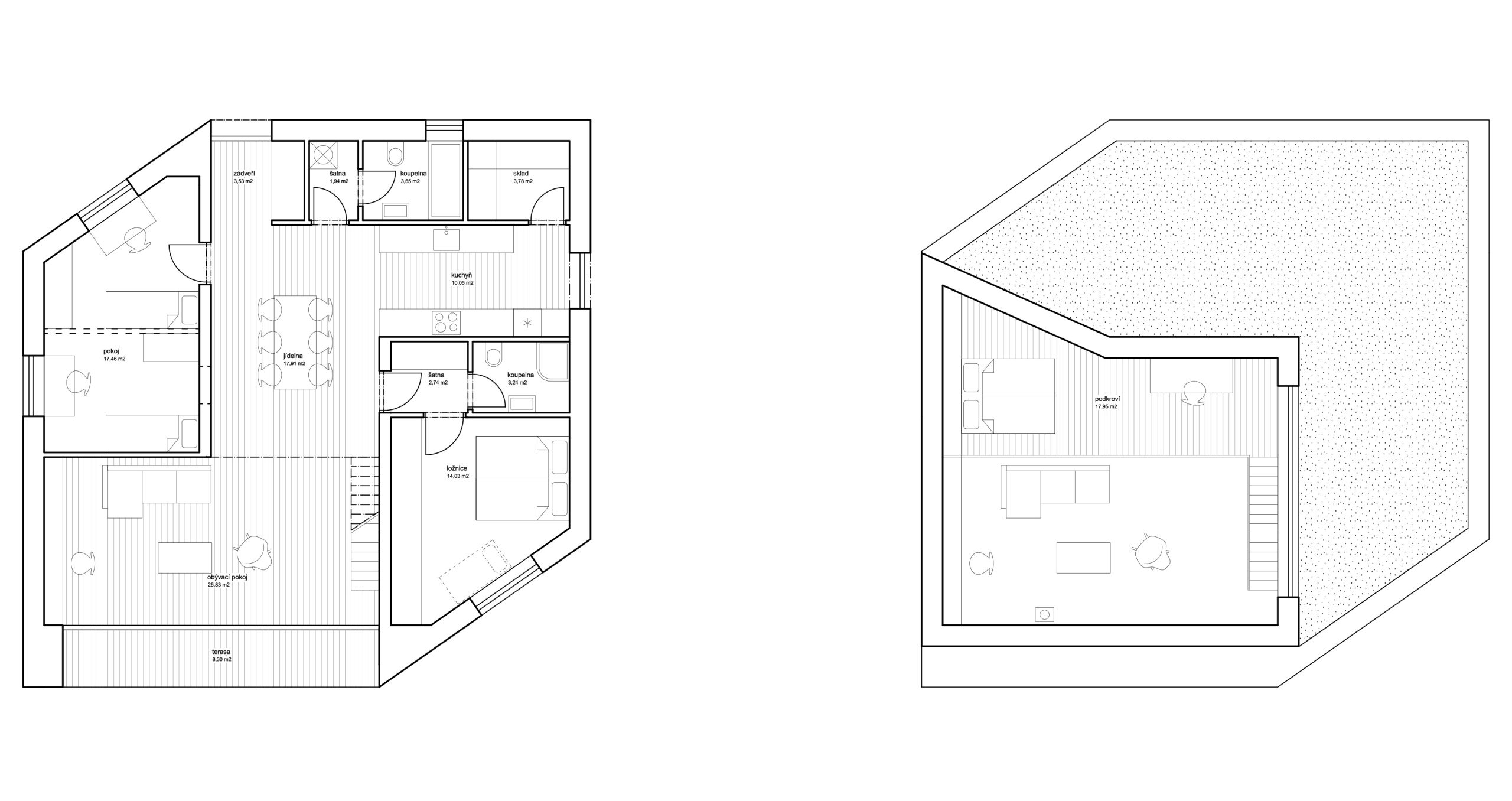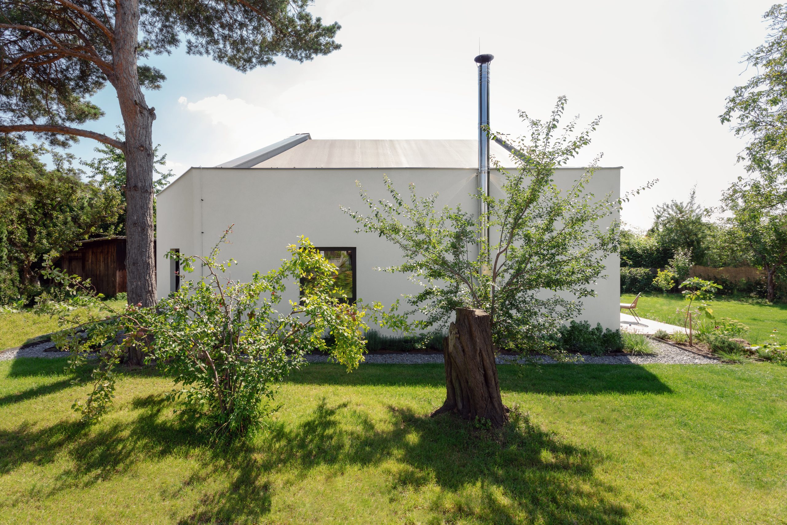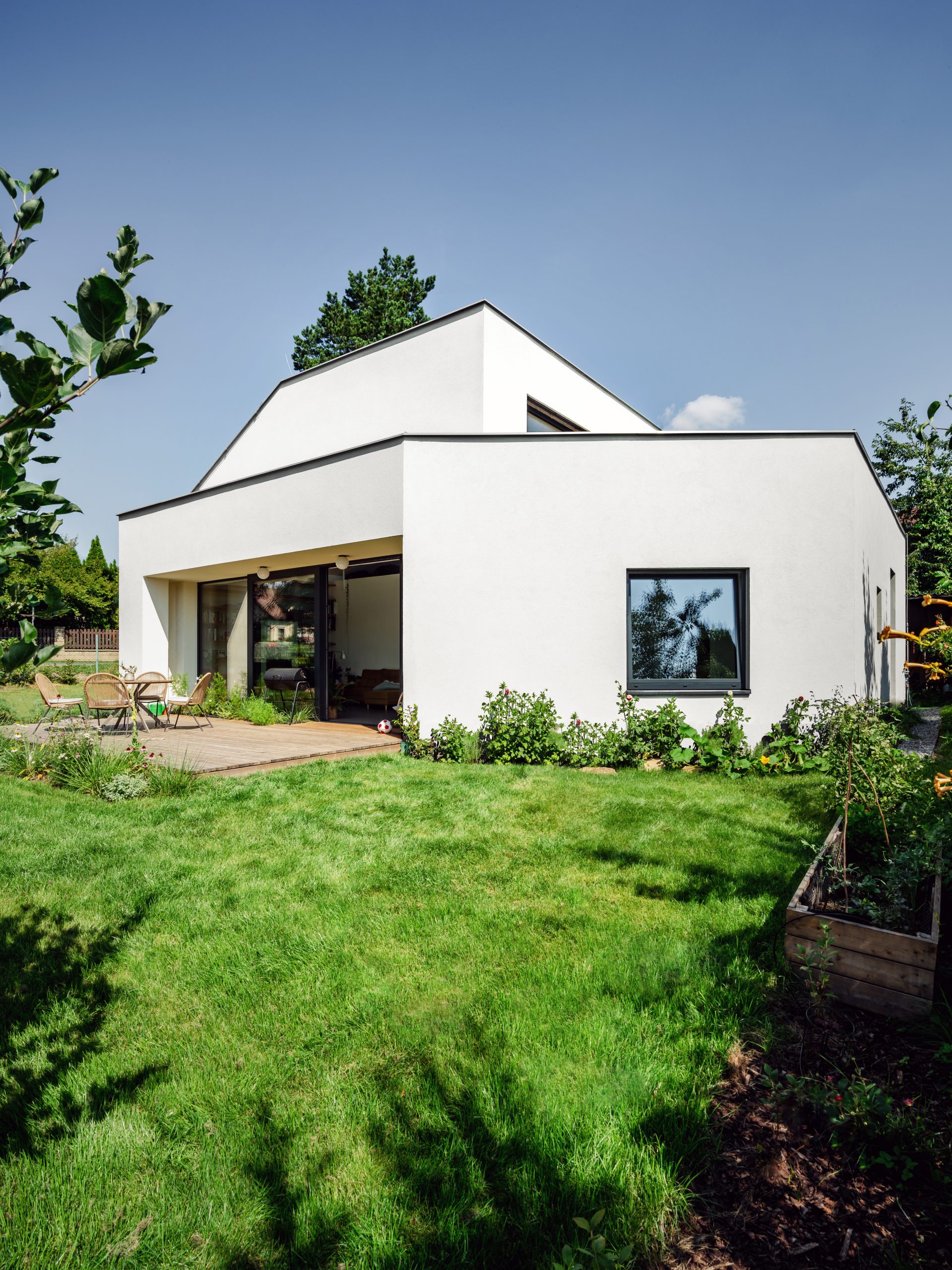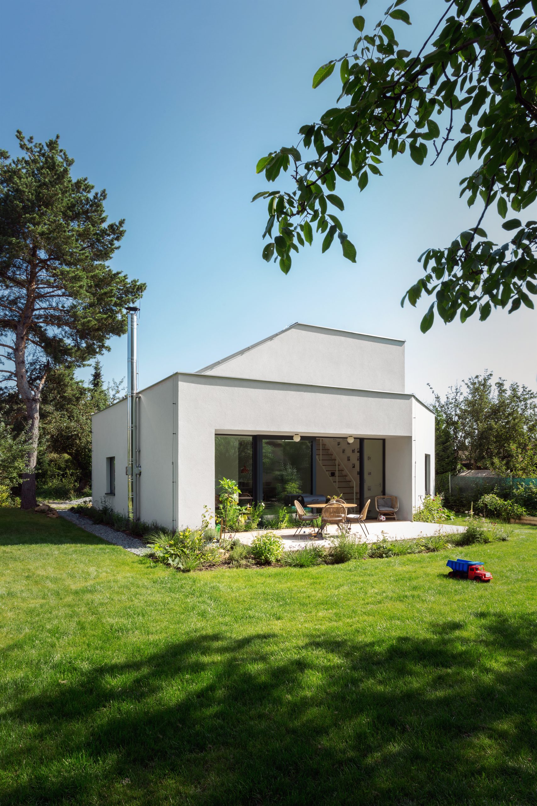 Into the calm and peaceful environment of residential district in Kamenice, located in the southeast surroundings of Prague, we propose a design of a family house, which we situate on a flat plot in the corner of the street. The composition of the house reflects the idea of a four member family living in it. The plot itself has already grown and evolved with the rest of the district, we appreciate and respect this layout by situating the main part of the building into the center of the plot, preserving grown trees in its surroundings. The most attractive side of the house faces southwest, serving as medium interconnecting the house with the garden in the maximum width possible. The house disposes with a square ground plan without hallways, where the adjacent rooms can be accessed from the central living area. Splay of corners changes the shape of rooms and orients them optimally to the cardinal directions. In the banked volume above the living room, disposing with a beautiful landscape view, we see a potential for a guest room or a study.