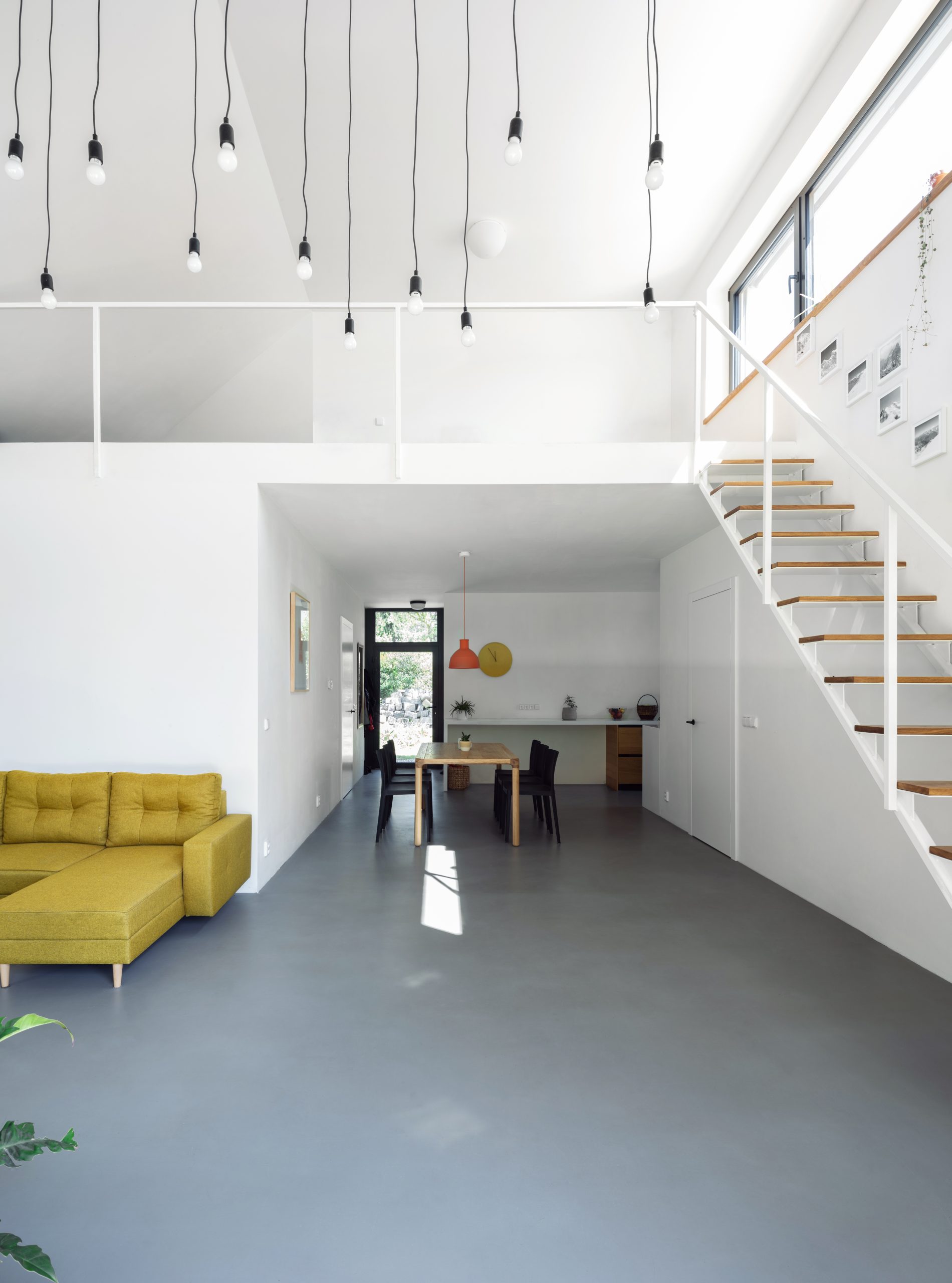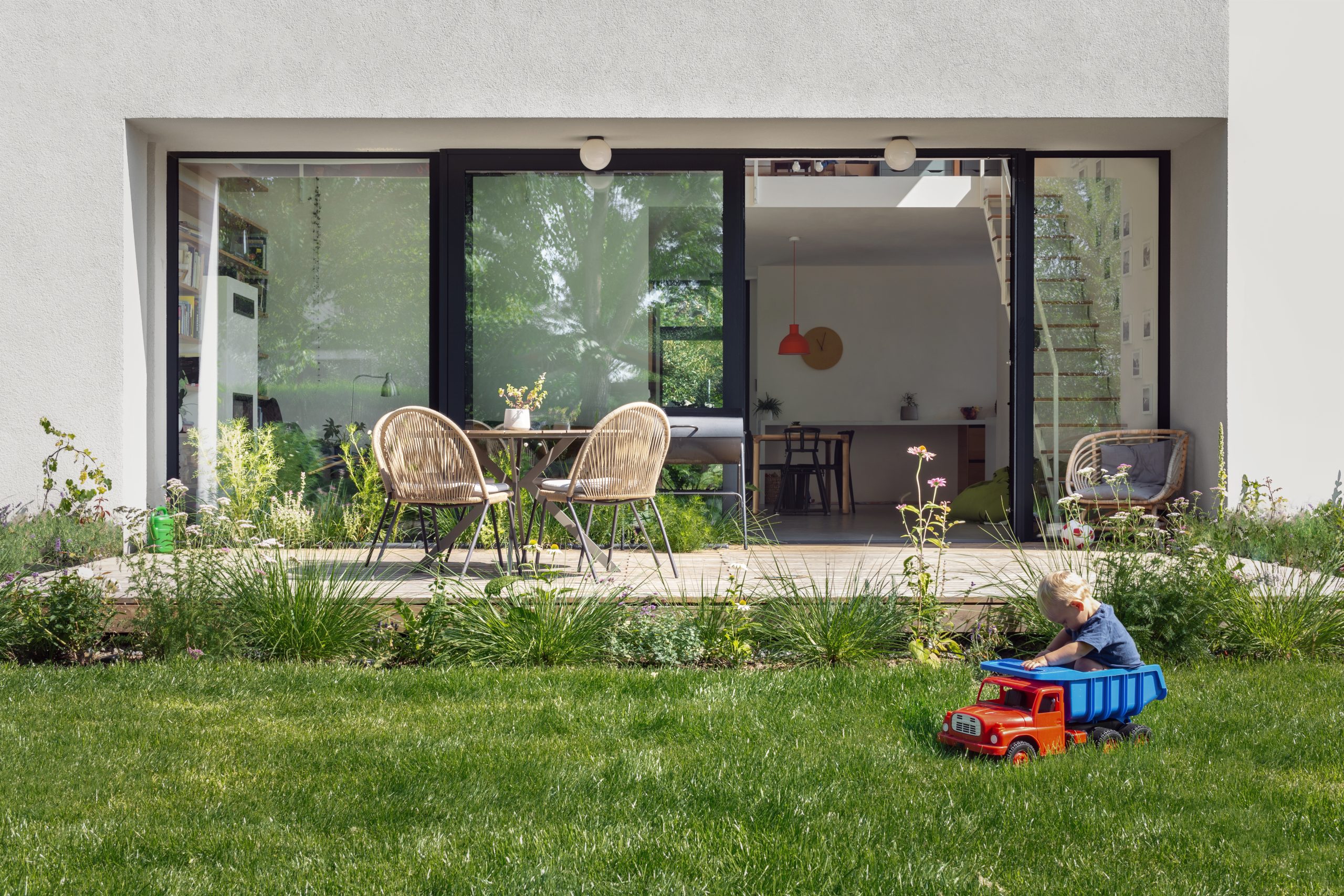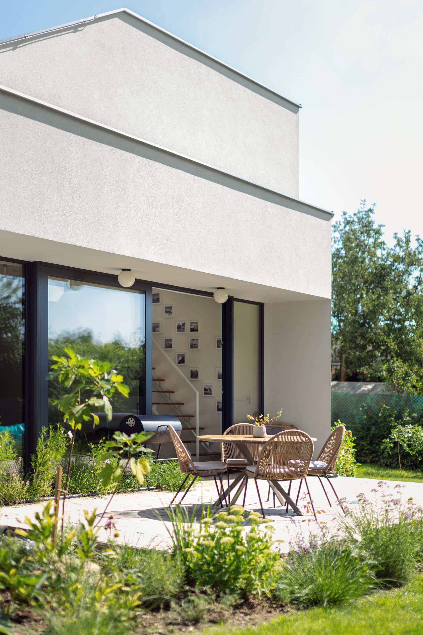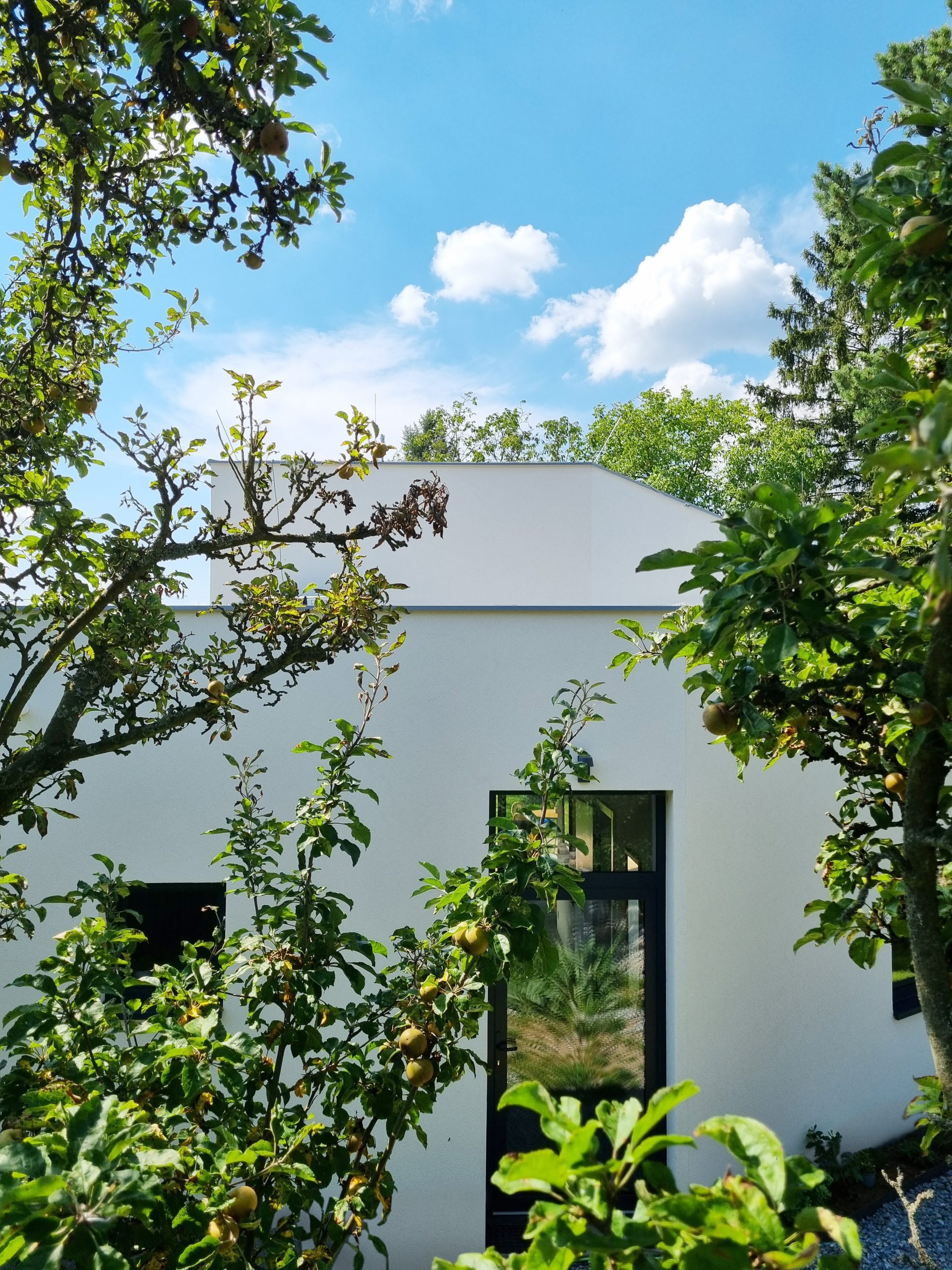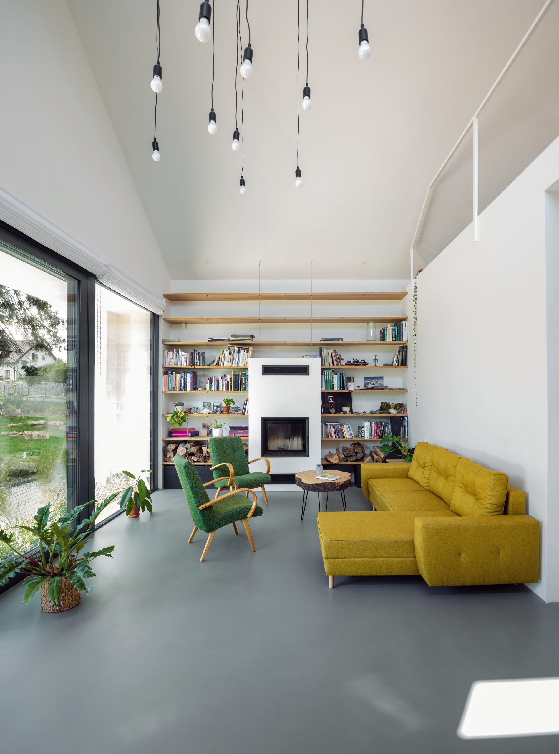 Into the calm and peaceful environment of residential district in Kamenice, located in the southeast surroundings of Prague, we propose a design of a family house, which we situate on a flat plot in the corner of the street. The composition of the house reflects the idea of a four member family living in it. The plot itself has already grown and evolved with the rest of the district, we appreciate and respect this layout by situating the main part of the building into the center of the plot, preserving grown trees in its surroundings. The most attractive side of the house faces southwest, serving as medium interconnecting the house with the garden in the maximum width possible. The house disposes with a square ground plan without hallways, where the adjacent rooms can be accessed from the central living area. Splay of corners changes the shape of rooms and orients them optimally to the cardinal directions. In the banked volume above the living room, disposing with a beautiful landscape view, we see a potential for a guest room or a study.