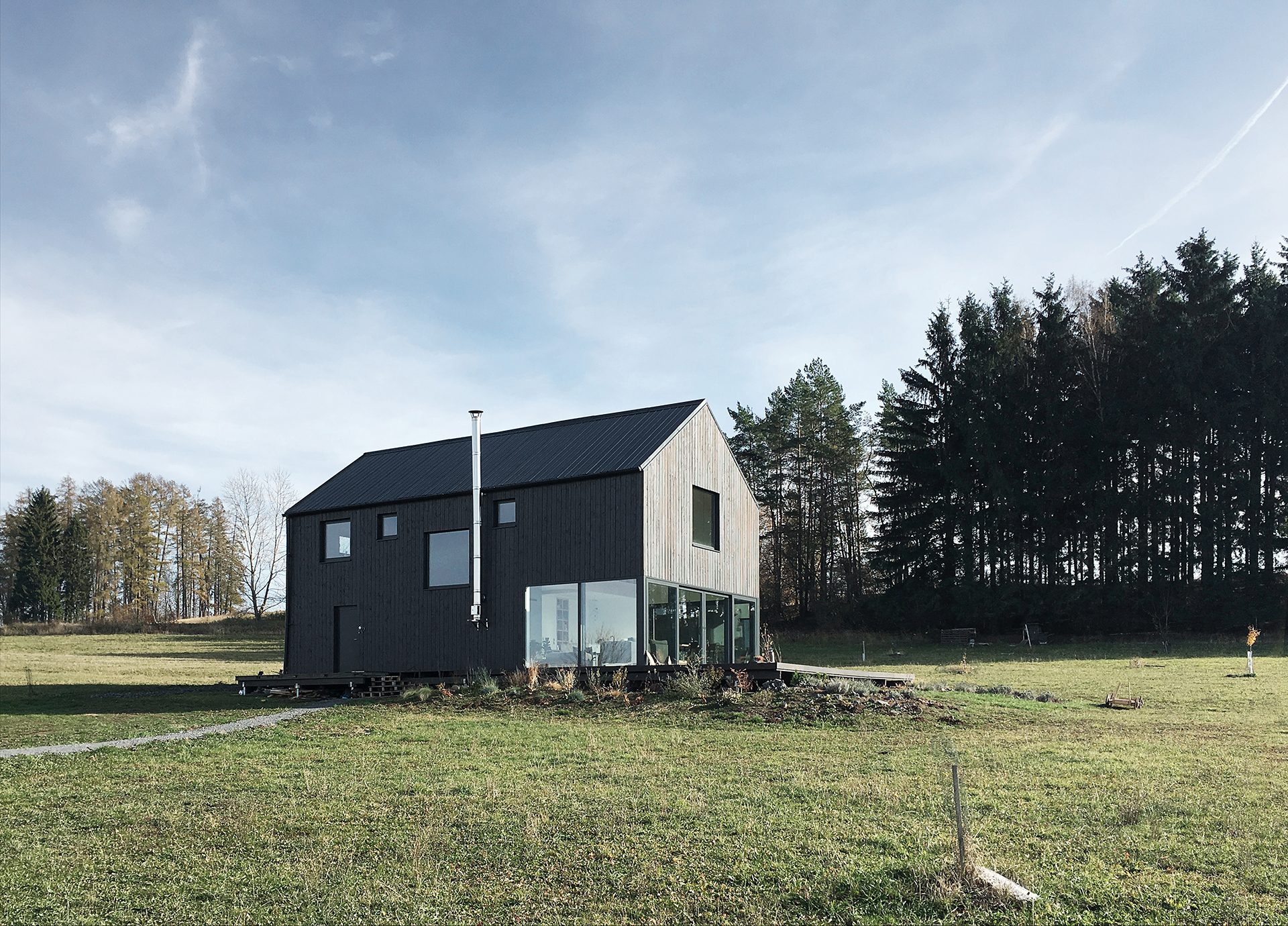 On a slightly sloping meadow in the region Podkrkonoší (near a mountain range in the north of the Czech Republic), we designed a family house with an additional function of a herb dryer. This simple two-storey house with a gabled roof has no intention of standing out, even though its solitary location doesn’t favor this humble ambition. We decided to compensate this by providing it with a strict and austere dark wooden cladding, which enables it to blend in with its dark background created by a small grove. The living room is equipped with a gallery, providing the residents with beautiful landscape view from three sides of the room through big windows. On the first floor there are bedrooms with their own small galeries. The house is connected with adjacent herb garden, divided into smaller parts, based on distinctive permacultural zones.