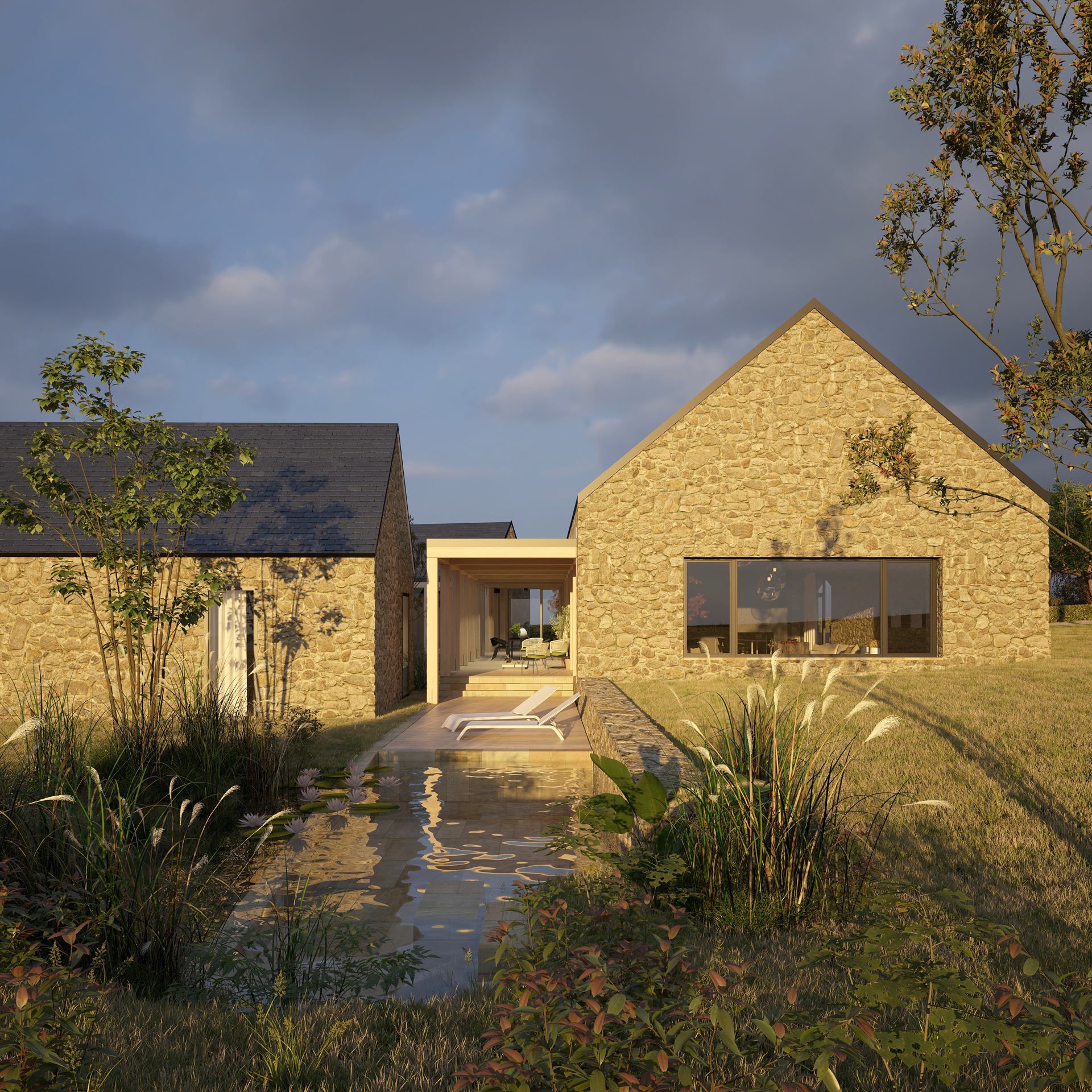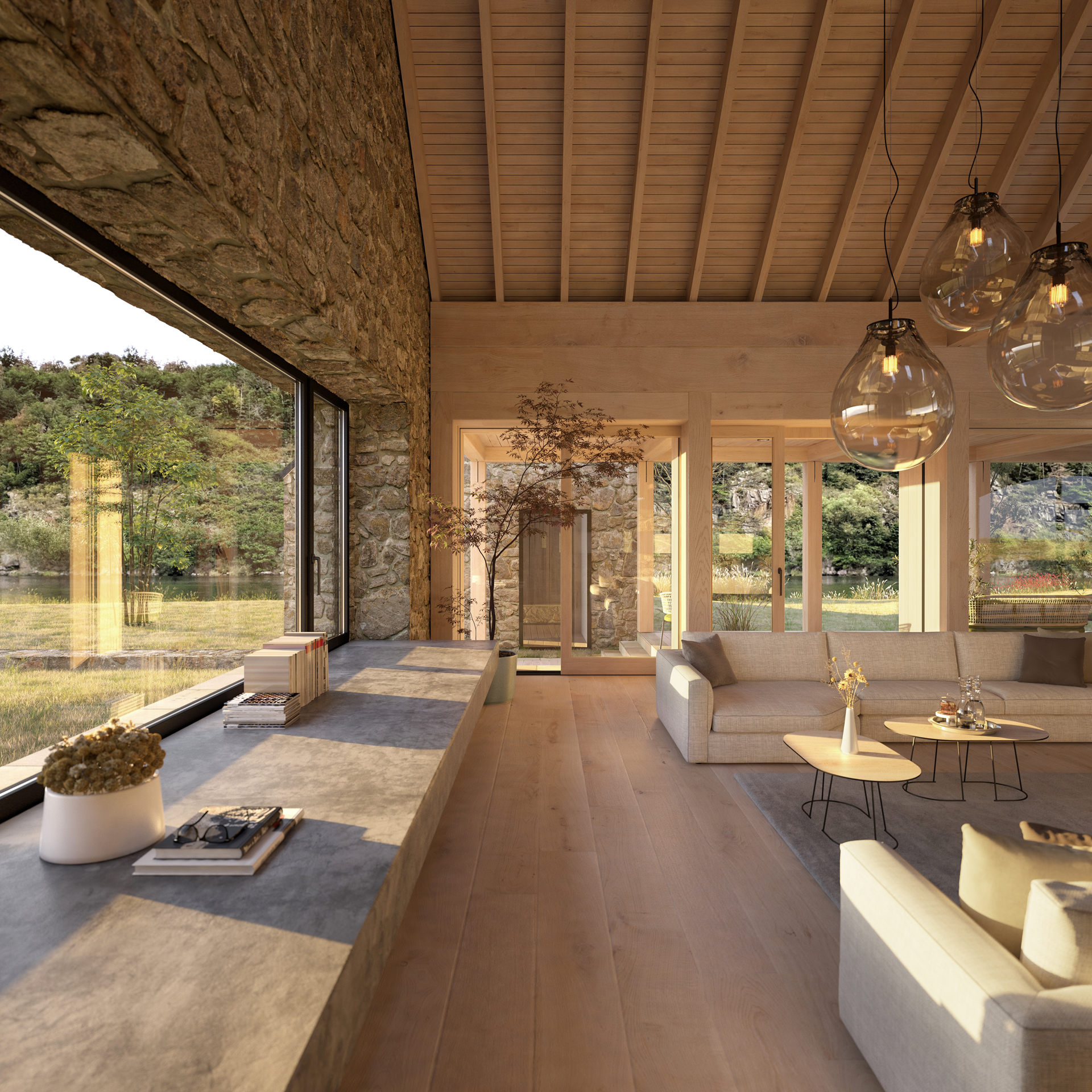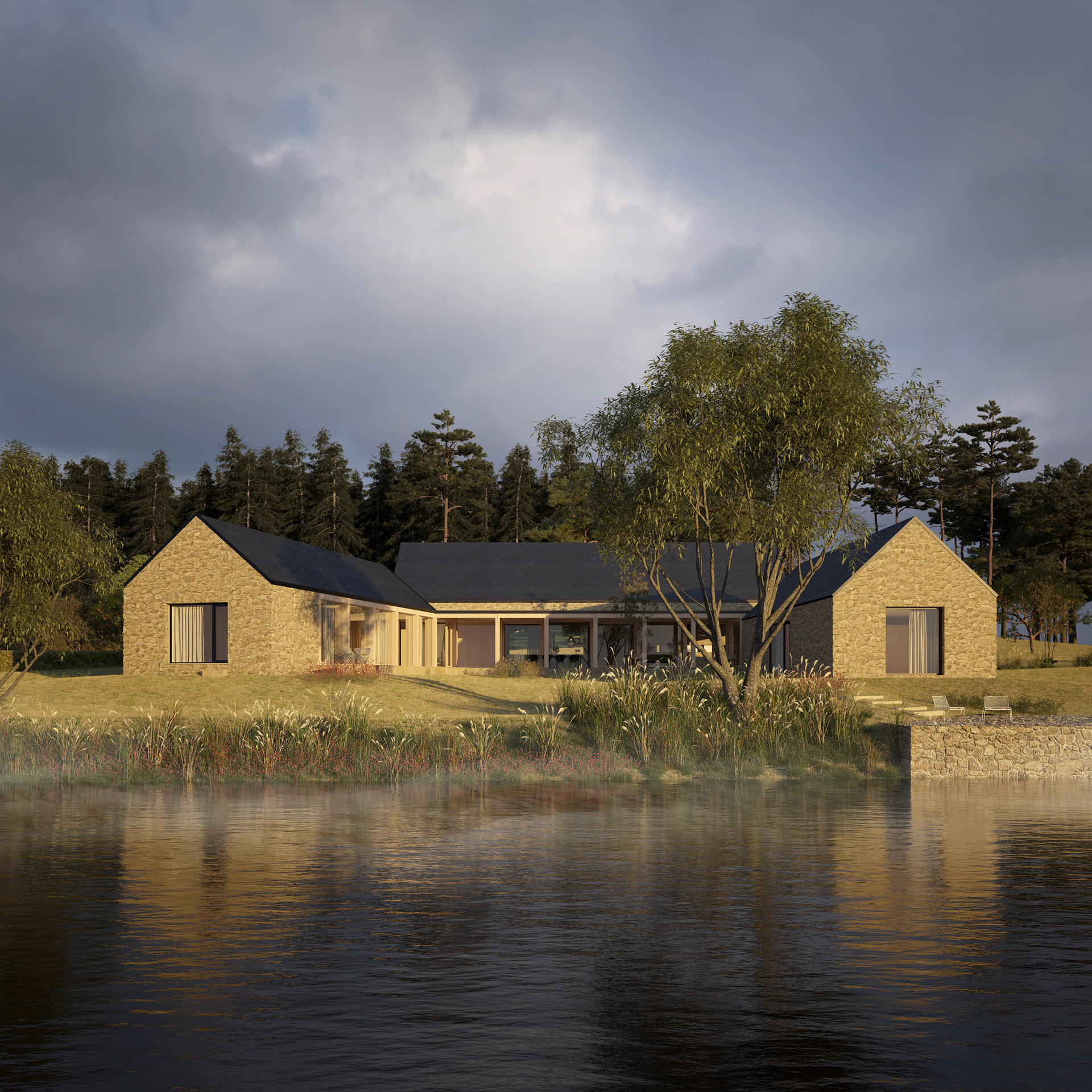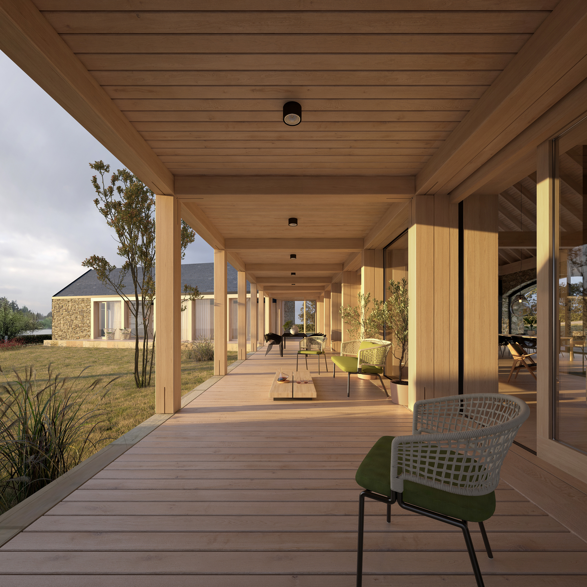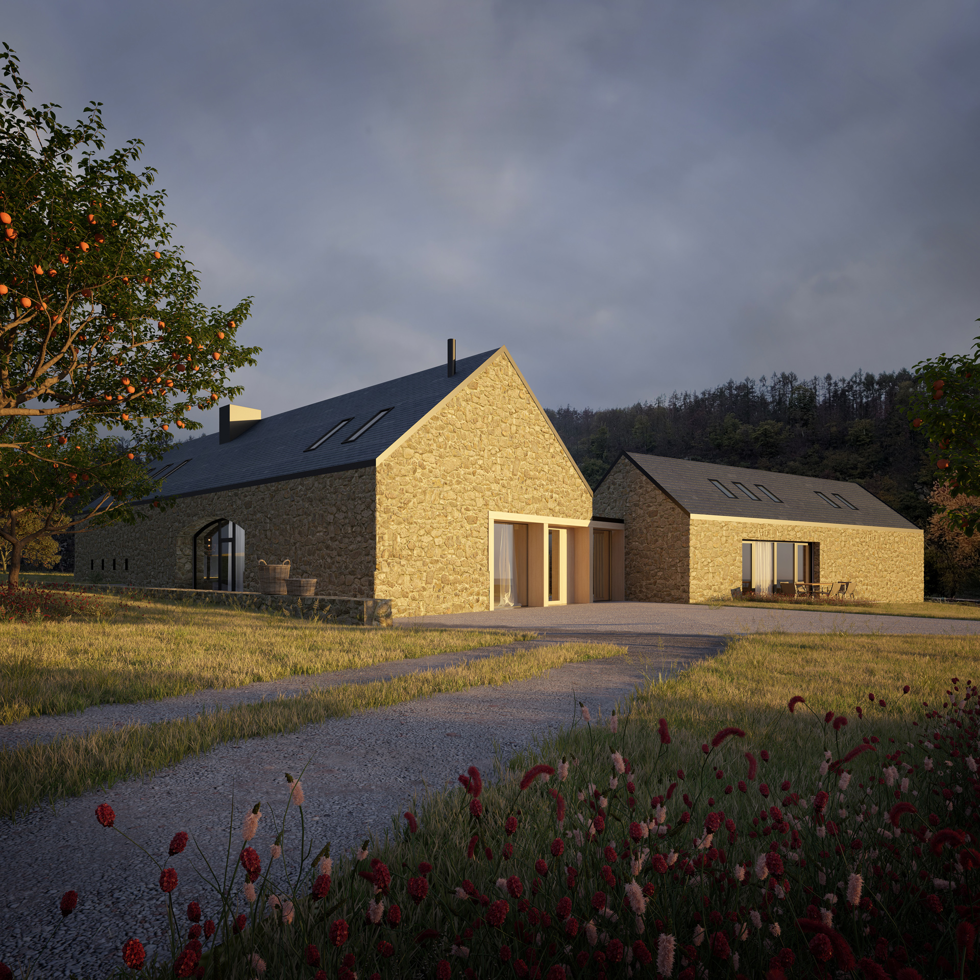 The homestead is made of 3 simple rectangular volumes with sloped roof following its historical counterpart. Both the existing and the opposing volumes are smaller than the larger central object with a scale of a former barn. All three objects are interconnected by a continuous porch alongside the main volume glazed wall. While the key material for the walls of our proposed volumes is the same granite from a local quarry used on the existing buildings, the roofs are finished in slate tiles. These two materials are completed by a larch wood used on window frames, the porch structure and the roof itself.