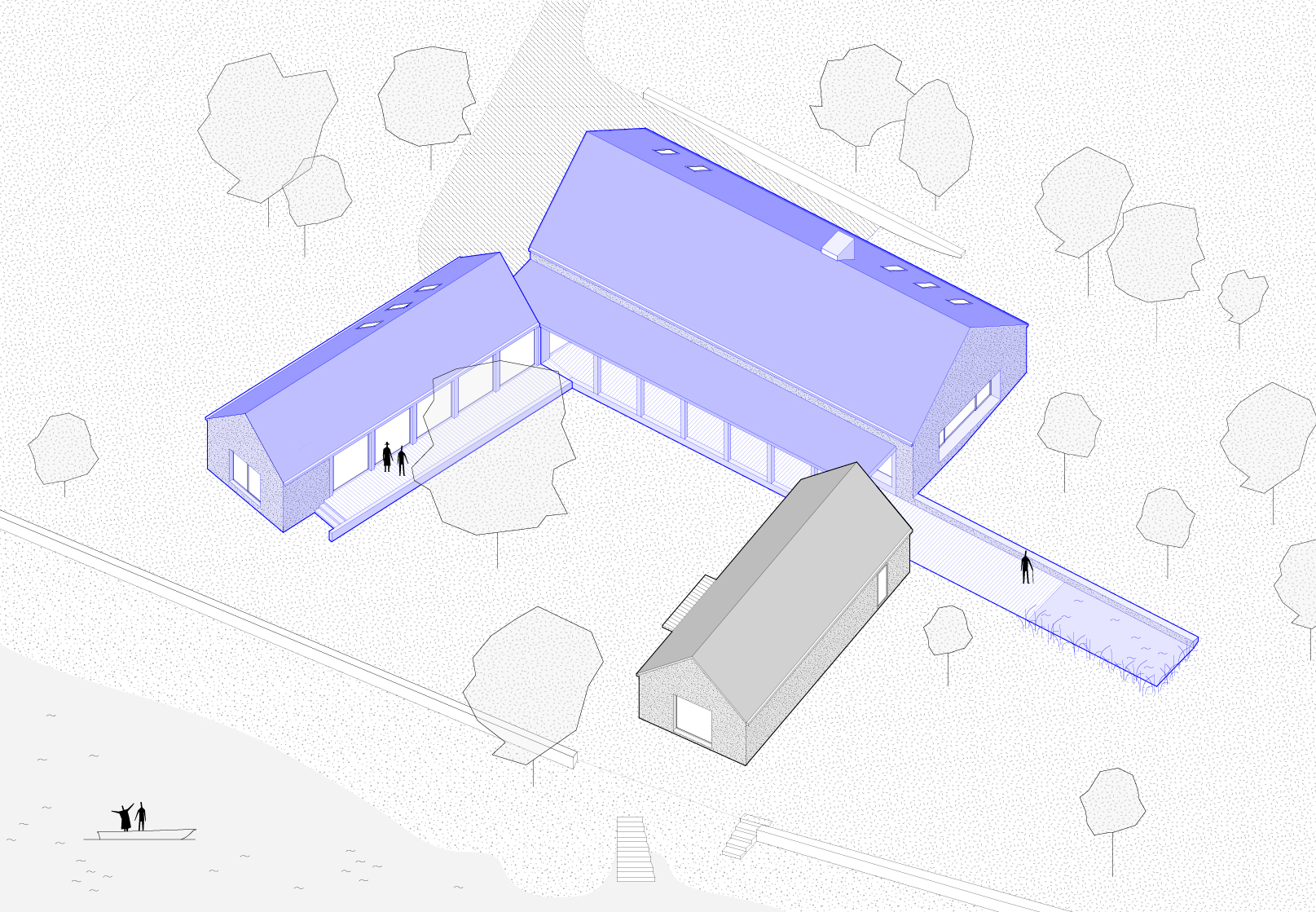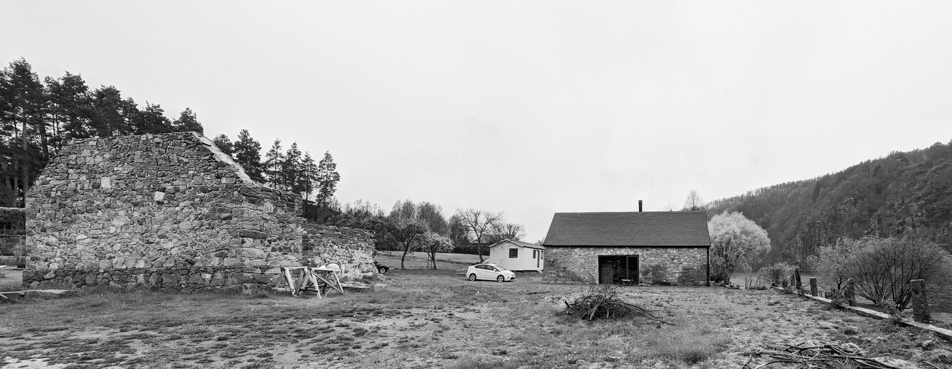 Just one house and some parts of stone walls now remain from a homestead that once stood far away, in one of the meanders of river Vltava. In an effort to restore the place we complement the remaining house with two additional buildings. All three objects then create an U-shaped composition with central courtyard. This setting is typical for most historical village houses, including the one that used to stand here. Considering the present needs of our client, the composition we propose is a sensitive interpretation of the former setup rather than its straightforward restoration. That is why we open the courtyard towards the river unlike the original orientation of the buildings. Thanks to the regulation by cascading, the river no longer poses a threat, instead it is one of the best qualities of the location.