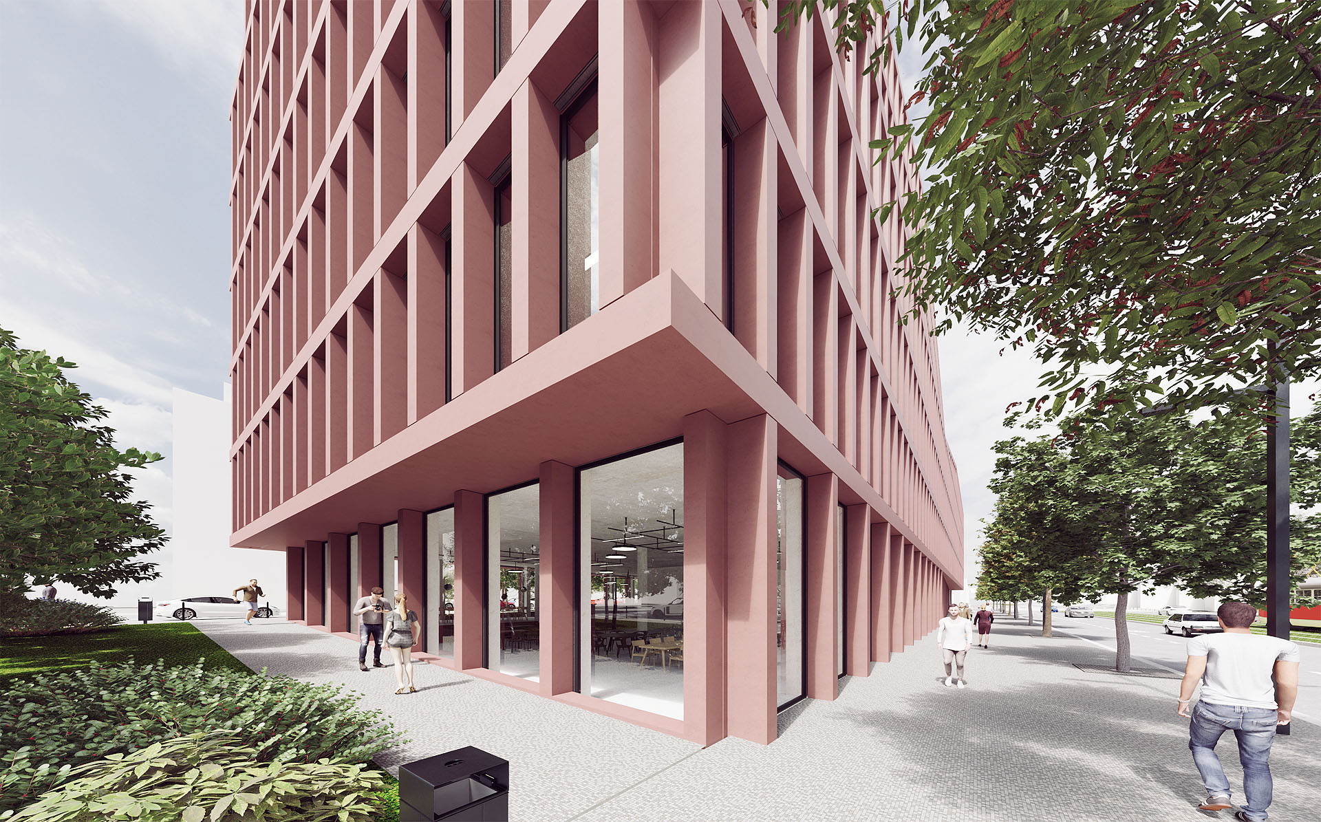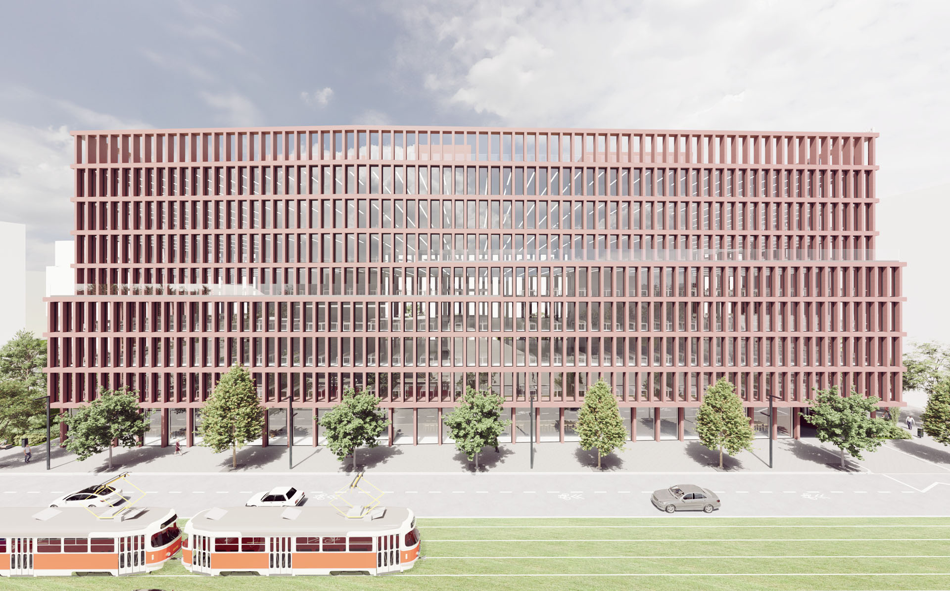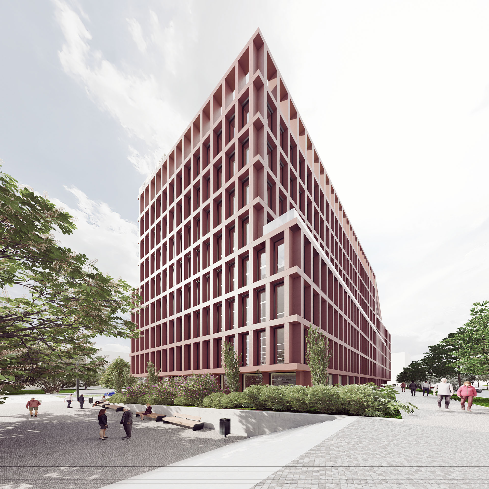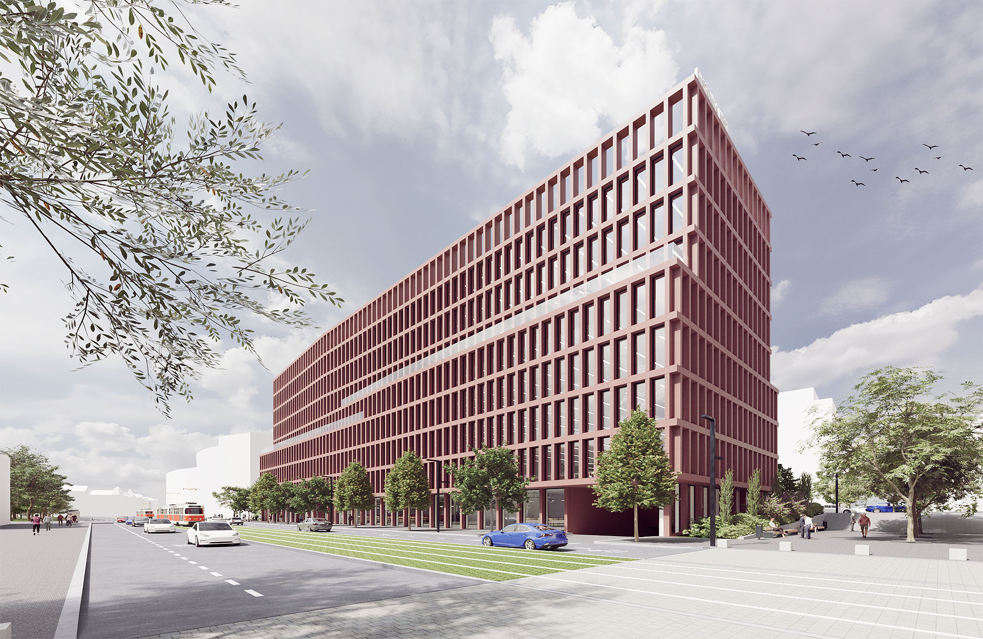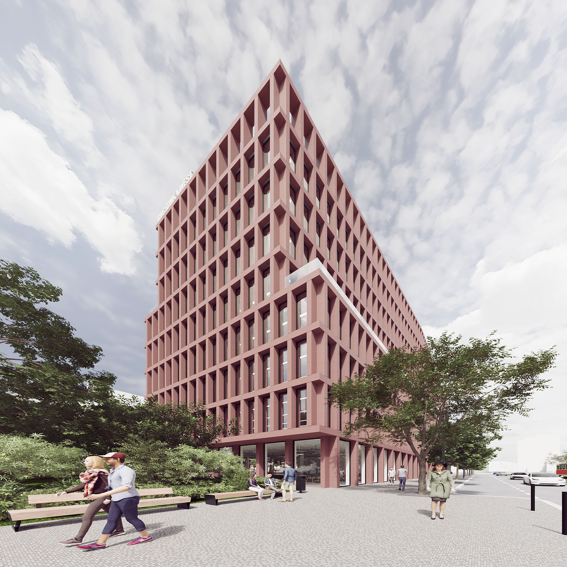 Šířka parcely v nejužším místě odpovídá ideální šířce pětitraktové administrativní budovy. Budovu umisťujeme na západní cíp pozemku tak, aby vytvářela výškovou dominantu na křižovatce a protipól k historické budově Invalidovny. Mezi navrhovanou budovou a objektem J&T banky tak vzniká prostor navazující na plánovanou pěší zónu zástavby Rohanského ostrova. Základní objekt tvarujeme tak, aby kopíroval uliční čáry ulic Sokolovská a Rohanské nábřeží. Objekt se tak směrem na západ zalamuje a zužuje. Tento princip lehkého zalamování následně aplikujeme i na další podlaží.
