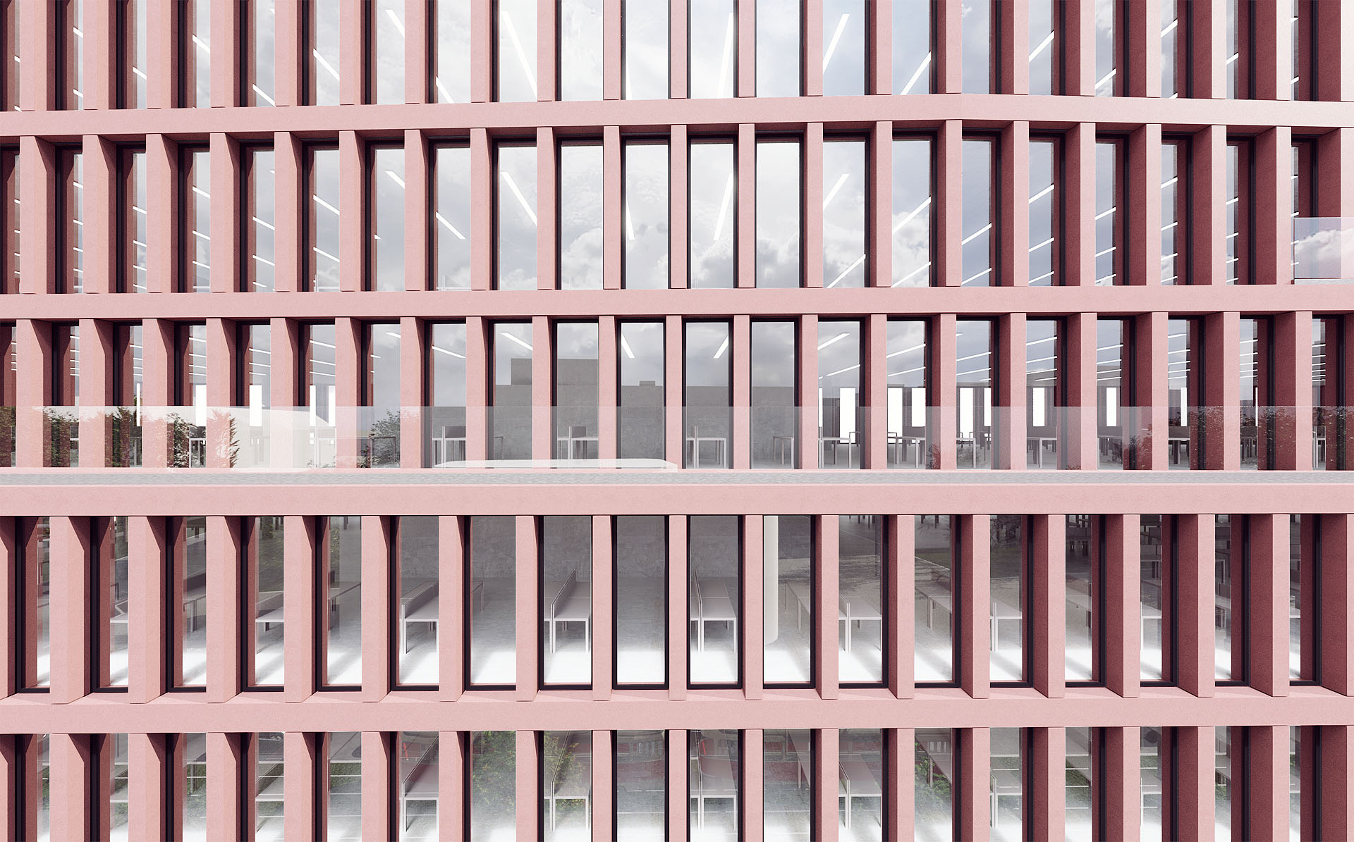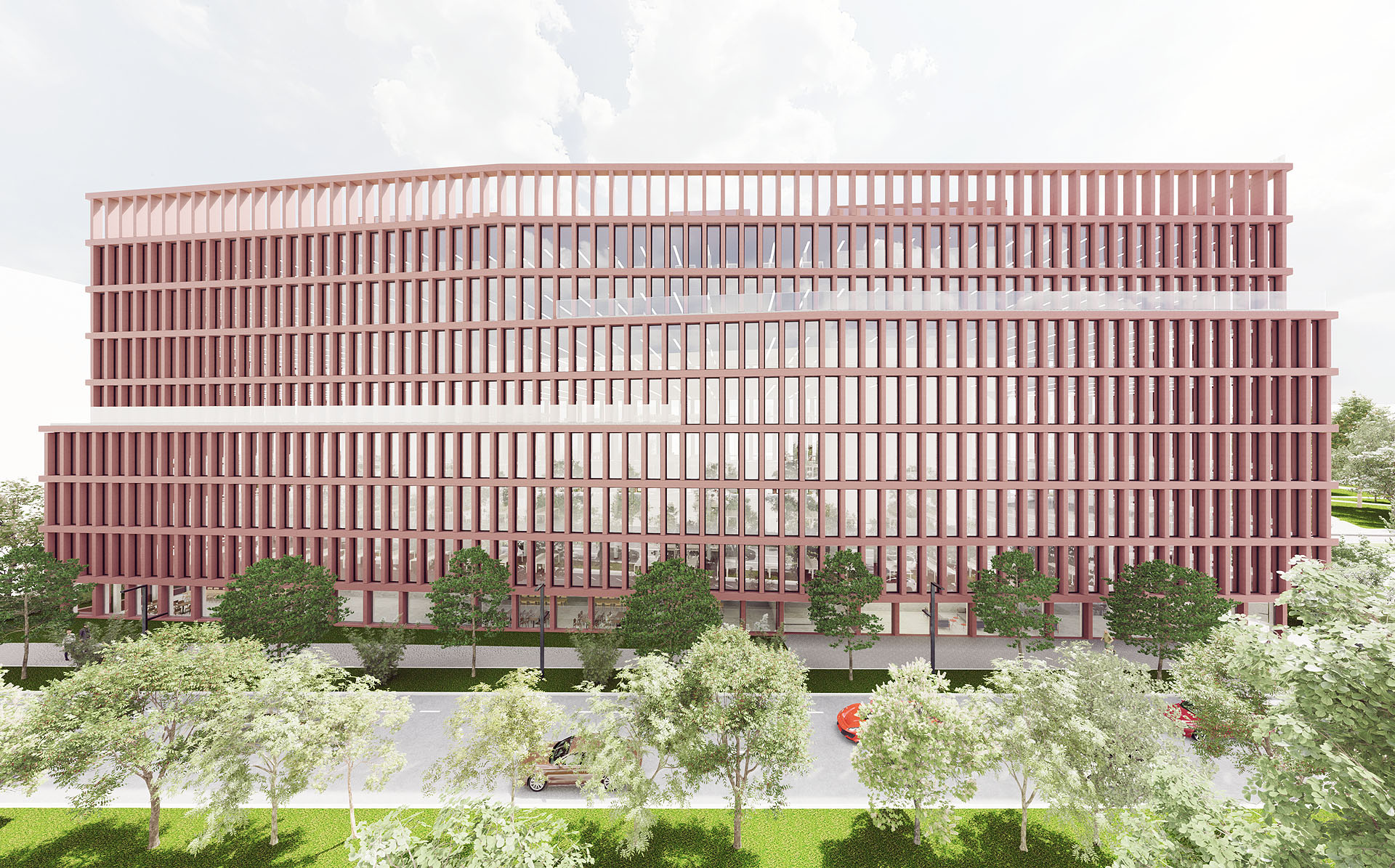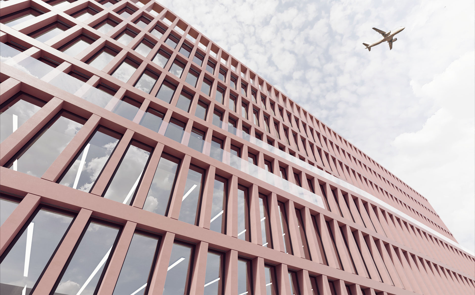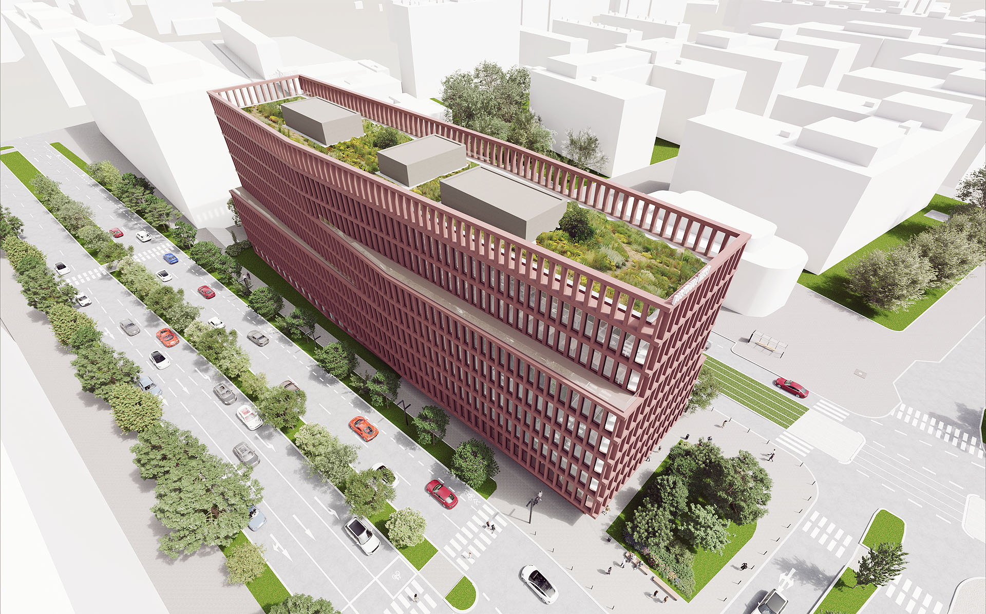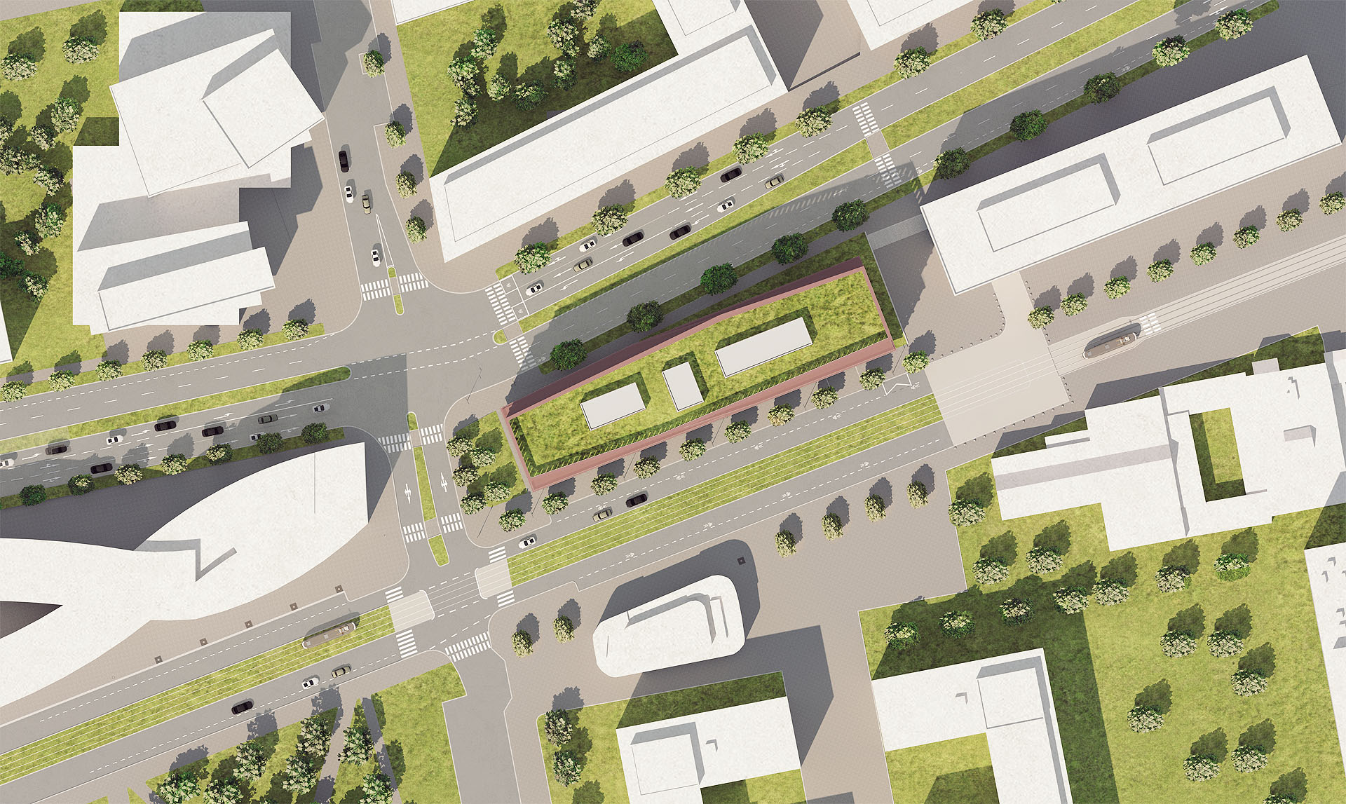 Šířka parcely v nejužším místě odpovídá ideální šířce pětitraktové administrativní budovy. Budovu umisťujeme na západní cíp pozemku tak, aby vytvářela výškovou dominantu na křižovatce a protipól k historické budově Invalidovny. Mezi navrhovanou budovou a objektem J&T banky tak vzniká prostor navazující na plánovanou pěší zónu zástavby Rohanského ostrova. Základní objekt tvarujeme tak, aby kopíroval uliční čáry ulic Sokolovská a Rohanské nábřeží. Objekt se tak směrem na západ zalamuje a zužuje. Tento princip lehkého zalamování následně aplikujeme i na další podlaží.