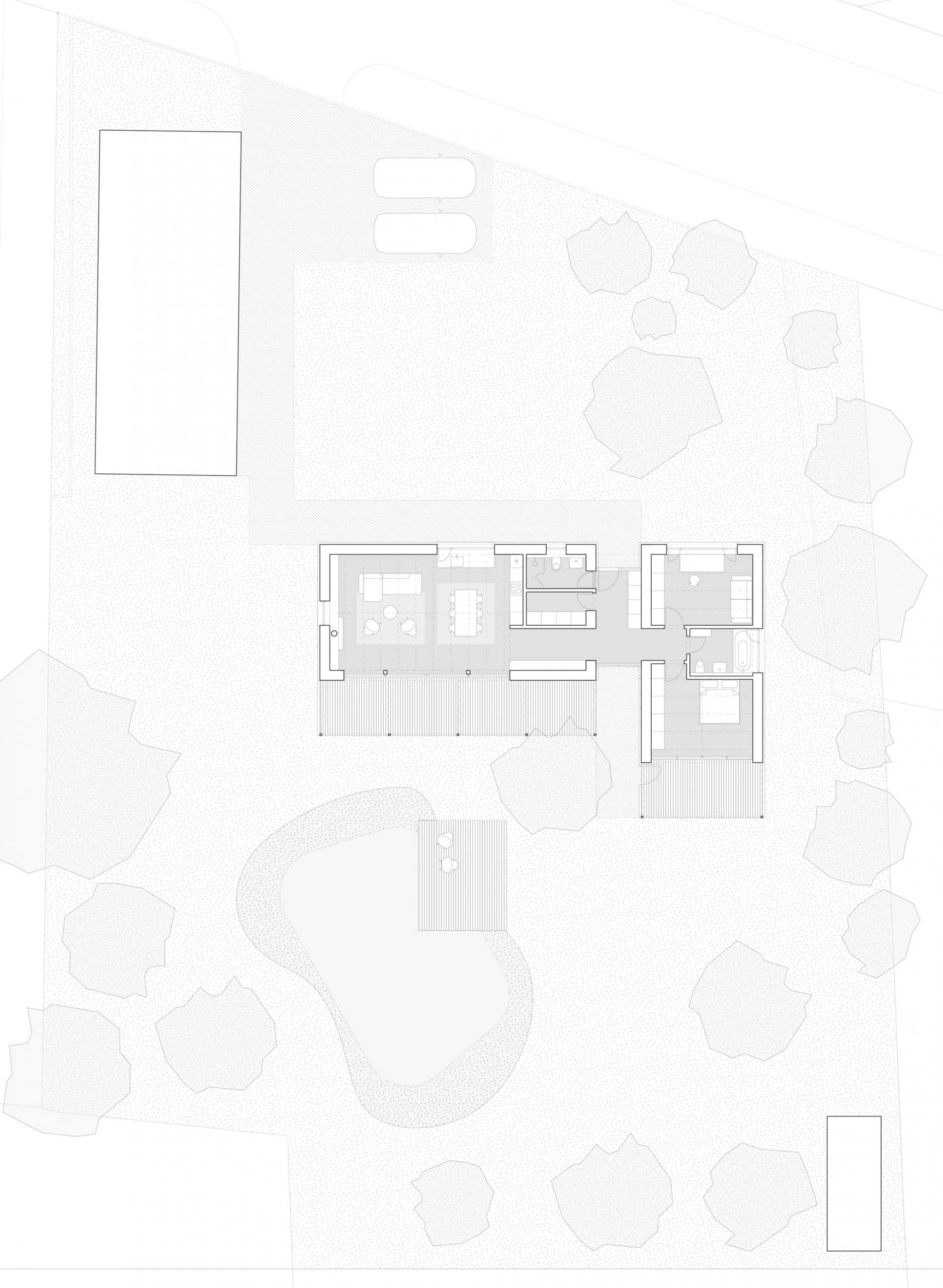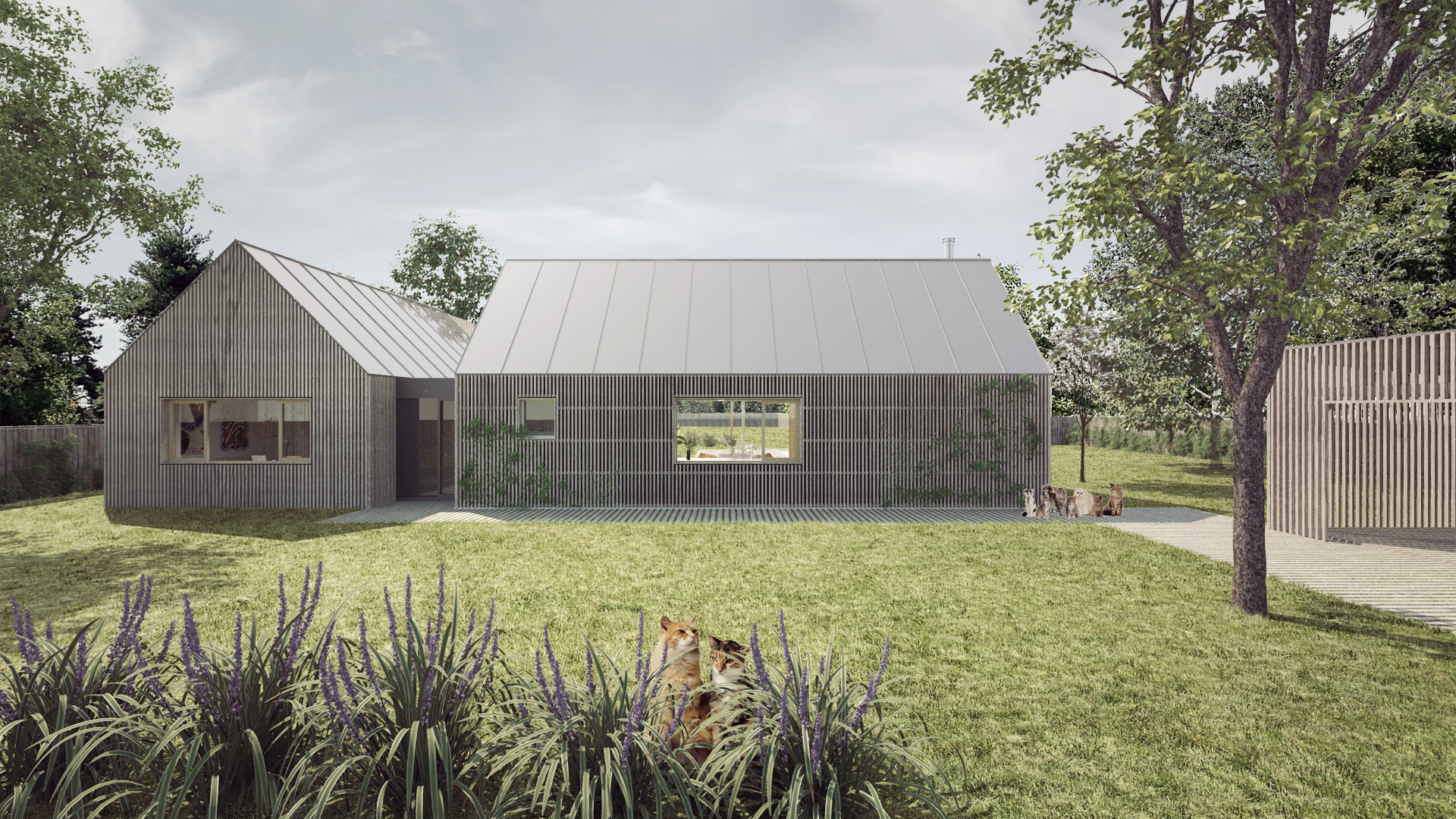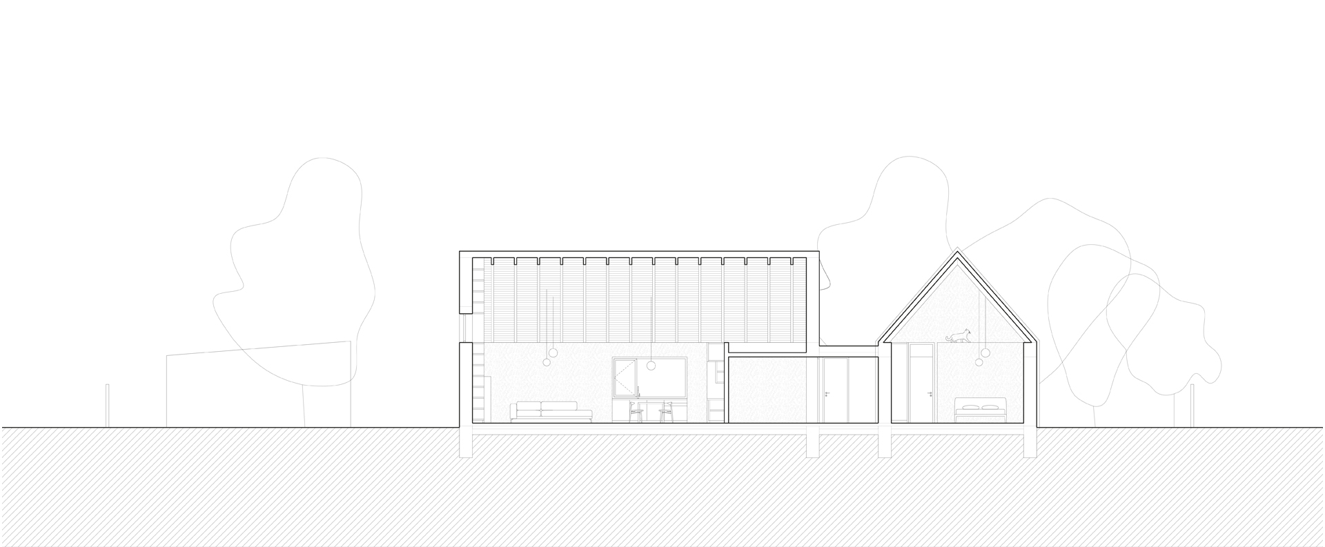 Denní a noční provoz jsme rozdělili do dvou samostatných hmot se sedlovou střechou a předsazenou pergolou vzájemně propojených krčkem. Pergoly reagují svým tvarem na orientaci k jihu a navazují na obě hmoty prostřednictvím sjednocujícího pláště z dřevěných latí.