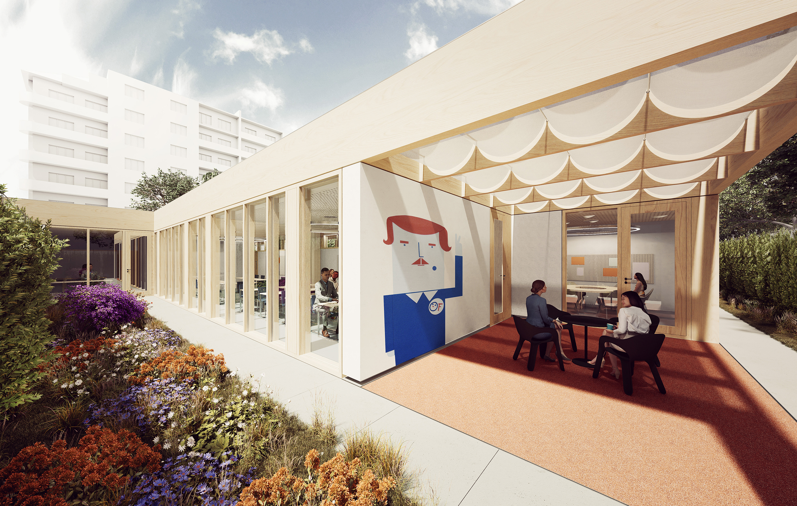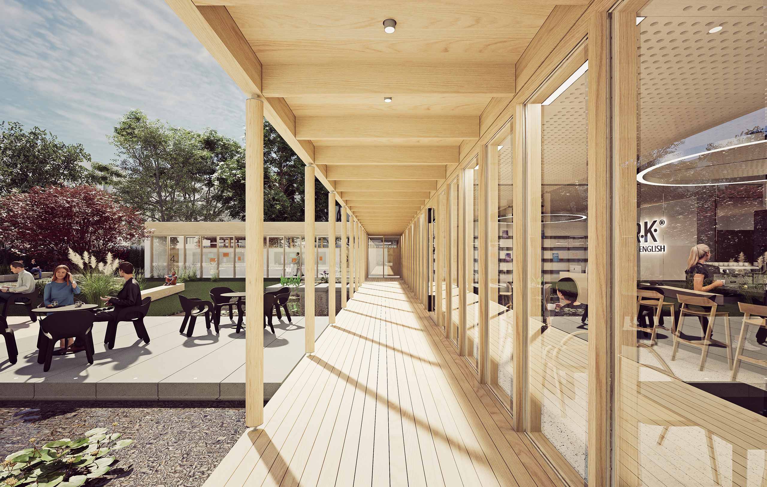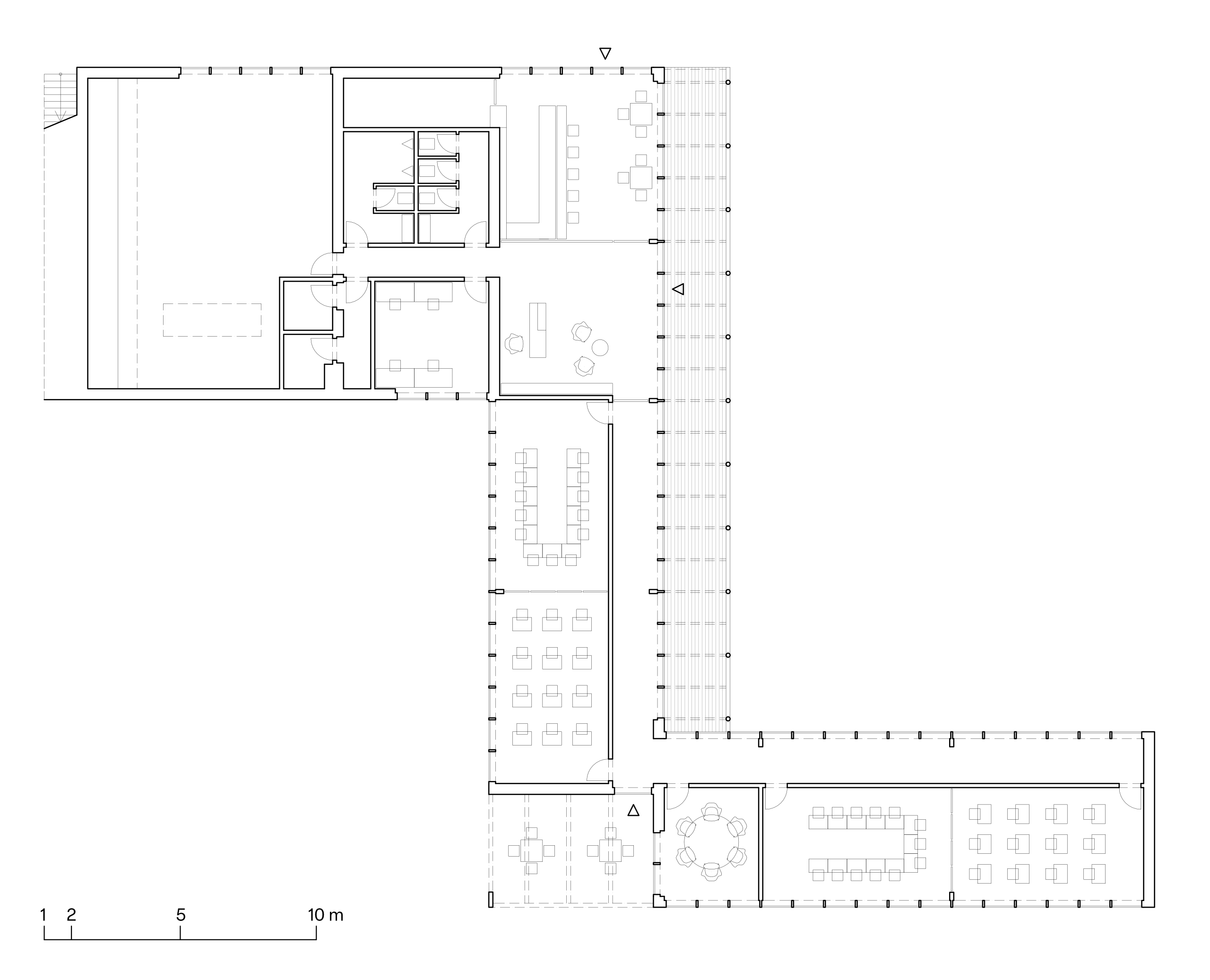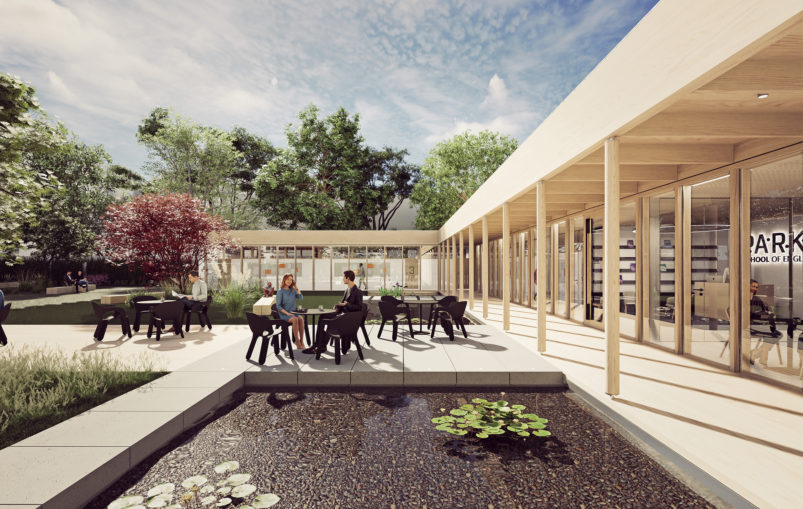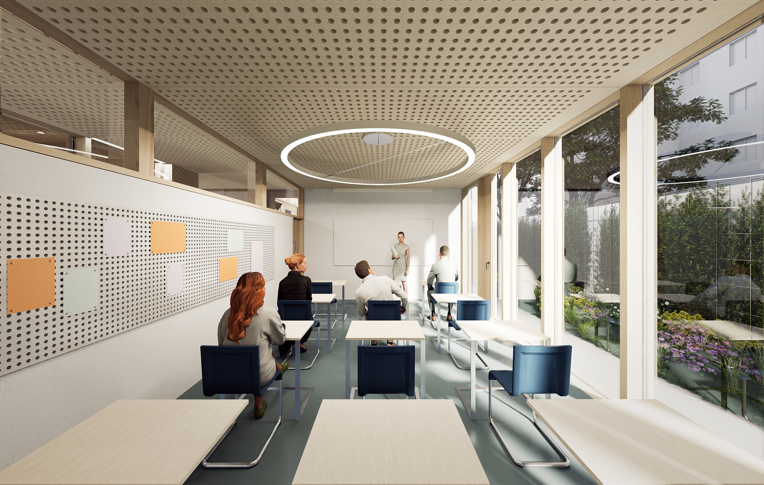 Jednopodlažní objekt ve tvaru Z vymezuje v rámci vnitrobloku prostornou zahradu s prvky pro odpočinek a venkovní výuku. Rozhraní mezi školou a zahradou vytváří částečně krytá terasa a klidná hladina přírodního biotopu. Objekt samotný se do zahrady otevírá velkoryse proskleným ochozem, který zpřístupňuje jednotlivé učebny a zasedací místnosti. V nejvíce exponované části dispozice je umístěno prostorné foyer s kavárnou a recepcí.