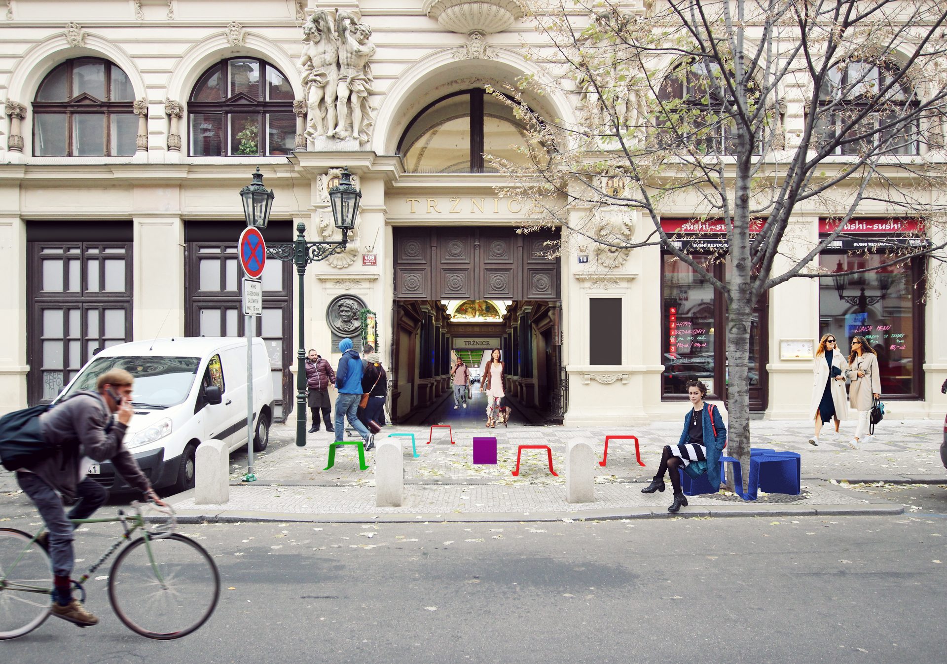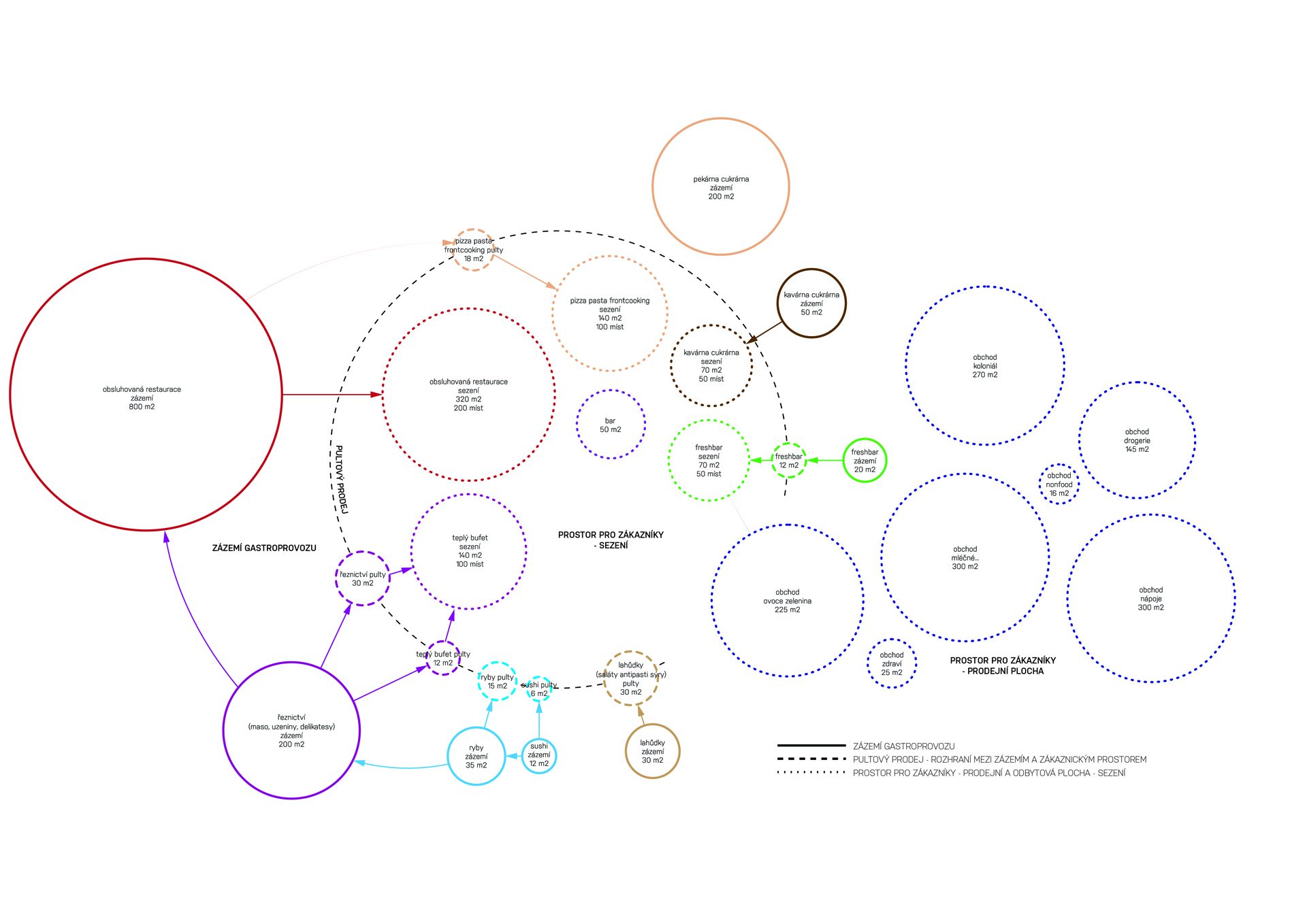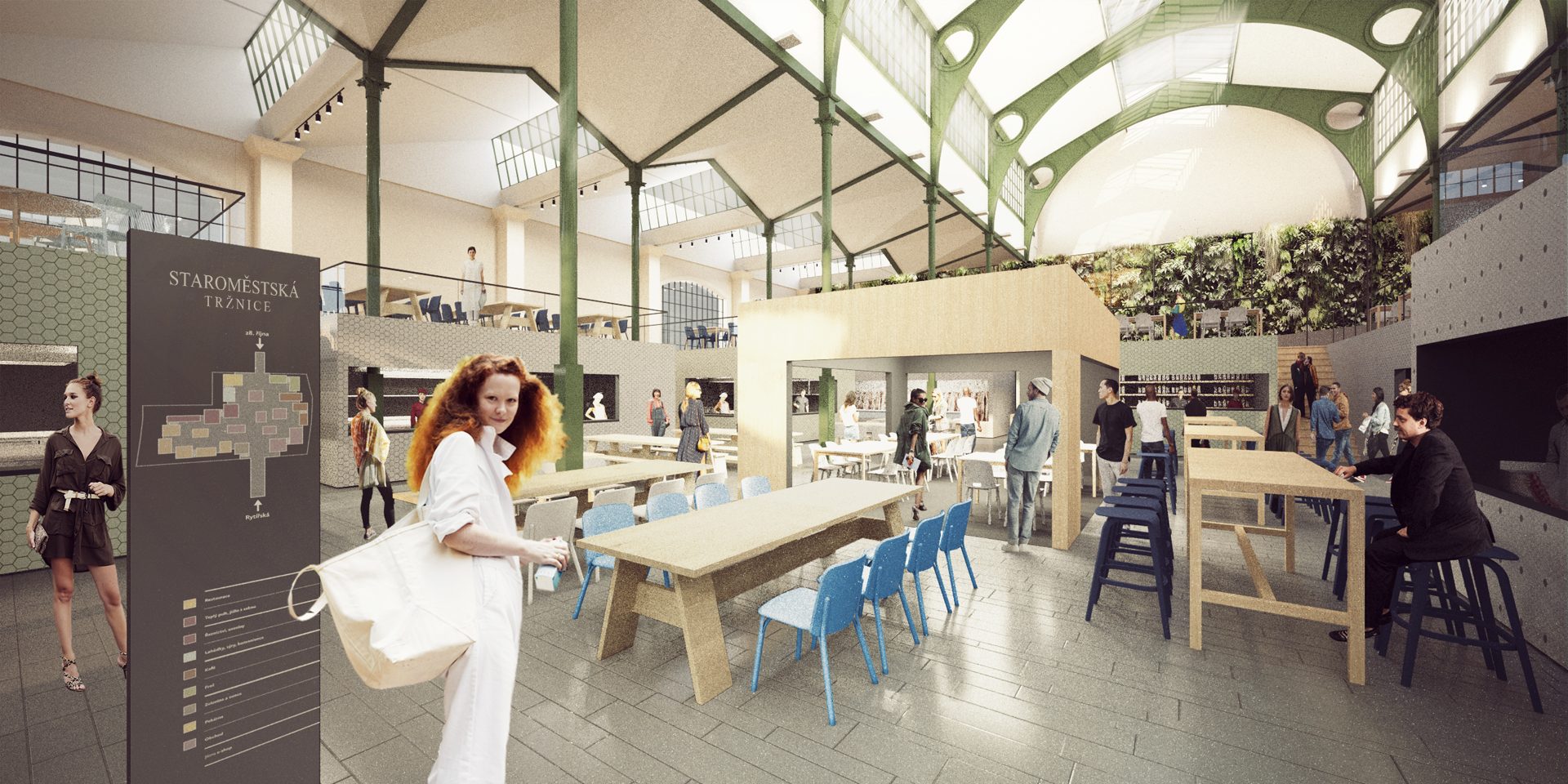 Město Praha plánuje rekonstruovat Staroměstskou tržnici a vybrat pronajímatele prostor. Pro nejmenovaného klienta jsme vytvořili koncept rekonstrukce tržnice tak, abychom do ní navrátili její původní funkci. Principem prostorového uspořádání je navázání na živelné až chaotické středověké tržiště, kde však platí jasná pravidla ohledně rozmístění prodávaného sortimentu a pohybu zákazníků. Navržená rostlá kompozice prodejních stánků – boxů, vytváří nepravidelná příjemná zákoutí, a zároveň umožňuje zákazníkům postupně objevovat nabízený sortiment. Zákazníky láká ke vstupu do obou pasáží instalace barevného mobiliáře umístěného na ulici před vstupy. Poté co zákazník projde velkorysými pasážemi, otevře se před ním nádherný historický prostor tržnice, do kterého jsou nepravidelně vloženy boxy sdružující rozdílné provozy a druhy nabízeného zboží. V okamžiku, kdy je již zákazník unavený intenzivním nakupováním v přízemí, může vyjít po schodišti na galerii podél obvodu tržnice a při kávě nebo u jídla pozorovat život v přízemí.