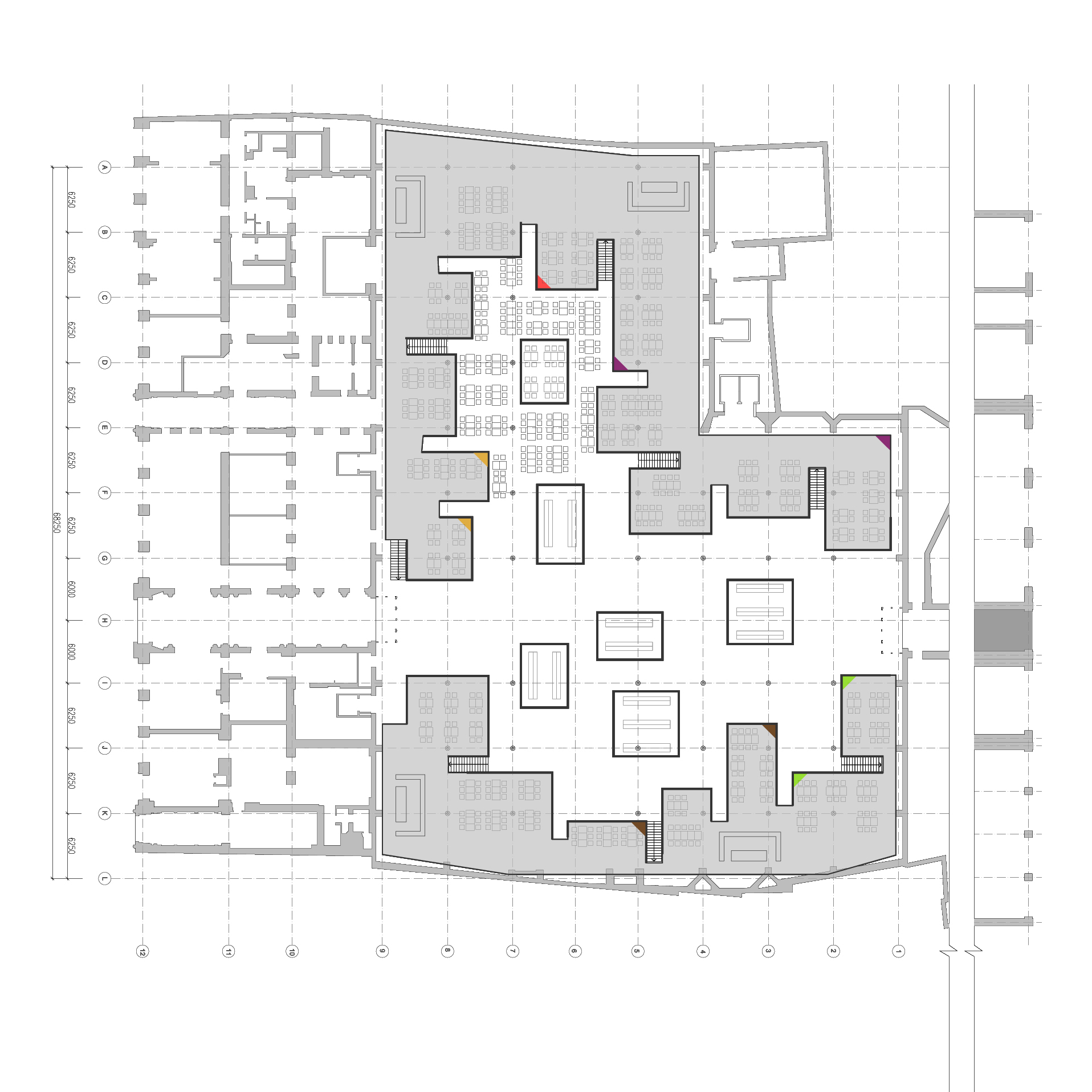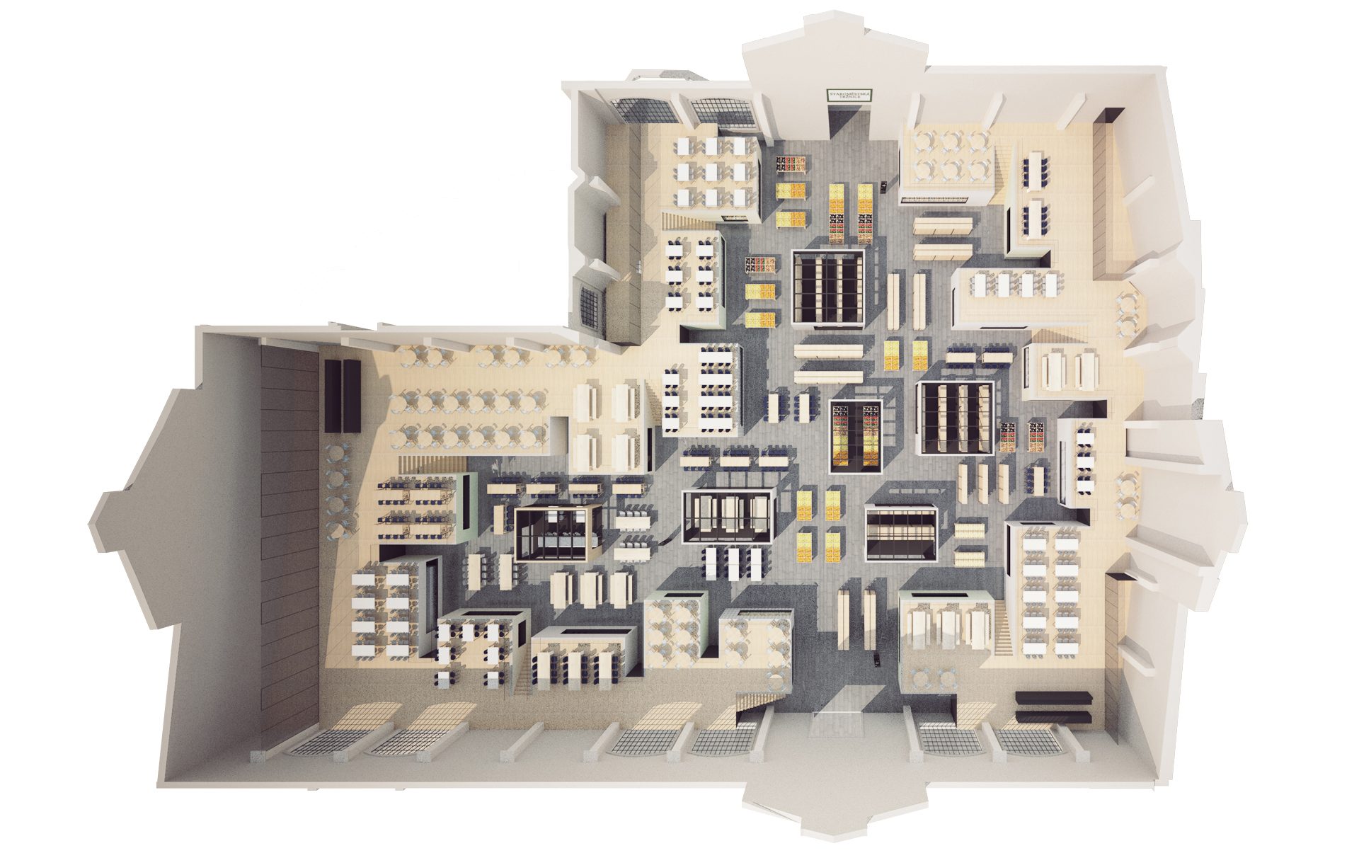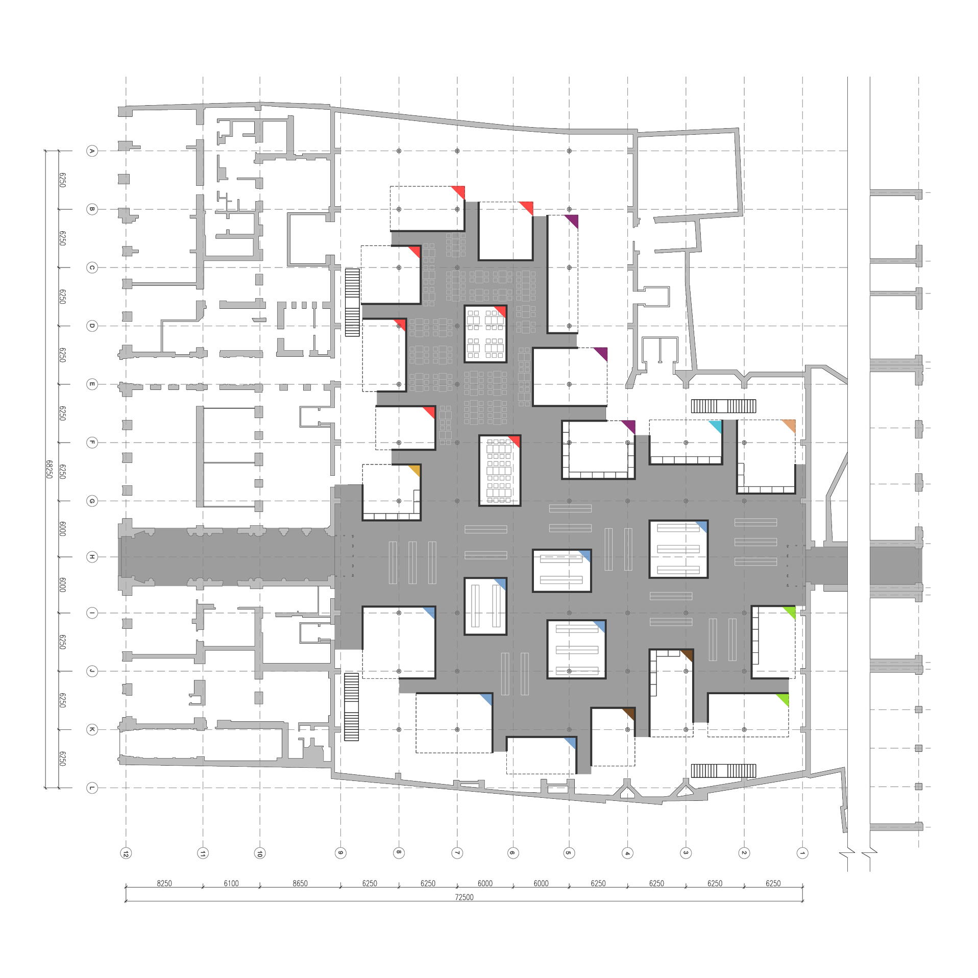 Město Praha plánuje rekonstruovat Staroměstskou tržnici a vybrat pronajímatele prostor. Pro nejmenovaného klienta jsme vytvořili koncept rekonstrukce tržnice tak, abychom do ní navrátili její původní funkci. Principem prostorového uspořádání je navázání na živelné až chaotické středověké tržiště, kde však platí jasná pravidla ohledně rozmístění prodávaného sortimentu a pohybu zákazníků. Navržená rostlá kompozice prodejních stánků – boxů, vytváří nepravidelná příjemná zákoutí, a zároveň umožňuje zákazníkům postupně objevovat nabízený sortiment. Zákazníky láká ke vstupu do obou pasáží instalace barevného mobiliáře umístěného na ulici před vstupy. Poté co zákazník projde velkorysými pasážemi, otevře se před ním nádherný historický prostor tržnice, do kterého jsou nepravidelně vloženy boxy sdružující rozdílné provozy a druhy nabízeného zboží. V okamžiku, kdy je již zákazník unavený intenzivním nakupováním v přízemí, může vyjít po schodišti na galerii podél obvodu tržnice a při kávě nebo u jídla pozorovat život v přízemí.