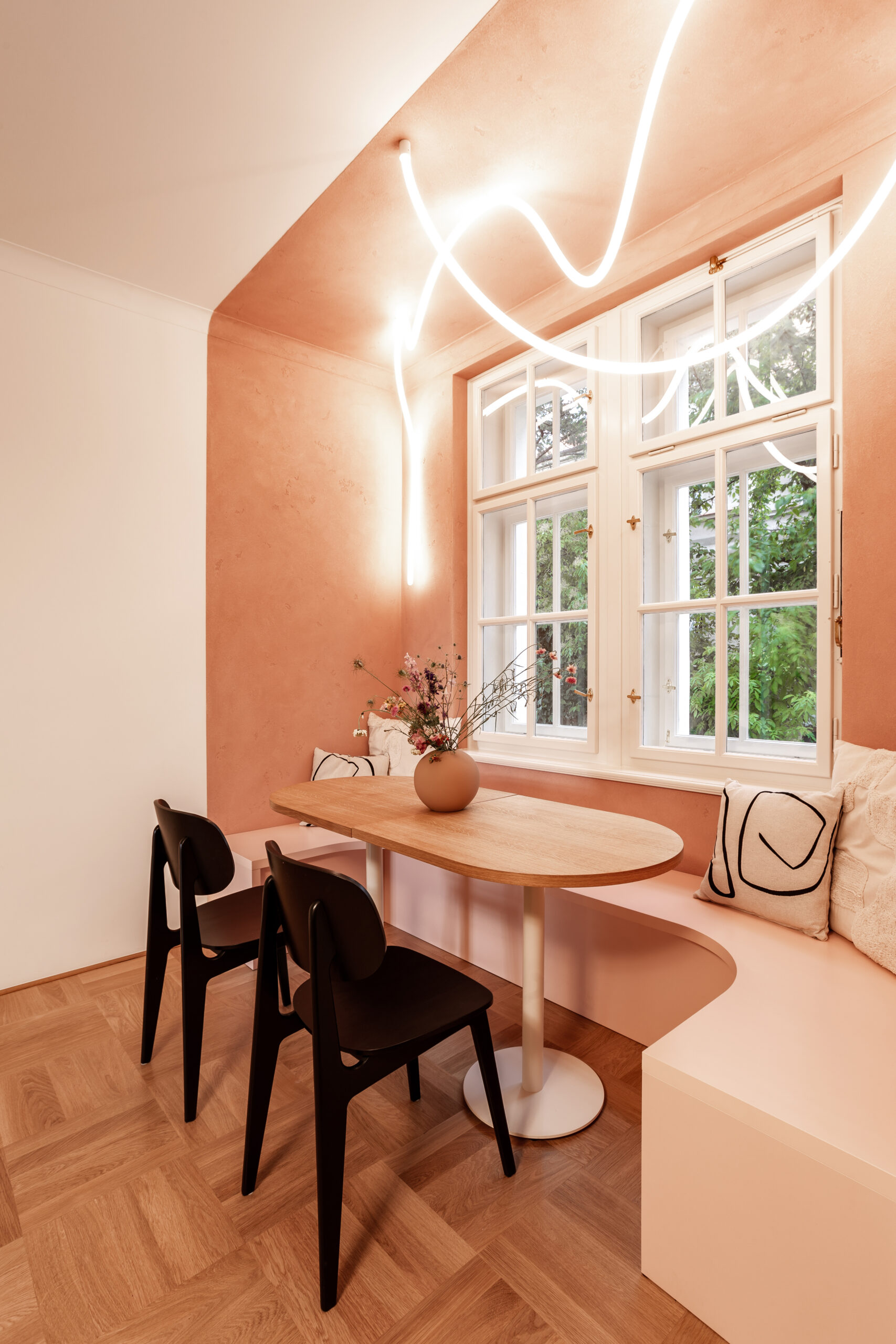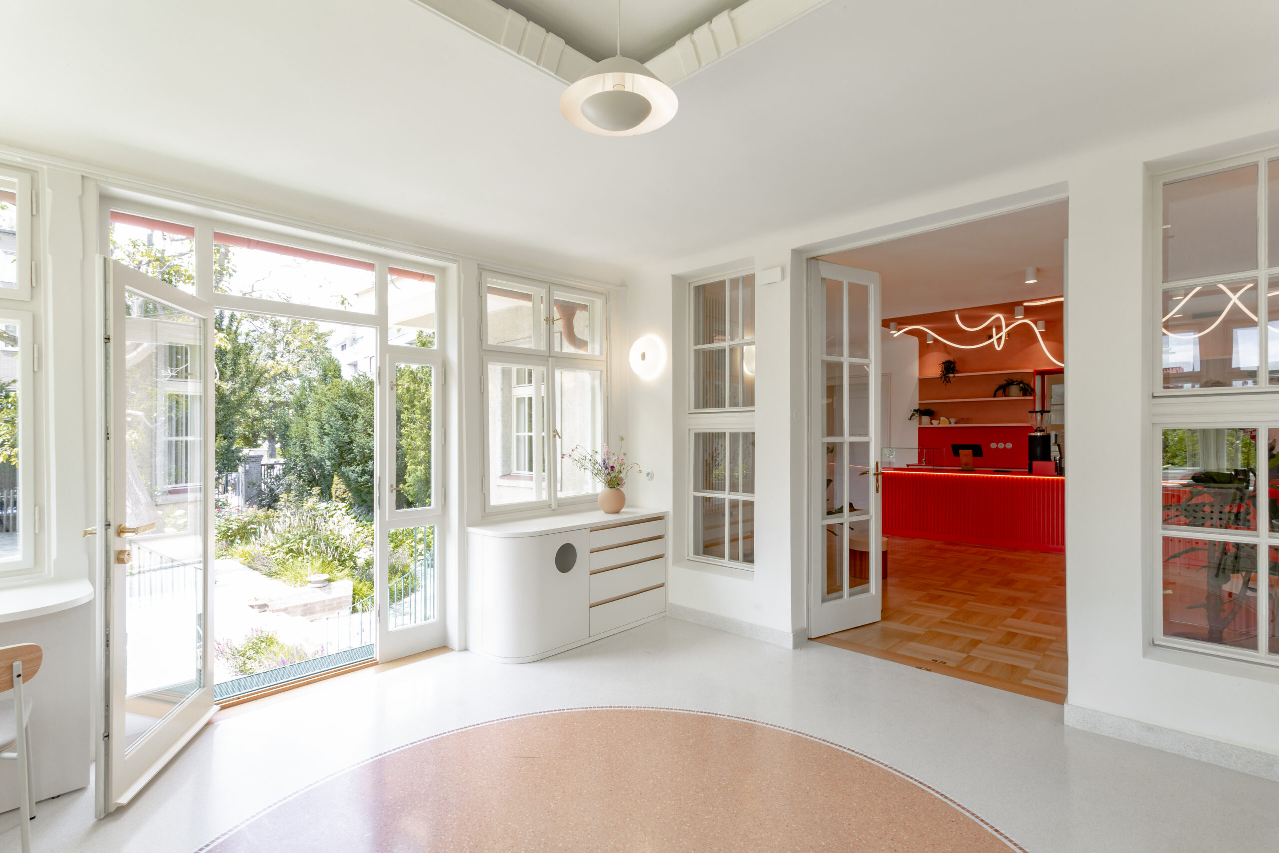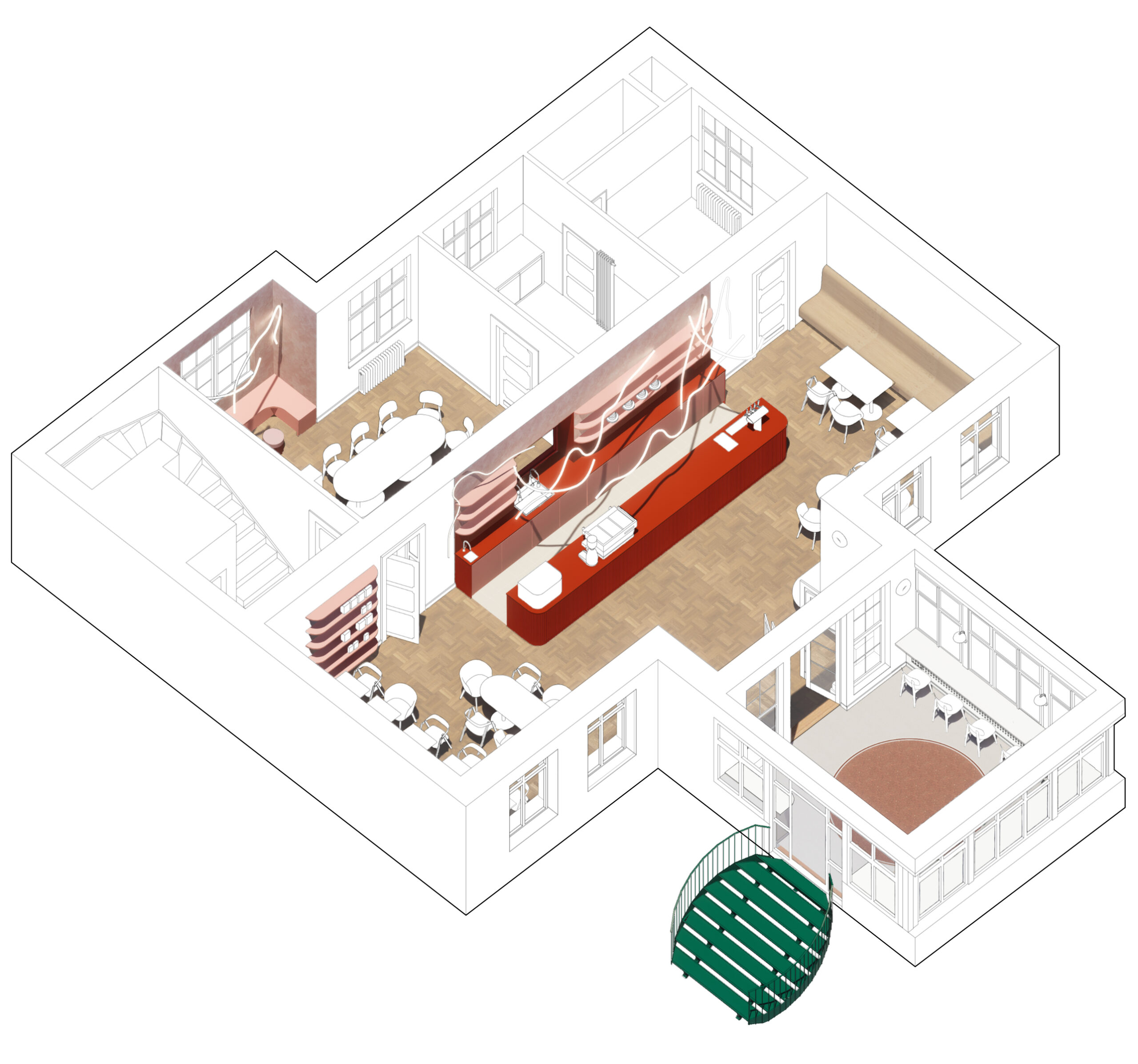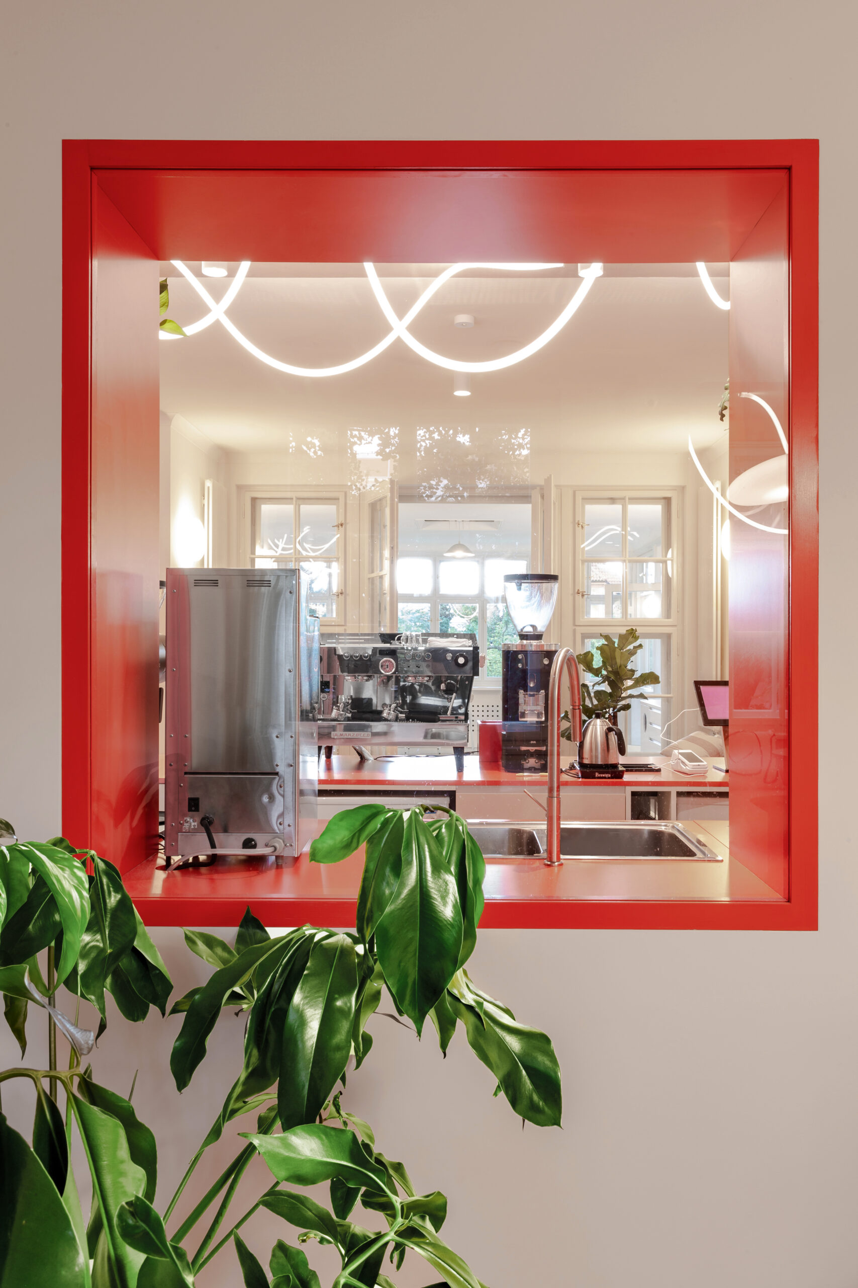 Úprava prostor pro účely kavárny byla výzvou především z hlediska dispozic, největším zásahem bylo propojení všech tří pokojů do jedné velké otevřené místnosti, ve které se nachází hlavní bar. Jeho oranžovo-růžová barevná kombinace vytváří kontrast k převážně béžovým a zlatým historickým prvkům, na oblé tvary těchto prvků zároveň volně navazují zaoblené rohy baru.