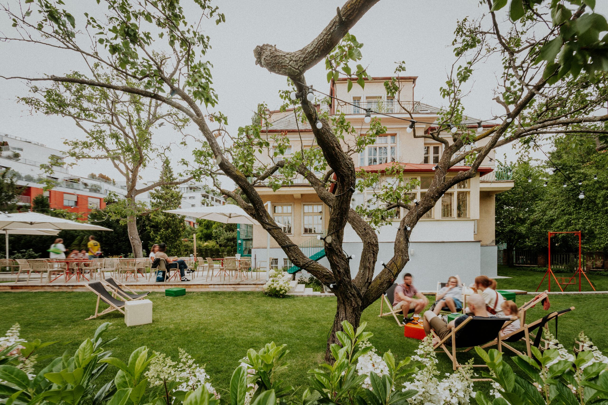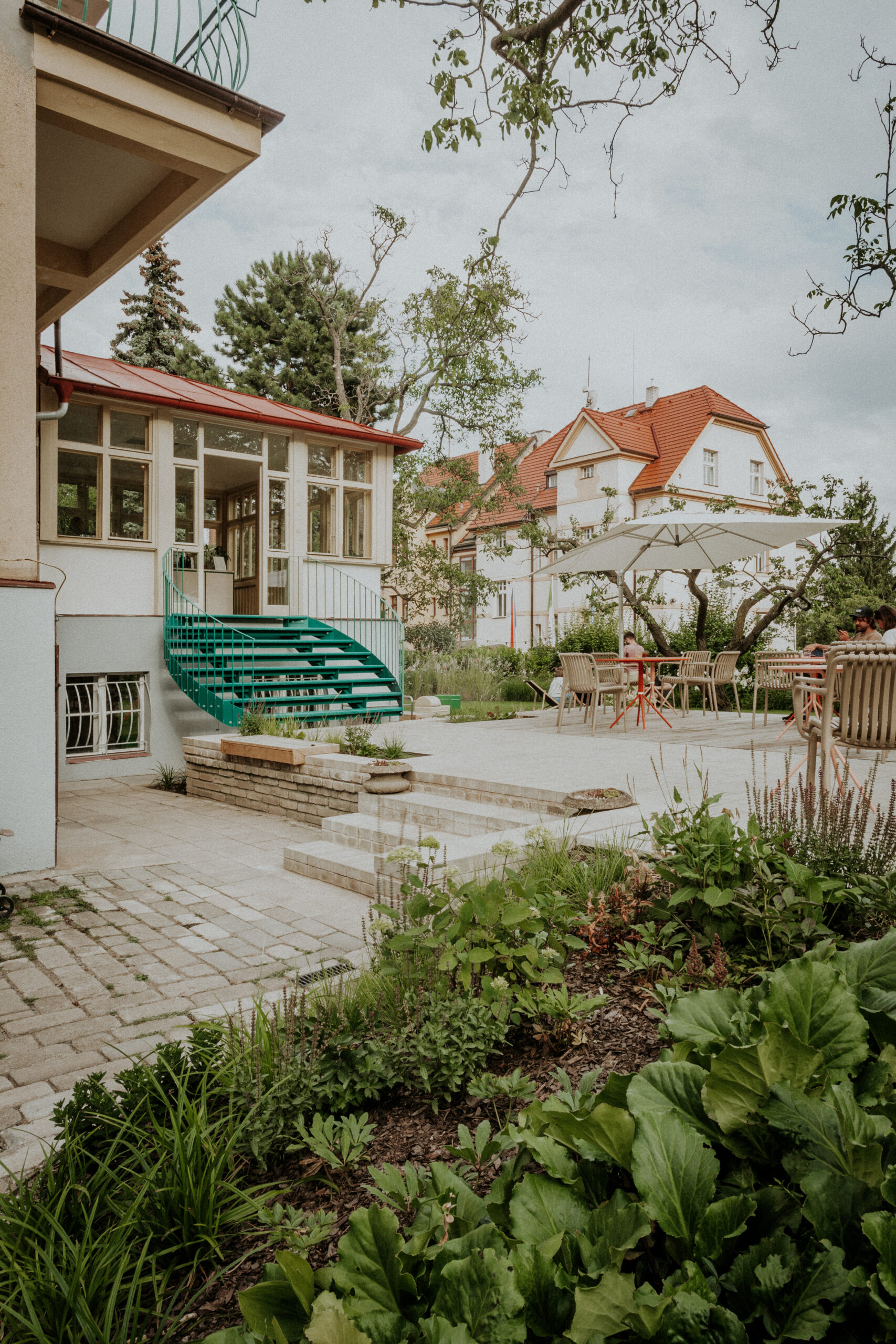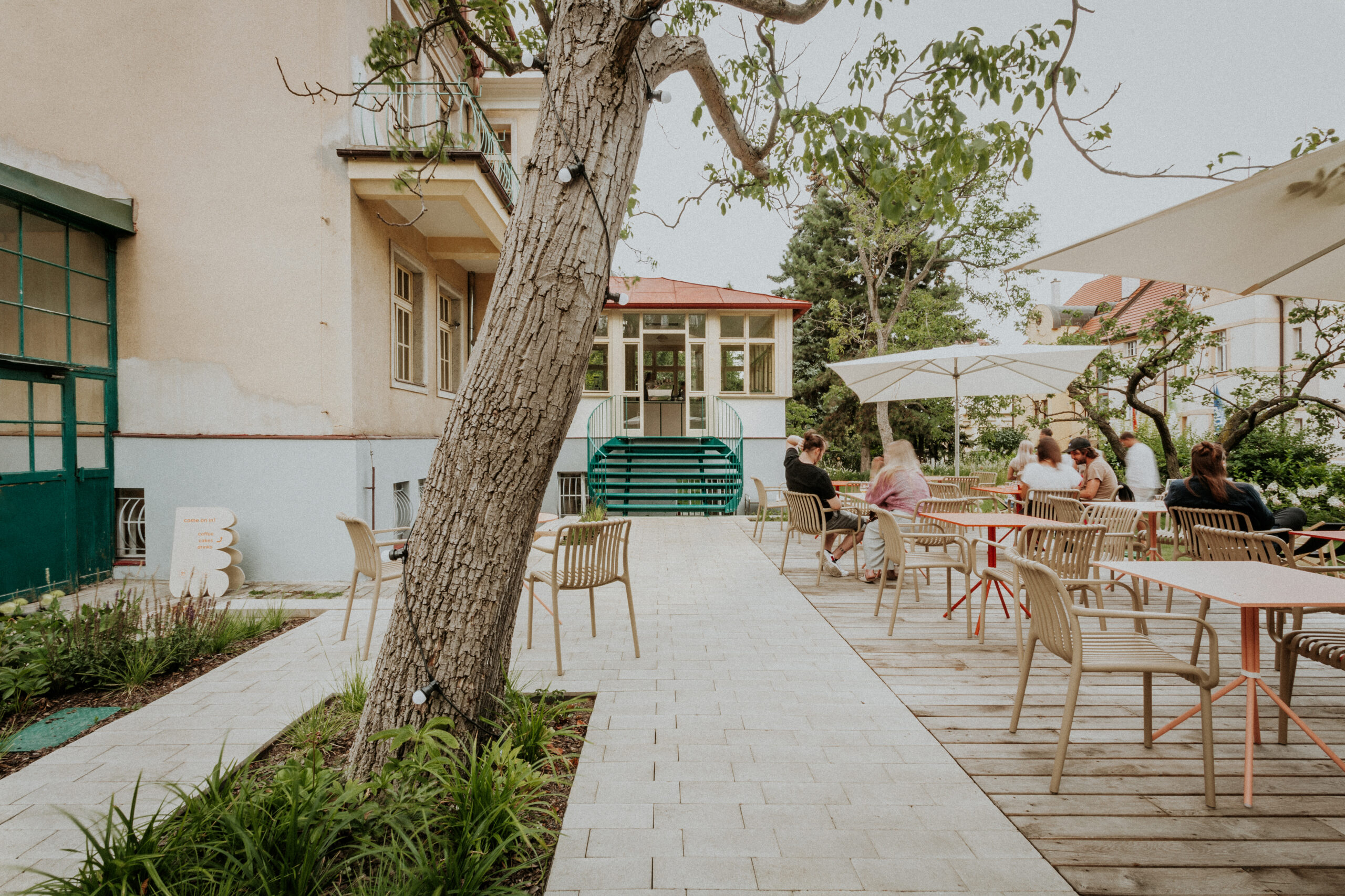 Pohodlný vstup do budovy umožňuje nové atypické schodiště přímo ze zahrady. Návštěvník vstupuje skrze zimní zahradu, které dominuje nová podlaha z tradičního terazza s výrazným kruhem. V hlavním prostoru se netypicky pro gastro provoz nachází podlaha dřevěná, která je sice náchylnější, prostor ale i díky ní působí dojmem prvorepublikového obývacího pokoje. Vybrán byl tradiční ale méně obvyklý vzor parket „five fingers“.