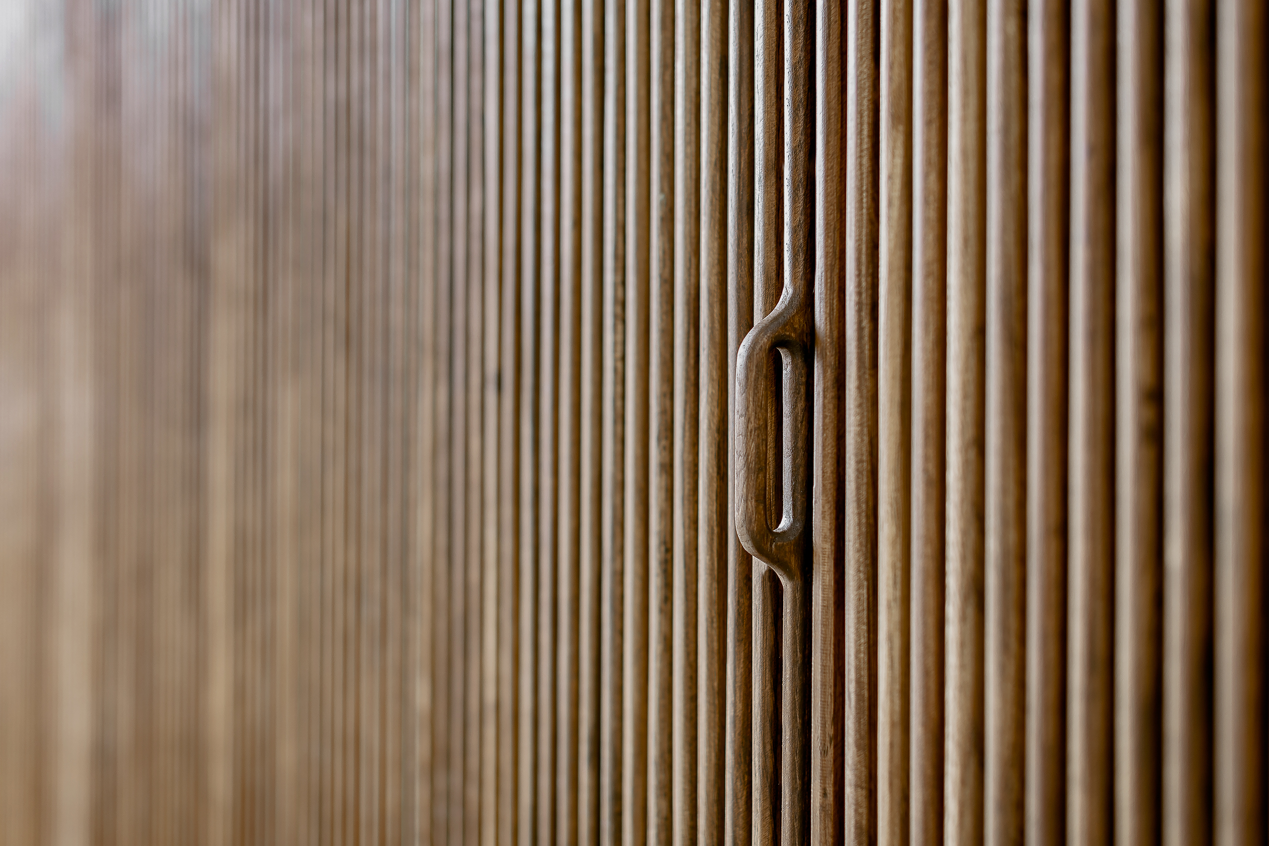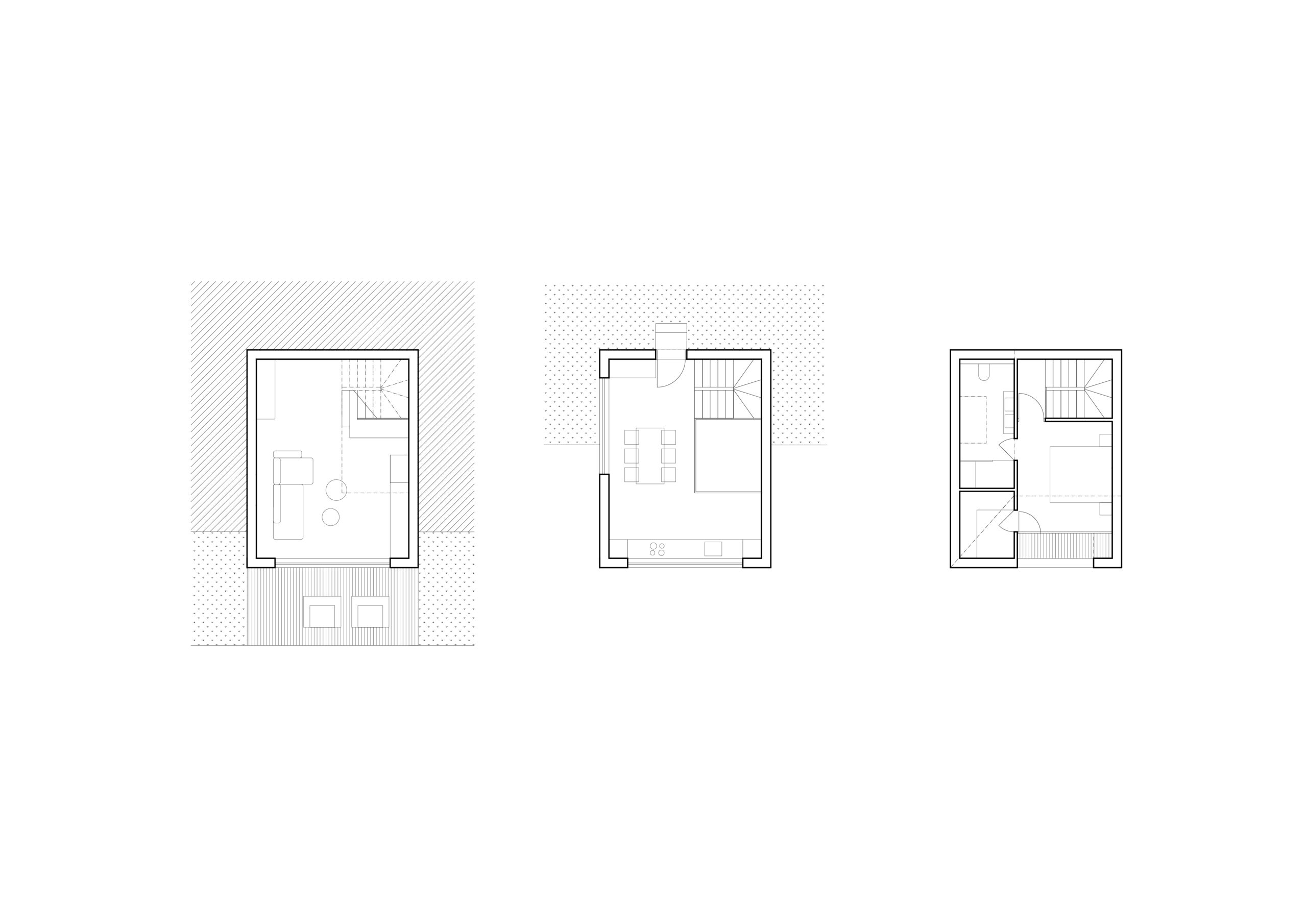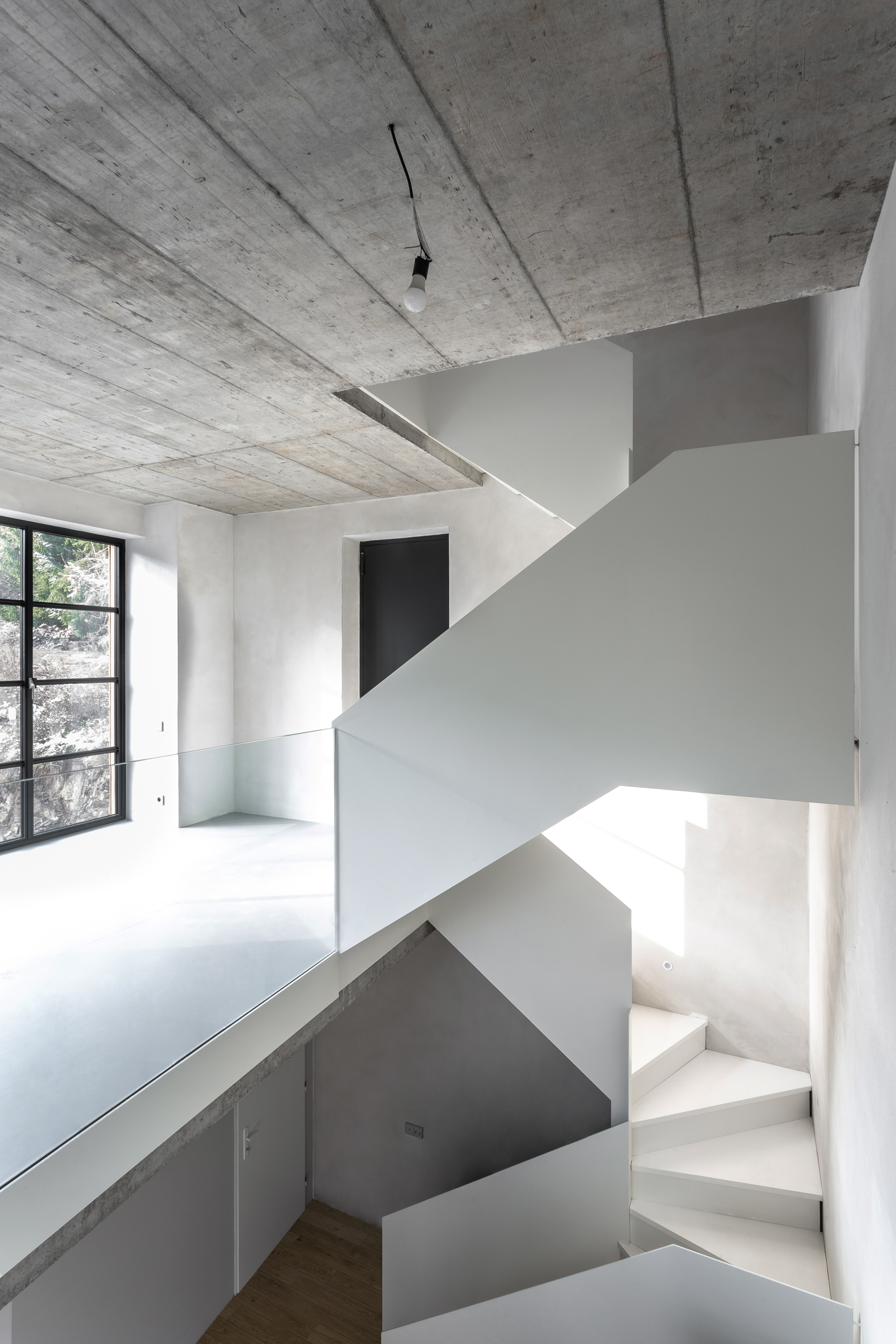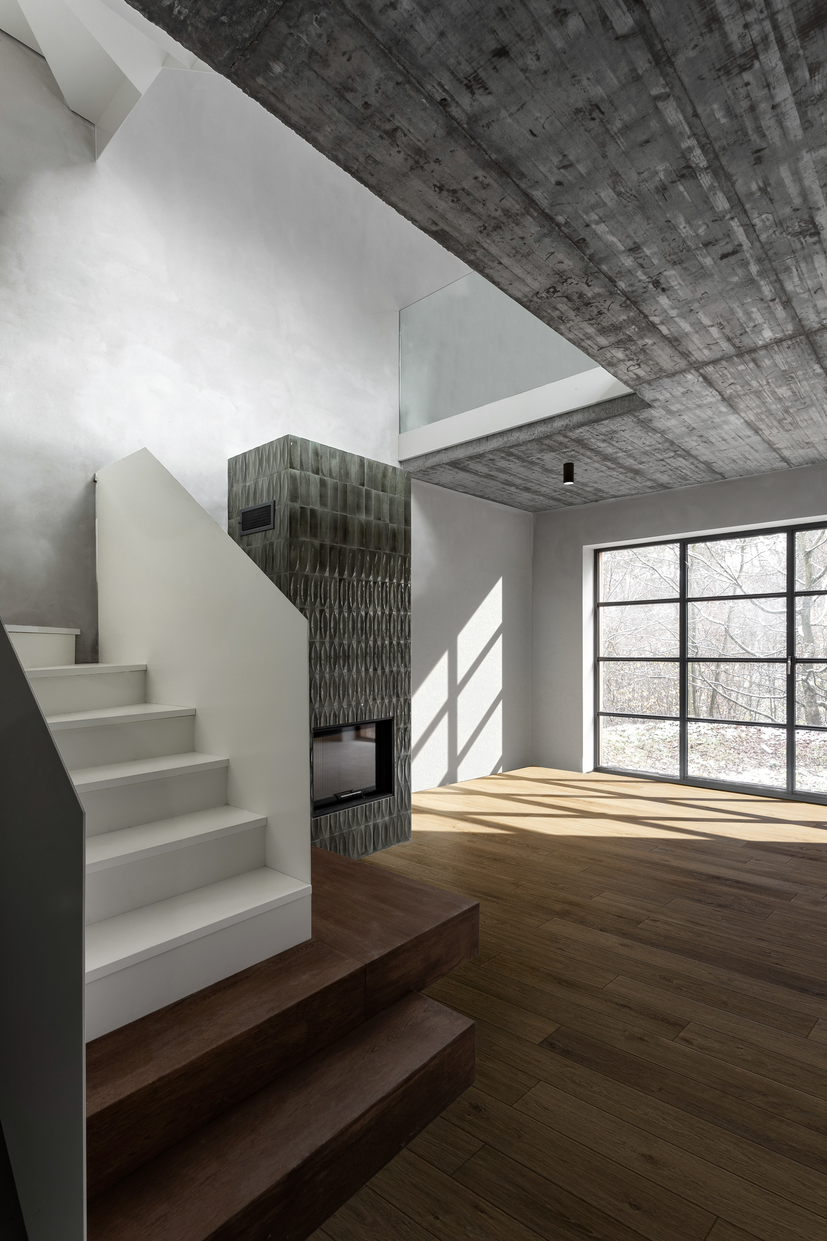 Relativně malý dům pro dva uživatele je uvnitř definován především výrazným skulpturálním schodištěm v celé výšce objektu propojující všechny tři obytná patra. V nejvyšším podlaží se nachází samostatná hlavní ložnice se zázemím a s nádhernými výhledy do údolí k řece Vltavě. Obývací pokoj v nejnižším podlaží je v přímém kontaktu se zahradou a zároveň v interiéru pomocí vertikální galerie vizuálně plynule přechází do kuchyně s jídelnou v prostředním patře. Plášť domu je zabalen do dřevěného obkladu, který v čase stárne a proměňuje se stejně jako okolní příroda. Zahrada je pomocí jednoduchých neinvazivních principů členěná do několika funkčních částí dle různých venkovních aktivit.