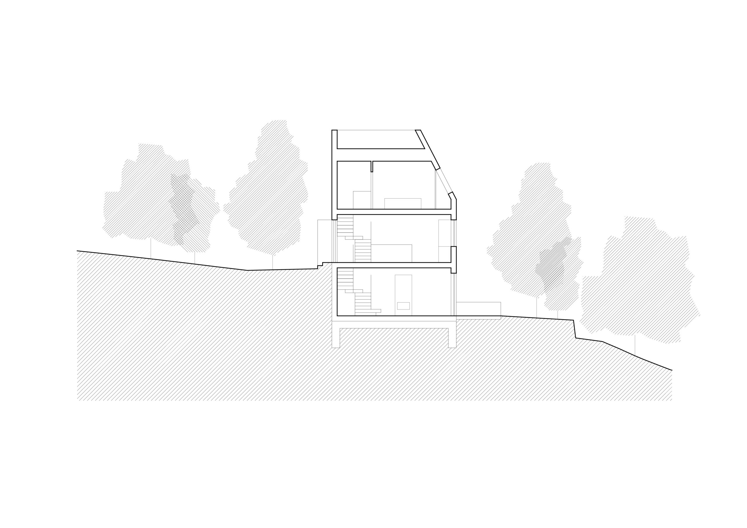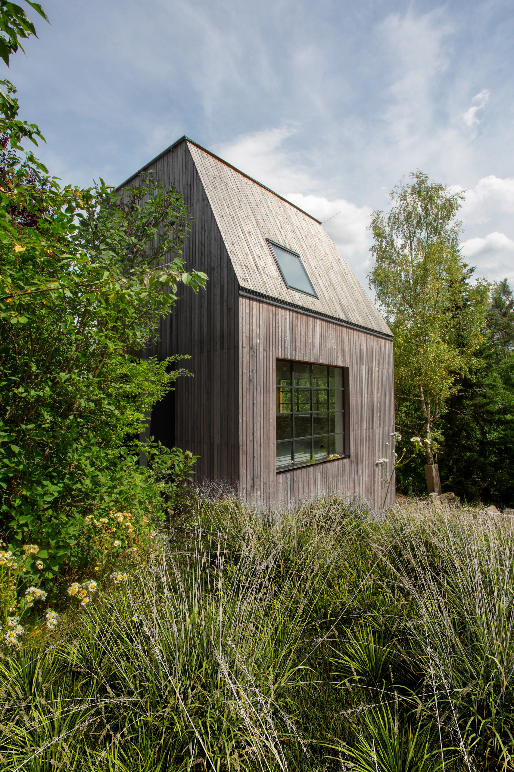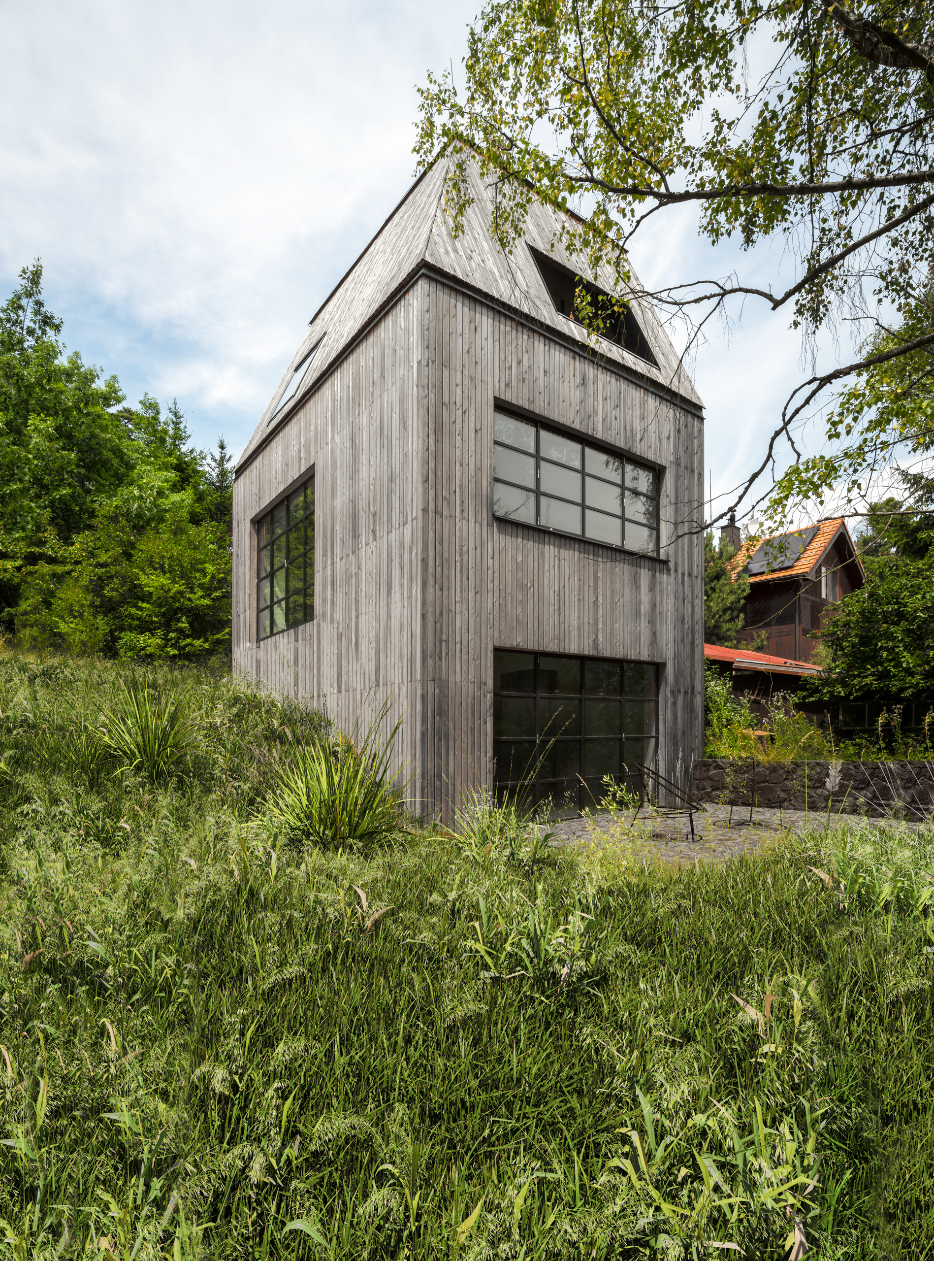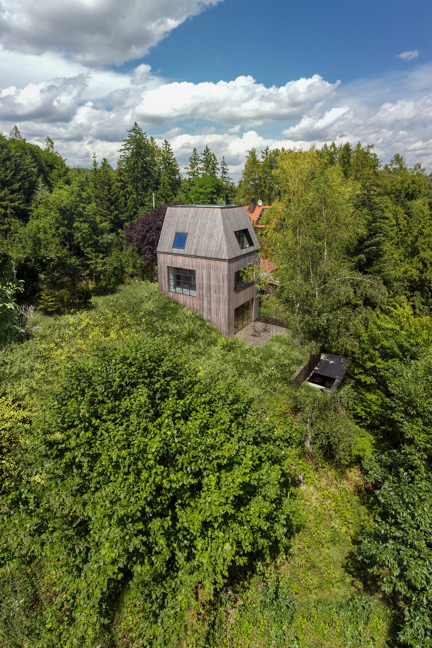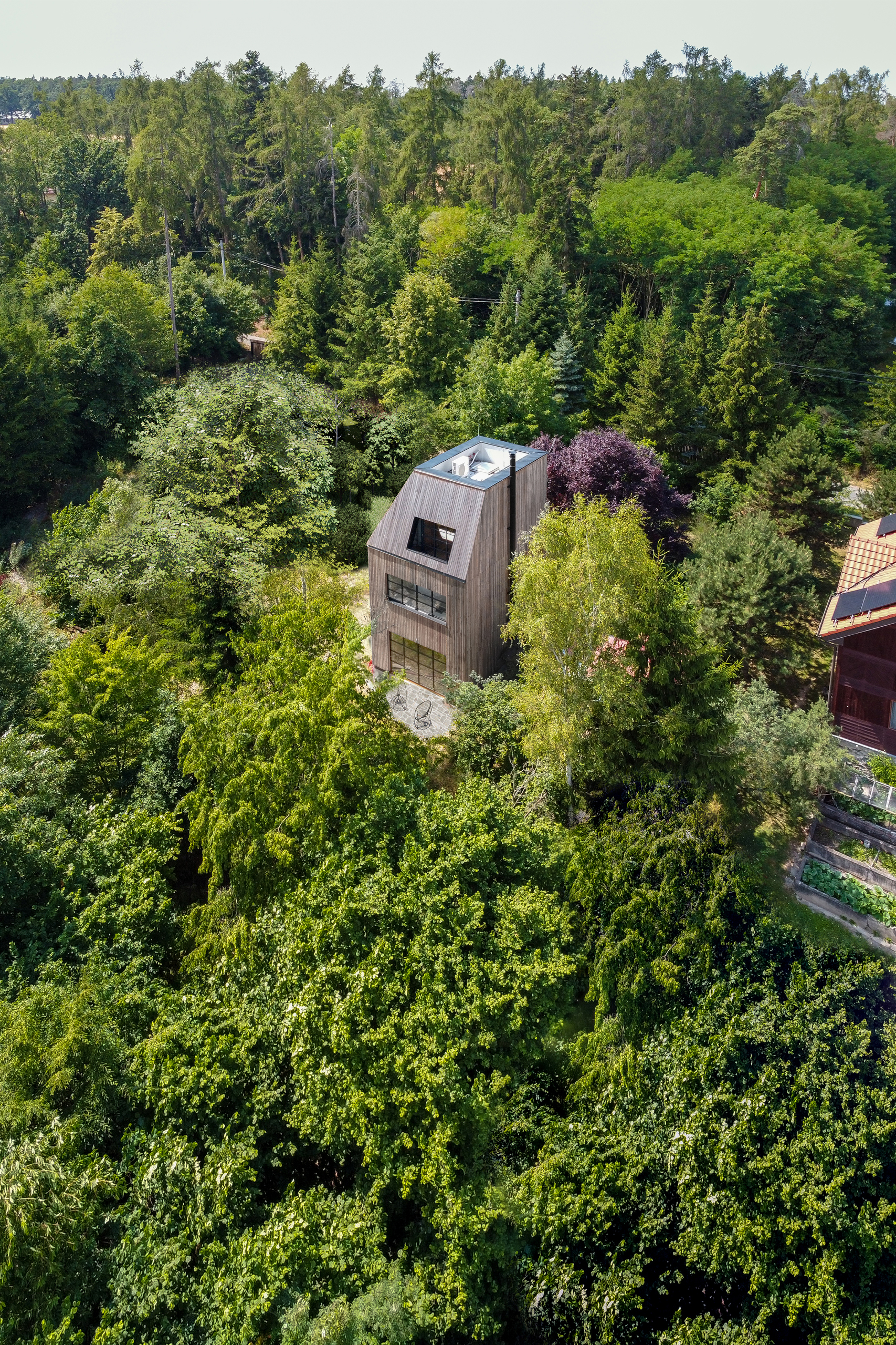 Rodinný dům na okraji lesa je současnou citací chatařské estetiky vyskytující se v území okolo Štěchovic. Drobná pitoreskní stavba vertikální formy je umístěná v prudkém svahu, ležérně zaražená do terénu.