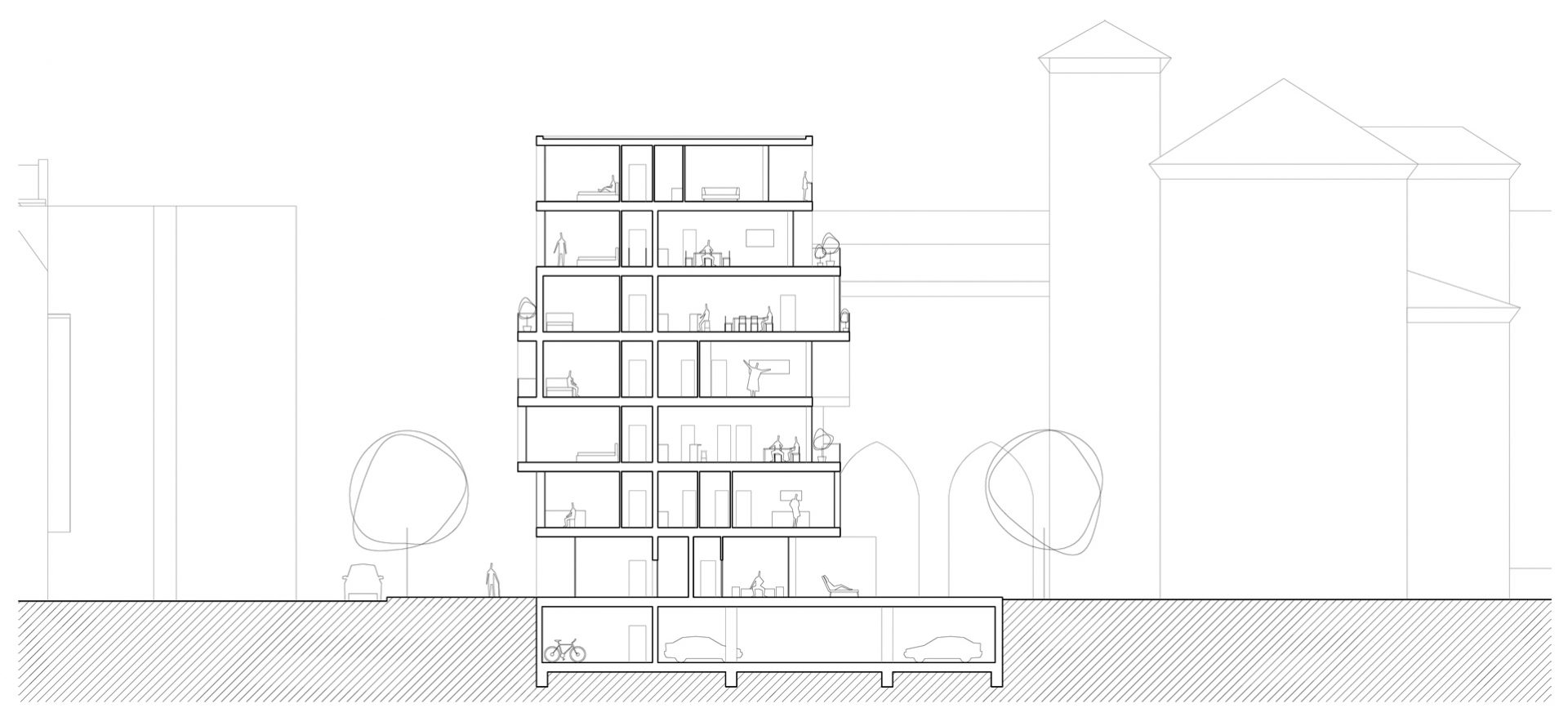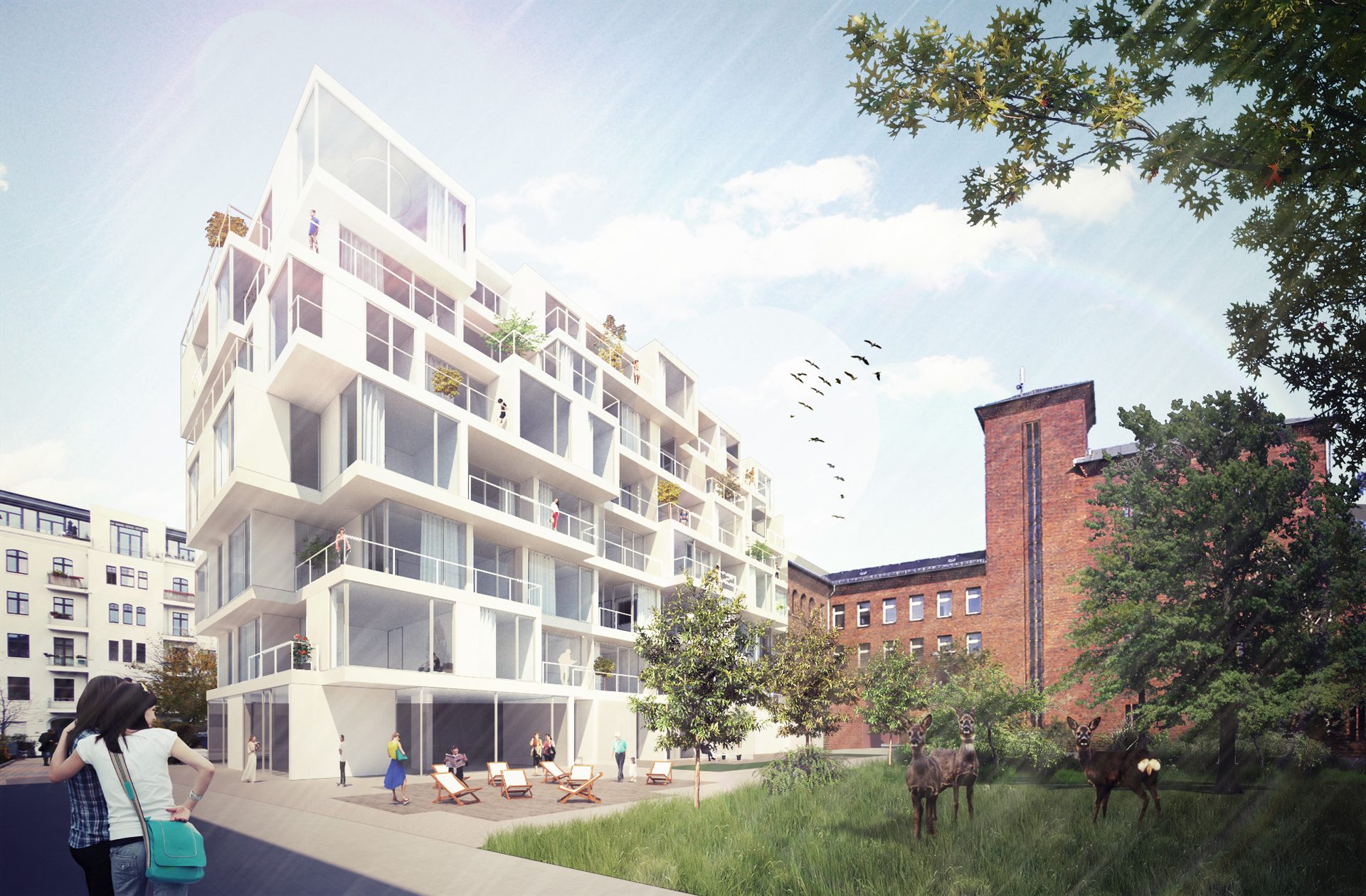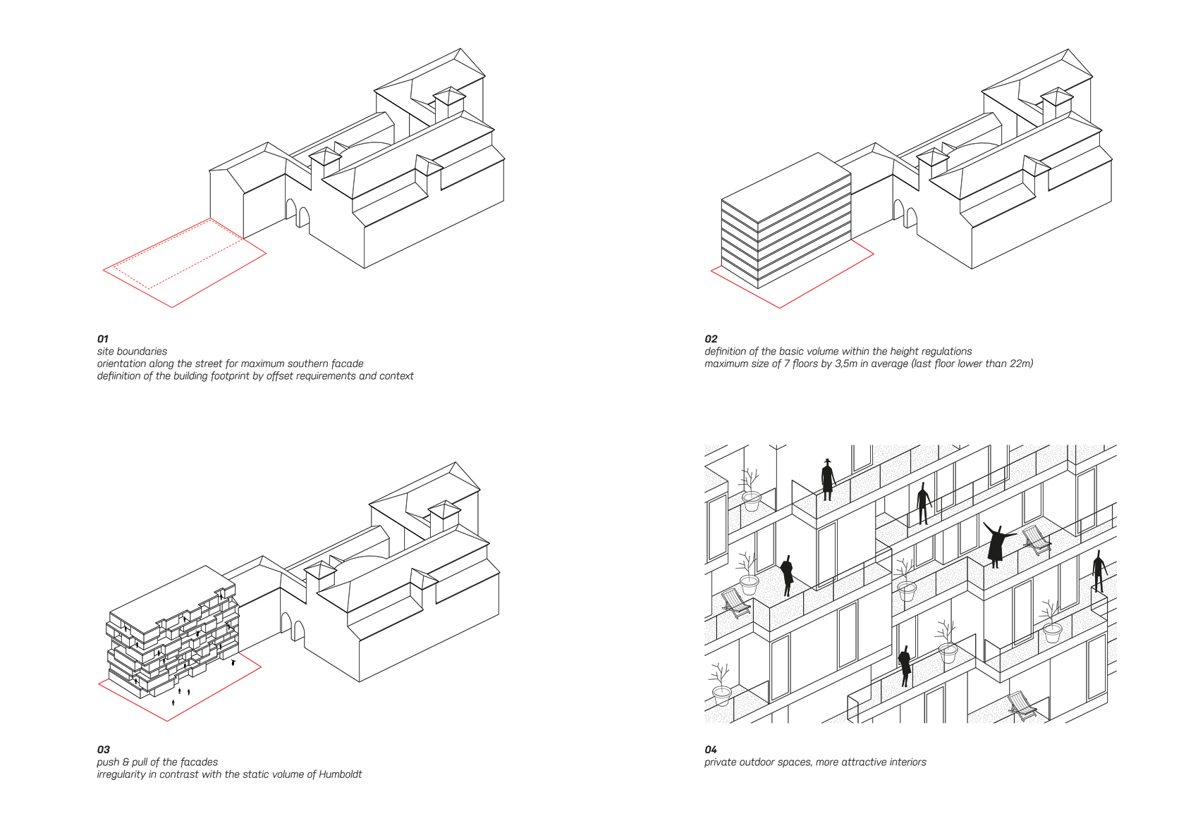 Nový bytový dům by měl nahradit panelovou stavbu z osmdesátek s velmi specifickou polohou — svou východní fasádou přímo navazuje na chráněný komplex Humboldt – monumentální cihlovou stavbu bývalé trafostanice od architekta Hanse Mullera z roku 1926. Náš návrh se snaží vnést do tohoto propojení vyvážený kontrast a se stávající lokální dominantou nesoutěžit. Nová budova s abstraktní fasádou neustále proměnlivou díky stínům a odrazům se může stát mladou nevěstou pro starý a statický Humboldt.