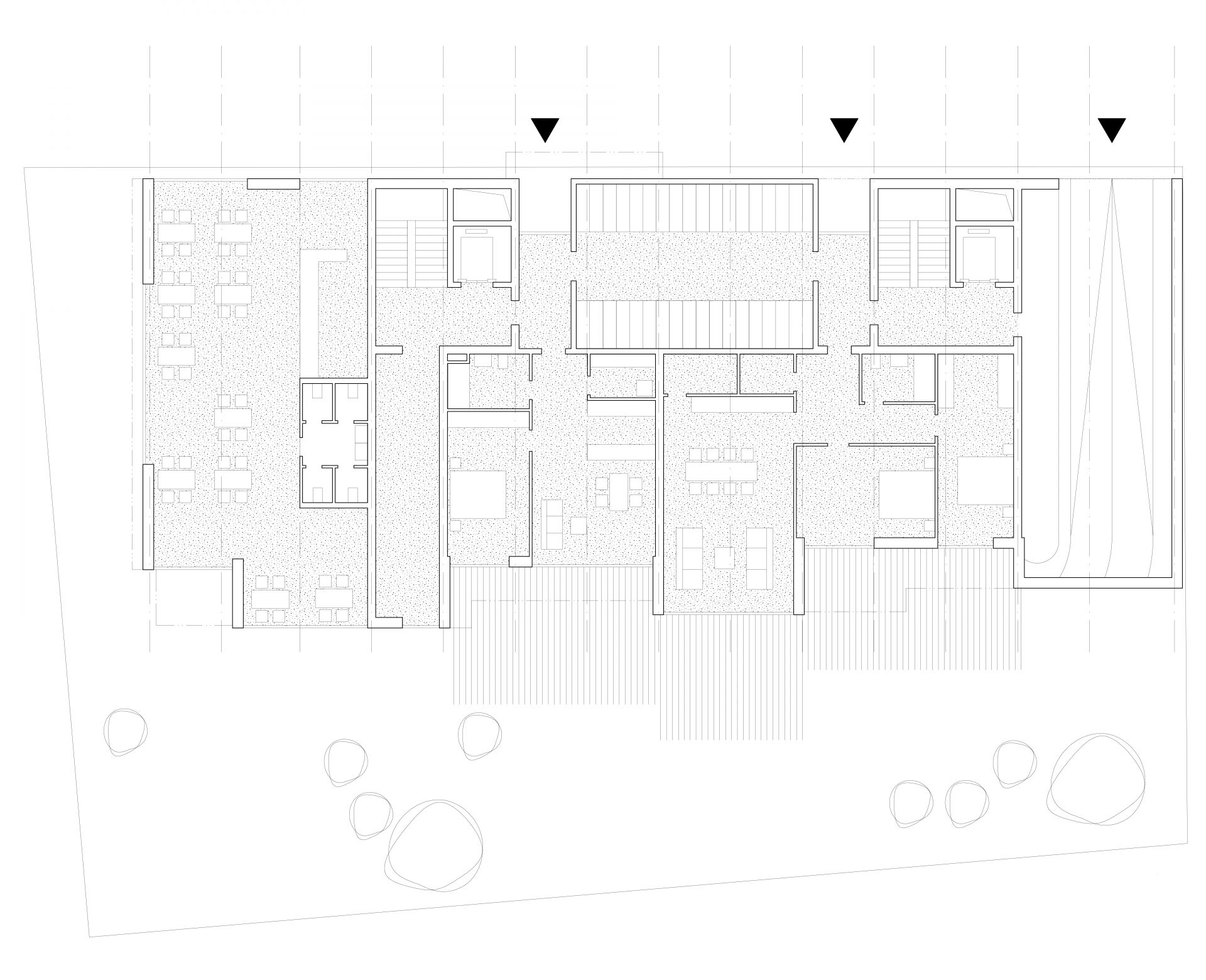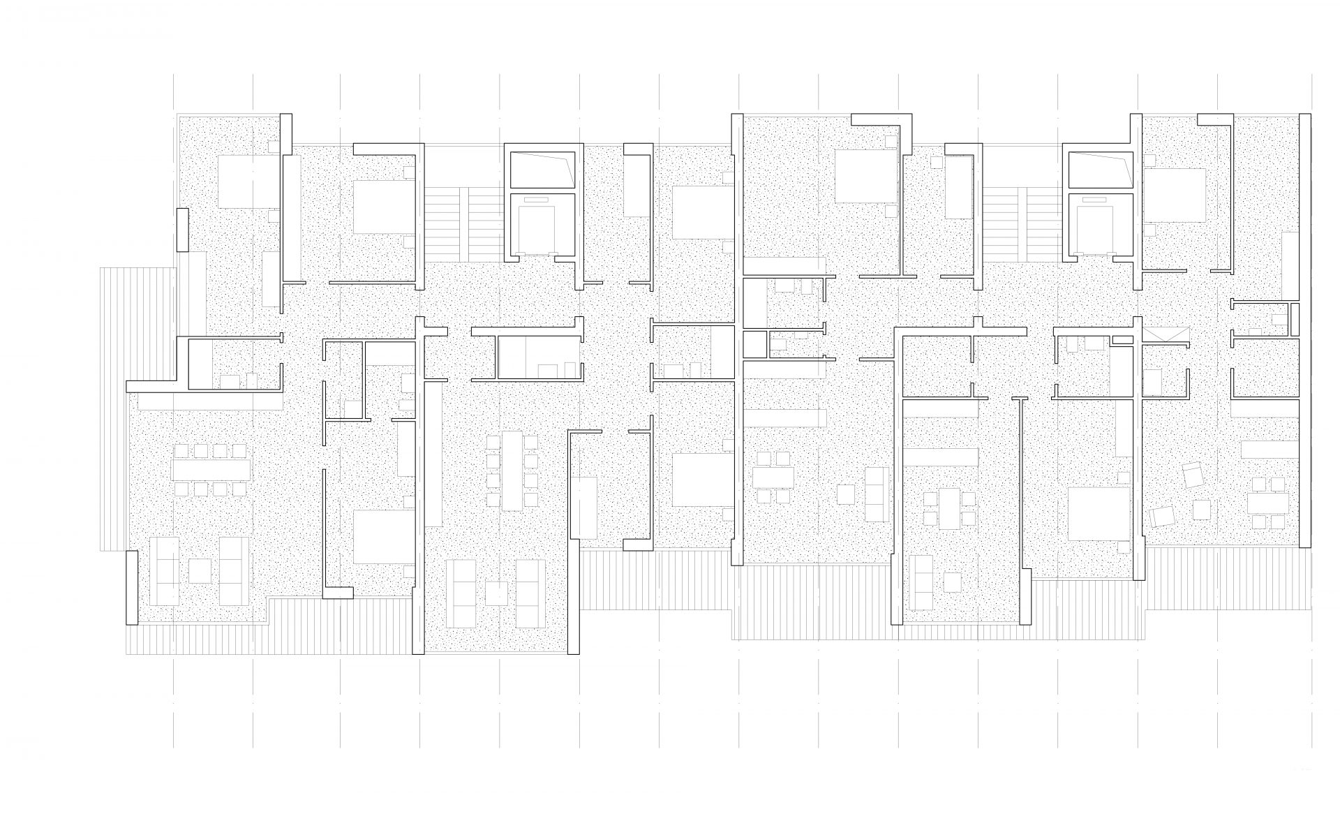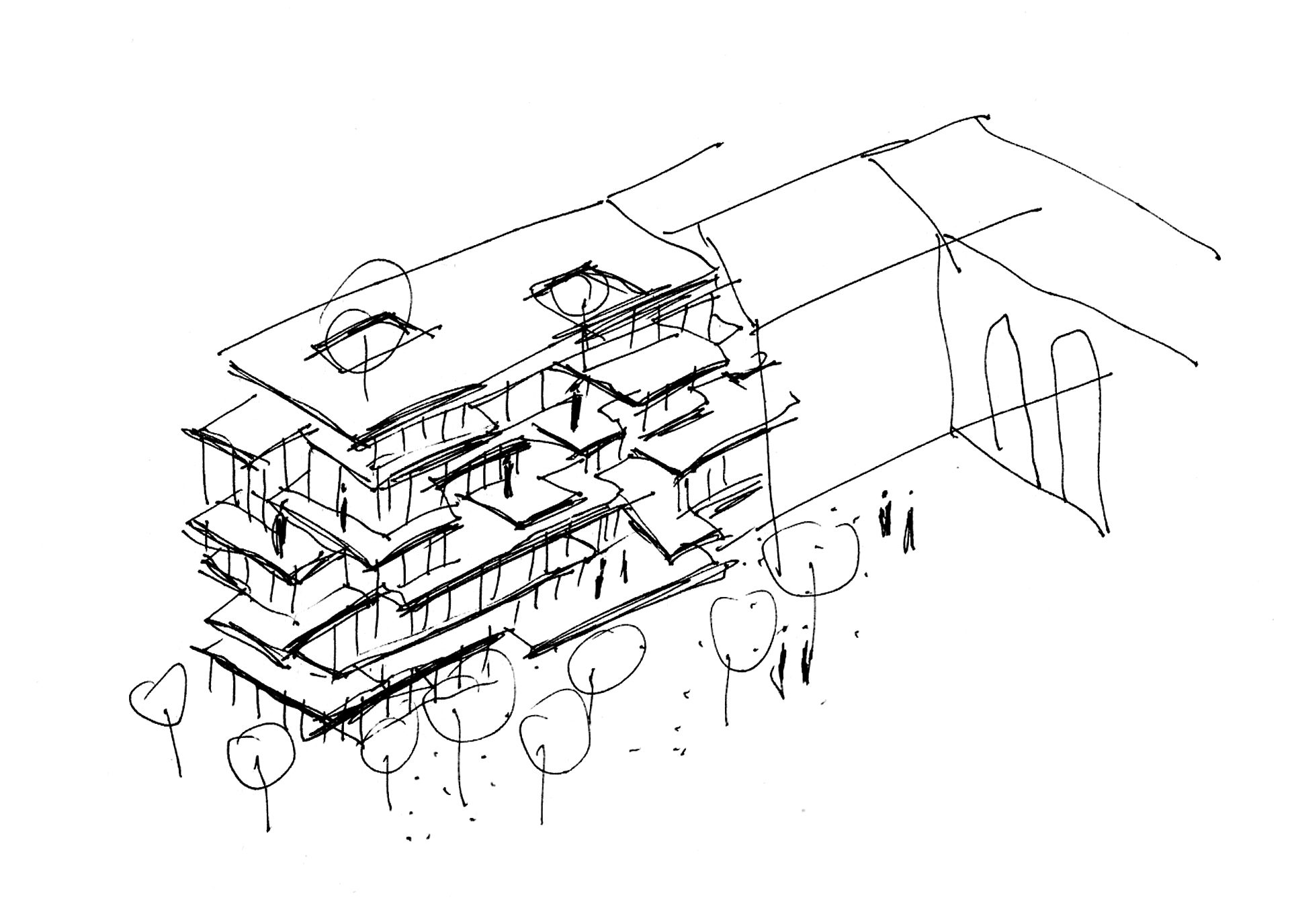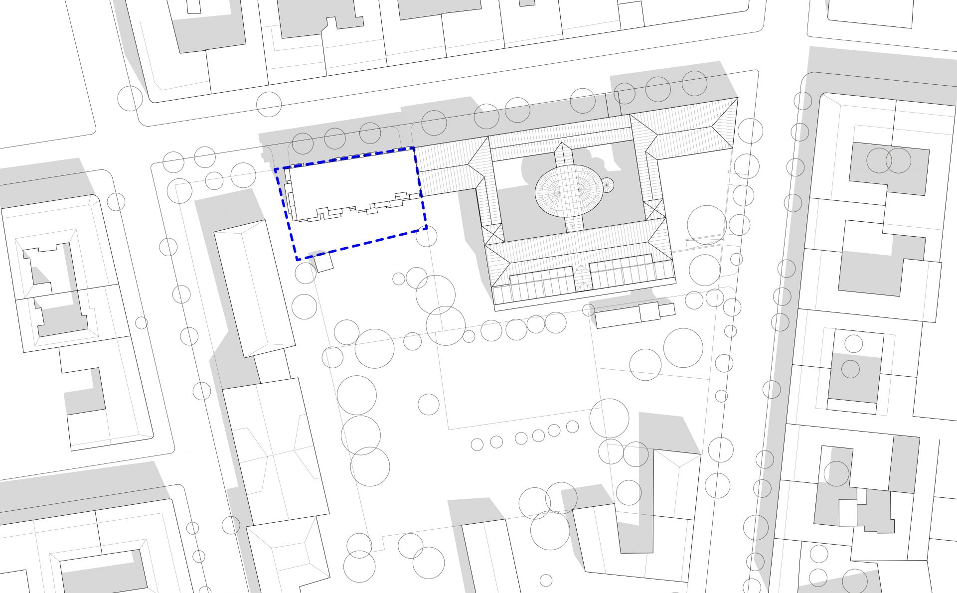Nový bytový dům by měl nahradit panelovou stavbu z osmdesátek s velmi specifickou polohou — svou východní fasádou přímo navazuje na chráněný komplex Humboldt – monumentální cihlovou stavbu bývalé trafostanice od architekta Hanse Mullera z roku 1926. Náš návrh se snaží vnést do tohoto propojení vyvážený kontrast a se stávající lokální dominantou nesoutěžit. Nová budova s abstraktní fasádou neustále proměnlivou díky stínům a odrazům se může stát mladou nevěstou pro starý a statický Humboldt.