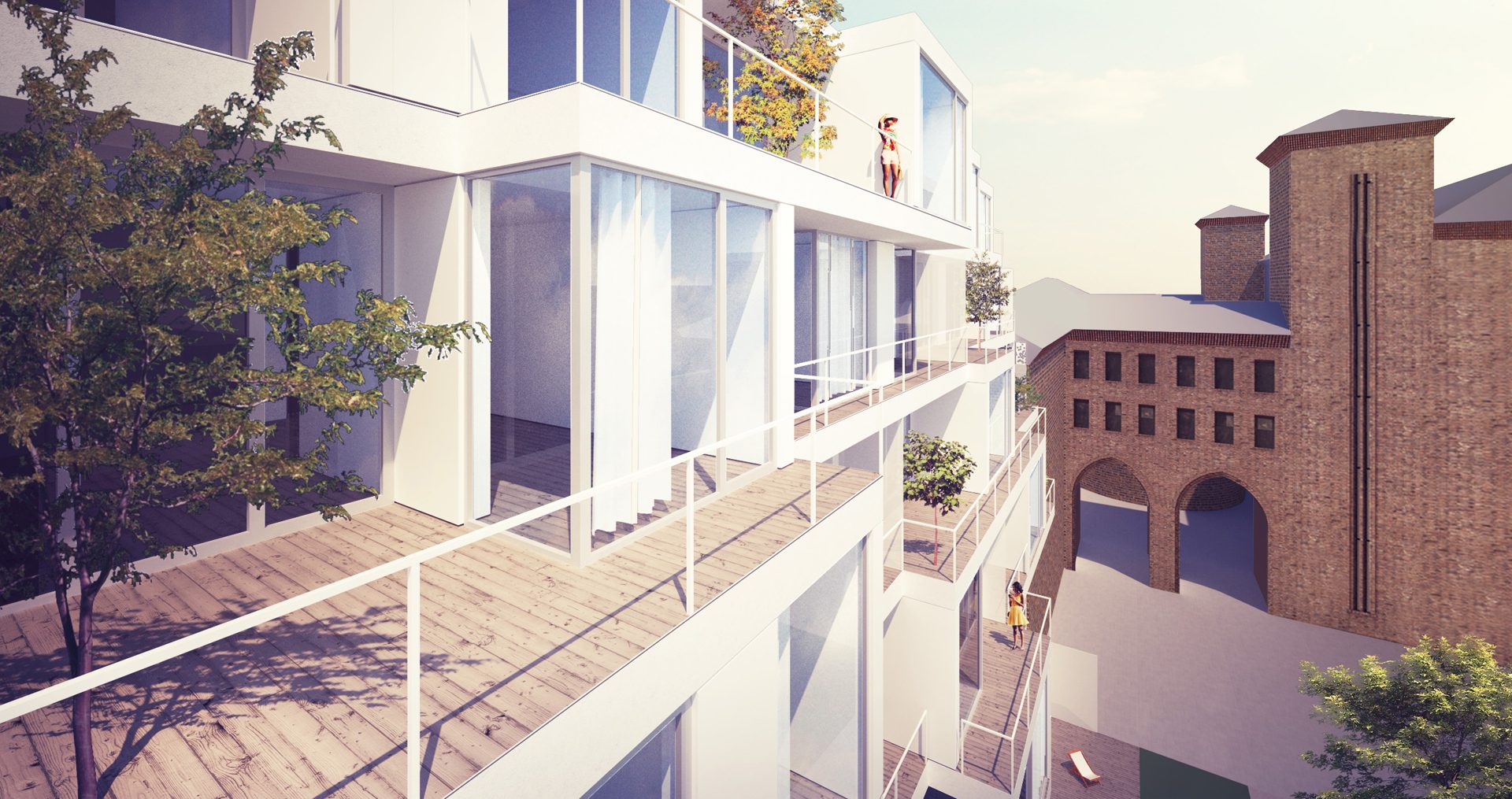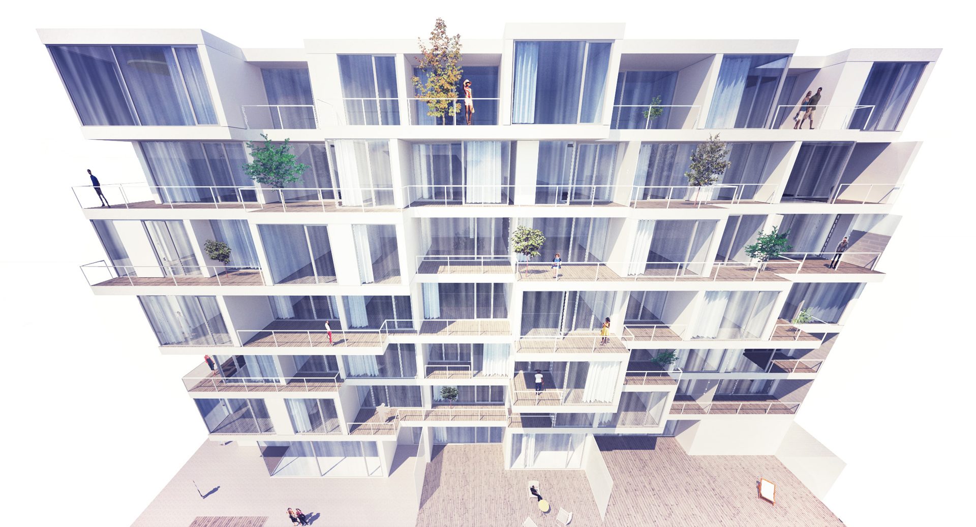 Severní fasáda navrženého domu drží uliční linii, na západě doplňuje chybějící nároží. Nová hmota domu využívá maximálně jižní orientace směrem do dvora a výhledů na centrum města. Prolamování fasády vytváří atraktivnější dispozice bytů v propojení s jejich venkovními plochami, které tak navíc získávají více soukromí. To domu v oblíbené rezidenční čtvrti Prezlauerberg přidává na jedinečnosti.