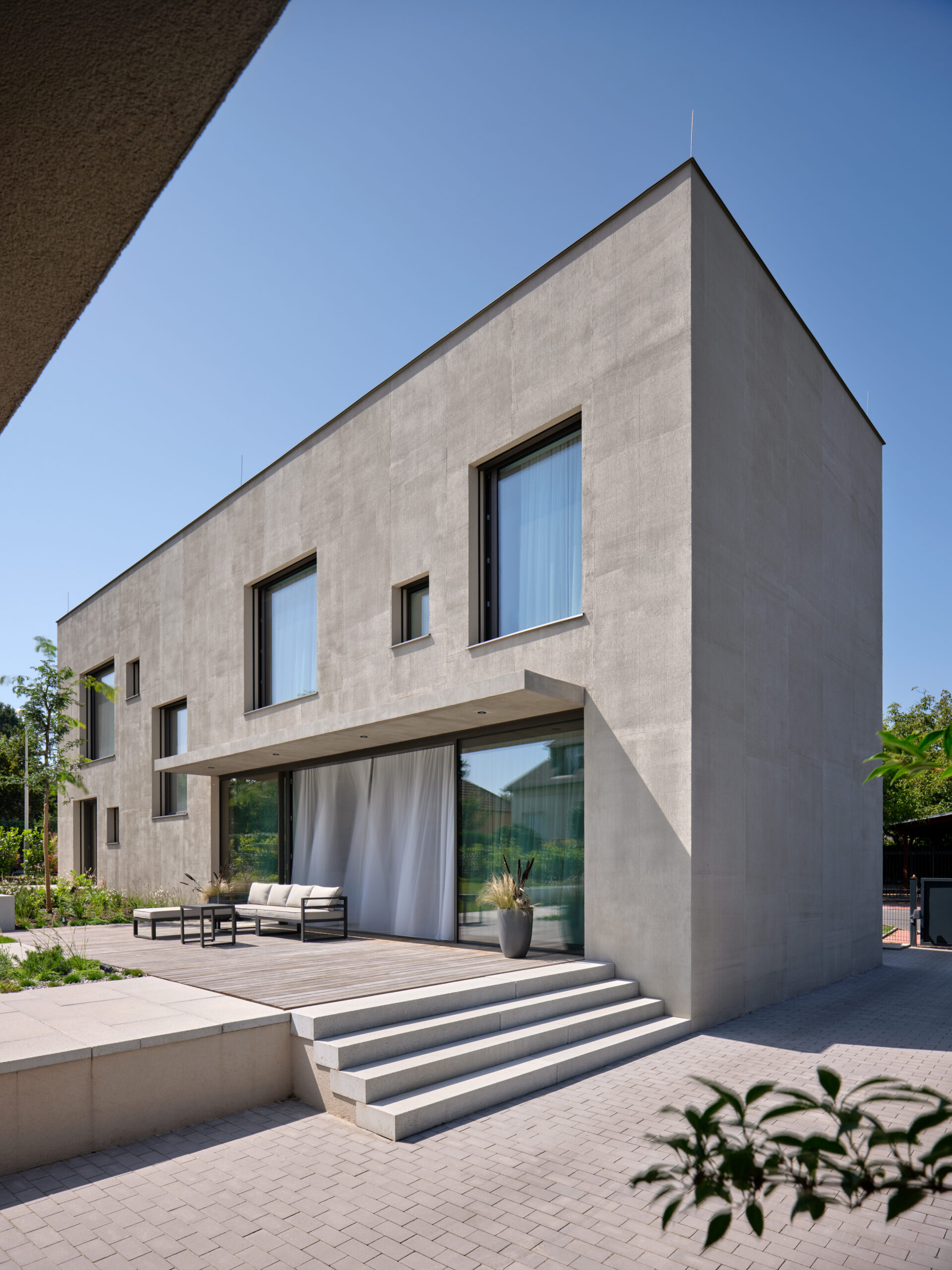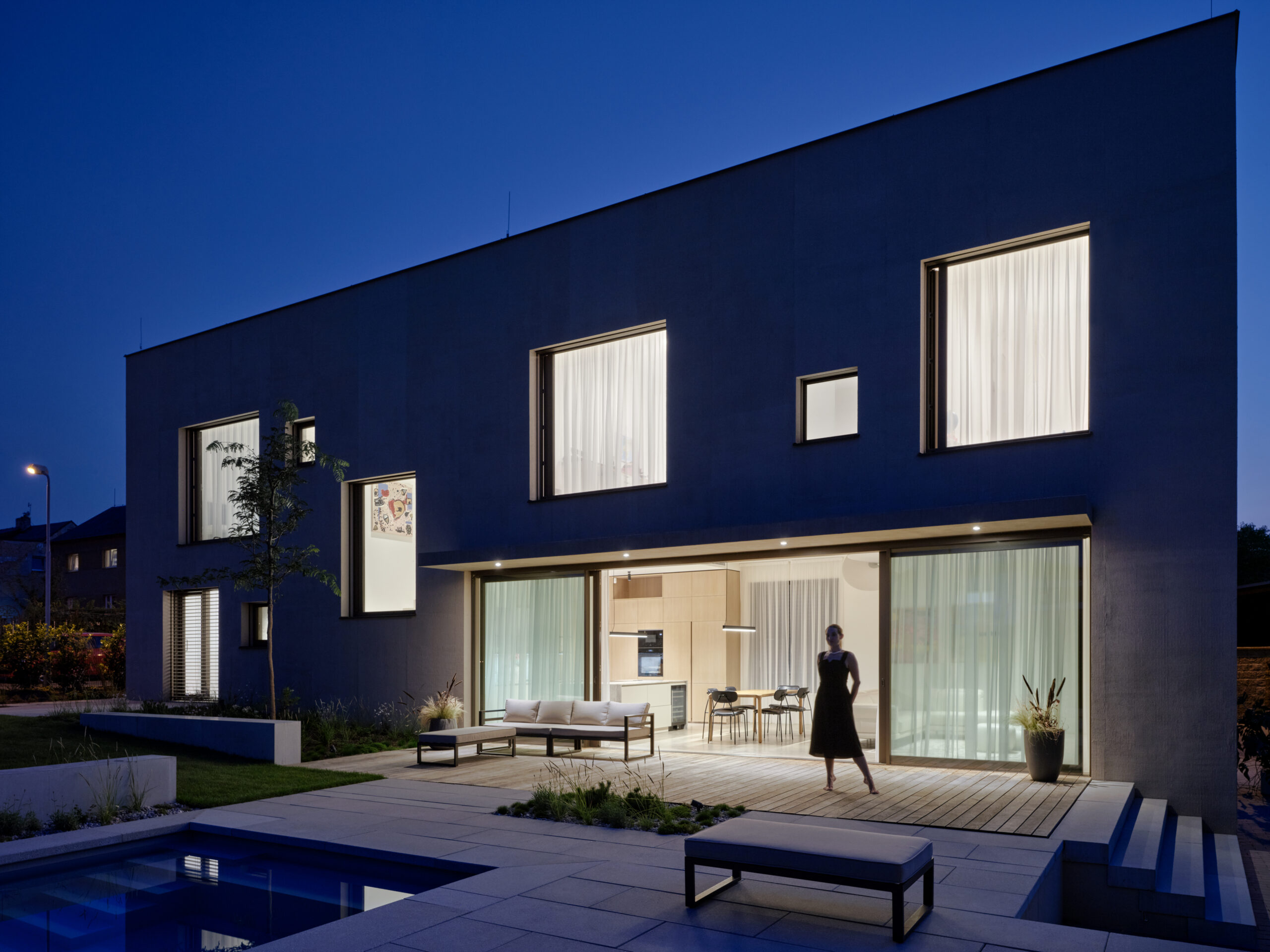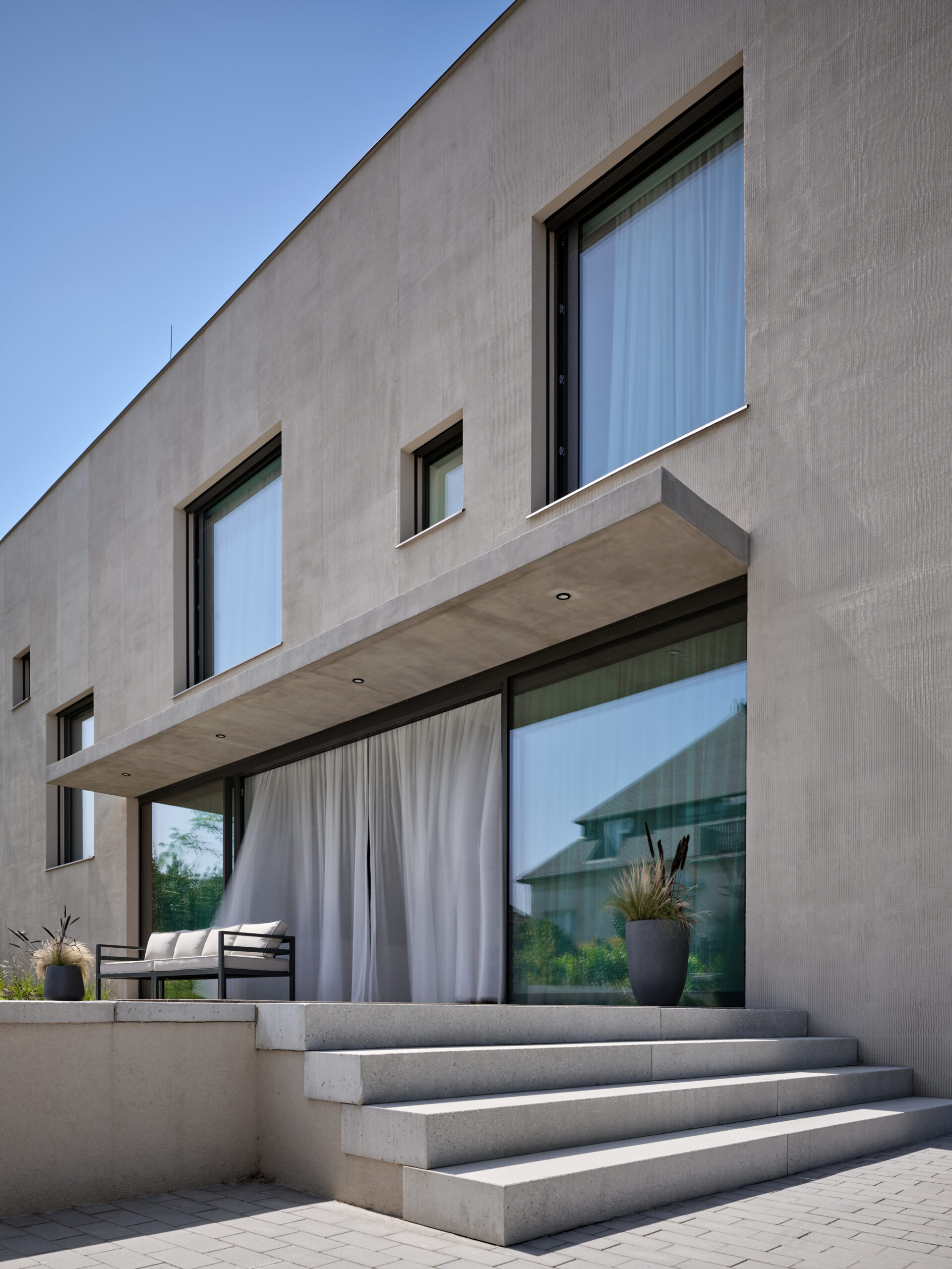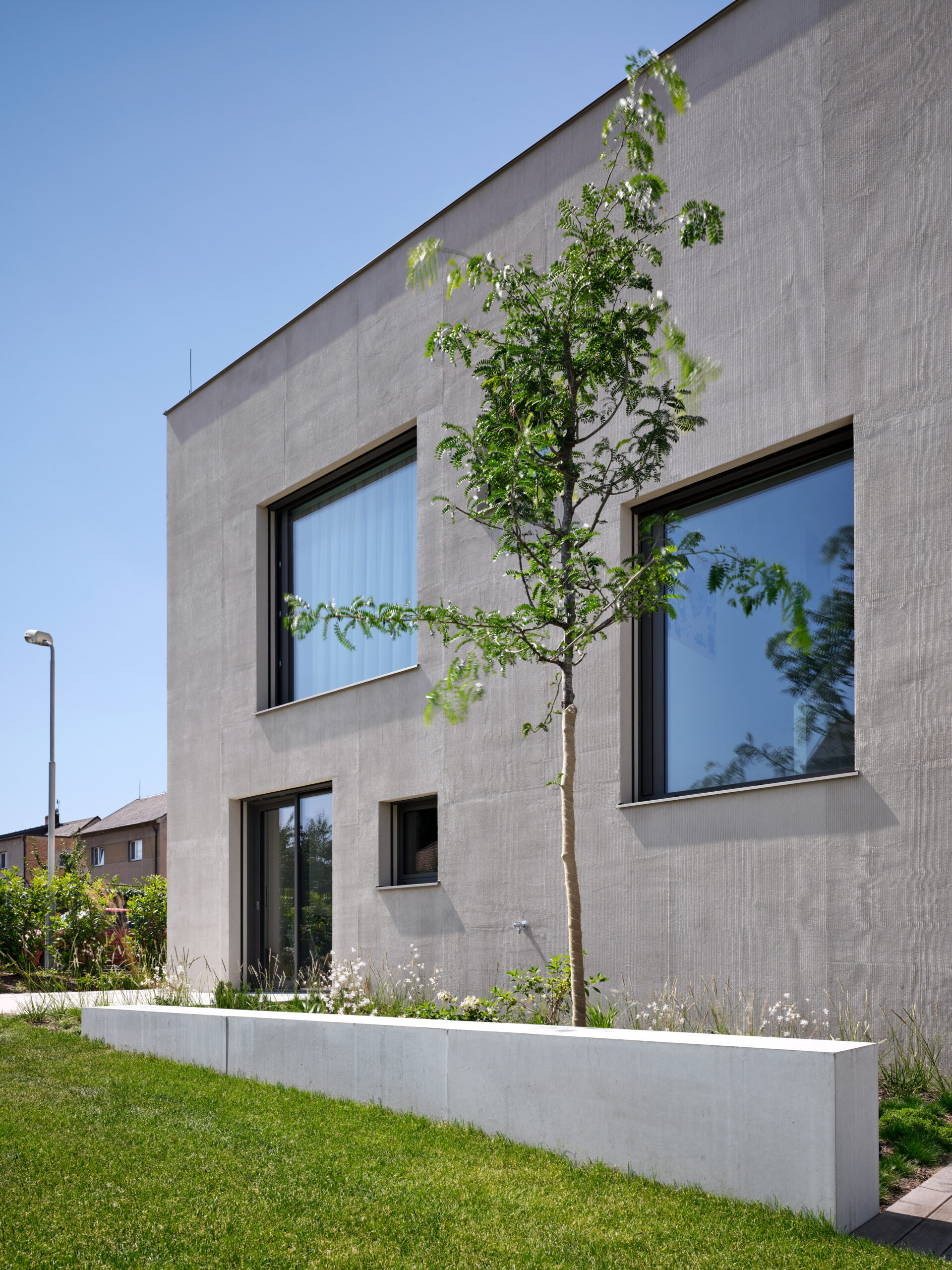 V pražských Čakovicích jsme na nárožní, mírně svažitý pozemek navrhli kompaktní rodinný dům, který ponechává maximum volného prostoru pro zahradu. Stavbu jsme orientovali podél boční ulice tak, aby zpevnila nároží a respektovala stavební čáry v území. Uvolněná východní část pozemku vytváří dostatečný odstup od sousedního objektu a umožnila navržený rodinný dům tímto směrem otevřít, aniž by ztratil potřebné soukromí. Kompozice velkorysých okenních otvorů na hlavní fasádě propojuje všechny obytné místnosti se zahradou, zatímco několik oken na fasádě západní propouští do interiéru odpolední světlo.