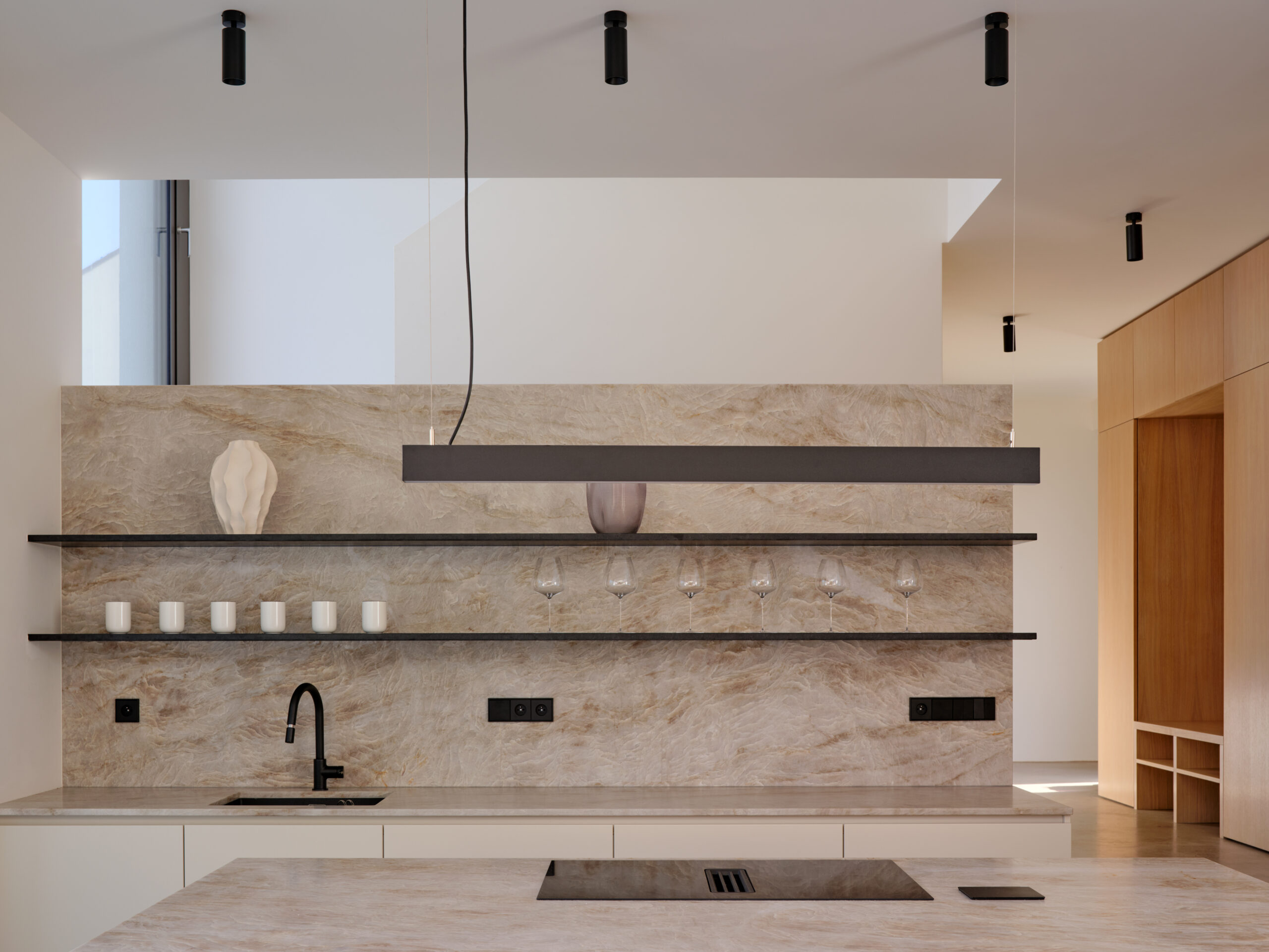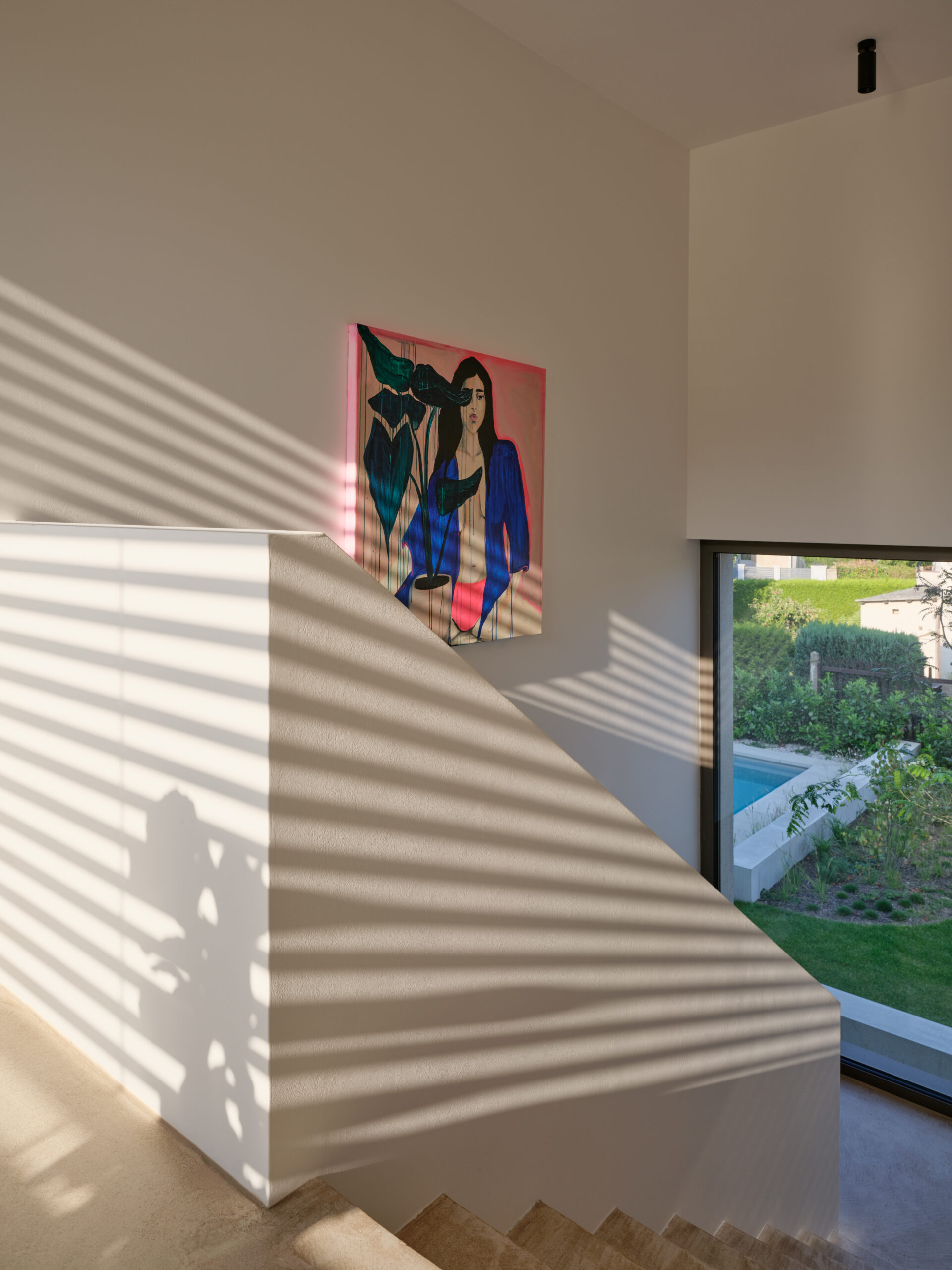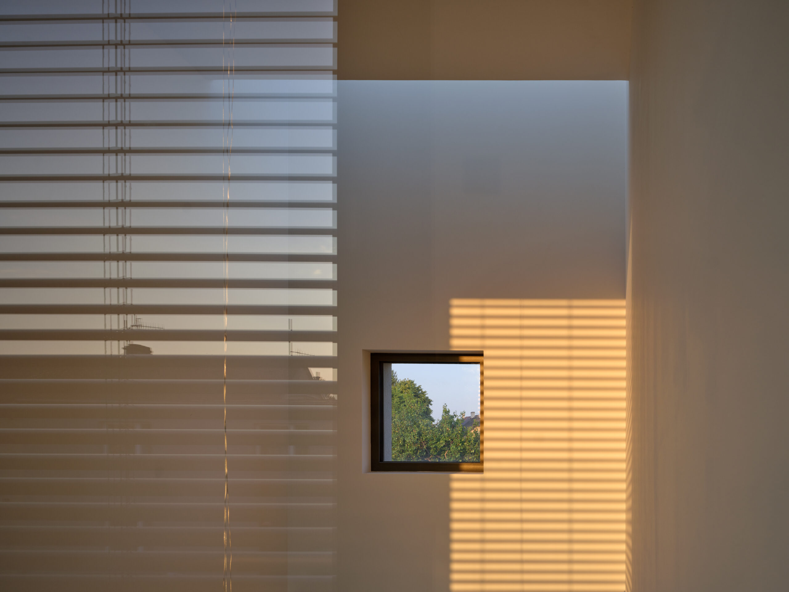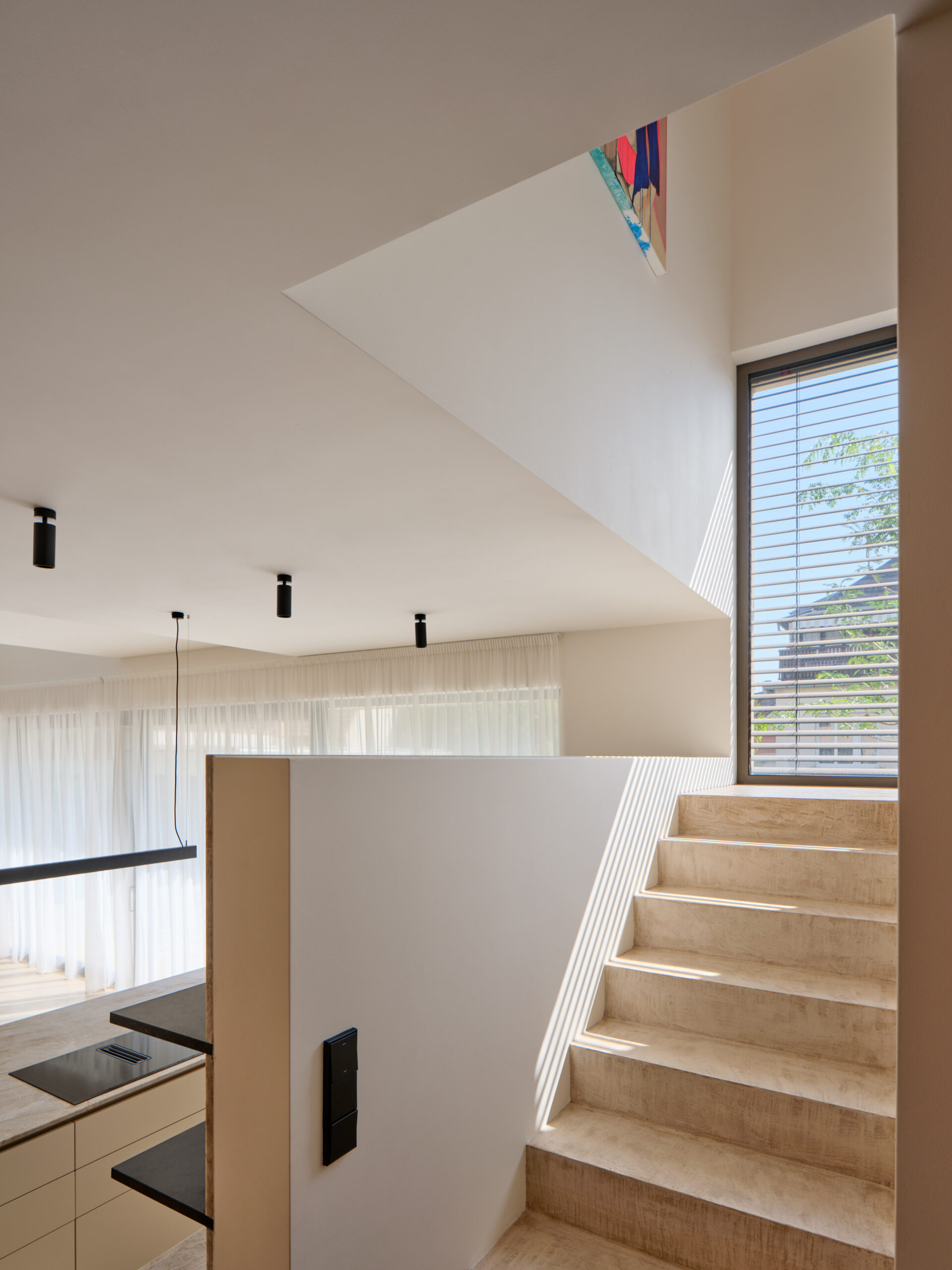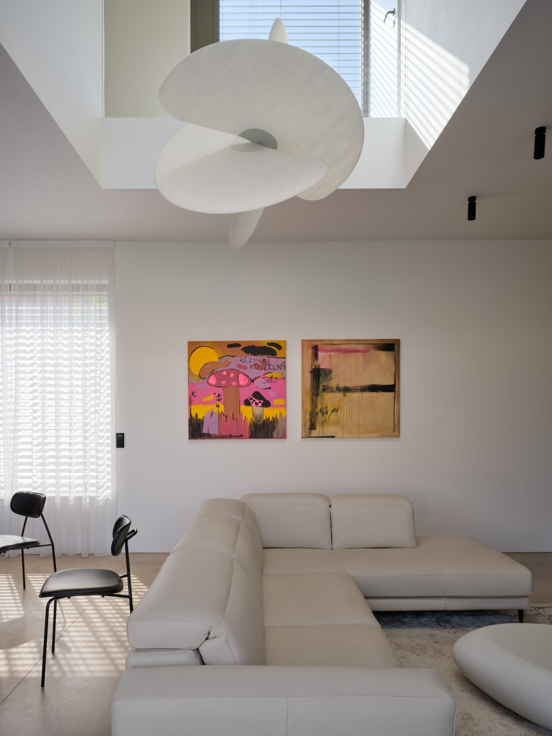 Interiér přirozeně reaguje na svažující se terén a už při vstupu odhaluje prostorovou hru v hlavní obytné místnosti. Snížená podlaha obývacího pokoje, otevřené schodiště s prosklenou mezipodestou a průhled na galerii v horním podlaží vytvářejí v jednoduché hmotě domu atraktivní prostorovou hru, která se v těsném spojení s citlivě komponovanou fasádou stává hlavním tématem domu. Standardní provozní dělení rodinných domů na denní a noční část je zde záměrně narušeno – vzniká hybridní forma soužití, která přirozeně podporuje rodinné vazby.