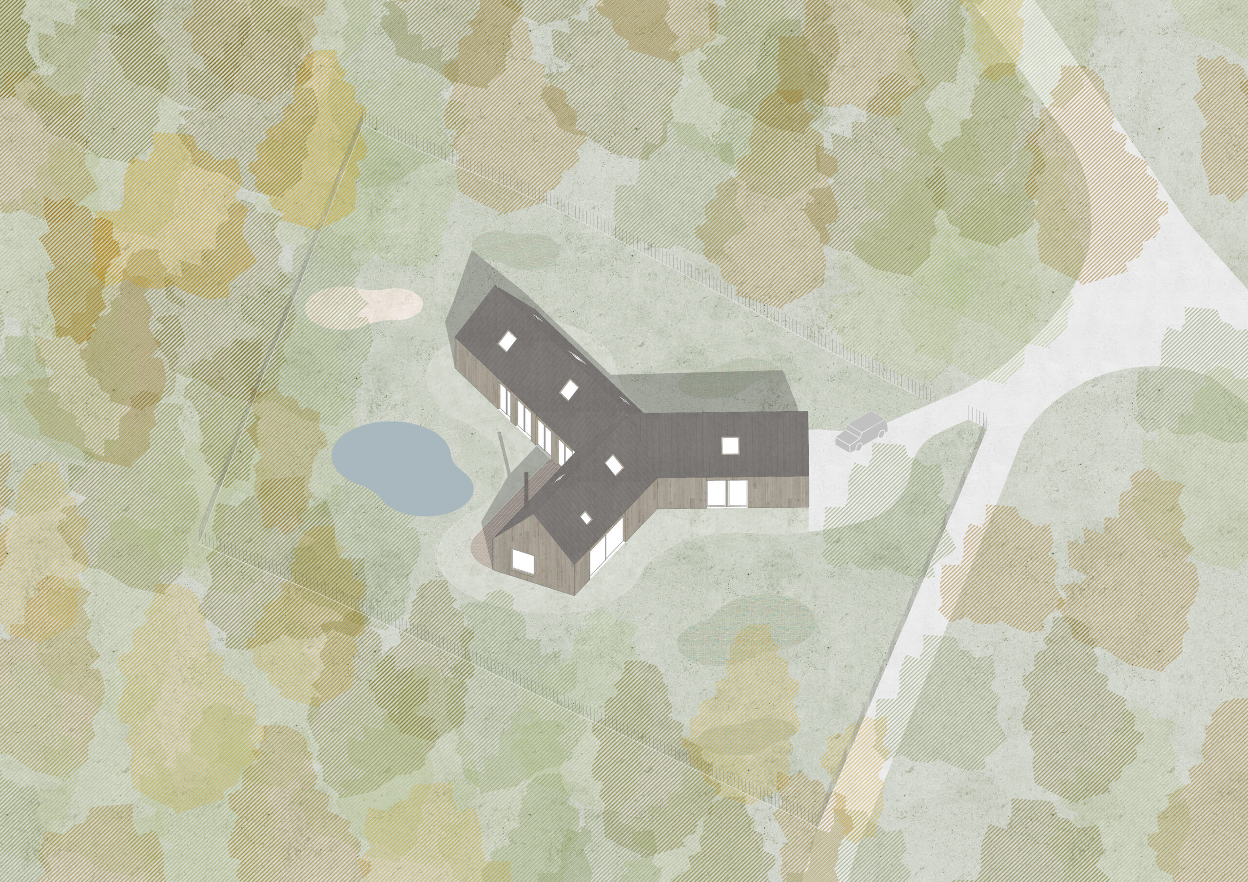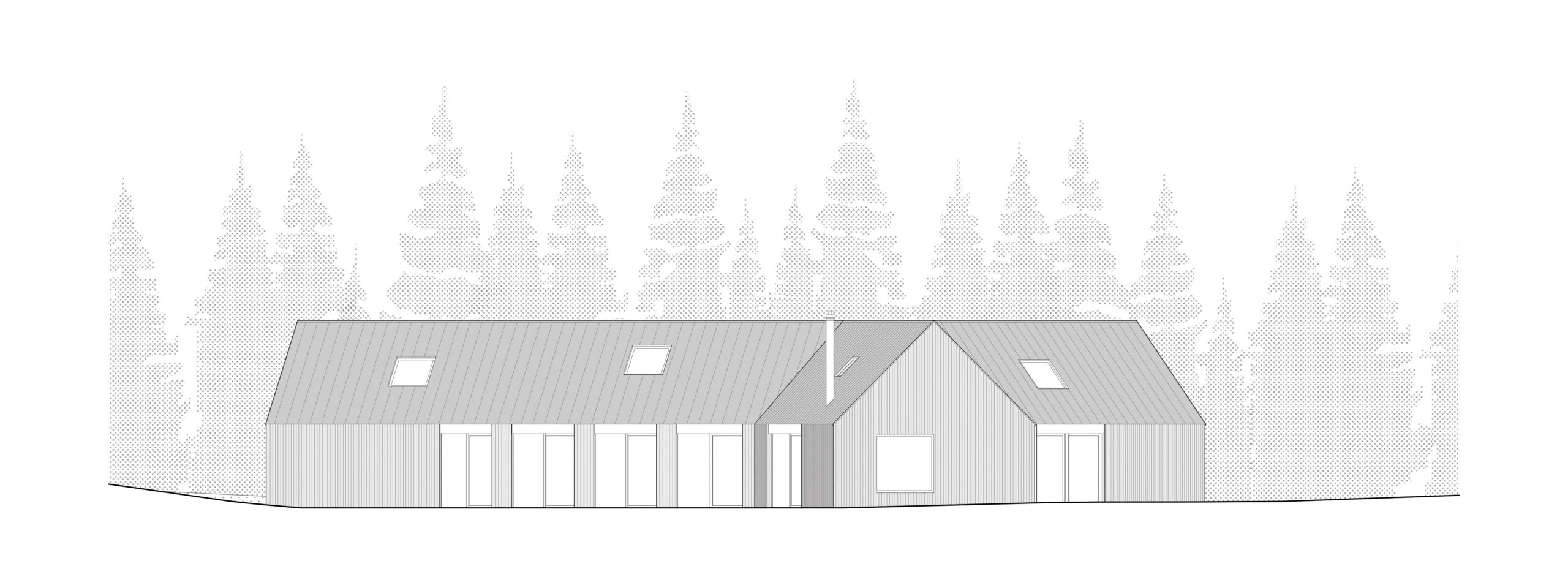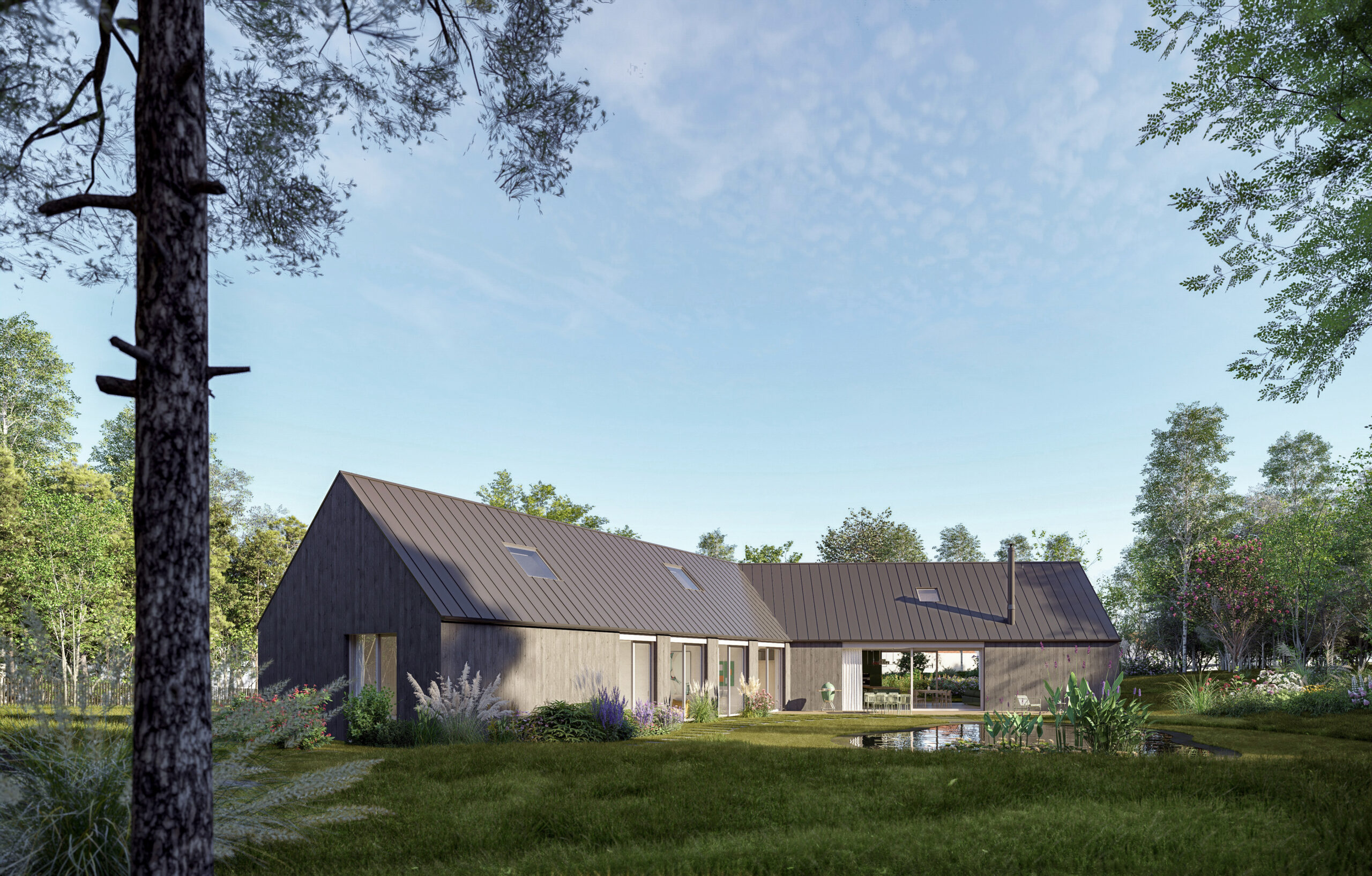 Netradiční tvar domu o třech pavilonech je reakcí na požadavky majitelů i pozemku, který je ze tří stran lemován lesem. Plocha pozemku se rozpouští v krajině a díky okamžitému napojení na les působí dojmem vizuálně nekonečné zahrady. Přímo na parcele nachází své místo užitná zahrada se skleníkem, společenská část s terasou a biotopovým jezírkem a ohniště, které vybízí k setkávání s přáteli nebo posezení během teplých večerů. Do zahrady lze vstoupit z každé místnosti domu.