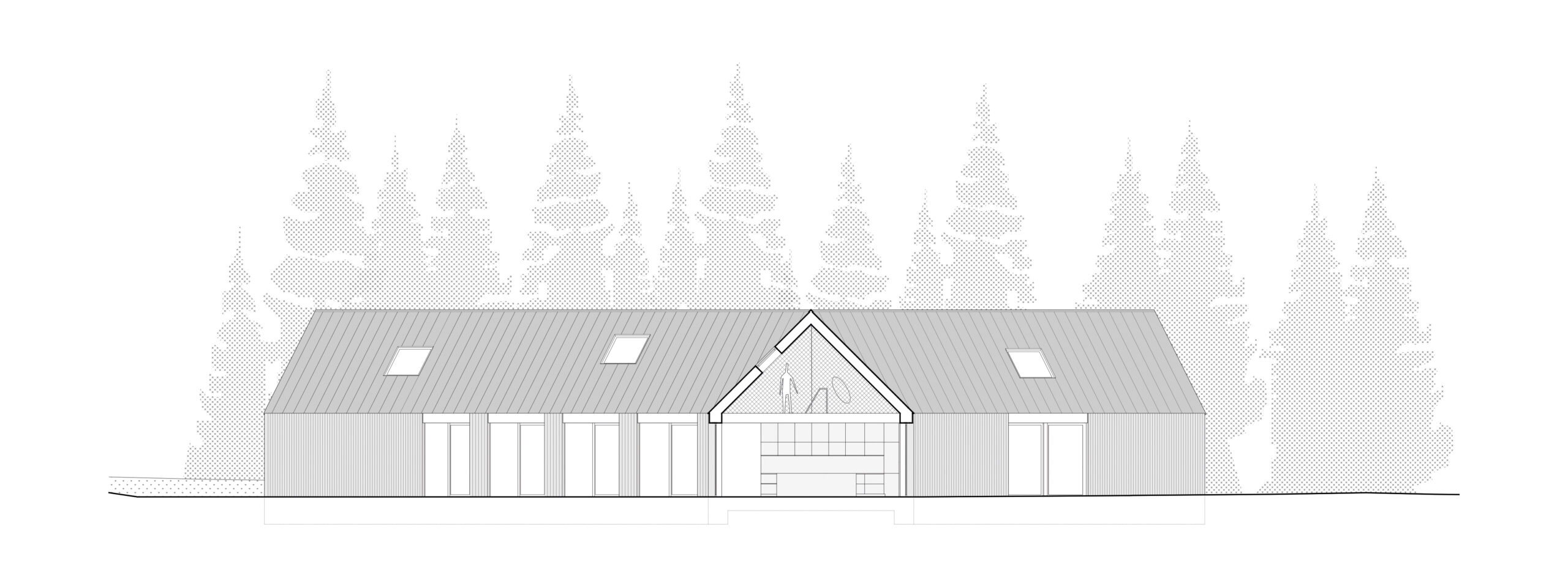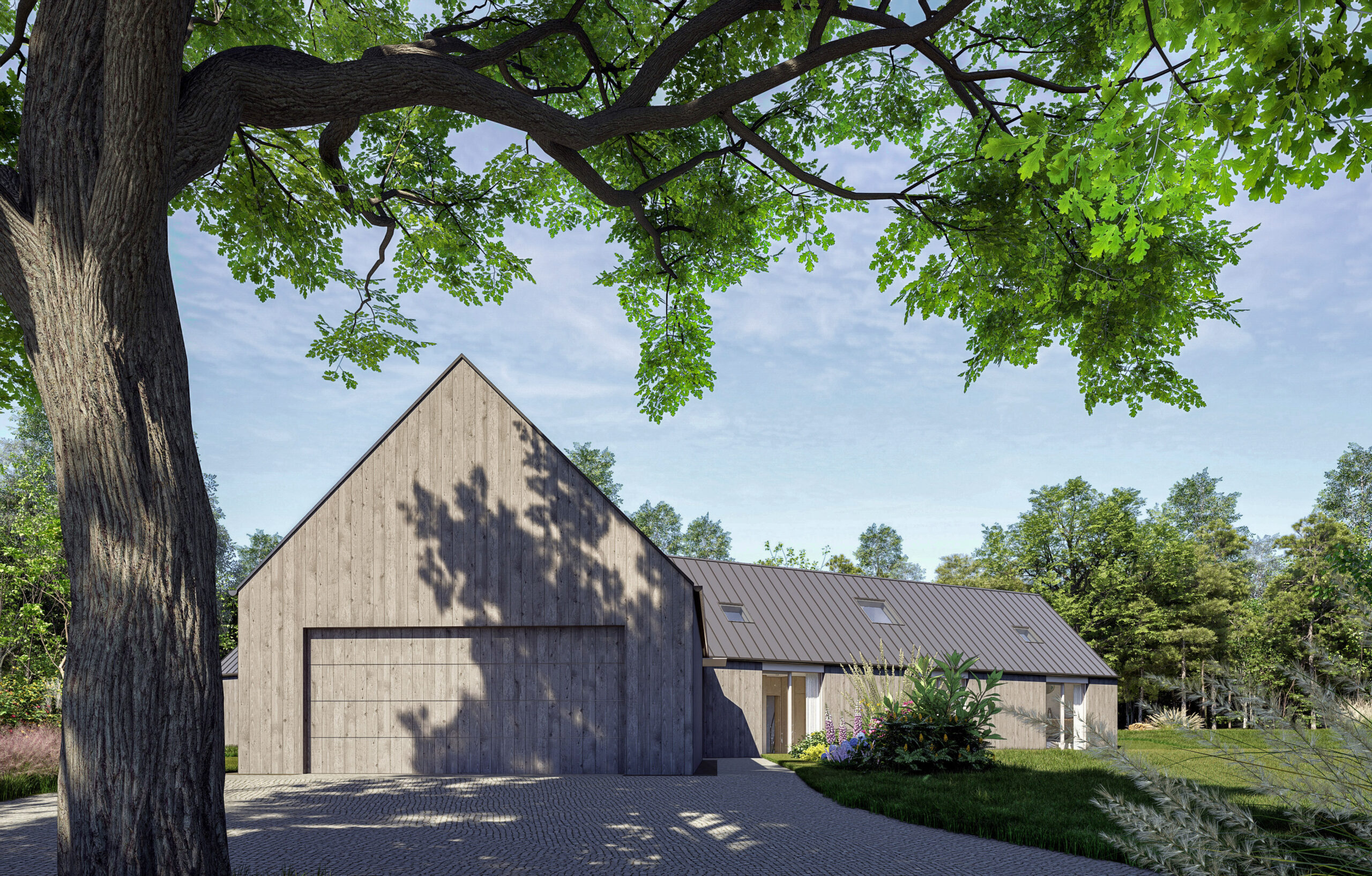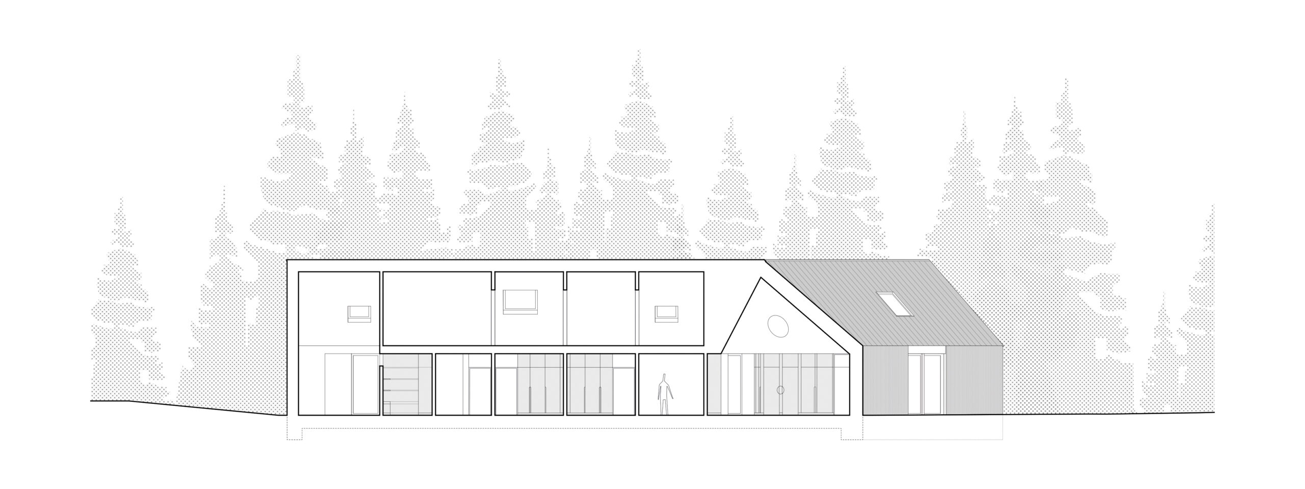 Netradiční tvar domu o třech pavilonech je reakcí na požadavky majitelů i pozemku, který je ze tří stran lemován lesem. Plocha pozemku se rozpouští v krajině a díky okamžitému napojení na les působí dojmem vizuálně nekonečné zahrady. Přímo na parcele nachází své místo užitná zahrada se skleníkem, společenská část s terasou a biotopovým jezírkem a ohniště, které vybízí k setkávání s přáteli nebo posezení během teplých večerů. Do zahrady lze vstoupit z každé místnosti domu.