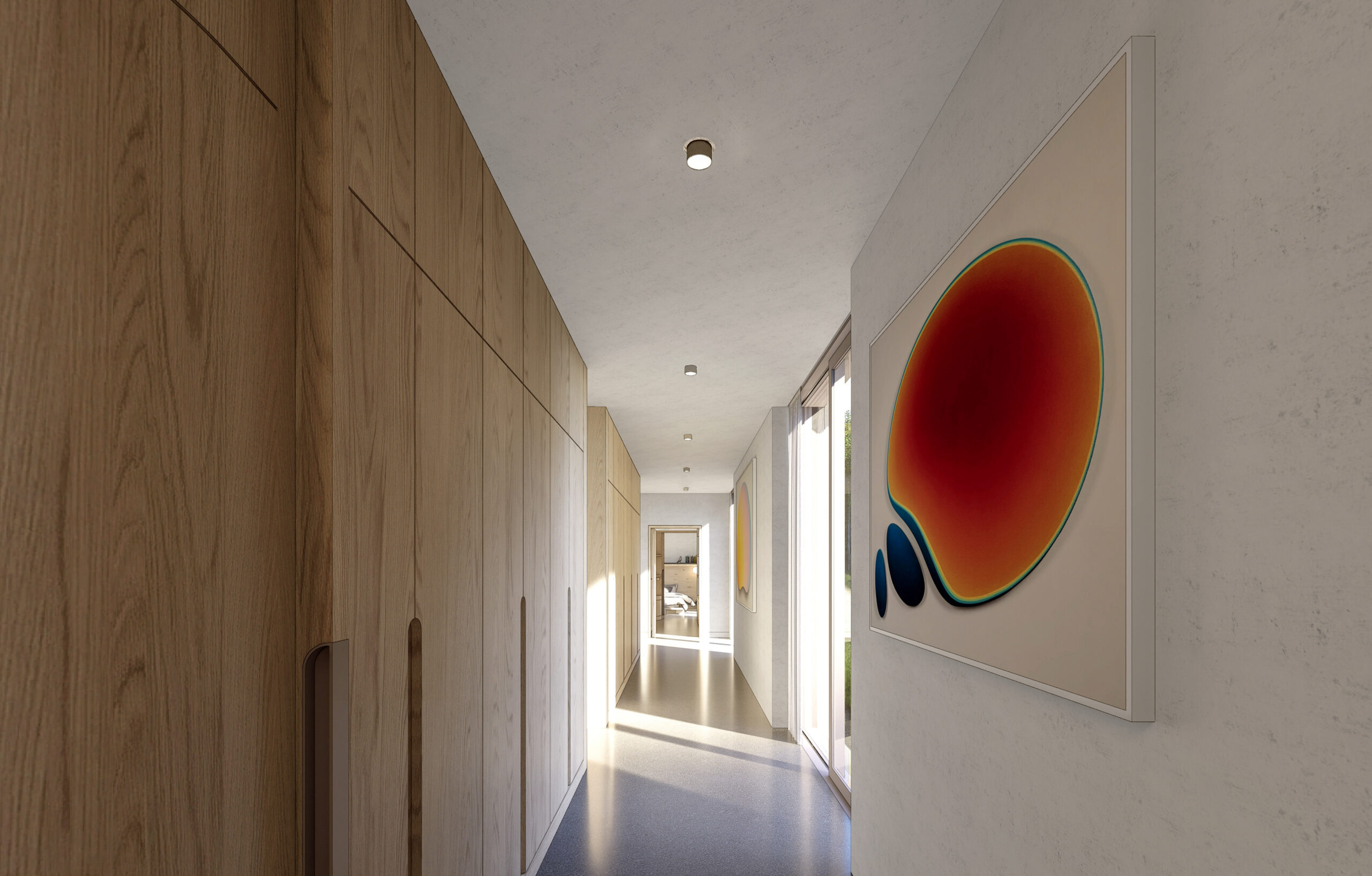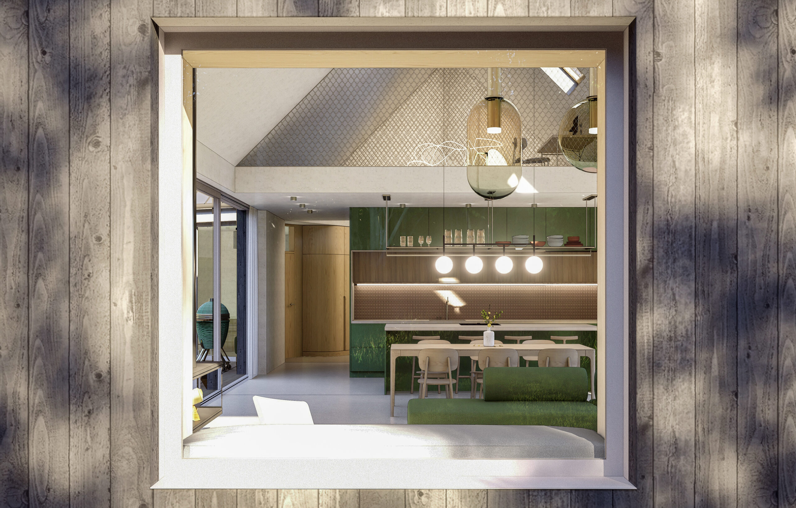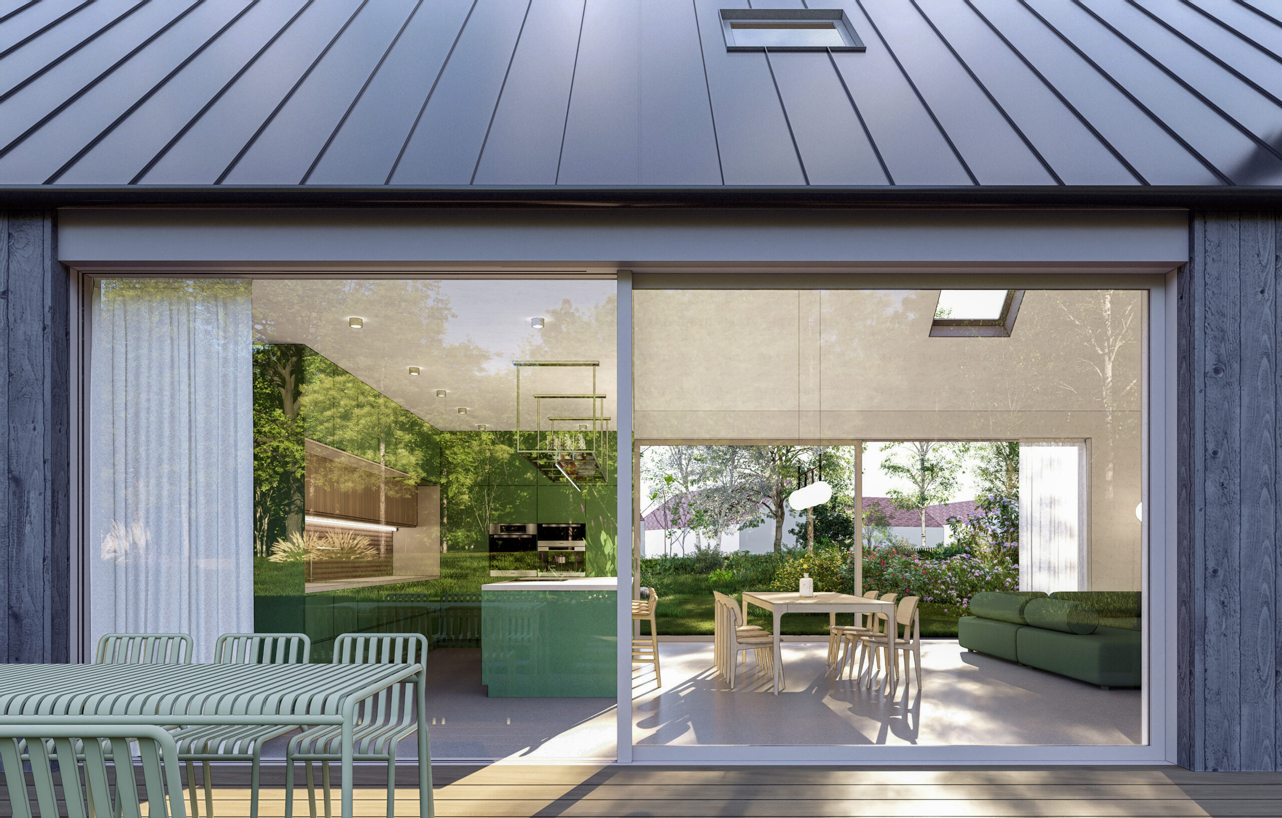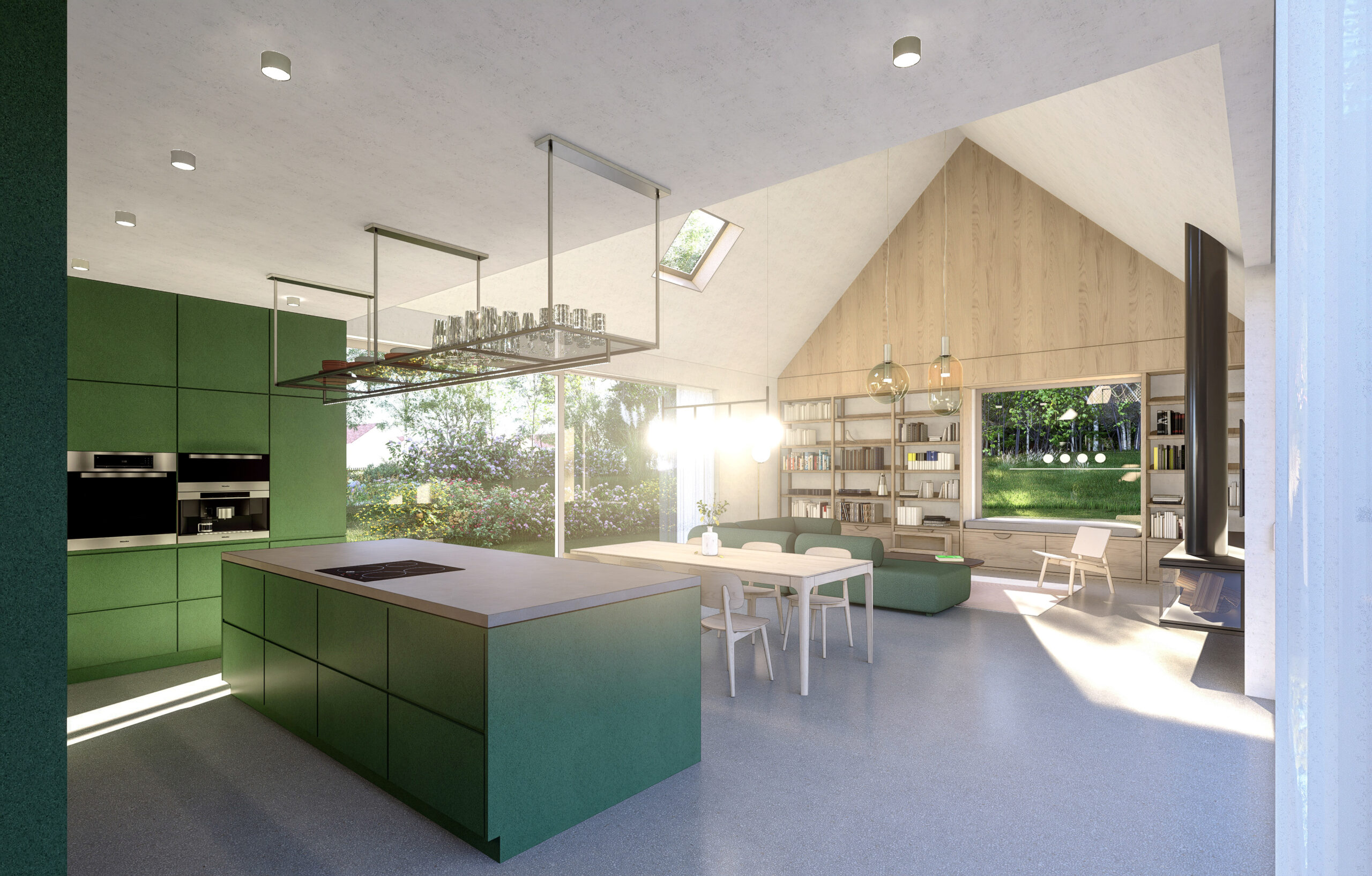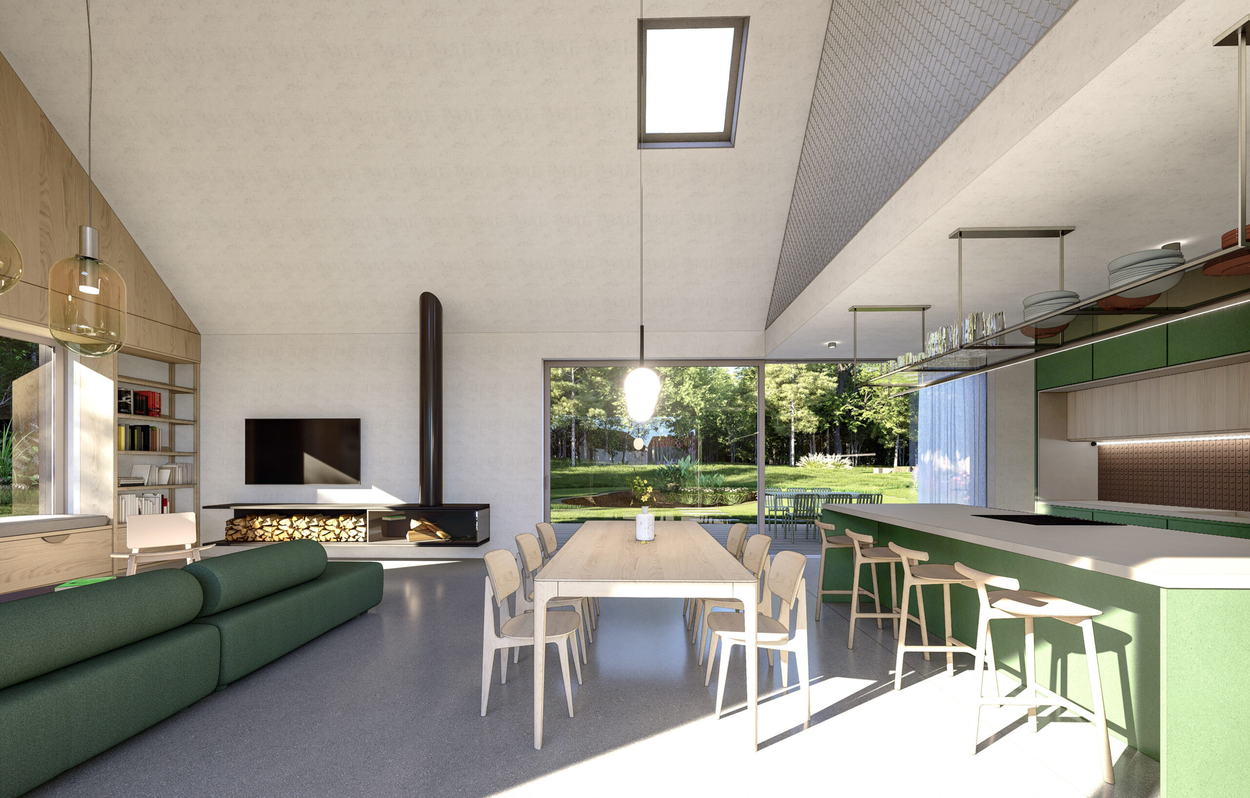 Hlavní obytný prostor je otevřený do krovu a orientovaný do nejvhodnějších světových stran s portály umístěnými proti sobě směrem na sever a jih. Množství velkoformátového prosklení umožňuje dům stoprocentně napojit na zahradu. Vzniká tak volně plynoucí prostor, kde se stírají hranice mezi venkovními a vnitřními světy.