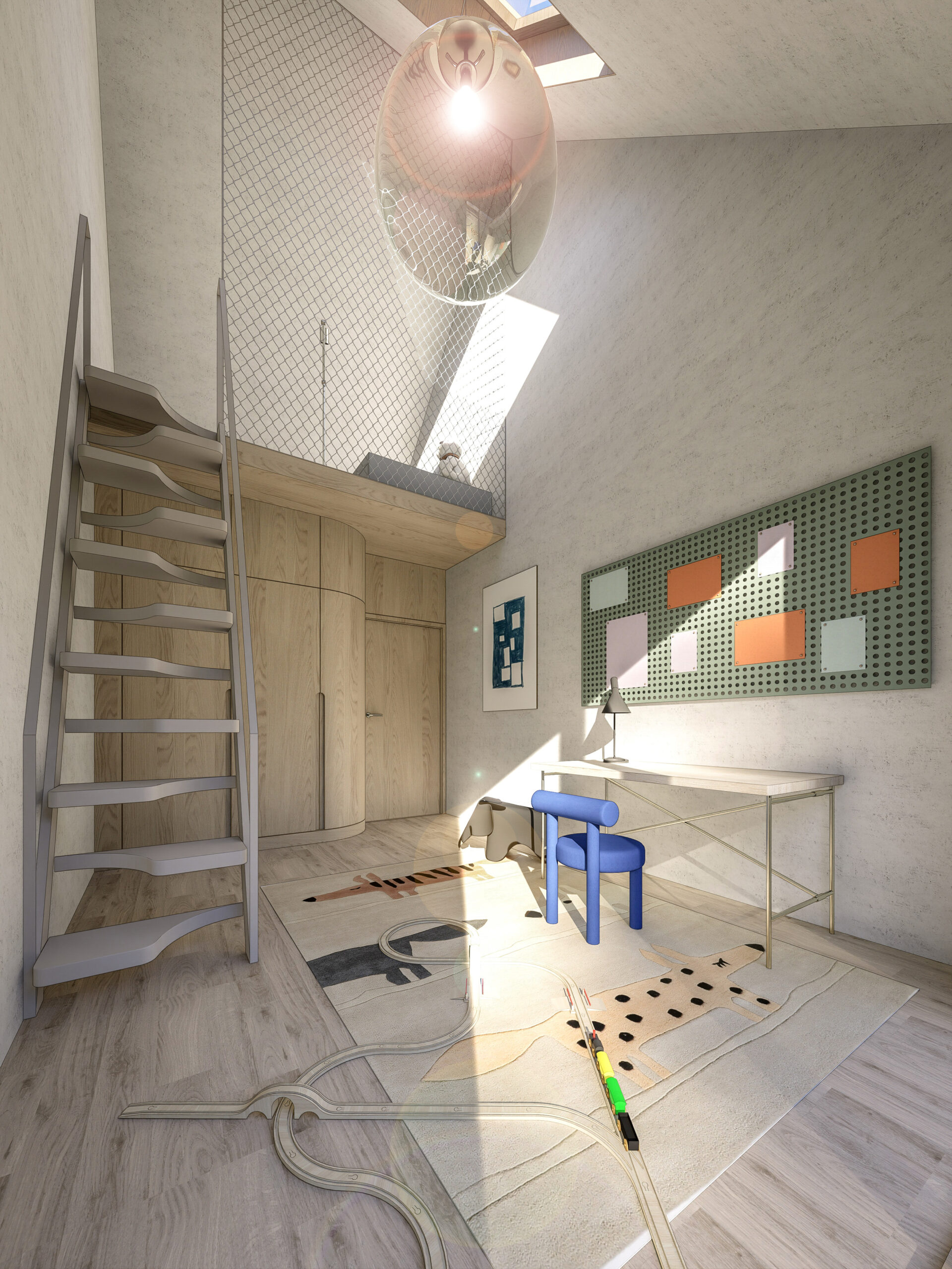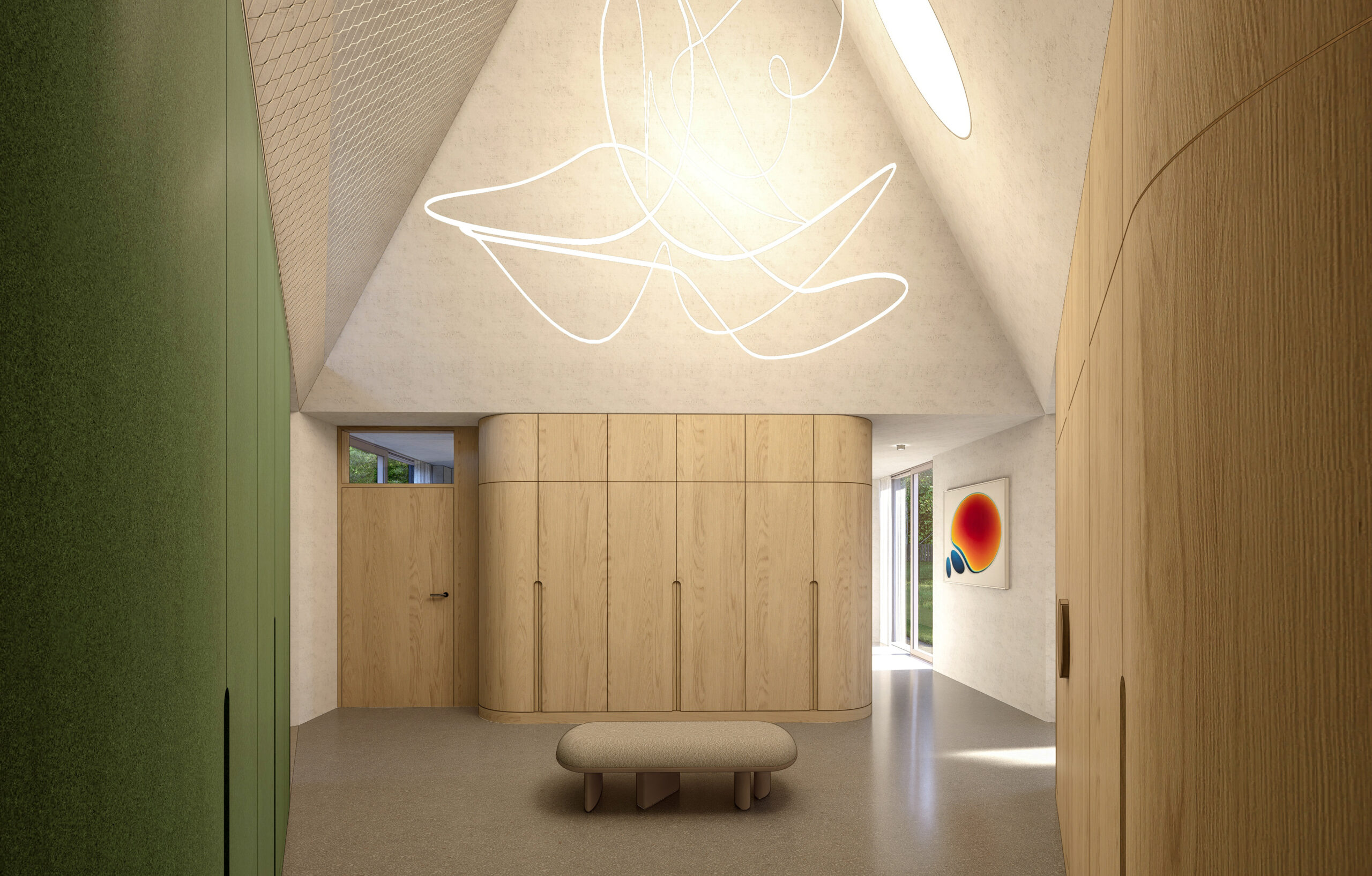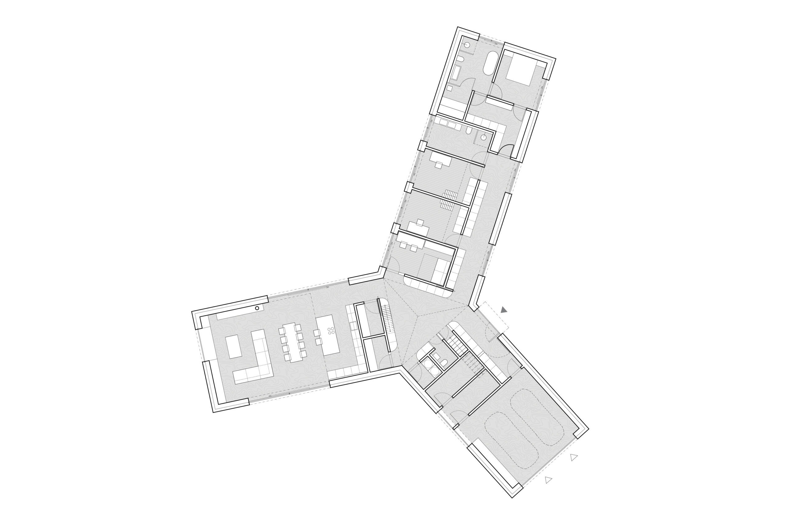 Rodinný dům v Zichovci koncipujeme dle přání majitelů jako jednopodlažní s částečně využitým podkrovím. Hlavním orientačním bodem domu je trojboké centrální atrium, které spojuje tři pavilony v jeden celek. Do jednotlivých ramen objektu umisťujeme vždy jednu funkci – vzniká tak pavilon s denními místnostmi a společným obytným prostorem, úsek ložnic s koupelnami a samostatné zázemí s dílnou a garáží. Každá část domu směřuje na jinou světovou stranu a má tak své absolutní soukromí.