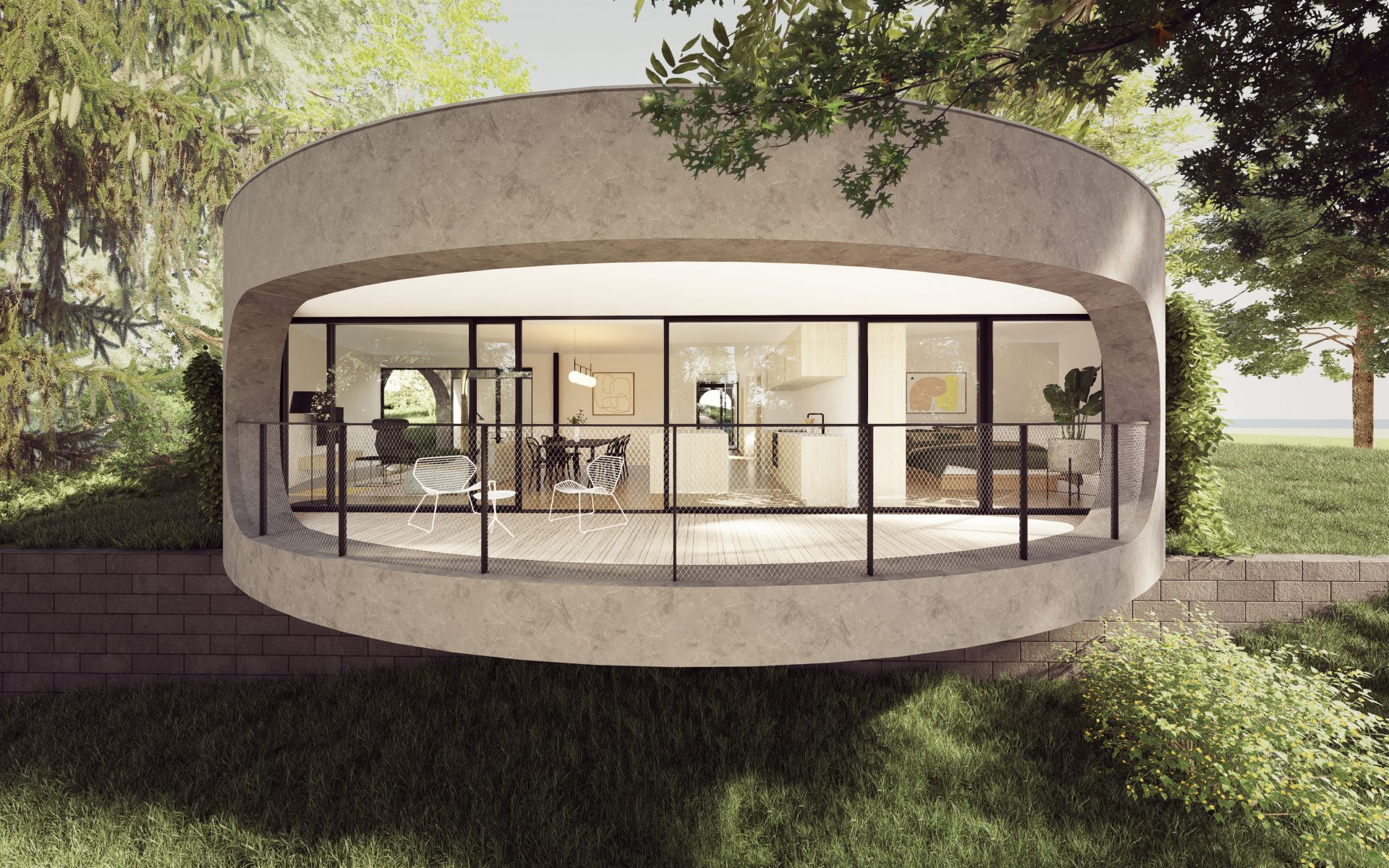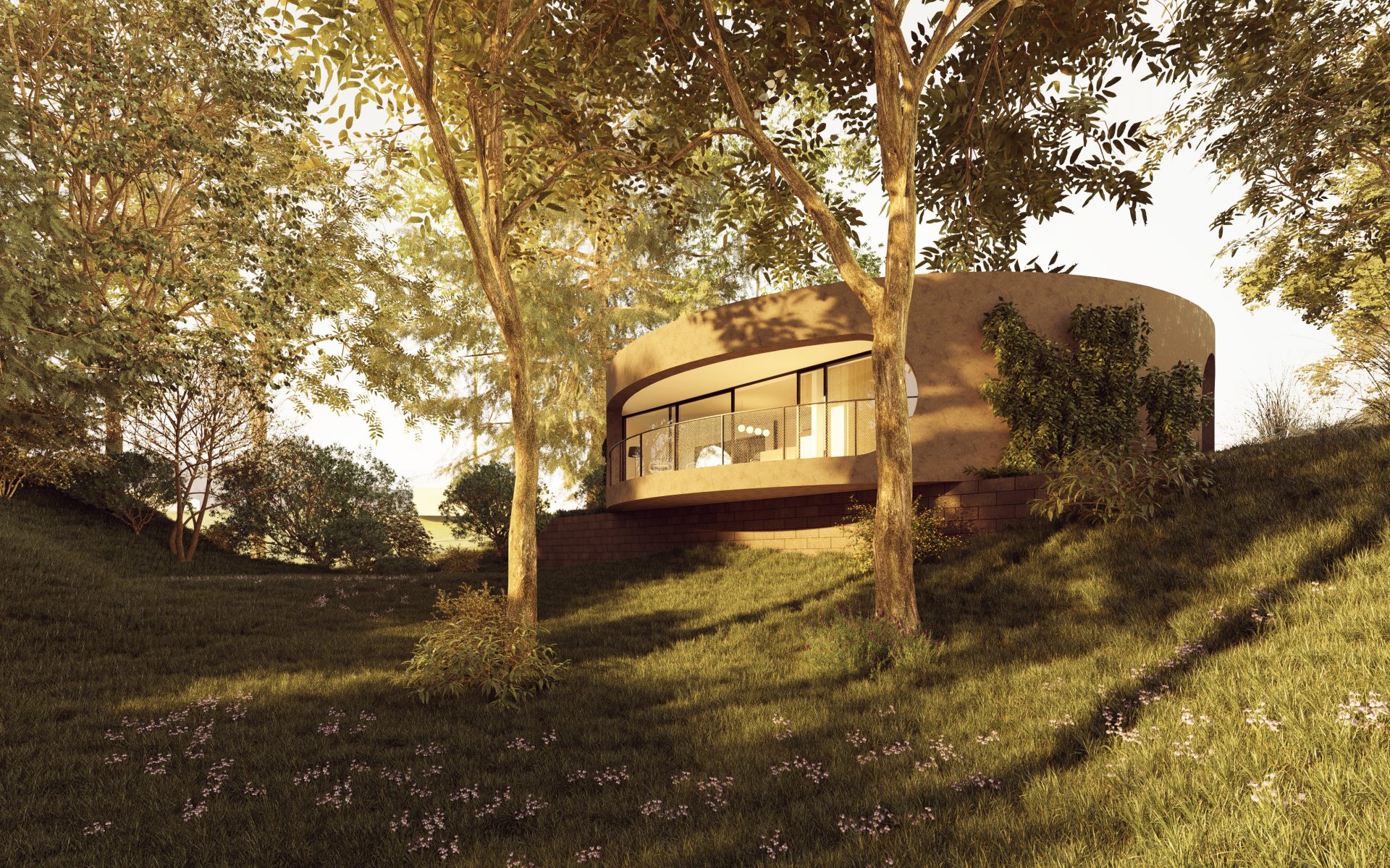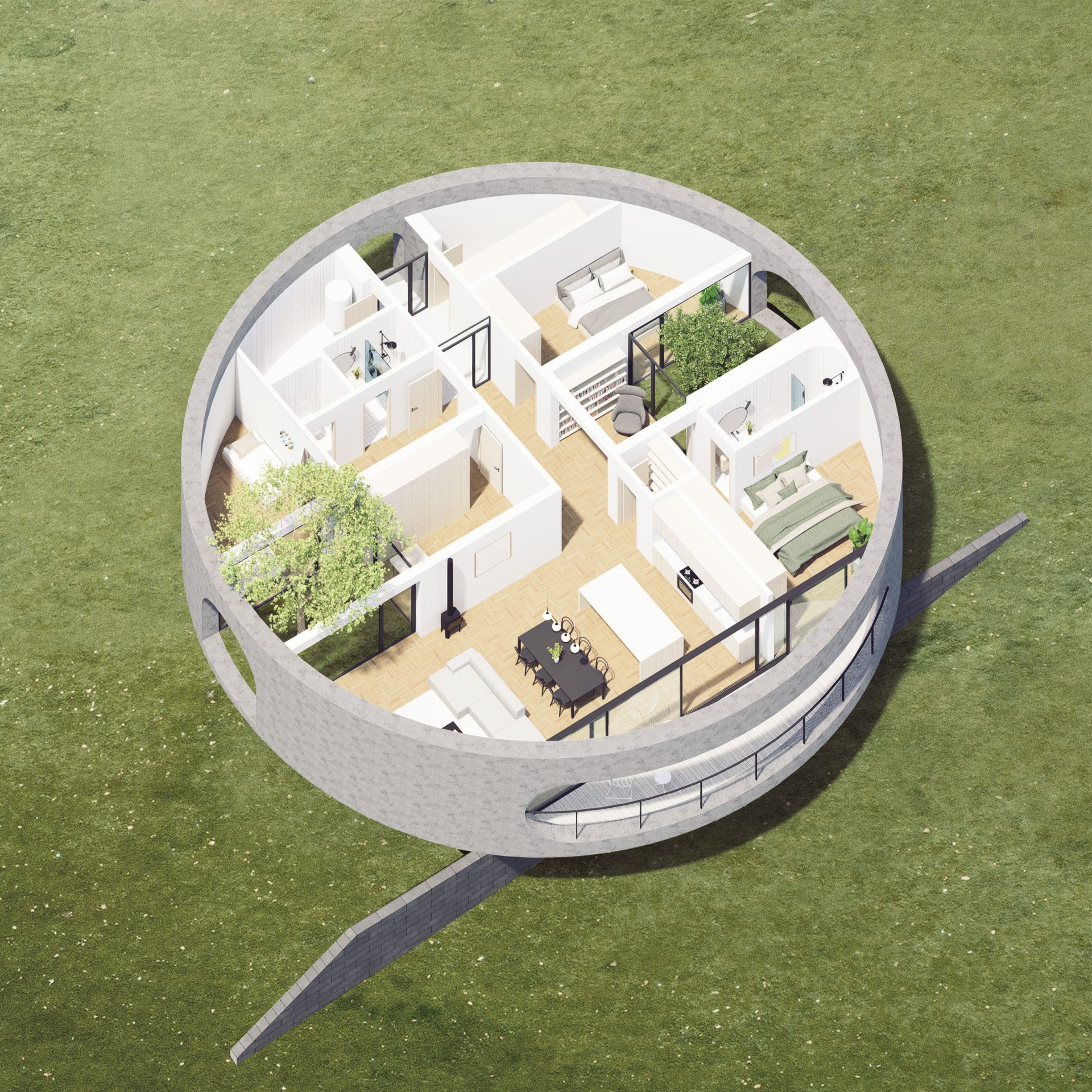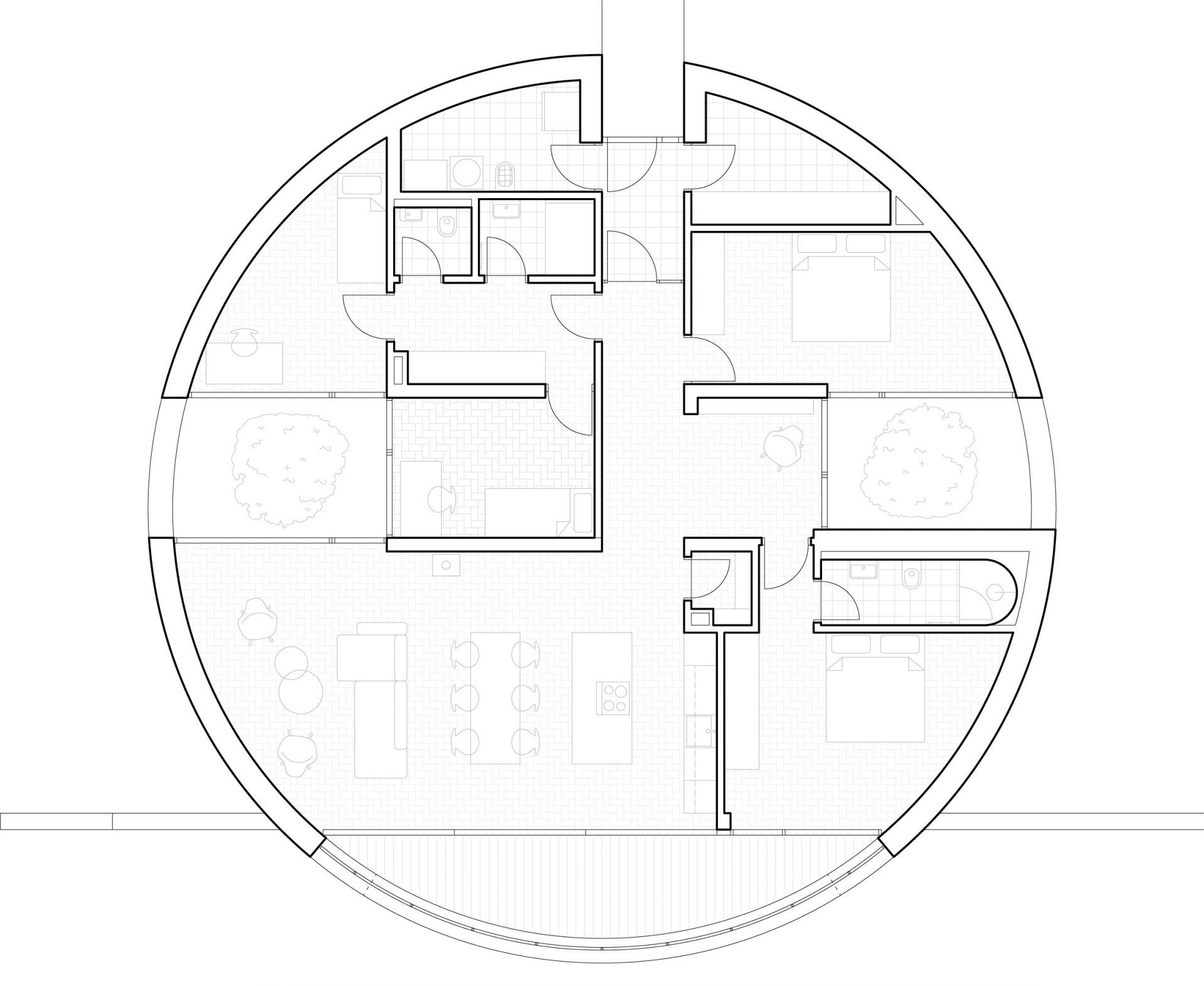 E. T. volá domů… lehce mimozemský dům přistál v Černošicích. Inspiraci jsme však nehledali u jiných vesmírných civilizací, nýbrž jsme vzdali hold legendárnímu Sevan Writers House v Arménii. Netradiční jednopodlažní rodinný dům je situovaný v nejvyšší části svažitého pozemku z důvodu ochrany před hlukem od projíždějících vlaků a nedalekého jezu a zároveň kvůli snadnému napojení na přilehlou ulici. Kruhová půdorysná stopa reaguje na tvar pozemku a opticky odlehčuje minimální odstupy od sousedních pozemků. Obytné místnosti jsou orientovány v přední části objektu a směrovány na výhled do údolí řeky. Příjemné intimity v ložnicích je dosaženo díky orientaci oken do dvou atrií, částečný výhled do údolí je však zachován prostřednictvím průhledu přes obývací pokoj. Vykonzolovaný přední balkon navazuje v maximální možné šířce na hlavní obytný prostor a vytváří plynulý a nerušený přechod mezi domem a krajinou.