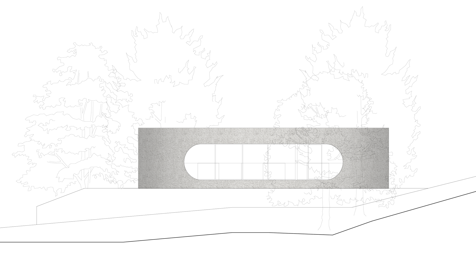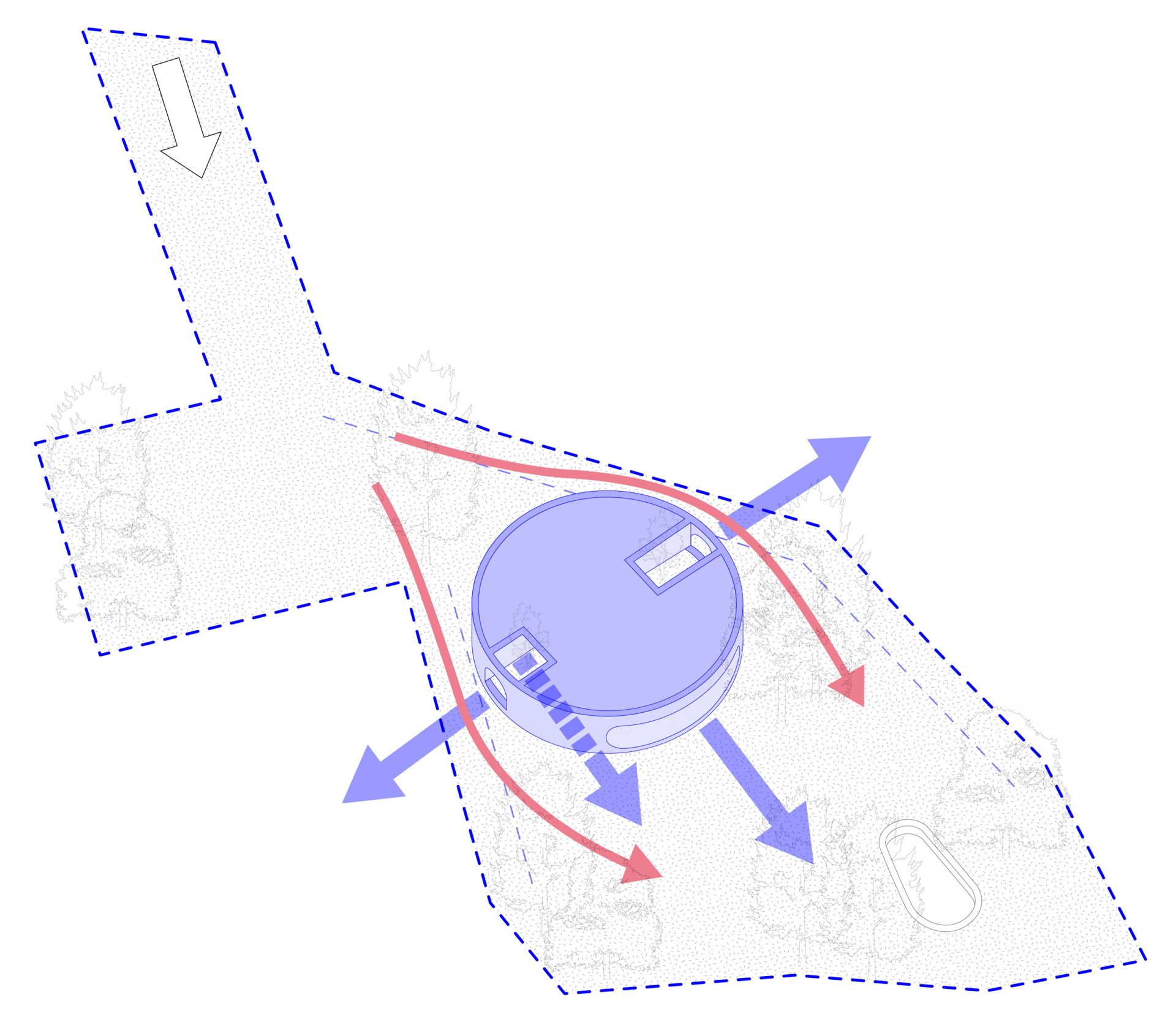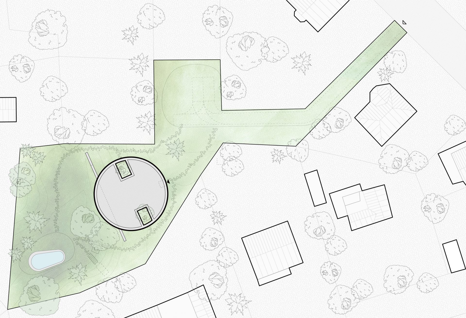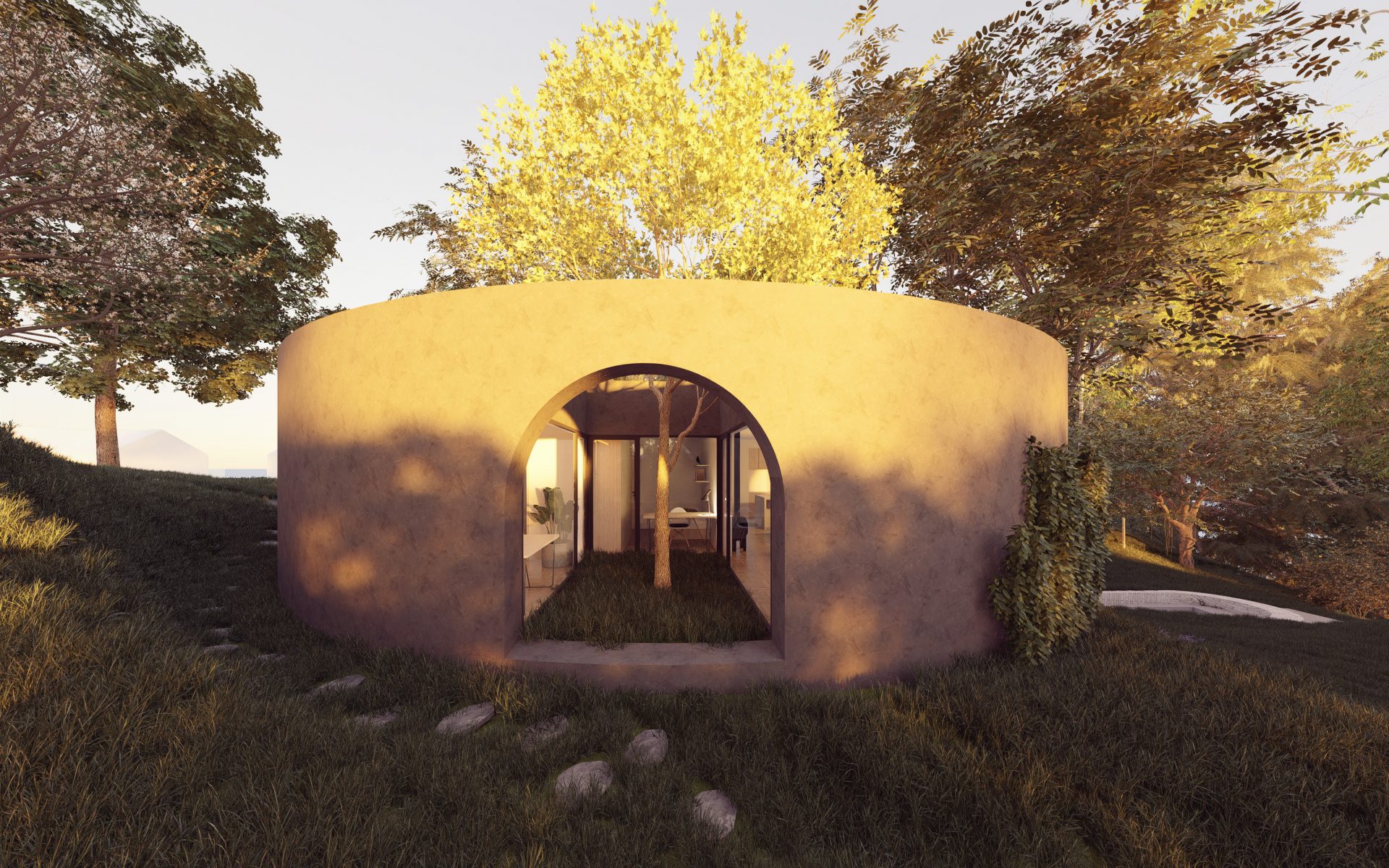 E. T. volá domů… lehce mimozemský dům přistál v Černošicích. Inspiraci jsme však nehledali u jiných vesmírných civilizací, nýbrž jsme vzdali hold legendárnímu Sevan Writers House v Arménii. Netradiční jednopodlažní rodinný dům je situovaný v nejvyšší části svažitého pozemku z důvodu ochrany před hlukem od projíždějících vlaků a nedalekého jezu a zároveň kvůli snadnému napojení na přilehlou ulici. Kruhová půdorysná stopa reaguje na tvar pozemku a opticky odlehčuje minimální odstupy od sousedních pozemků. Obytné místnosti jsou orientovány v přední části objektu a směrovány na výhled do údolí řeky. Příjemné intimity v ložnicích je dosaženo díky orientaci oken do dvou atrií, částečný výhled do údolí je však zachován prostřednictvím průhledu přes obývací pokoj. Vykonzolovaný přední balkon navazuje v maximální možné šířce na hlavní obytný prostor a vytváří plynulý a nerušený přechod mezi domem a krajinou.