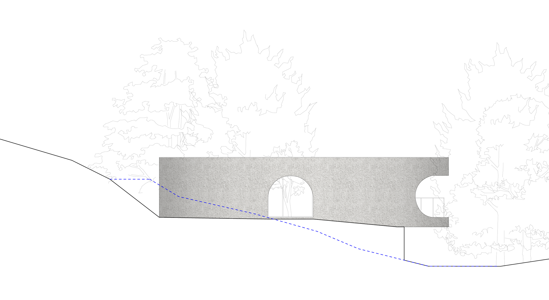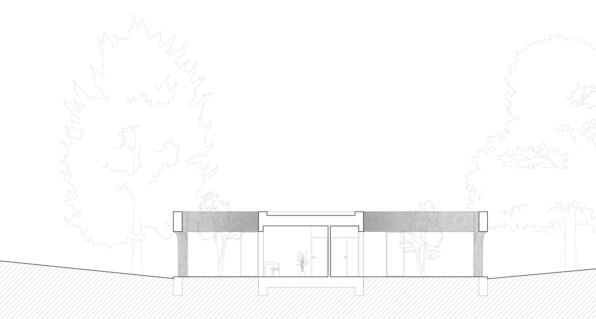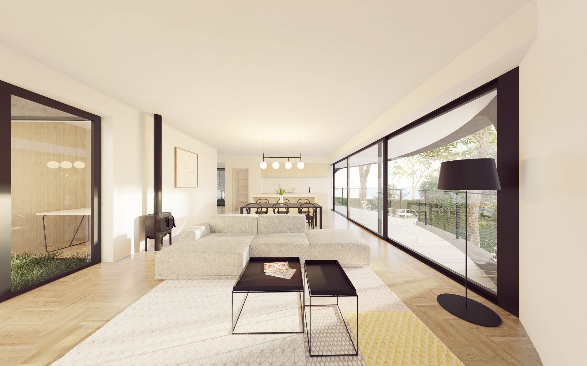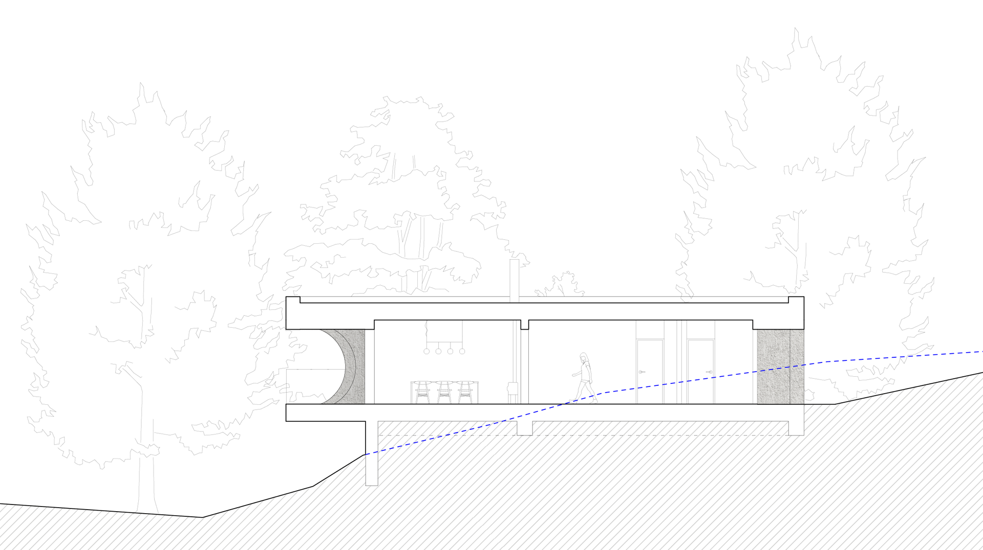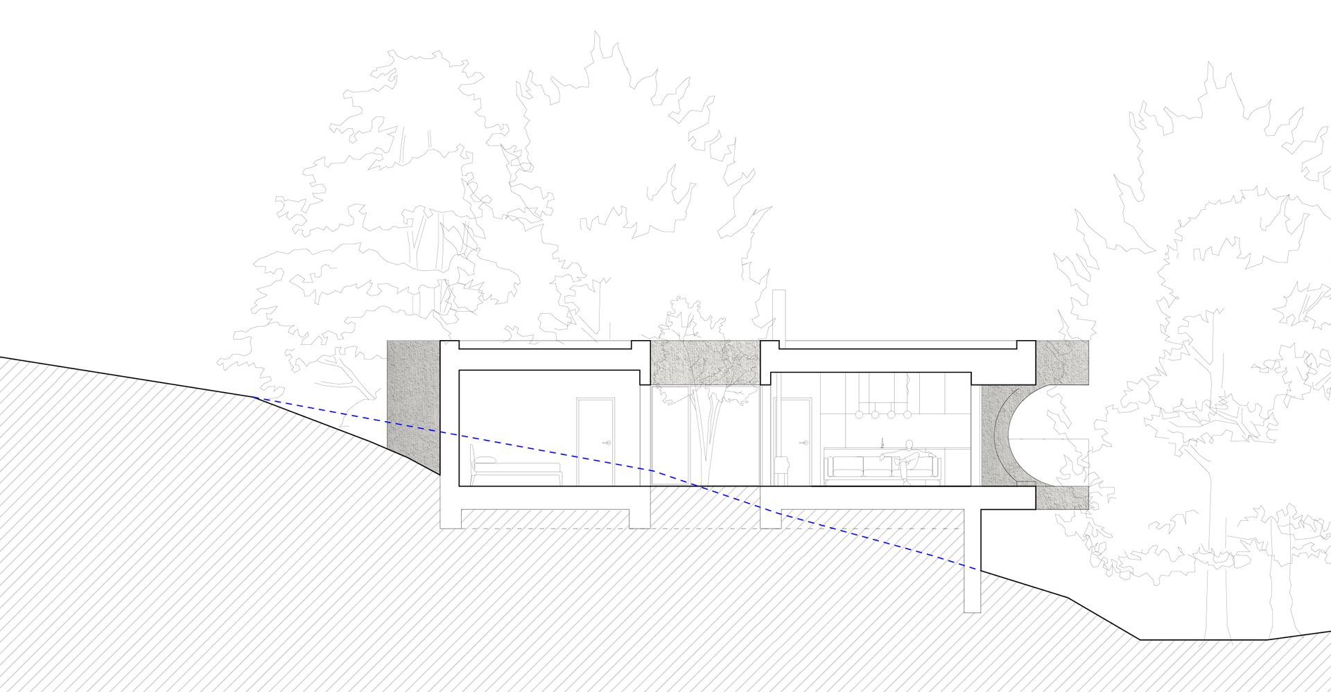 E. T. volá domů… lehce mimozemský dům přistál v Černošicích. Inspiraci jsme však nehledali u jiných vesmírných civilizací, nýbrž jsme vzdali hold legendárnímu Sevan Writers House v Arménii. Netradiční jednopodlažní rodinný dům je situovaný v nejvyšší části svažitého pozemku z důvodu ochrany před hlukem od projíždějících vlaků a nedalekého jezu a zároveň kvůli snadnému napojení na přilehlou ulici. Kruhová půdorysná stopa reaguje na tvar pozemku a opticky odlehčuje minimální odstupy od sousedních pozemků. Obytné místnosti jsou orientovány v přední části objektu a směrovány na výhled do údolí řeky. Příjemné intimity v ložnicích je dosaženo díky orientaci oken do dvou atrií, částečný výhled do údolí je však zachován prostřednictvím průhledu přes obývací pokoj. Vykonzolovaný přední balkon navazuje v maximální možné šířce na hlavní obytný prostor a vytváří plynulý a nerušený přechod mezi domem a krajinou.