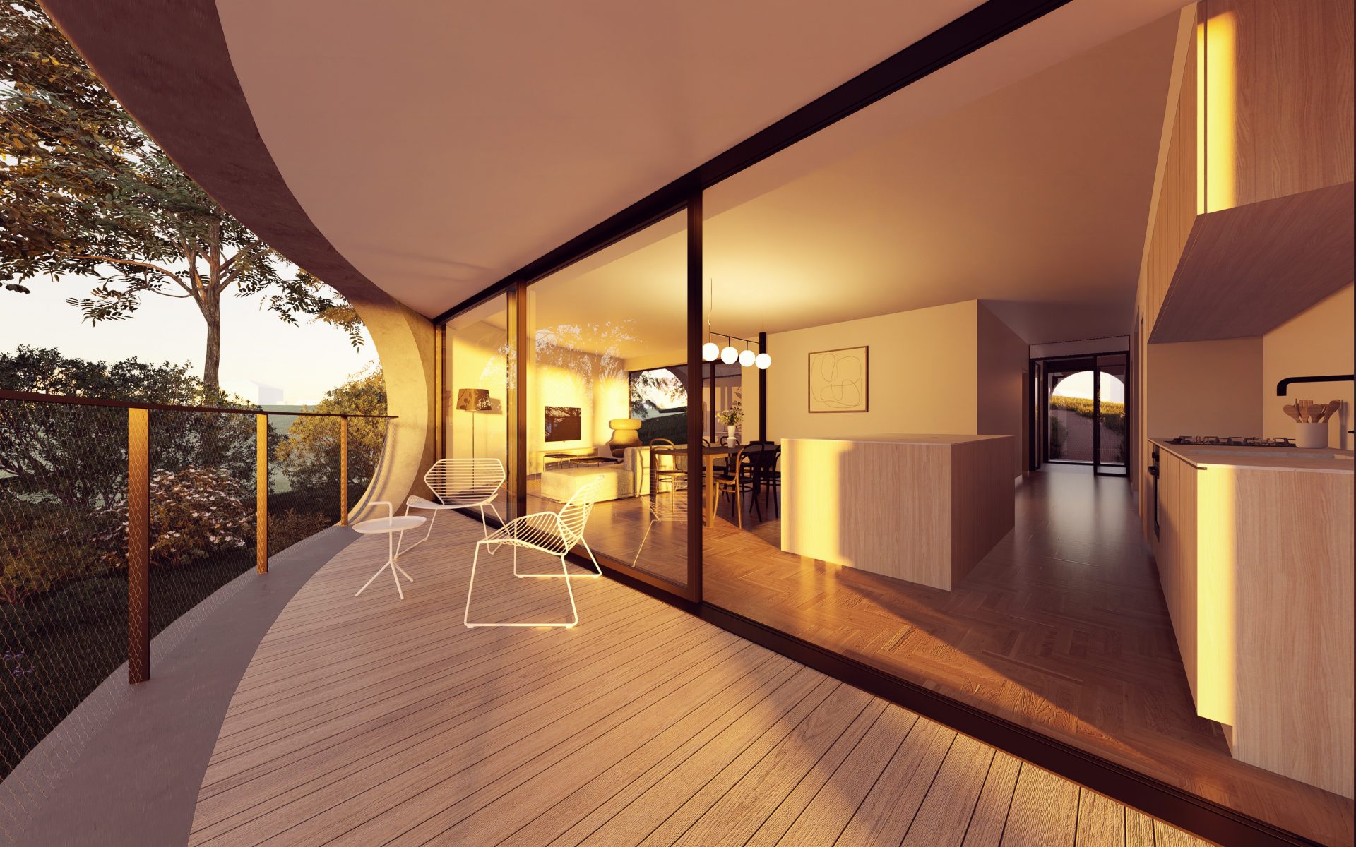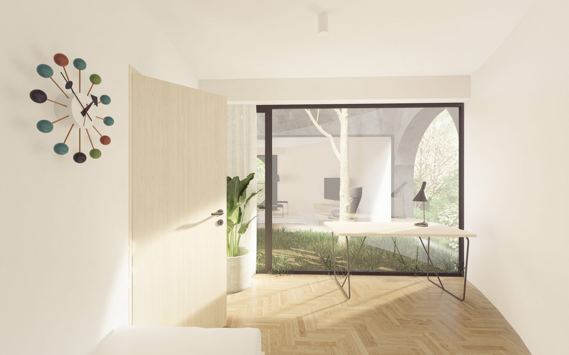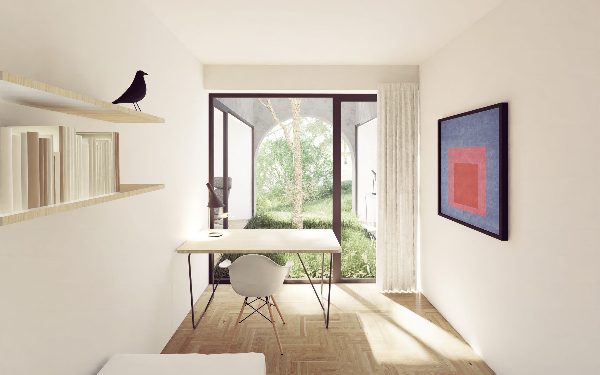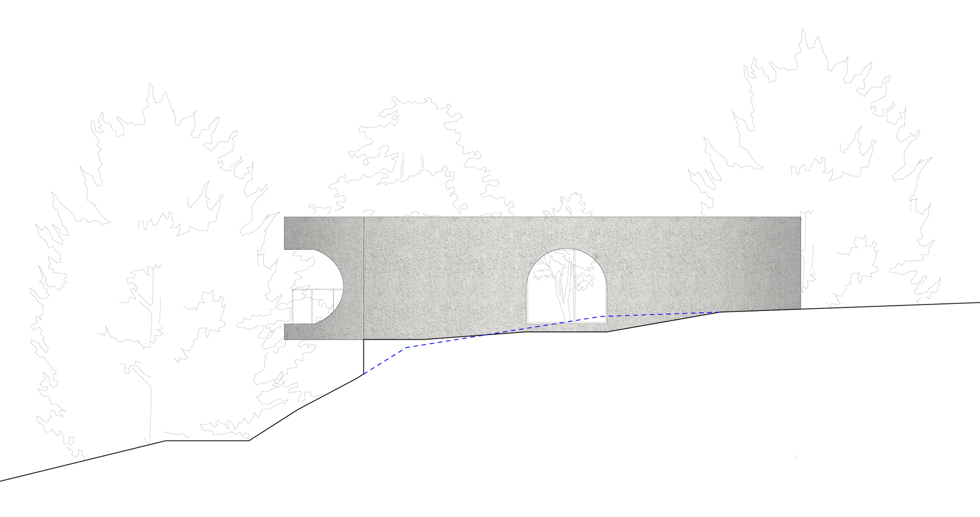 E. T. volá domů… lehce mimozemský dům přistál v Černošicích. Inspiraci jsme však nehledali u jiných vesmírných civilizací, nýbrž jsme vzdali hold legendárnímu Sevan Writers House v Arménii. Netradiční jednopodlažní rodinný dům je situovaný v nejvyšší části svažitého pozemku z důvodu ochrany před hlukem od projíždějících vlaků a nedalekého jezu a zároveň kvůli snadnému napojení na přilehlou ulici. Kruhová půdorysná stopa reaguje na tvar pozemku a opticky odlehčuje minimální odstupy od sousedních pozemků. Obytné místnosti jsou orientovány v přední části objektu a směrovány na výhled do údolí řeky. Příjemné intimity v ložnicích je dosaženo díky orientaci oken do dvou atrií, částečný výhled do údolí je však zachován prostřednictvím průhledu přes obývací pokoj. Vykonzolovaný přední balkon navazuje v maximální možné šířce na hlavní obytný prostor a vytváří plynulý a nerušený přechod mezi domem a krajinou.