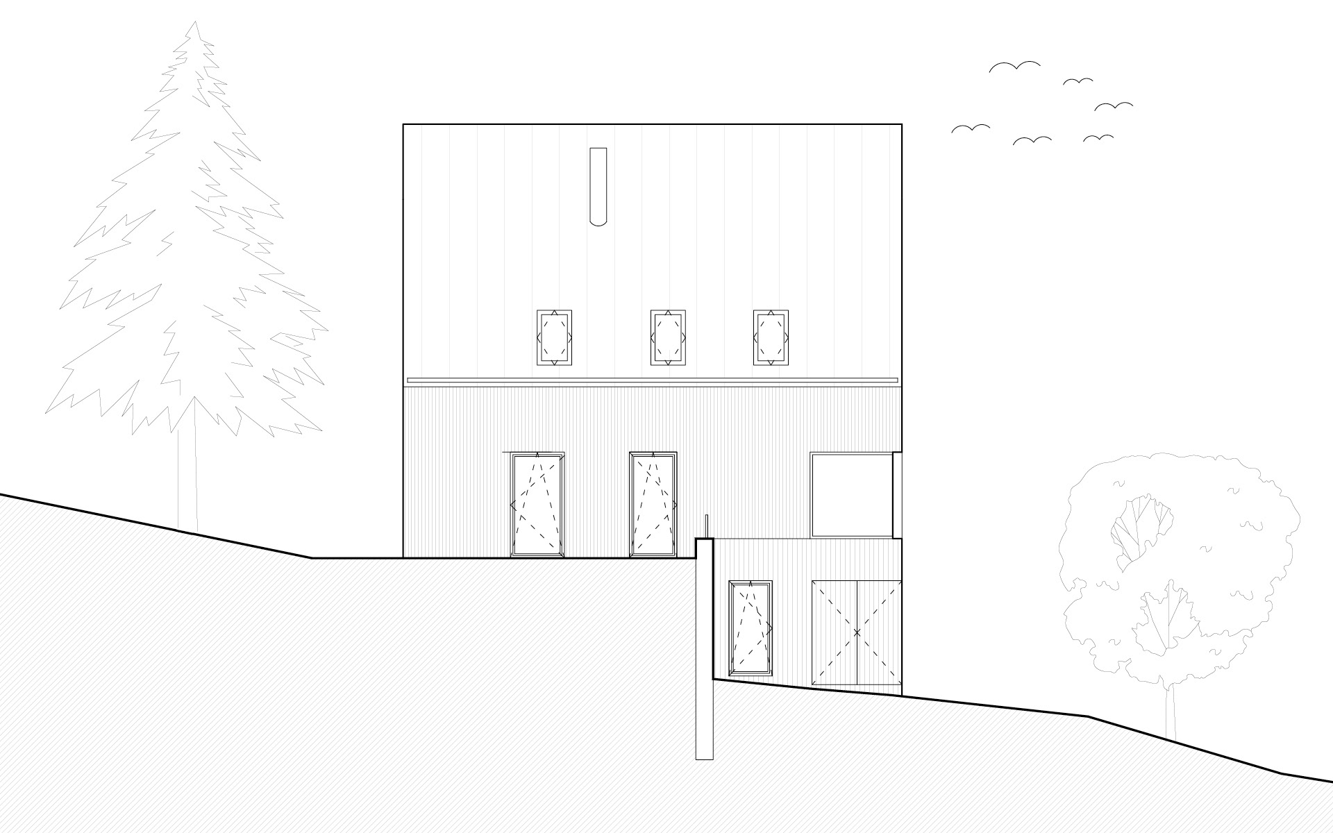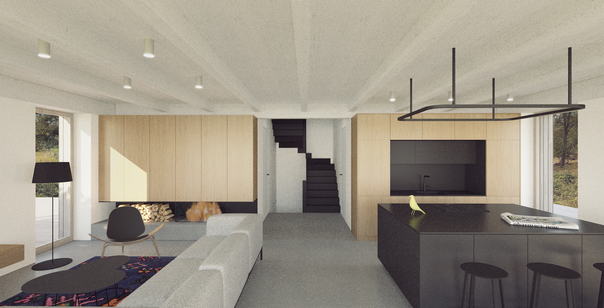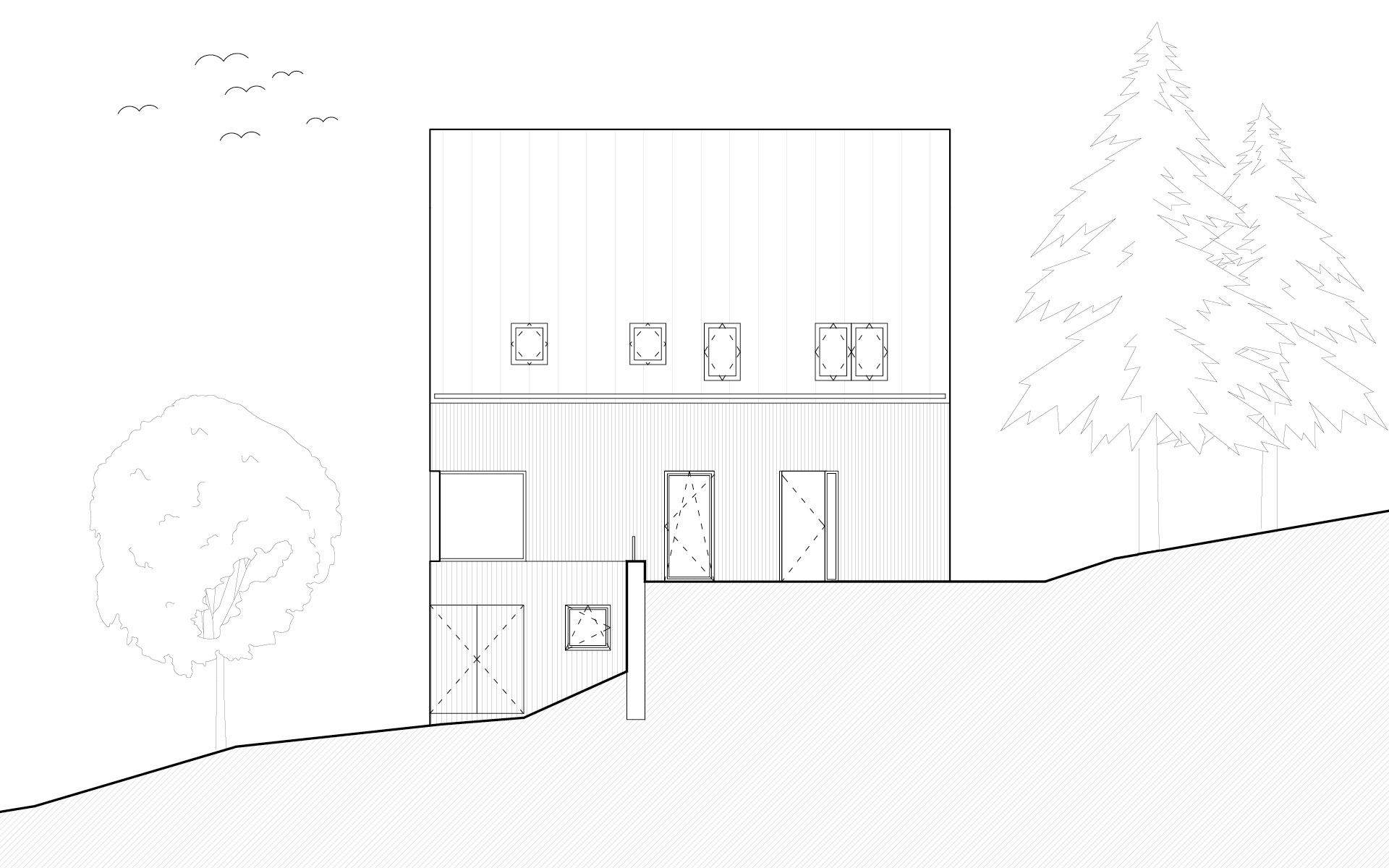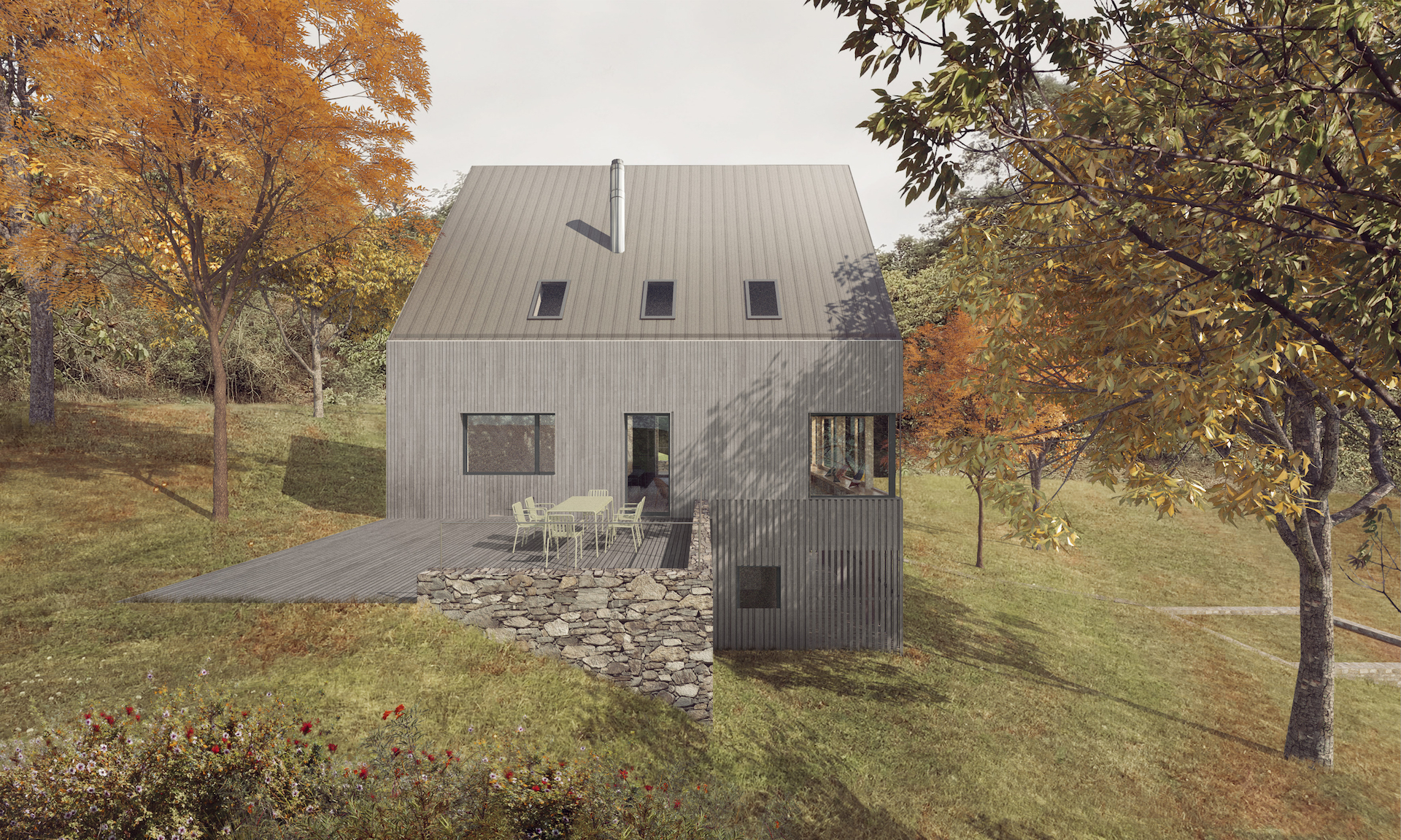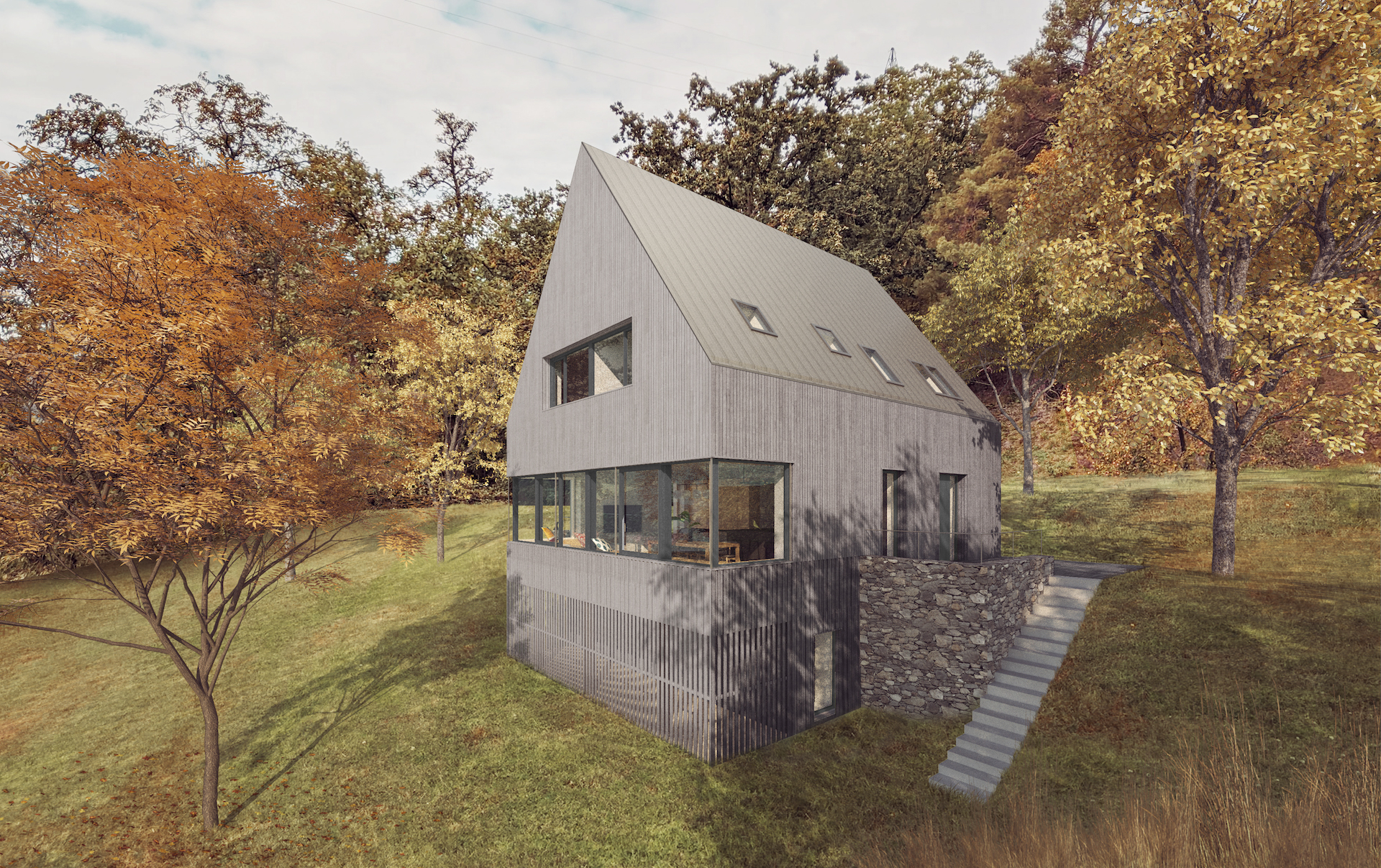 Na okraji posázavské vesnice navrhujeme rodinný dům ve svažitém terénu, kde dříve stával jednoduchý rekreační objekt. Jižní svah severně ohraničený jehličnatým lesem vybízí k umístění novostavby do horní části parcely. Tím se naskýtá krásný výhled do údolí Jevanského potoka tekoucího pod řešenou parcelou. Tento výhled definuje samotný koncept rodinného domu. Je s ním spojeno i výrazné panoramatické okno na jižní fasádě, které je ještě výraznější v obývacím pokoji. Díky tomuto oknu je možný rozhled do krajiny v rozsahu 180°.
