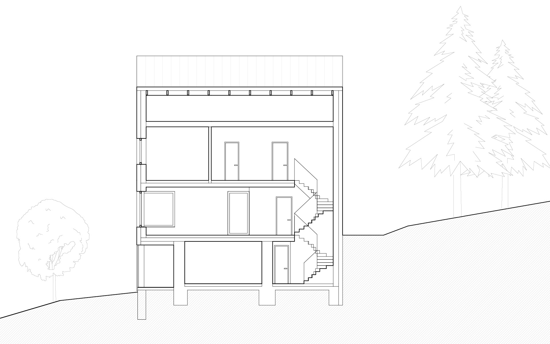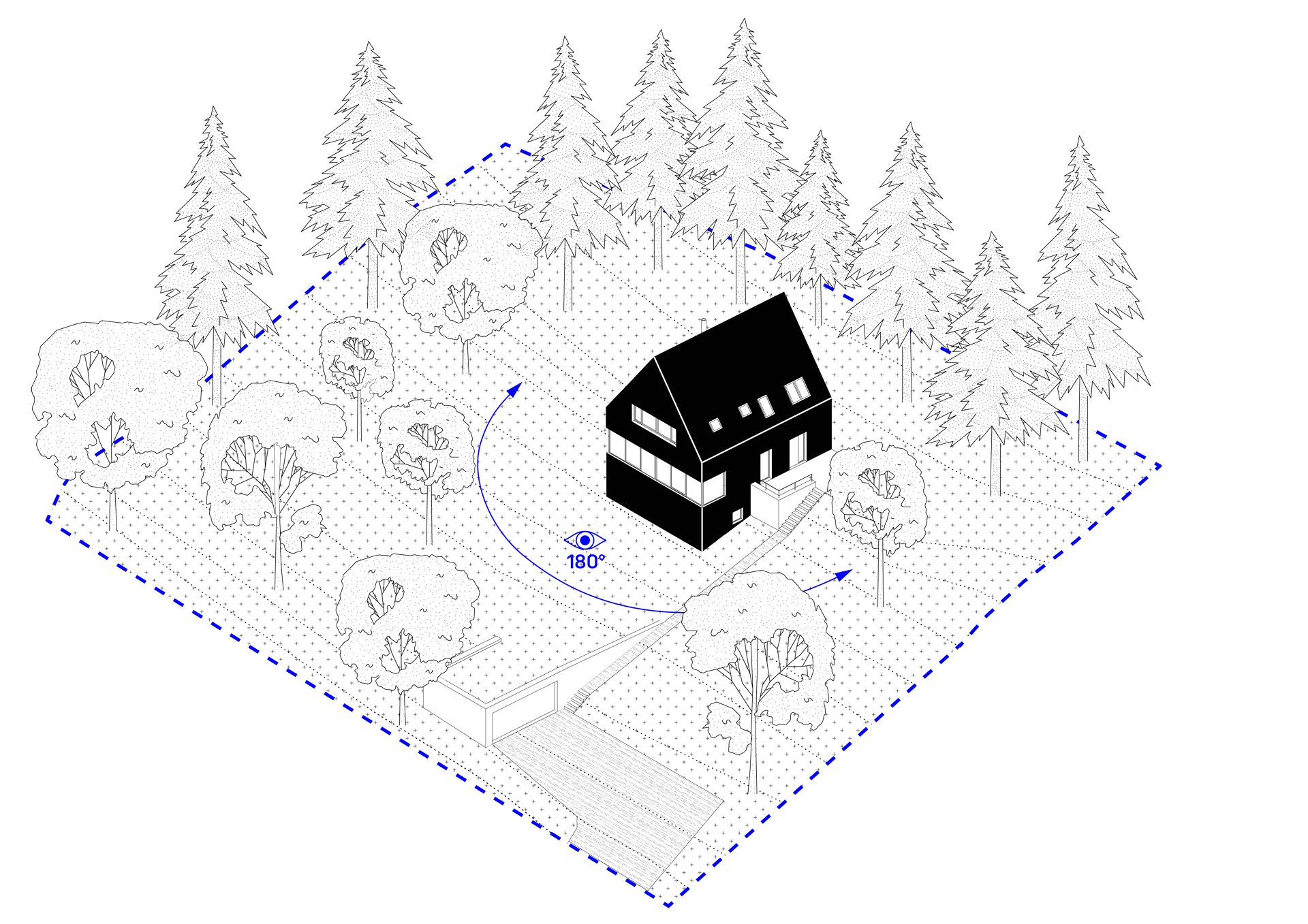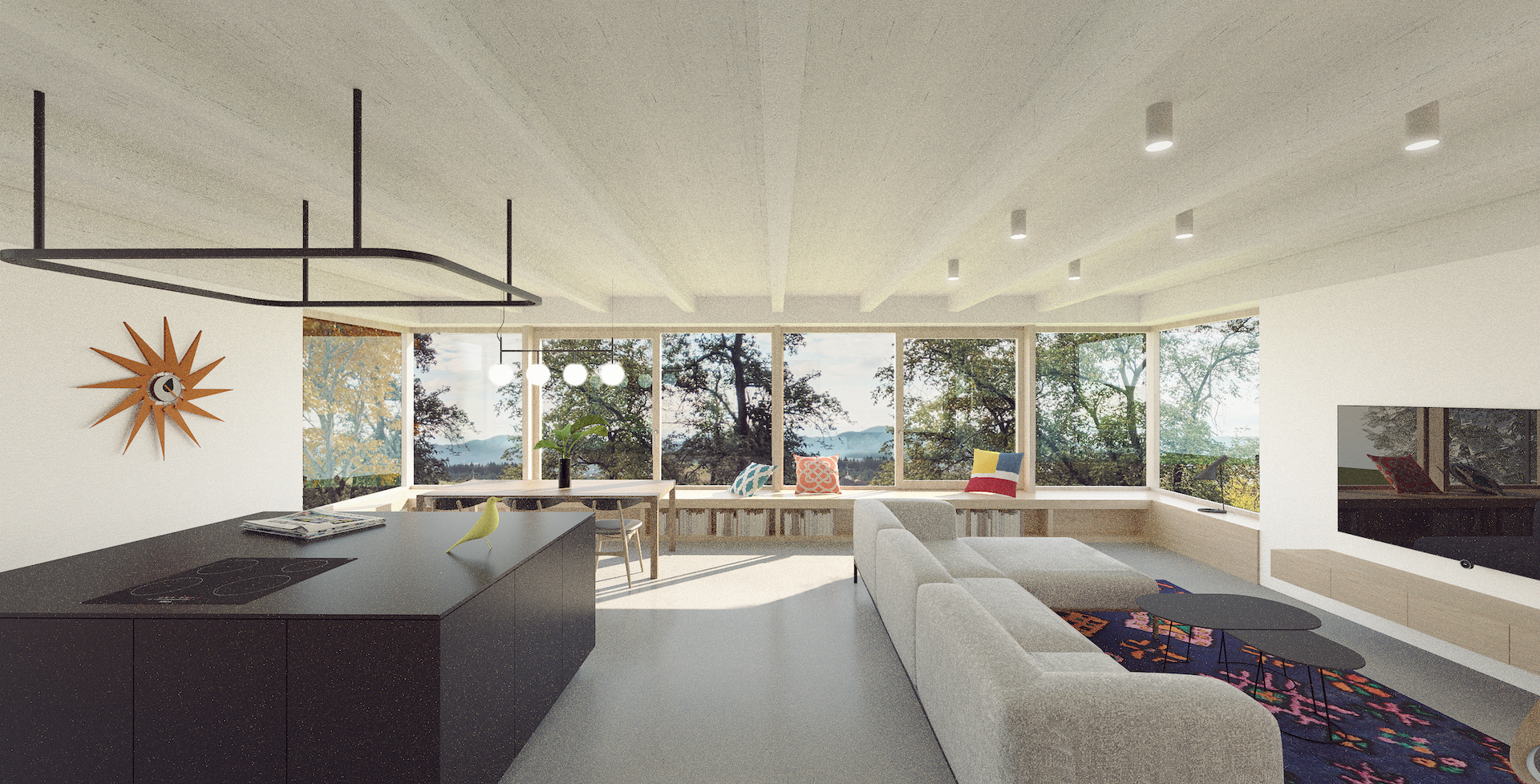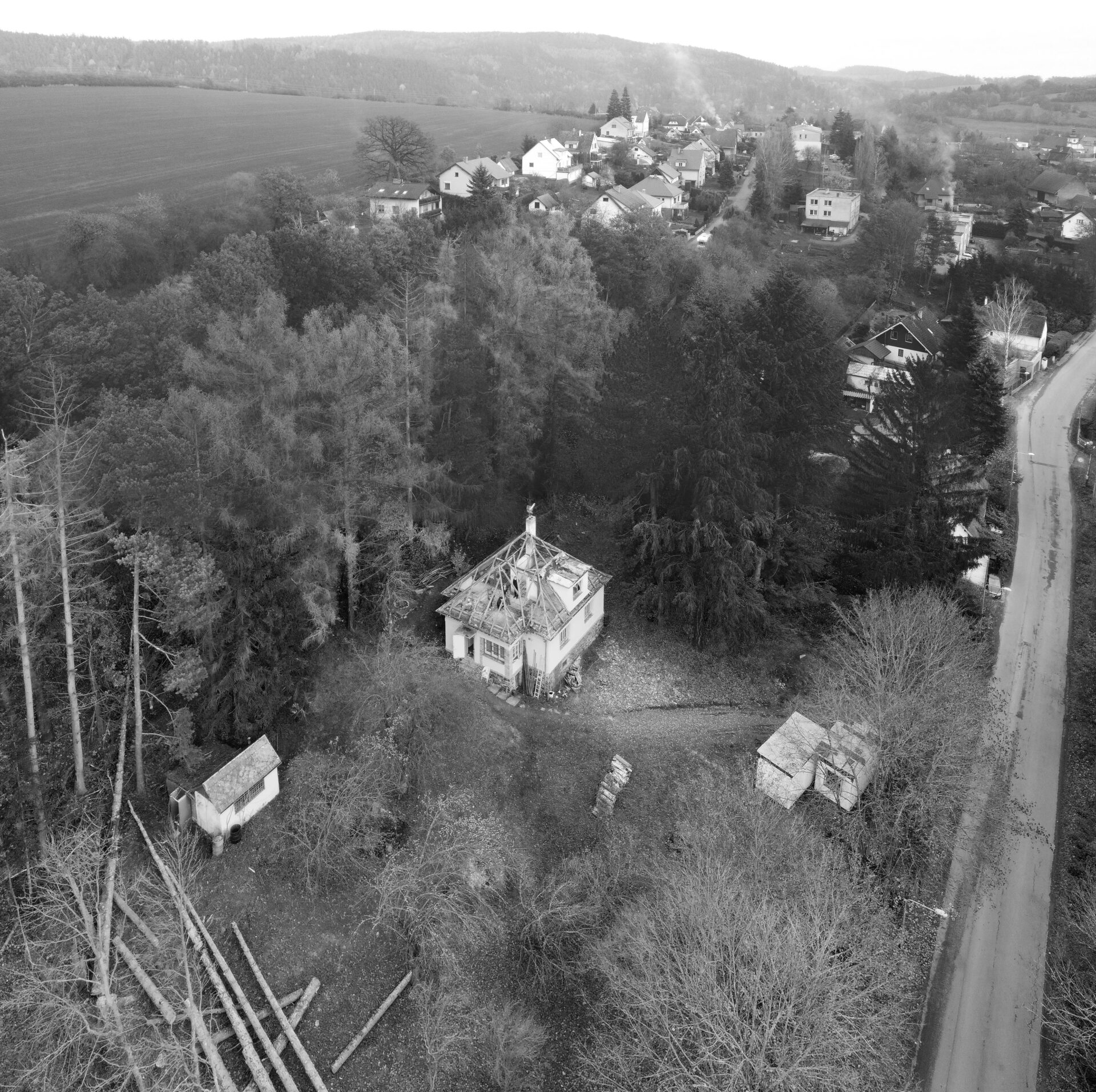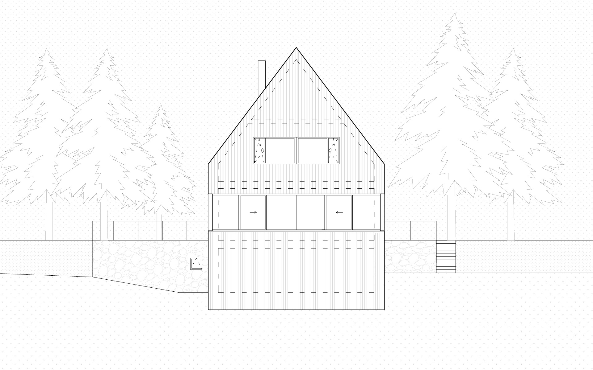 Na okraji posázavské vesnice navrhujeme rodinný dům ve svažitém terénu, kde dříve stával jednoduchý rekreační objekt. Jižní svah severně ohraničený jehličnatým lesem vybízí k umístění novostavby do horní části parcely. Tím se naskýtá krásný výhled do údolí Jevanského potoka tekoucího pod řešenou parcelou. Tento výhled definuje samotný koncept rodinného domu. Je s ním spojeno i výrazné panoramatické okno na jižní fasádě, které je ještě výraznější v obývacím pokoji. Díky tomuto oknu je možný rozhled do krajiny v rozsahu 180°.