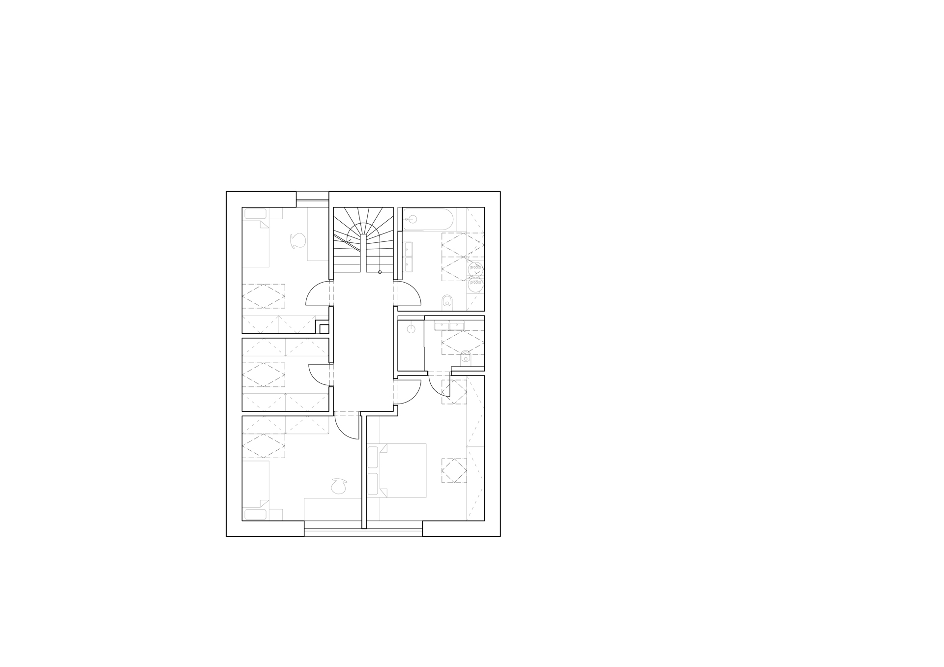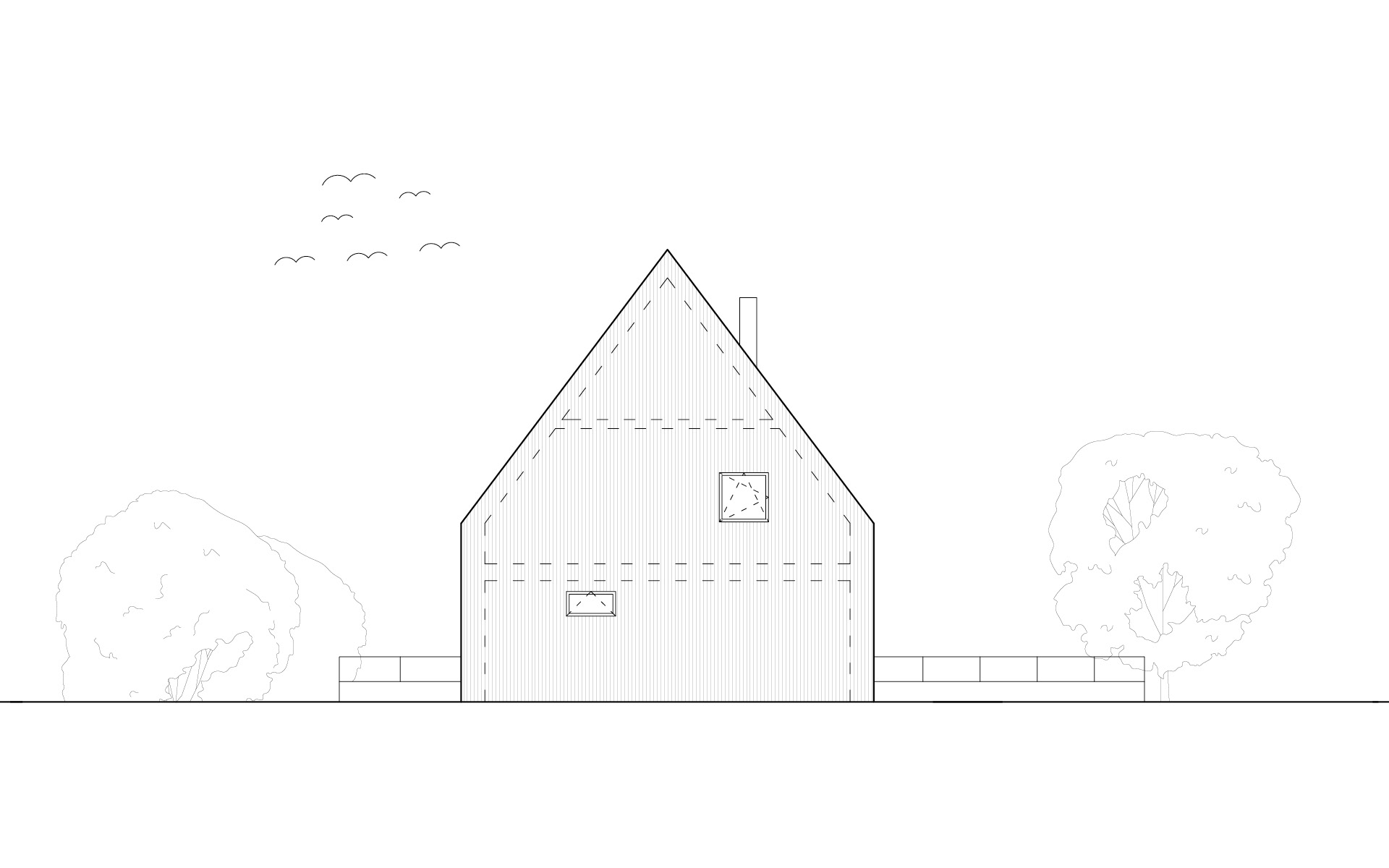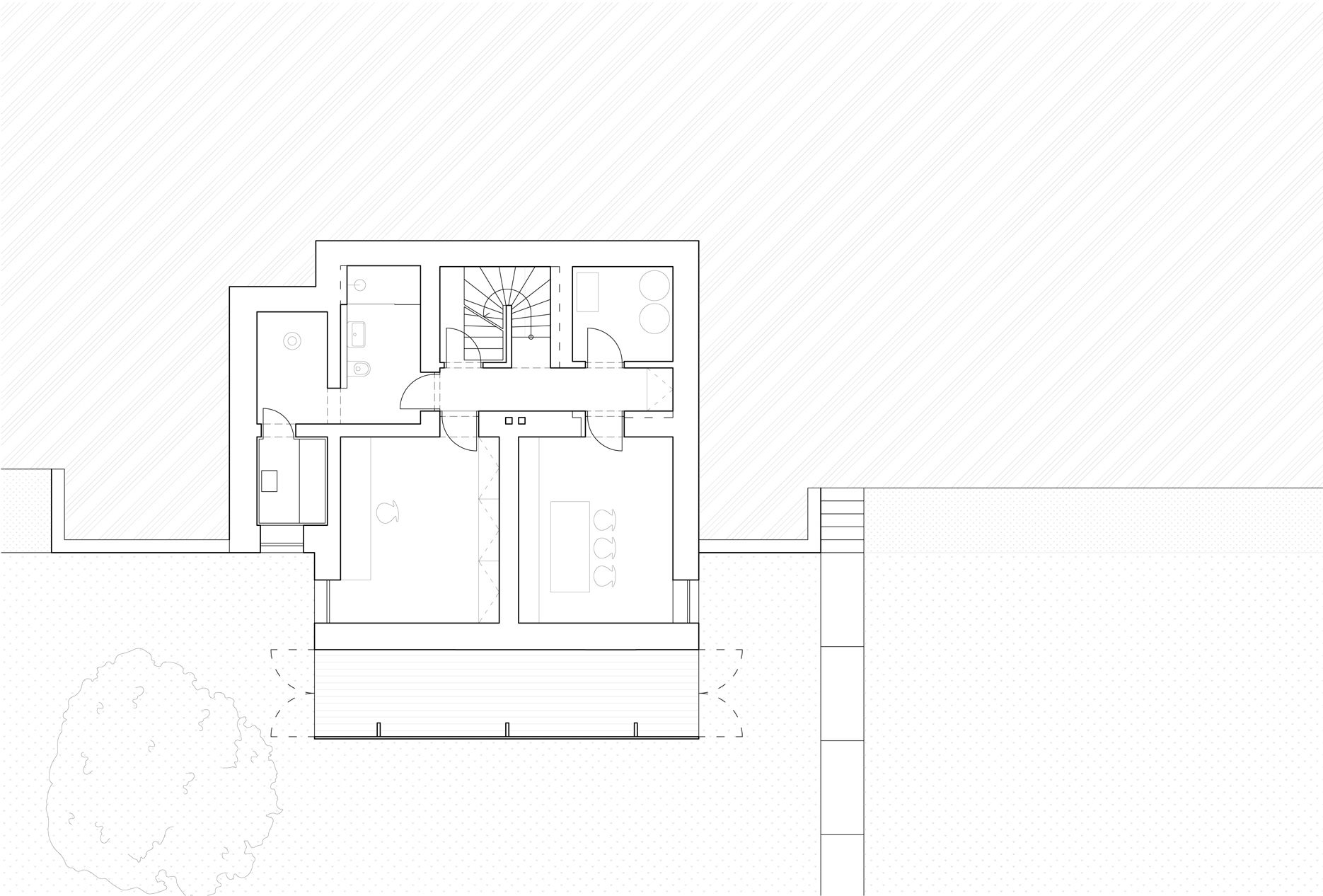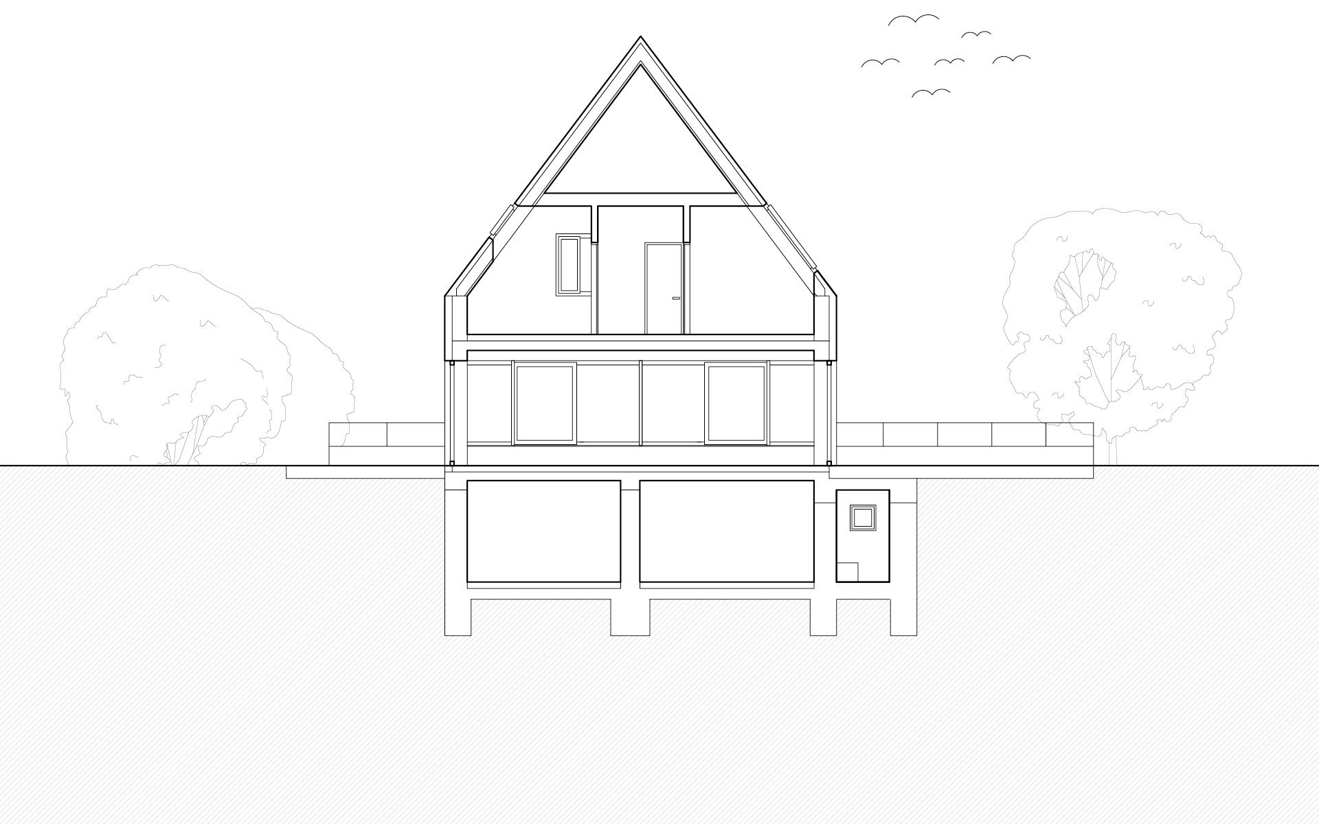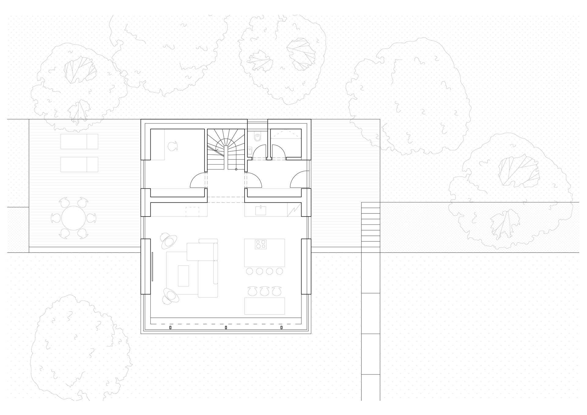 Dům využívá sklepu původního objektu, kam jsou soustředěny převážně obslužné místnosti se saunou a dílnou. Horní podlaží slouží k samotnému obývání rodinou a v plánu dispozice je patrná symetrie objektu propisující se do jednotlivých fasád. V horních podlažích se nachází prostorný obývací pokoj s kuchyňskou linkou, pracovnou a dále dvojice dětských pokojů a ložnicí v podkroví.