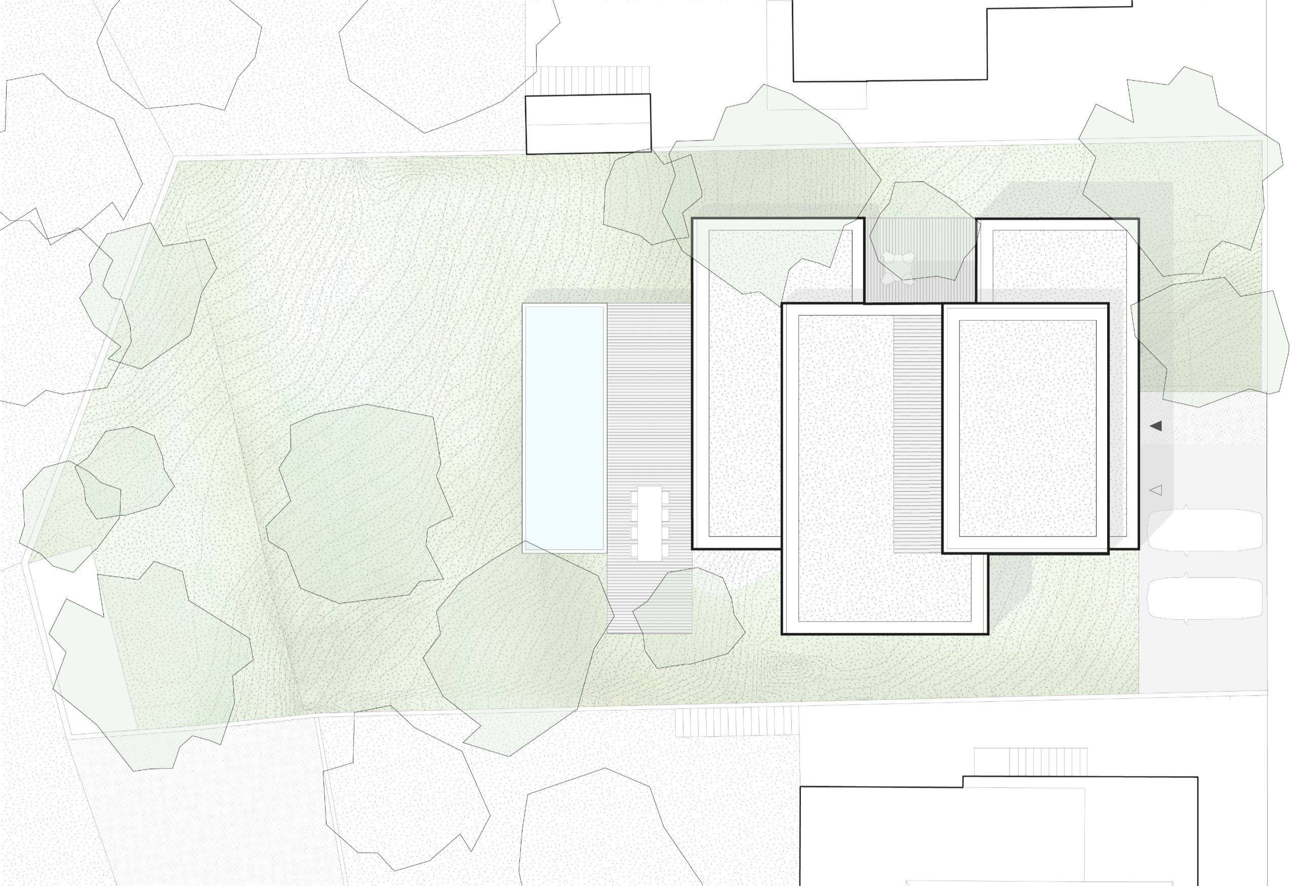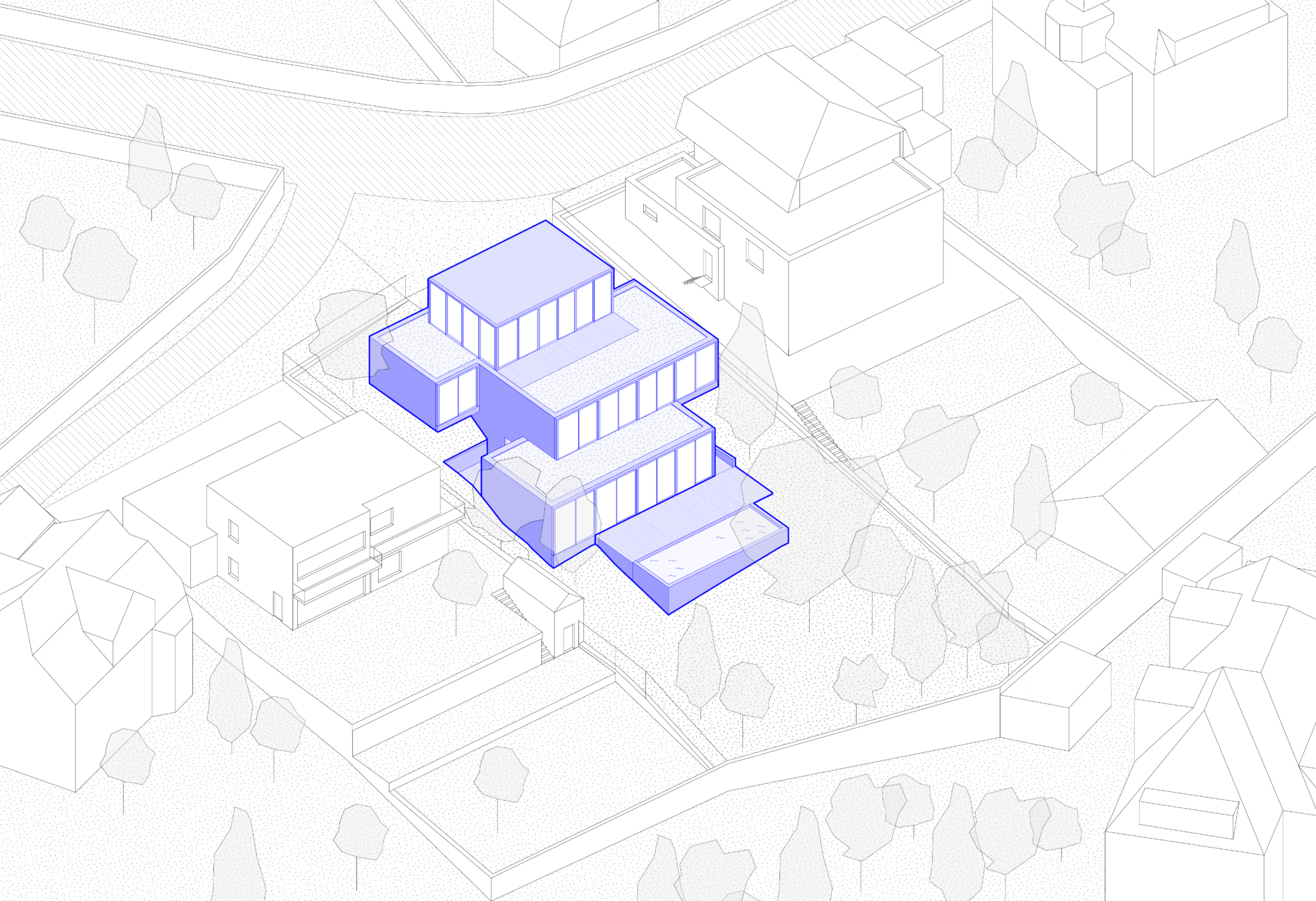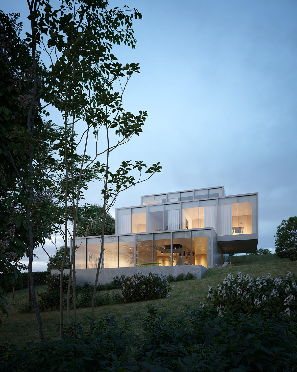 Dům je komponován z několika objemů, které v reakci na klesání terénu sestupují směrem do zahrady. Výsledkem této fragmentace je zjemnění měřítka a maximalizace atraktivních výhledů pro všechny obytné místnosti. Materiálové řešení je klidnou kombinací dominujících prosklených ploch v subtilních hliníkových profilech doplněných kontrastním pohledovým betonem, který plynule přechází do interiéru.