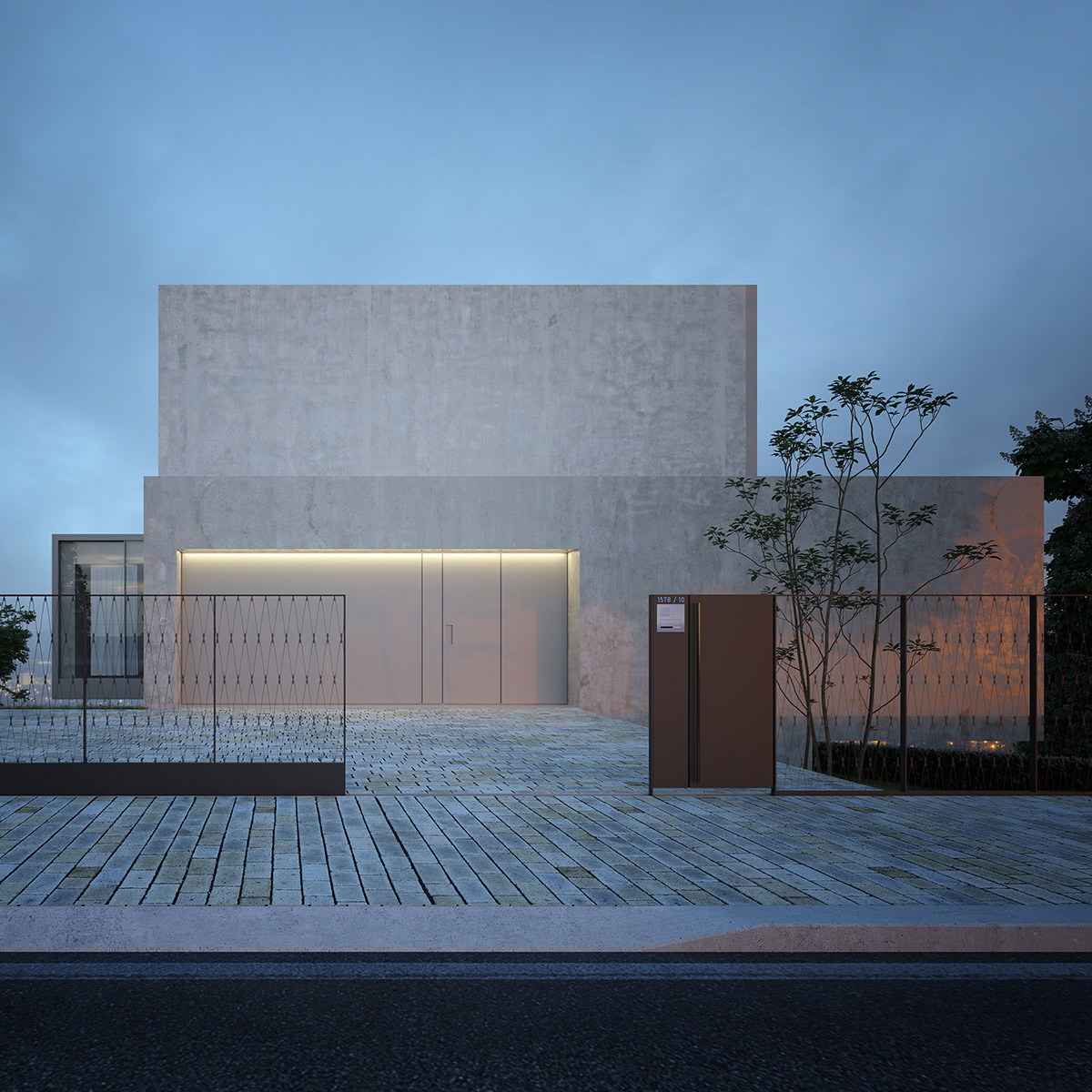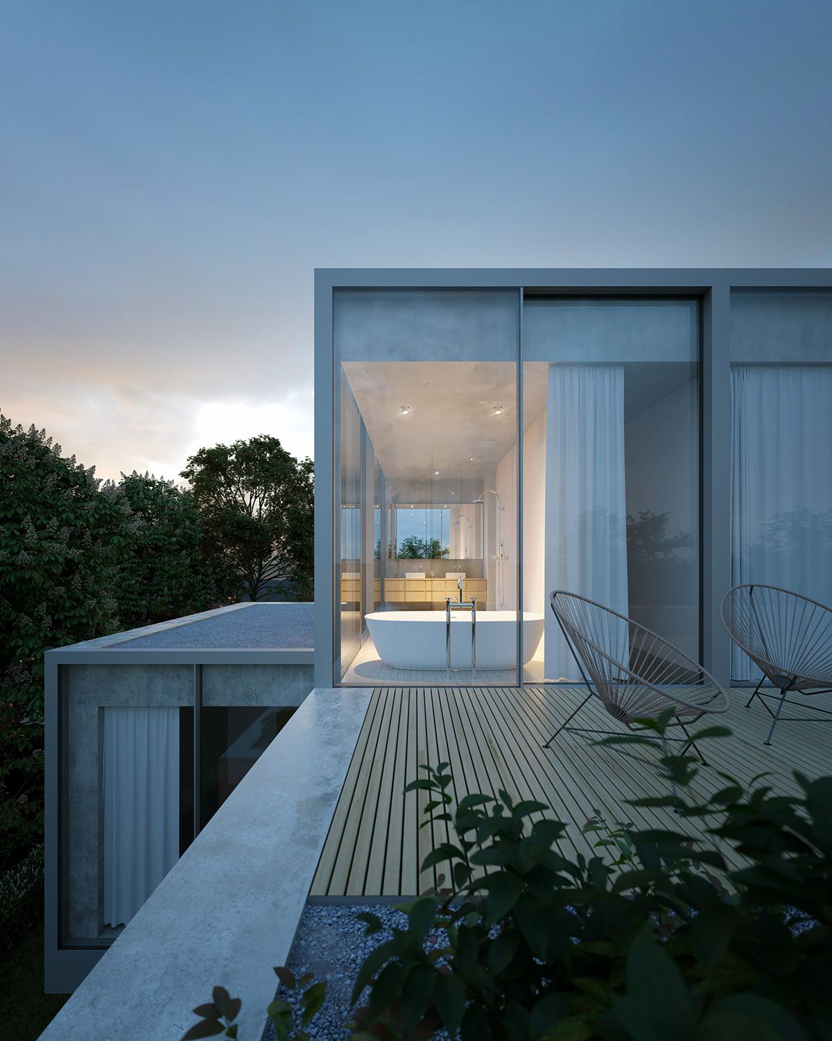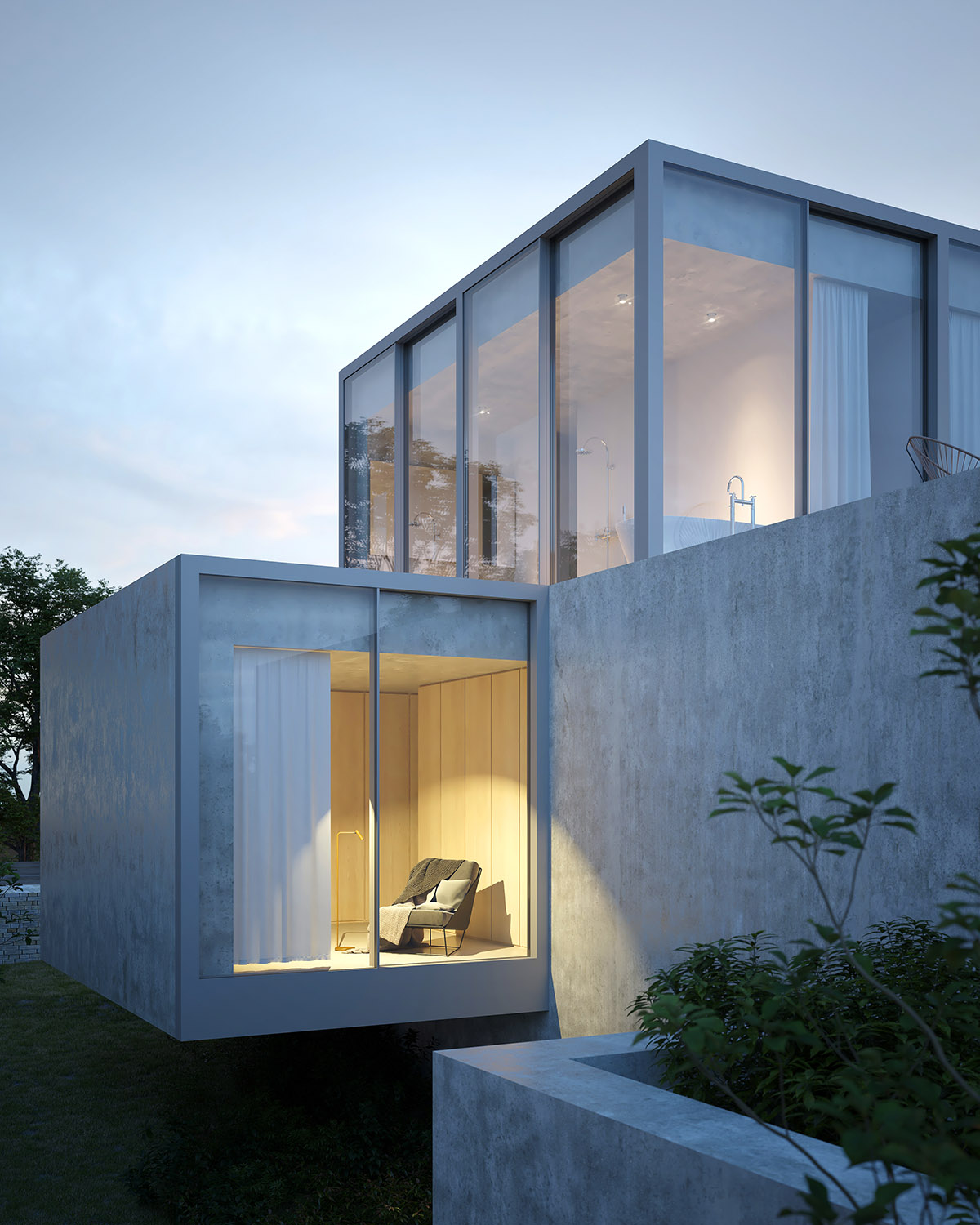 Dům je komponován z několika objemů, které v reakci na klesání terénu sestupují směrem do zahrady. Výsledkem této fragmentace je zjemnění měřítka a maximalizace atraktivních výhledů pro všechny obytné místnosti. Materiálové řešení je klidnou kombinací dominujících prosklených ploch v subtilních hliníkových profilech doplněných kontrastním pohledovým betonem, který plynule přechází do interiéru.