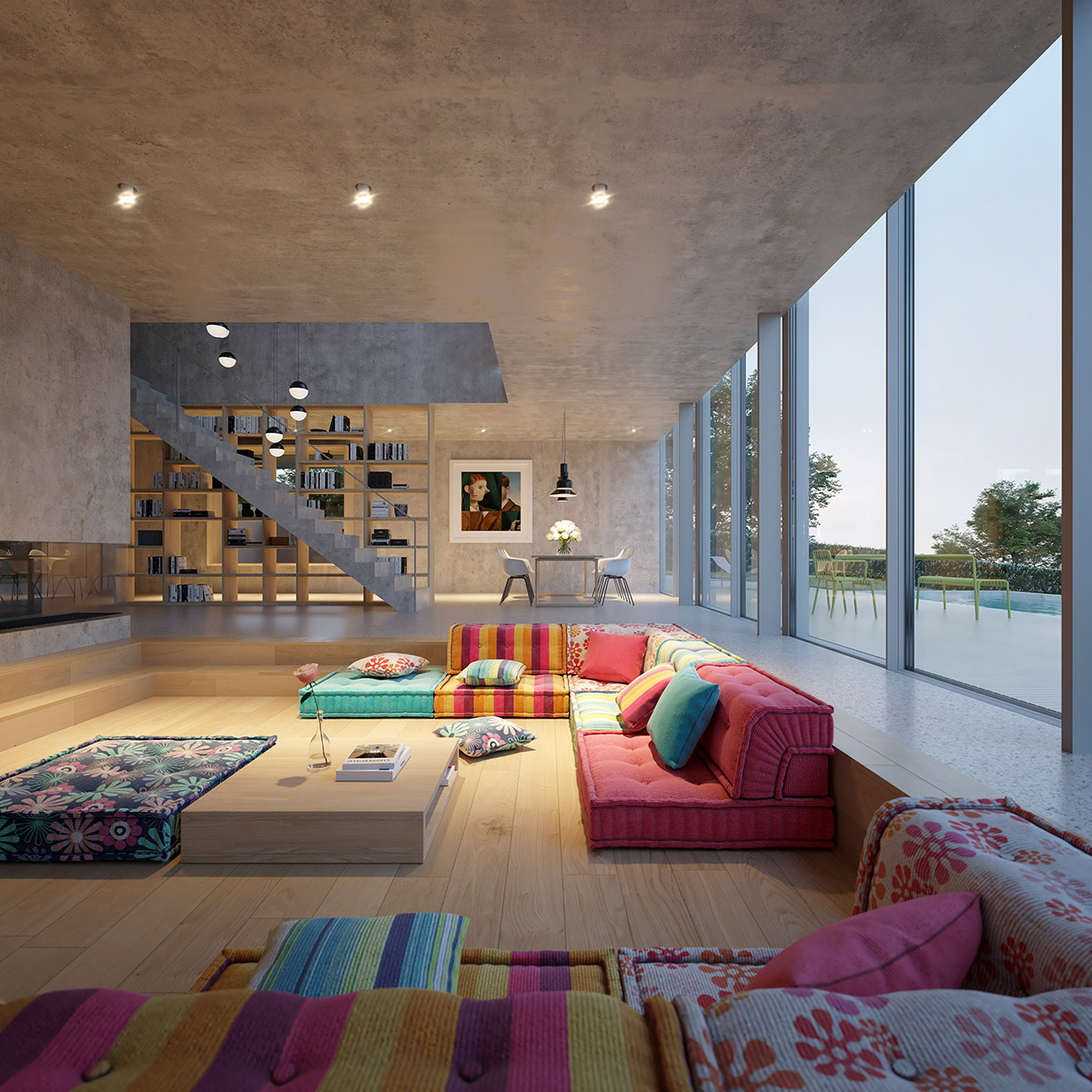 Provozně je dům dělen po patrech od master suite v nejvyšším patře přes vstup a noční část až po velkorysé obytné patro navazující na zahradu s venkovním bazénem. Obývací místnosti dominuje zapuštěná chill zóna navržená na míru klienty vysněné sedací soupravě Ham Jong od japonského návrháře Kenzo Takady.