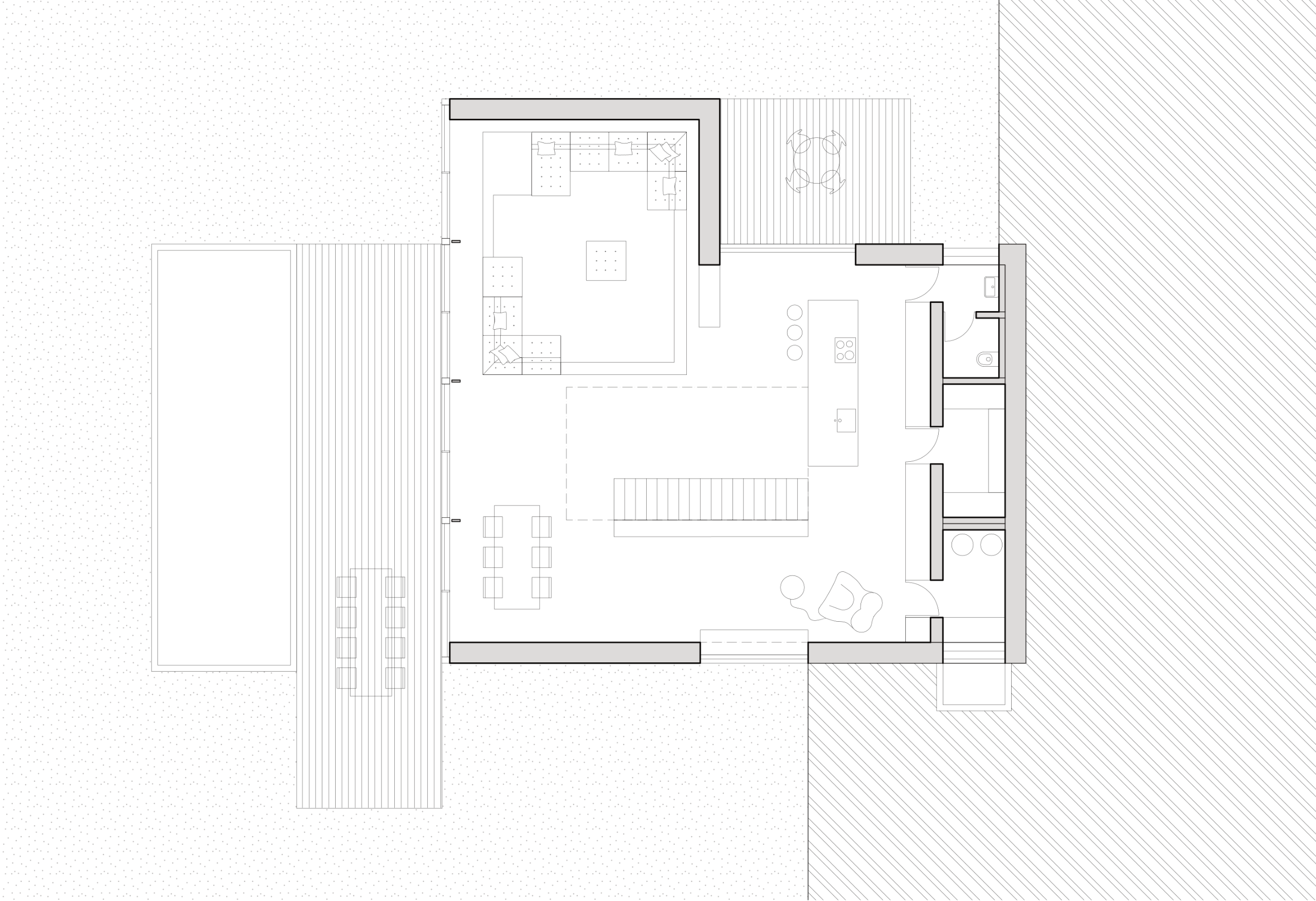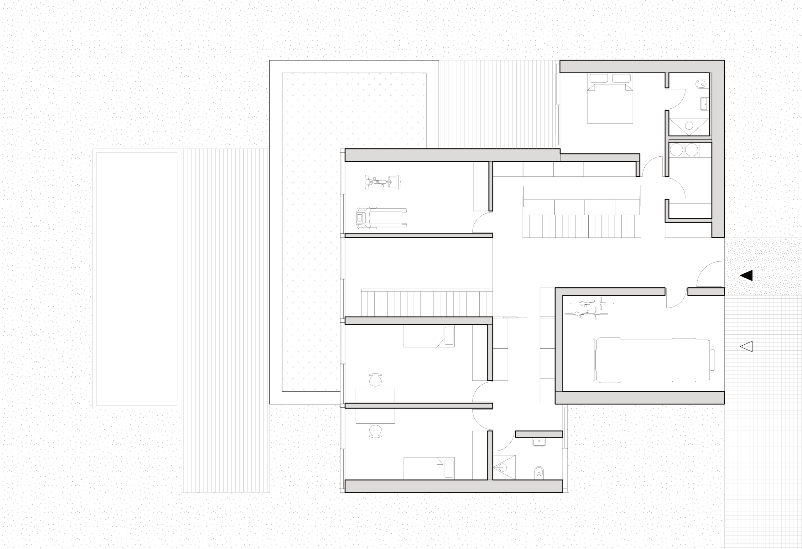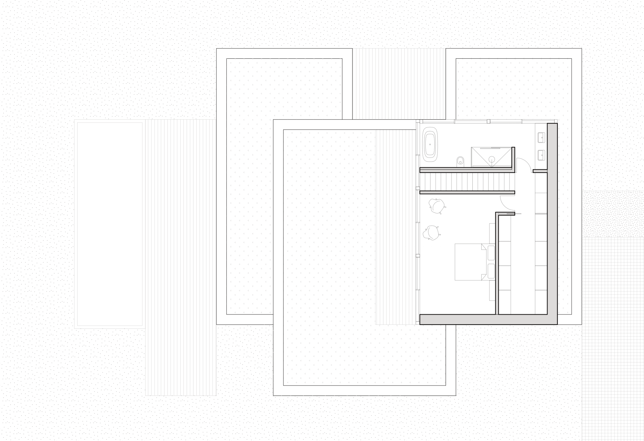 Provozně je dům dělen po patrech od master suite v nejvyšším patře přes vstup a noční část až po velkorysé obytné patro navazující na zahradu s venkovním bazénem. Obývací místnosti dominuje zapuštěná chill zóna navržená na míru klienty vysněné sedací soupravě Ham Jong od japonského návrháře Kenzo Takady.