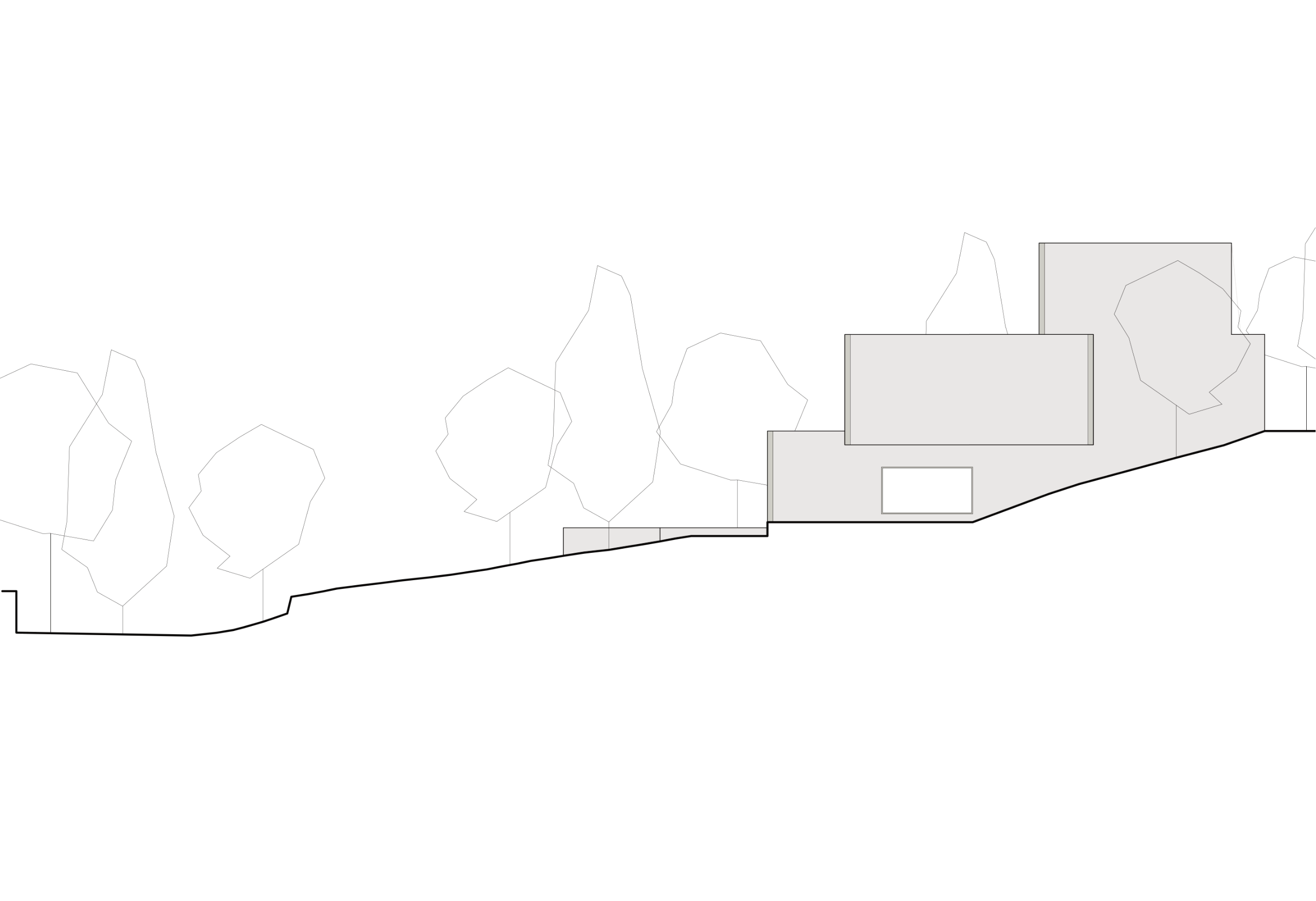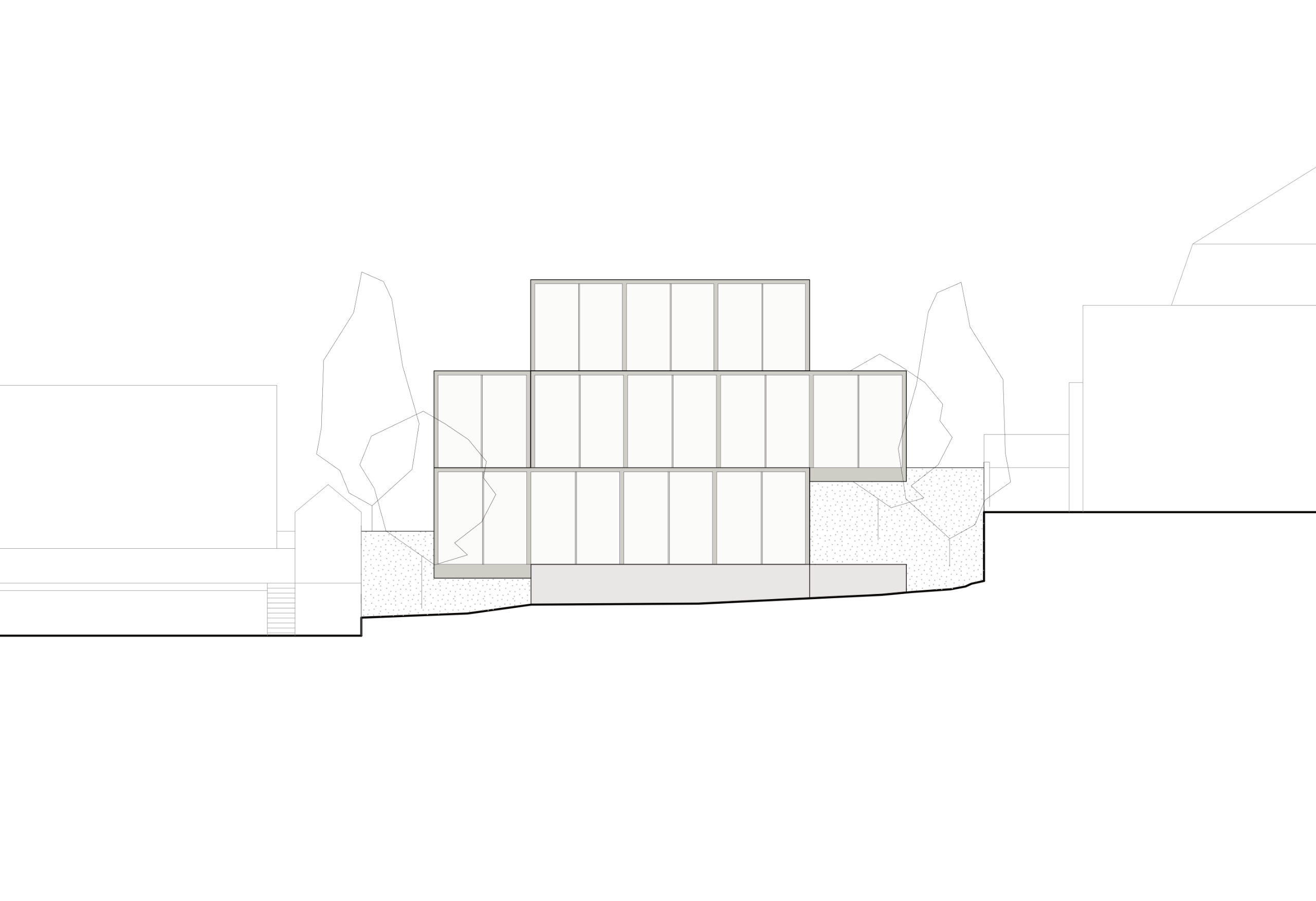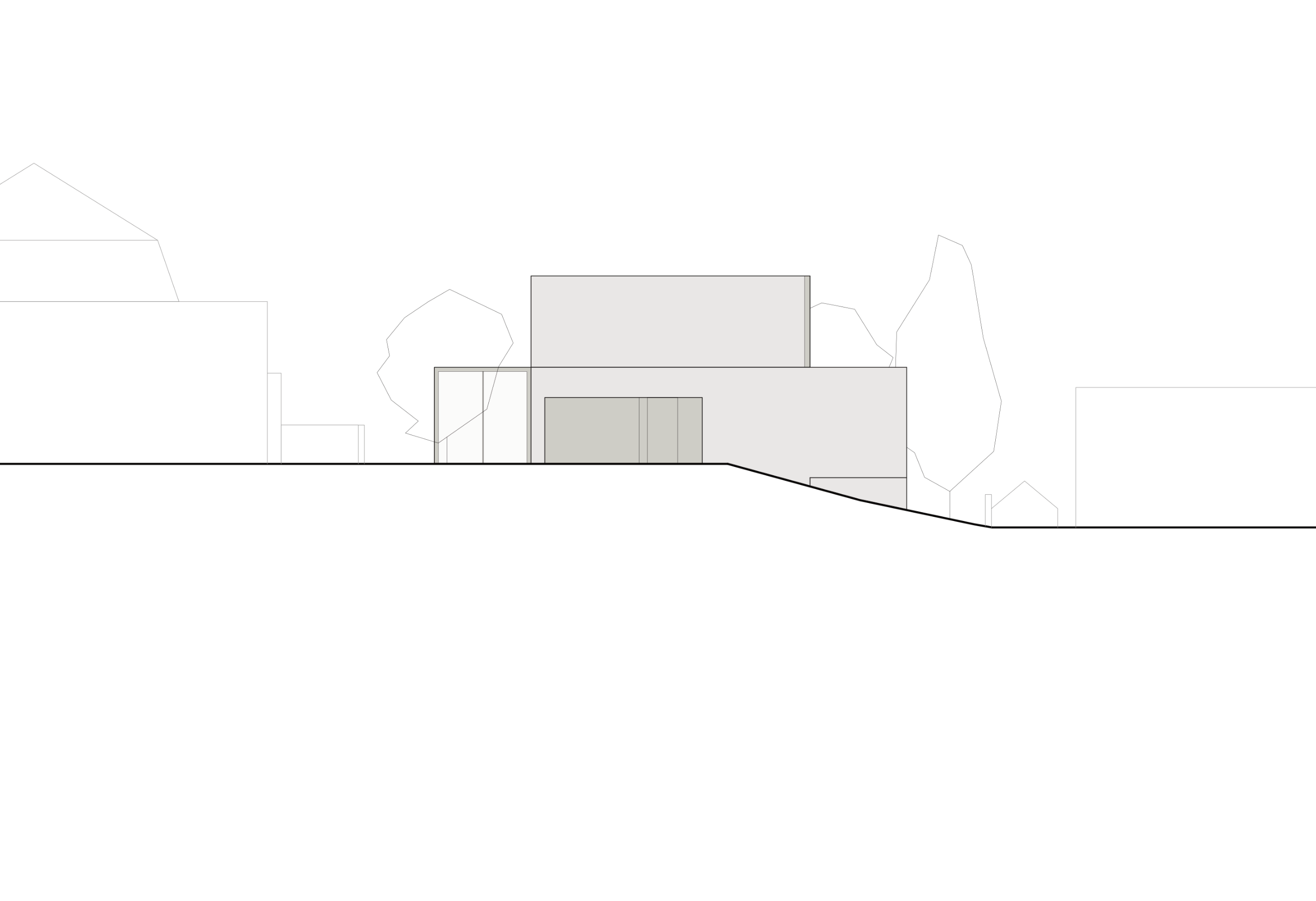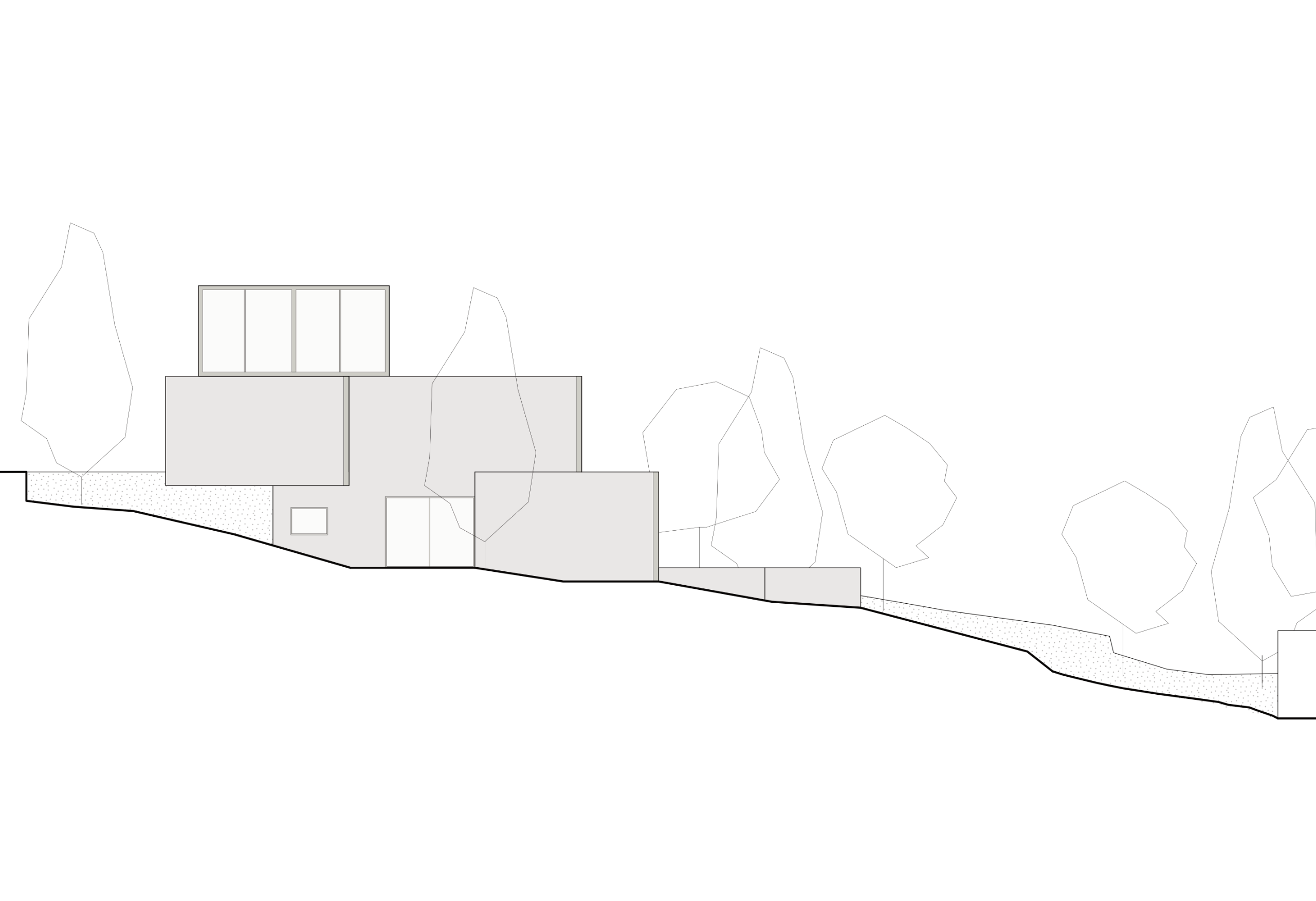 Dům je komponován z několika objemů, které v reakci na klesání terénu sestupují směrem do zahrady. Výsledkem této fragmentace je zjemnění měřítka a maximalizace atraktivních výhledů pro všechny obytné místnosti. Materiálové řešení je klidnou kombinací dominujících prosklených ploch v subtilních hliníkových profilech doplněných kontrastním pohledovým betonem, který plynule přechází do interiéru.