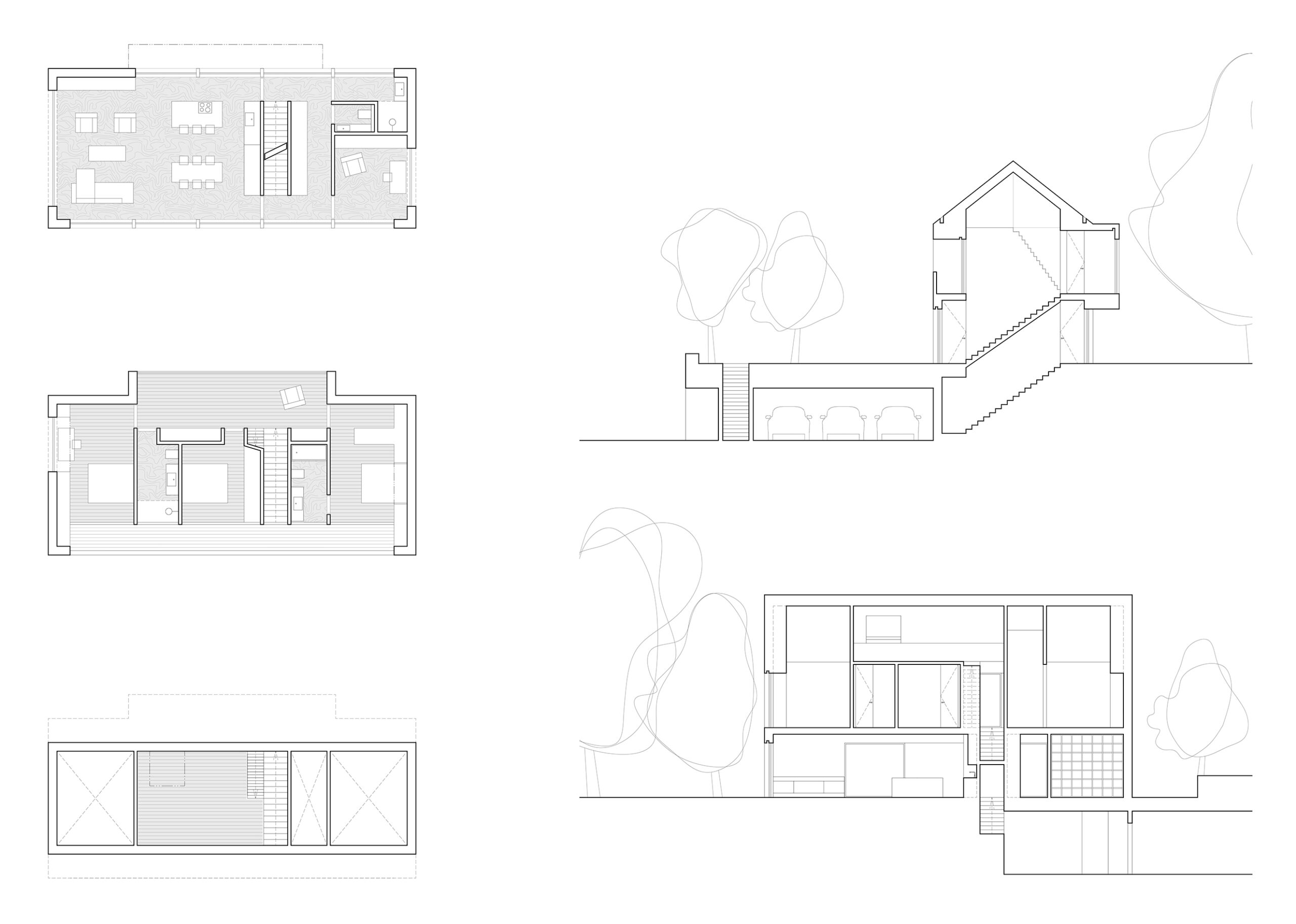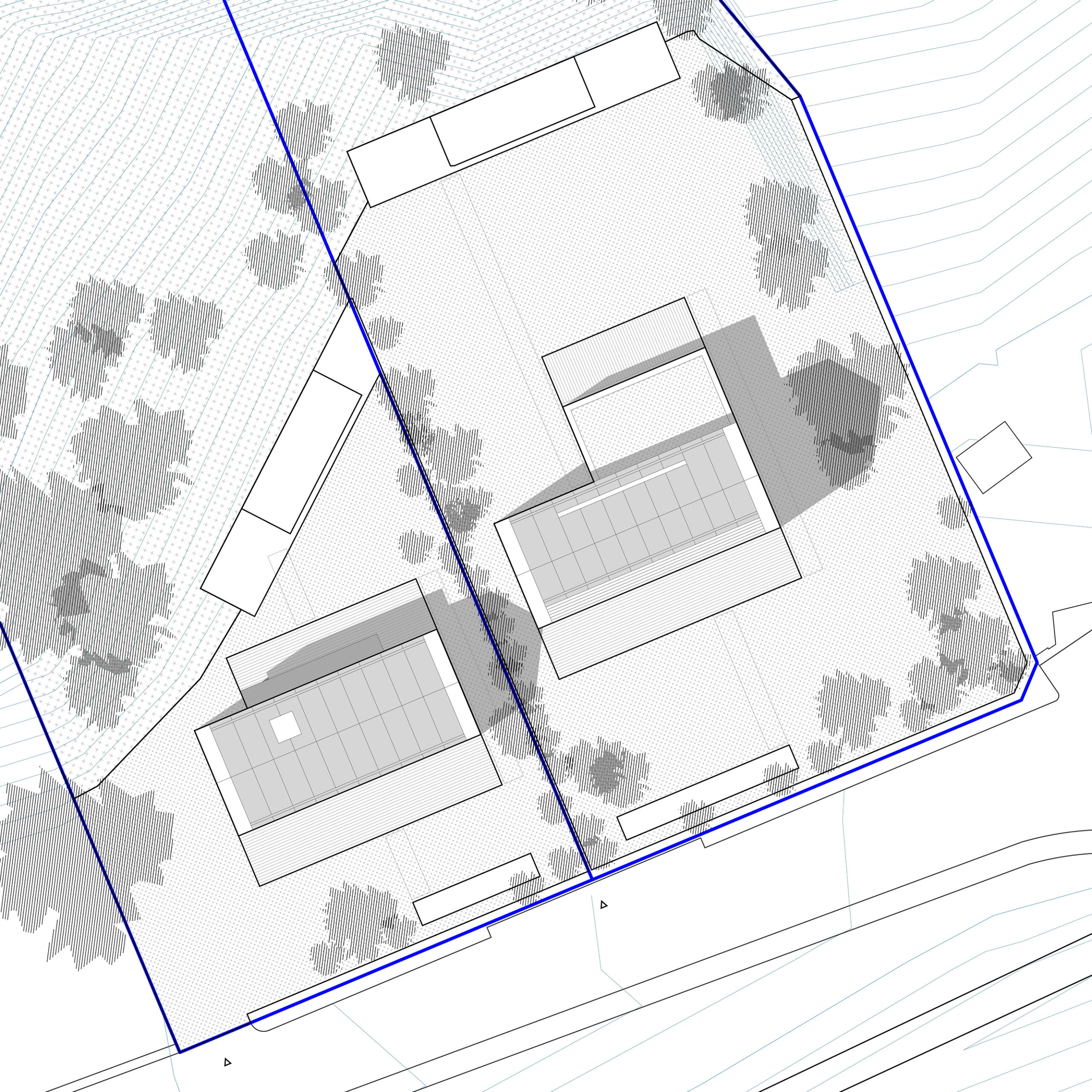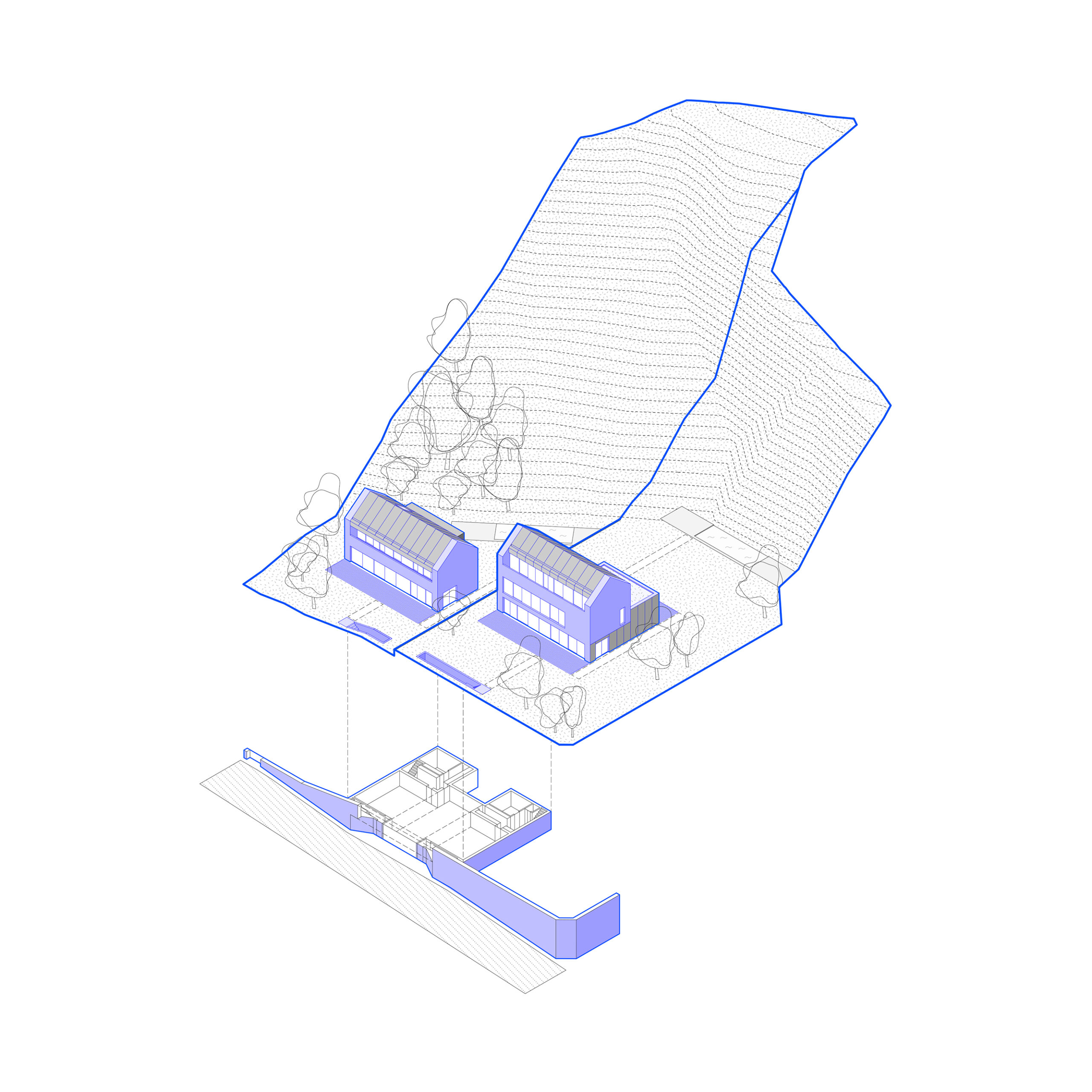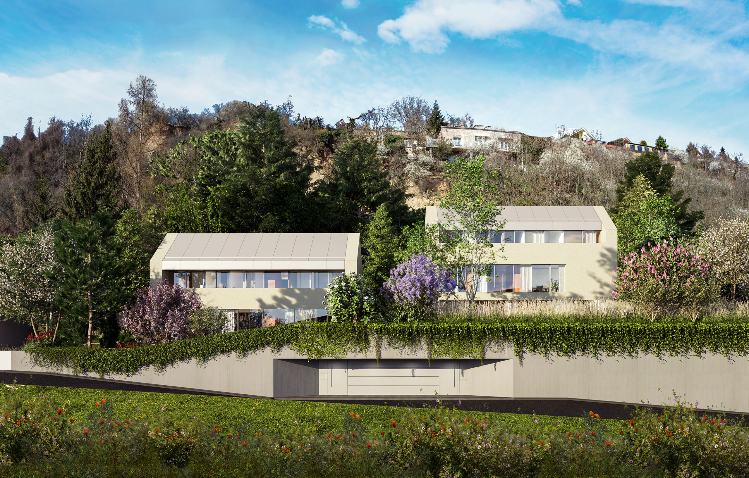 Vily navrhujeme jako soubor dvou samostatně fungujících objektů, které hovoří stejným architektonickým jazykem a působí jako jeden celek. Jediným částečně společným provozním prvkem je suterén, jehož součástí jsou technická zázemí objektů a garáže s jedním vjezdem z lysolajské dopravní komunikace. Za vjezdem do garáže se nachází společný komunikační prostor, z něhož se pak dostáváme do samostatných parkovacích kójí a suterénů jednotlivých vil. Vstup z ulice přímo do zahrad je možný po schodech před vjezdem do garáží.