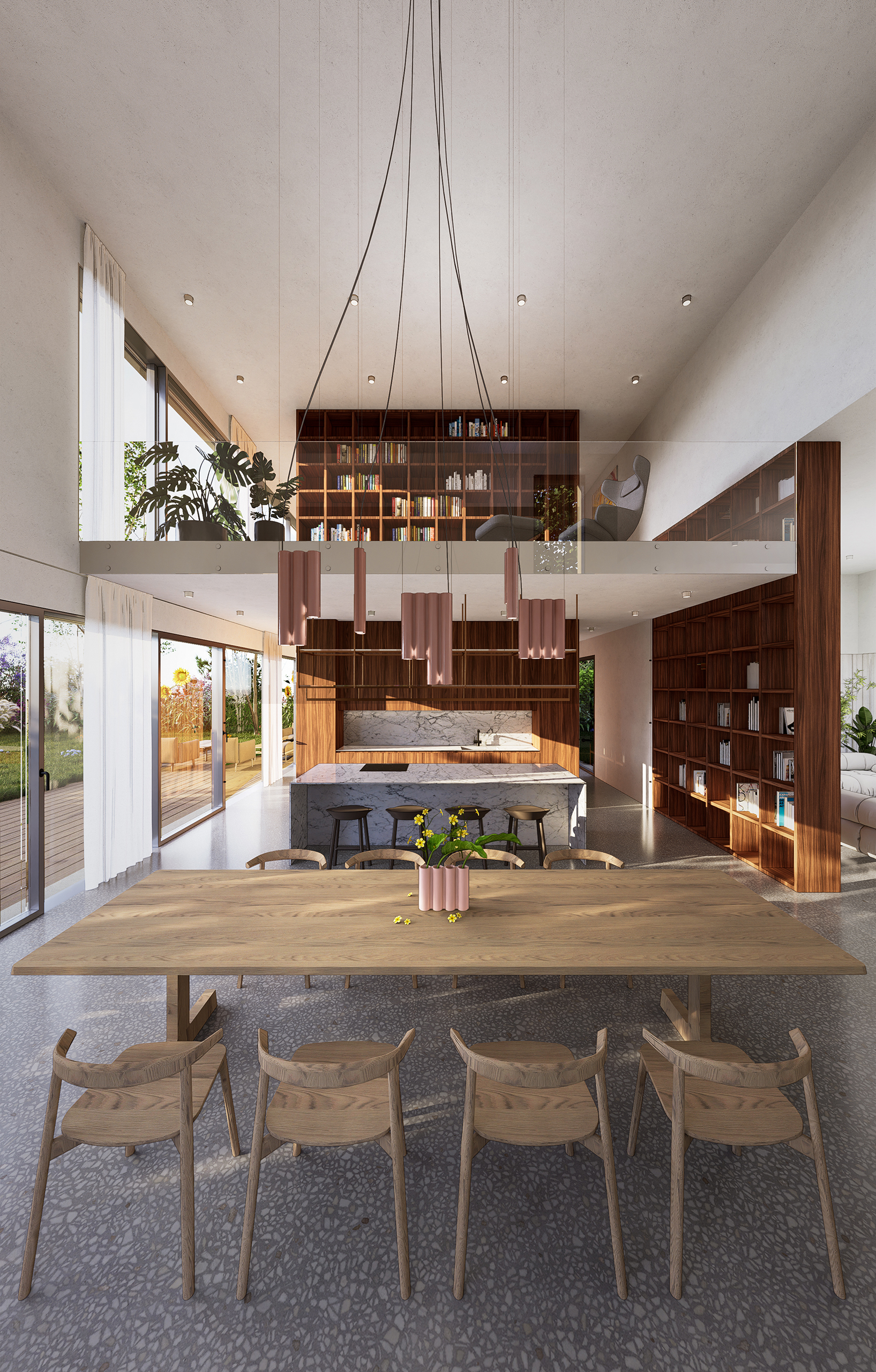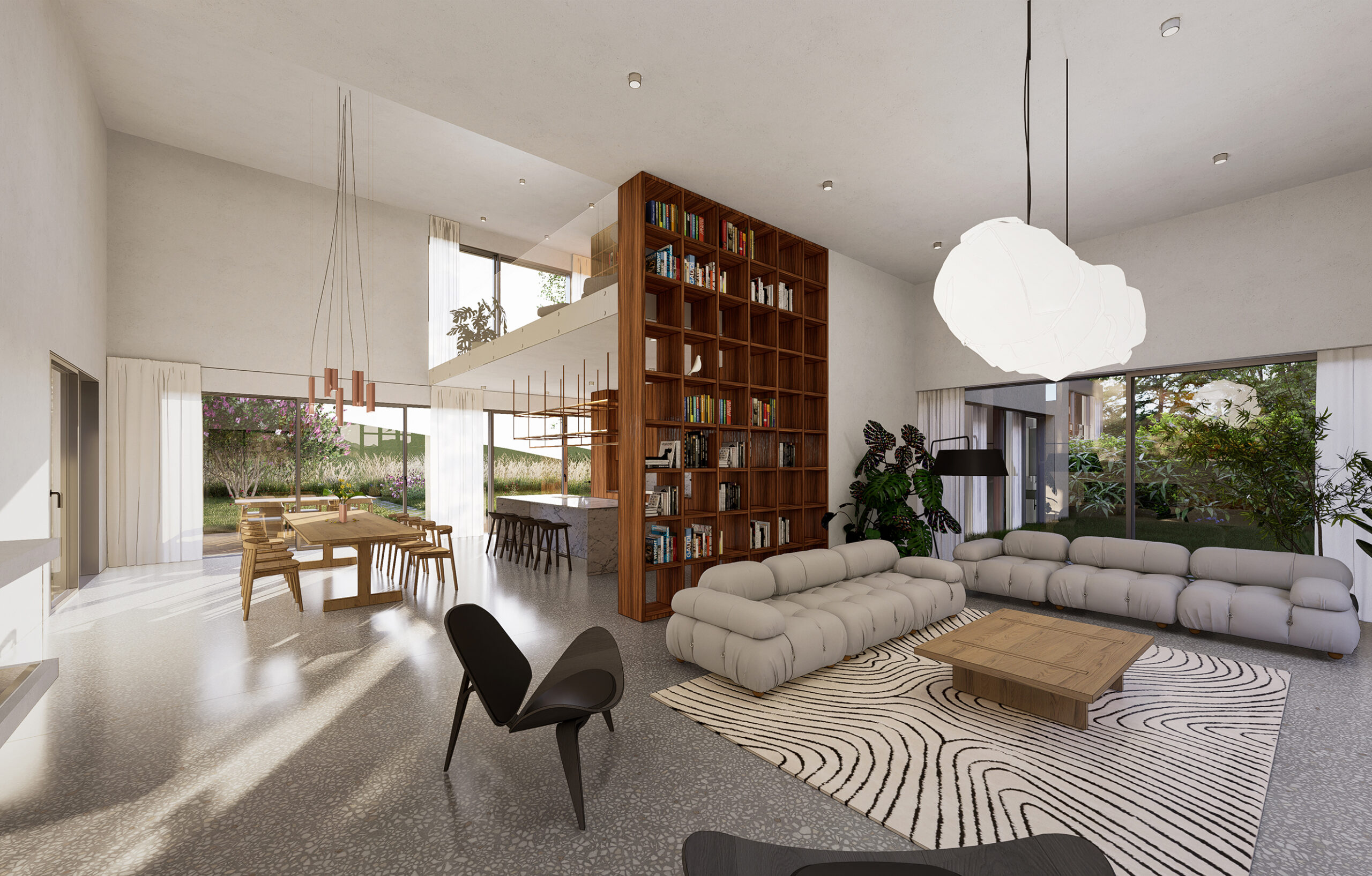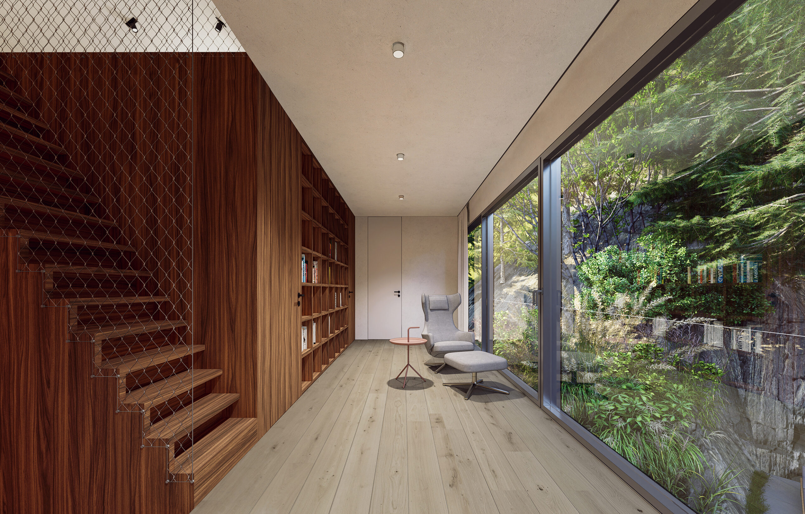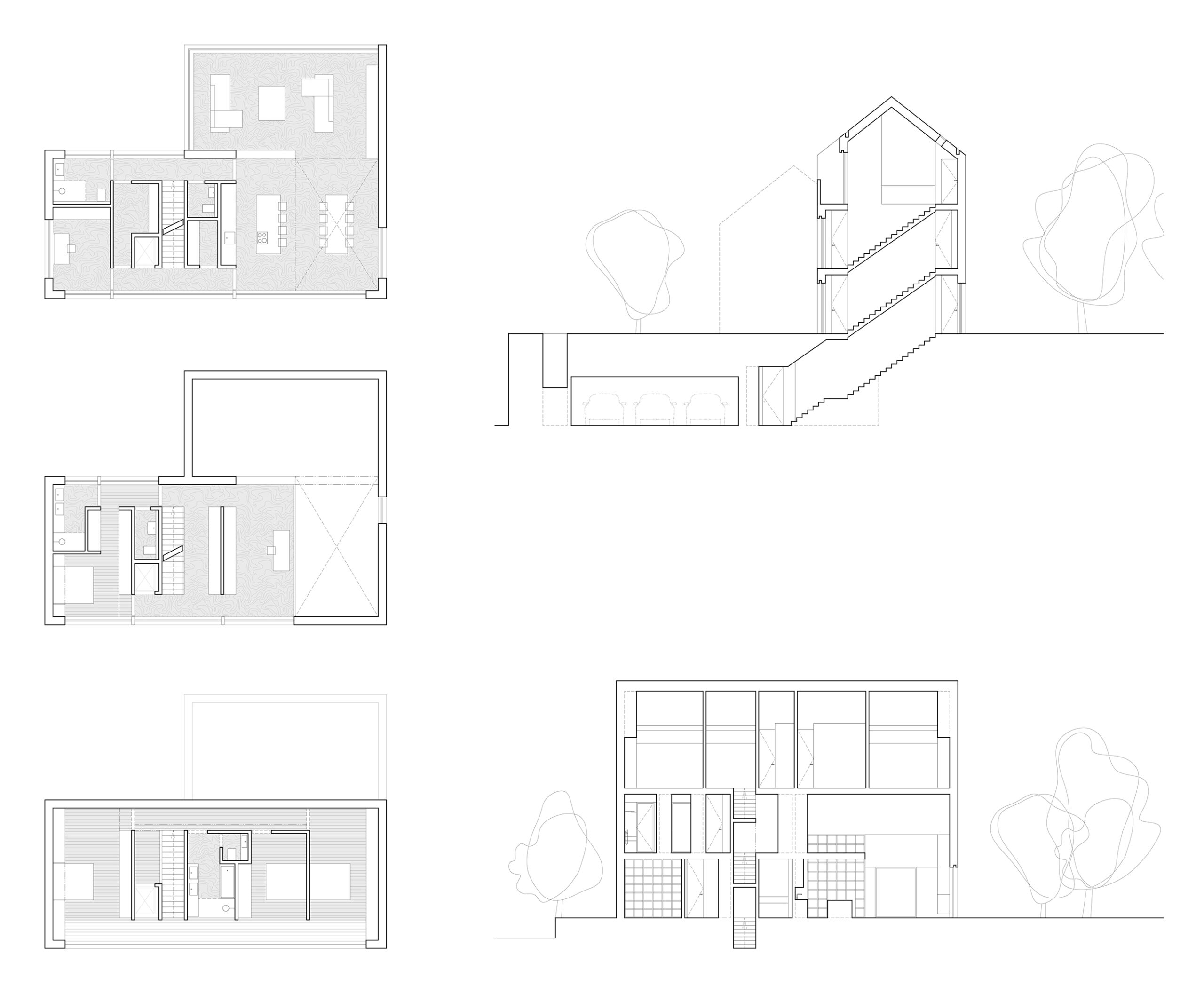 Vily navrhujeme jako soubor dvou samostatně fungujících objektů, které hovoří stejným architektonickým jazykem a působí jako jeden celek. Jediným částečně společným provozním prvkem je suterén, jehož součástí jsou technická zázemí objektů a garáže s jedním vjezdem z lysolajské dopravní komunikace. Za vjezdem do garáže se nachází společný komunikační prostor, z něhož se pak dostáváme do samostatných parkovacích kójí a suterénů jednotlivých vil. Vstup z ulice přímo do zahrad je možný po schodech před vjezdem do garáží.