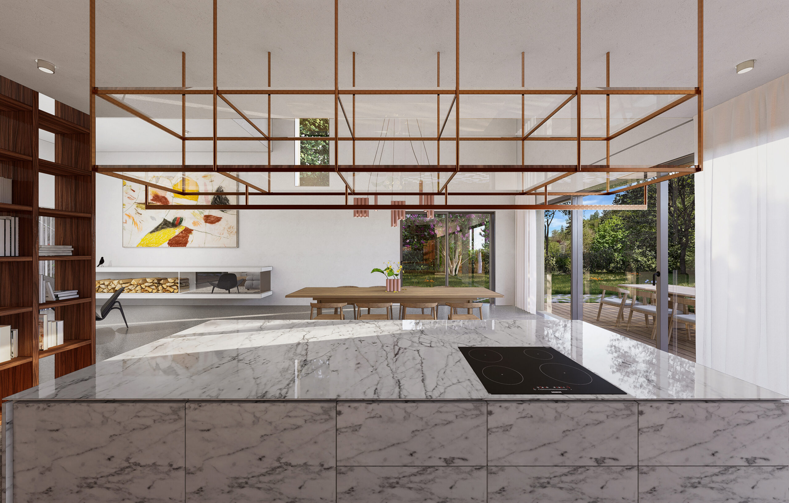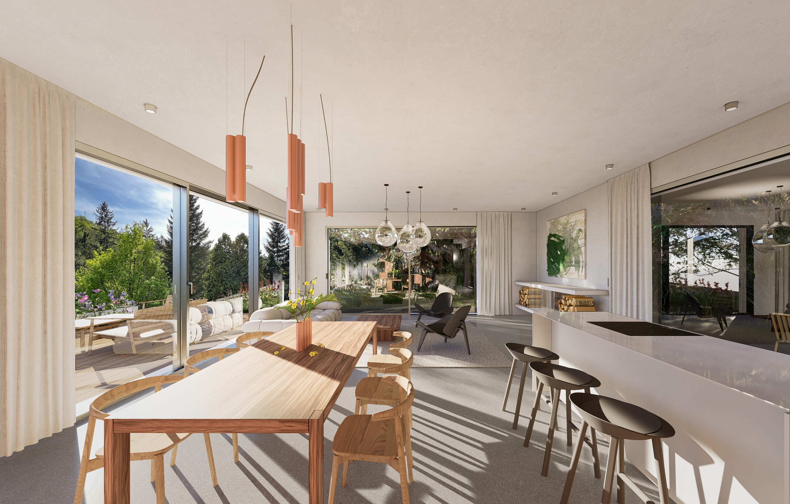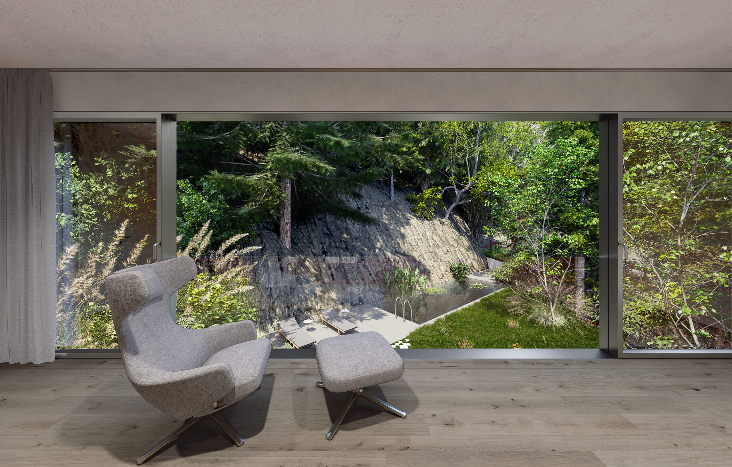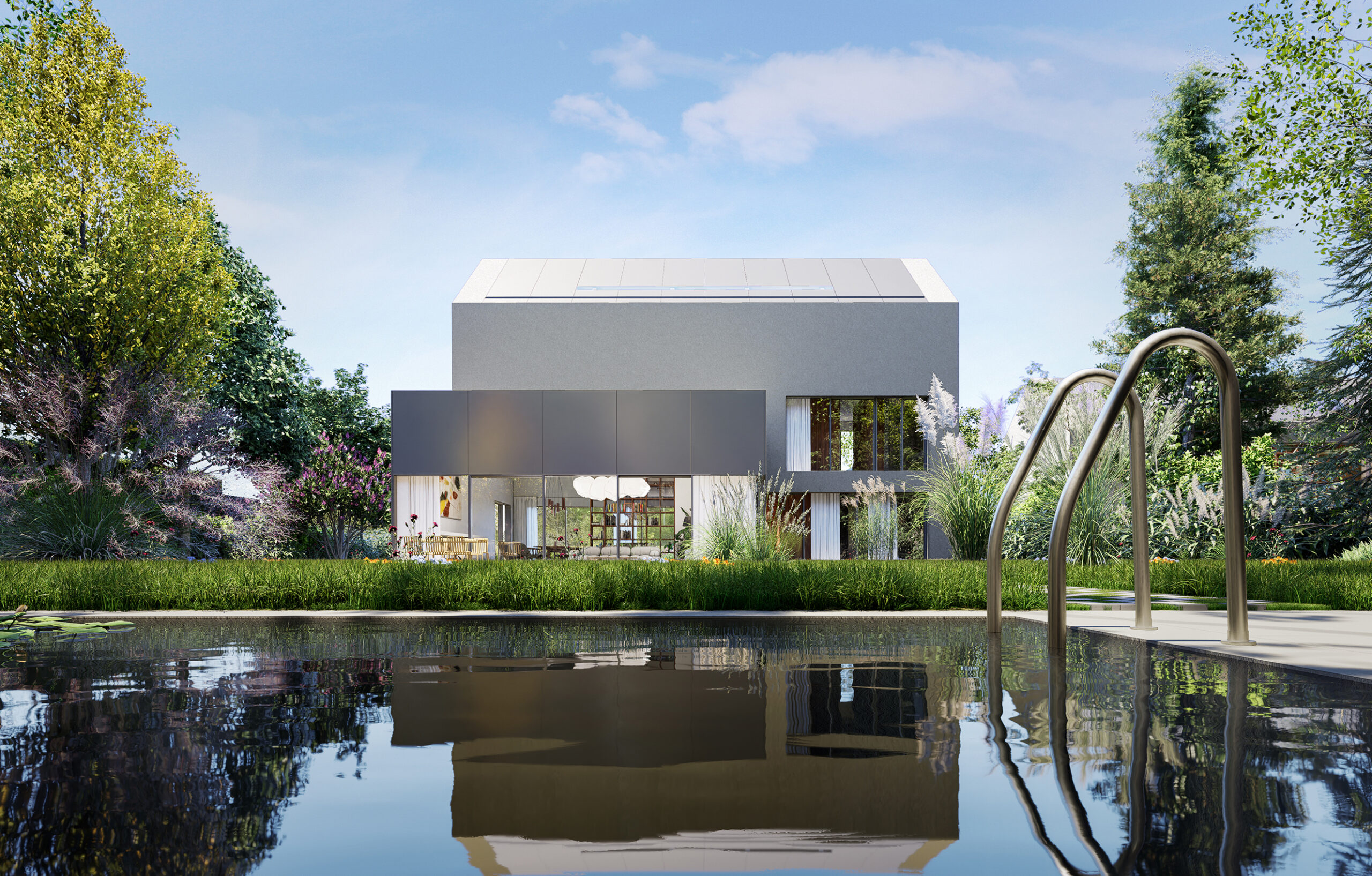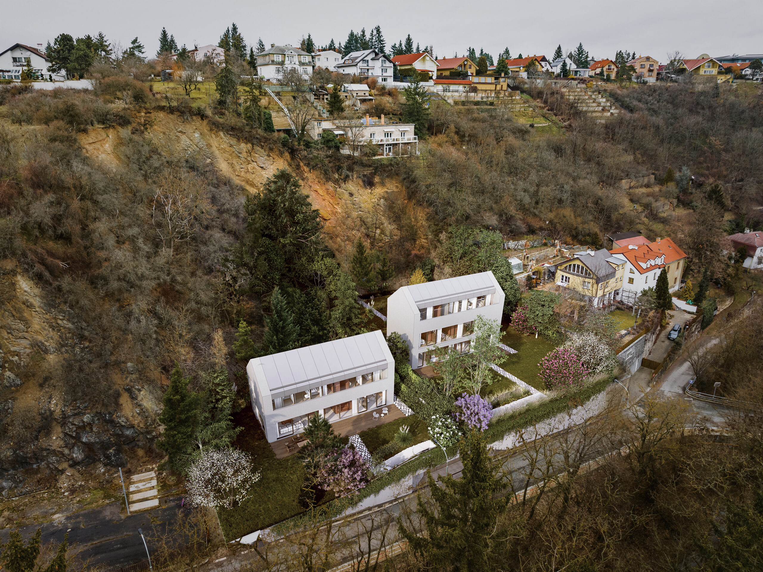 Půdorysný tvar a sedlové střechy obou vil vychází z tradiční vesnické zástavby. Všechny obytné místnosti ve vilách jsou směrovány na jih s výhledem na protější zalesněný horizont. Hlavní obytné prostory v přízemí jsou orientovány třemi směry včetně výhledu na skálu – relikt těžebních prací v bývalém lomu. Každý objekt má svůj vlastní bazén, který je v obou případech umístěn na hranu skály v nejsevernějším místě zahrady.